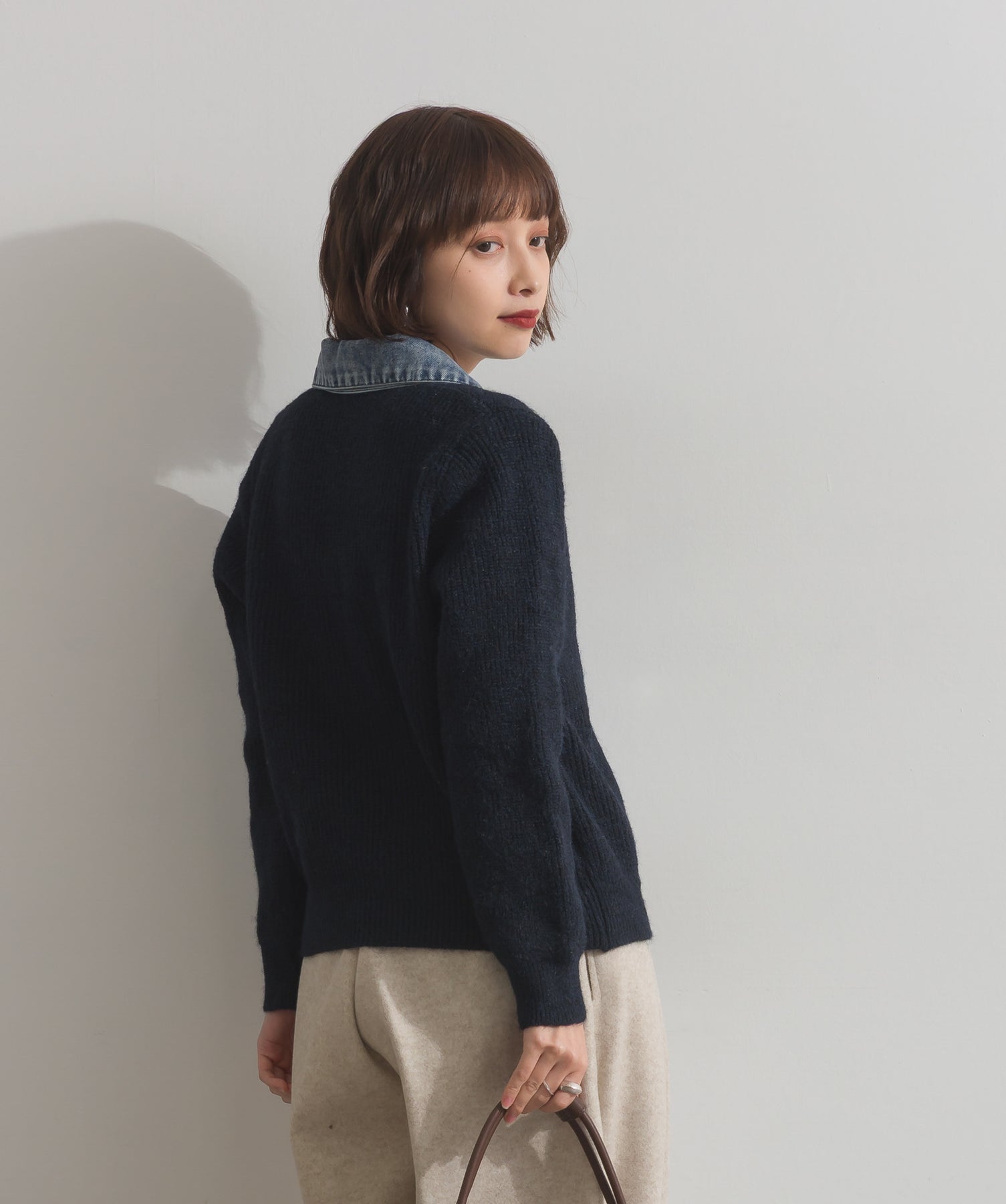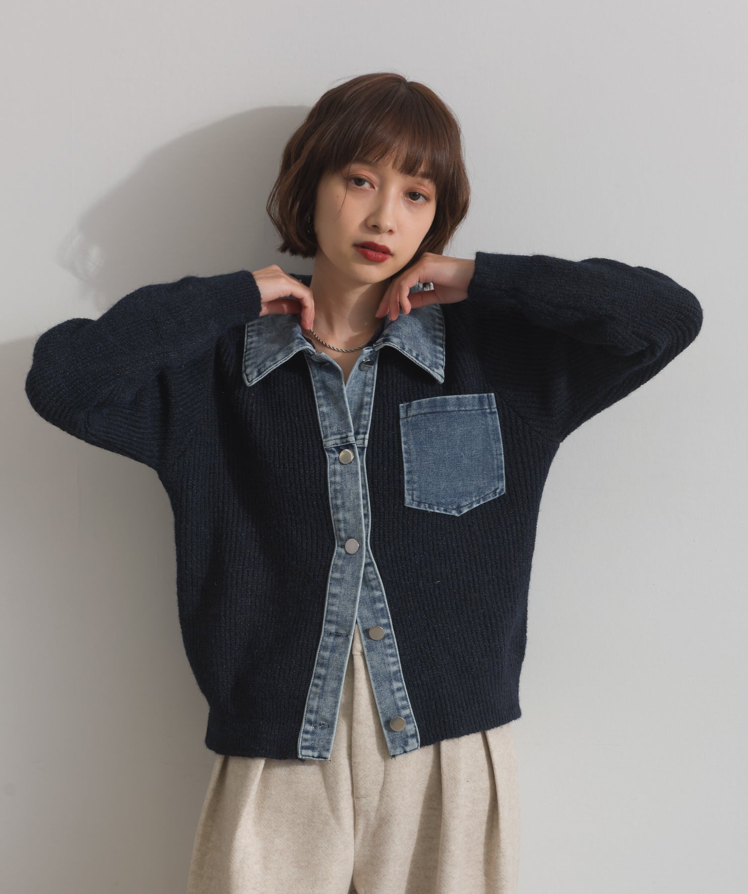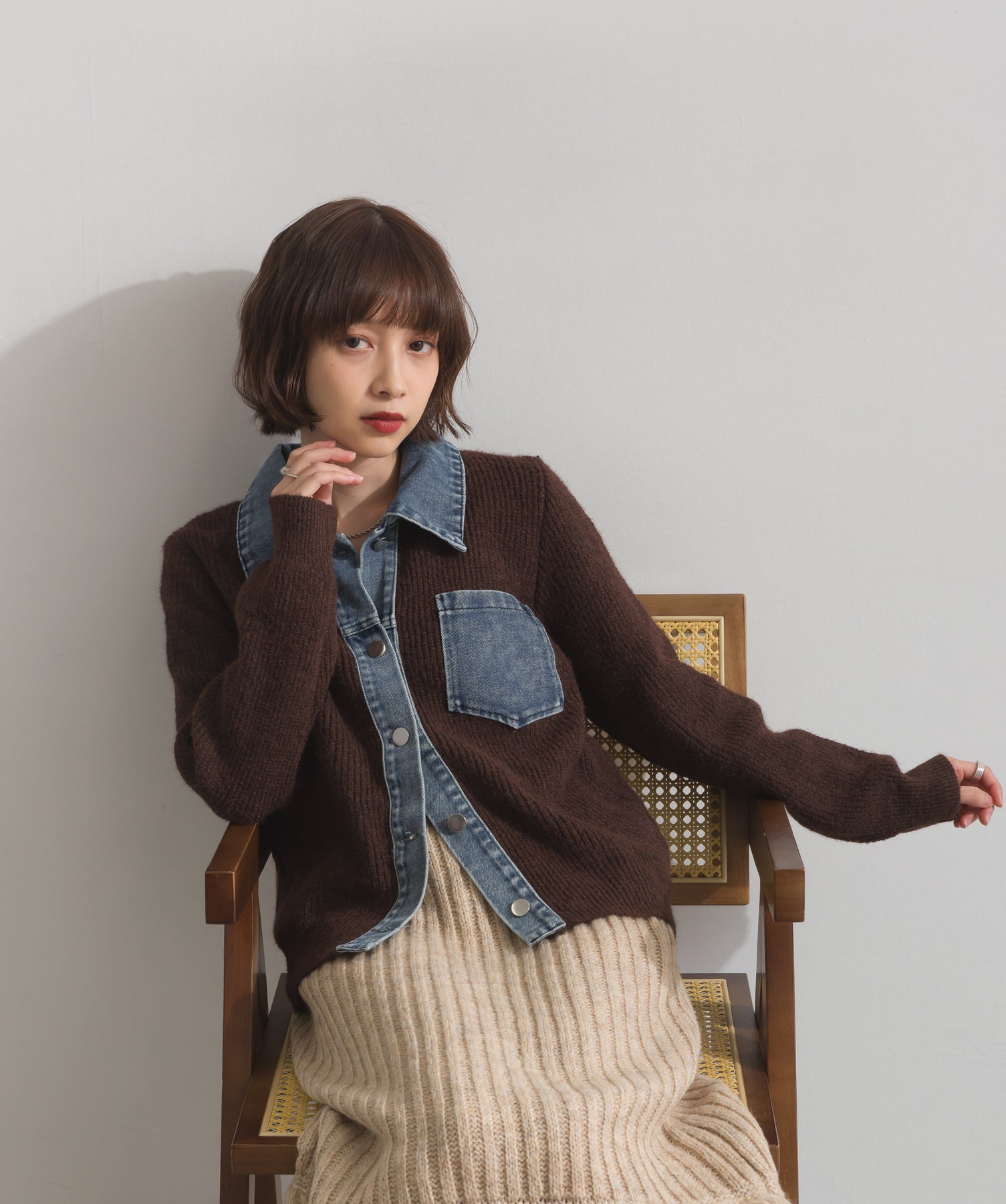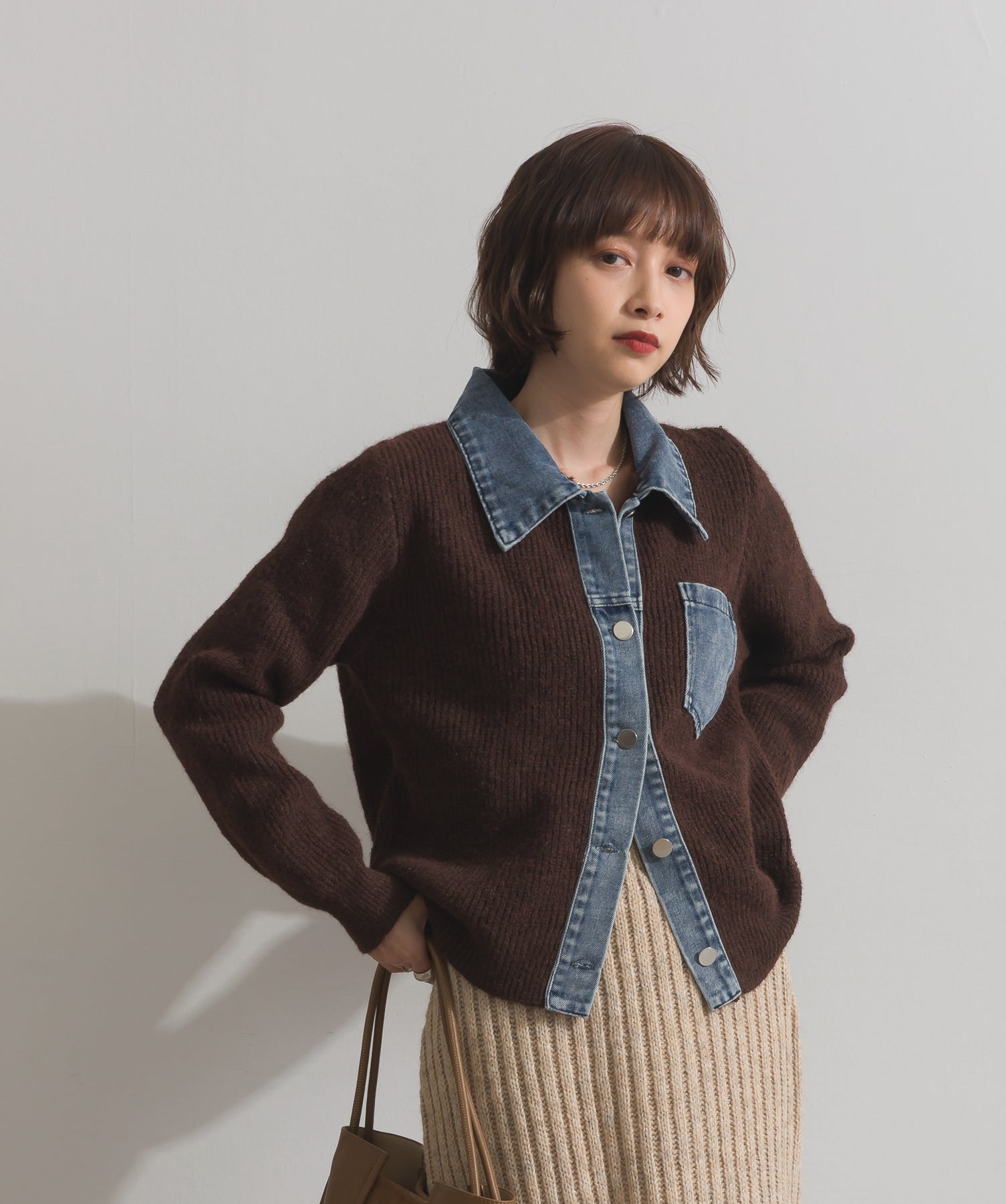 柔らかくふんわりと編み立てたリブニットをベースに、フロントや襟、ポケットにデニム素材をドッキング。異素材のコントラストが際立ち、立体感と奥行きのある表情を演出します。