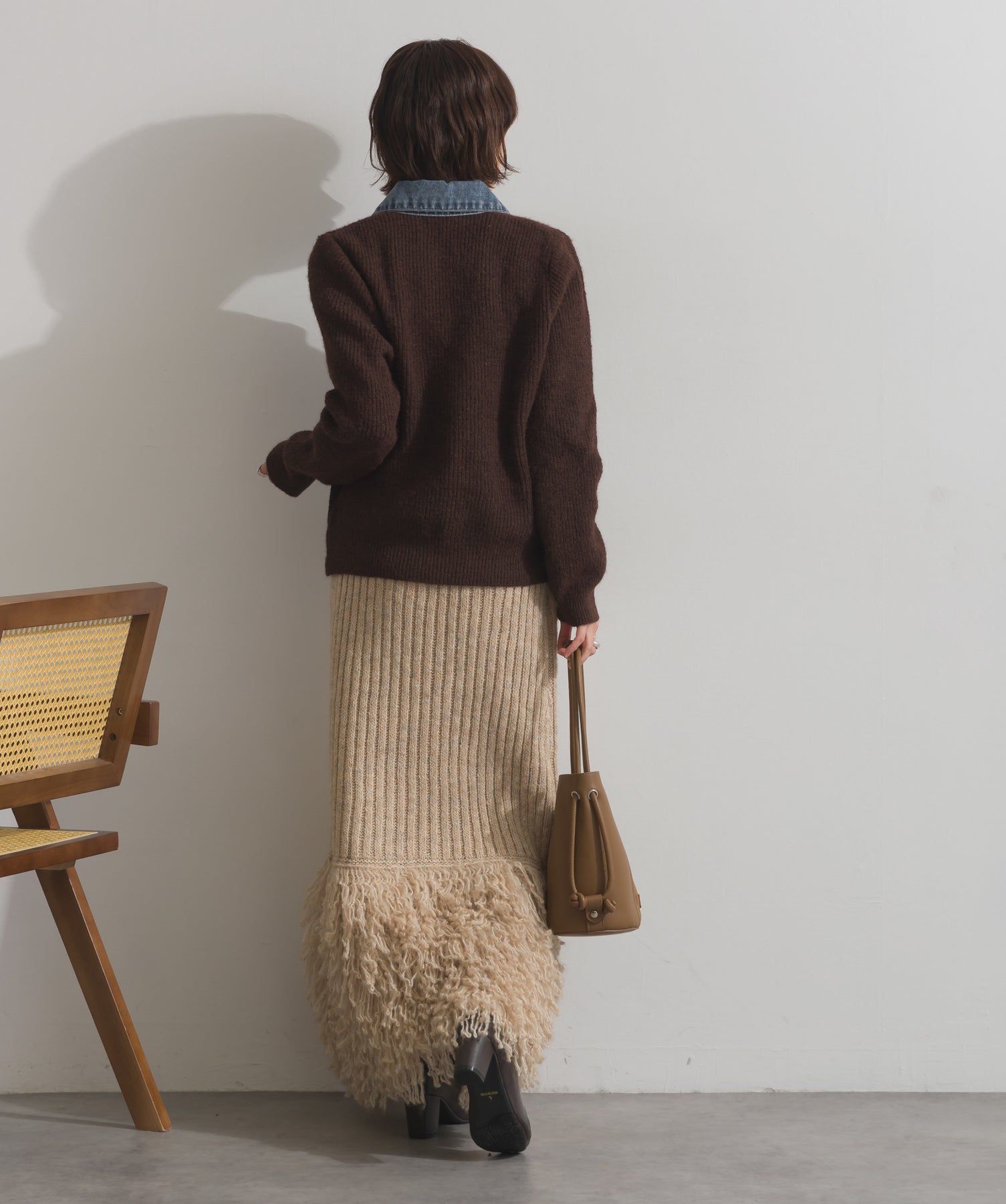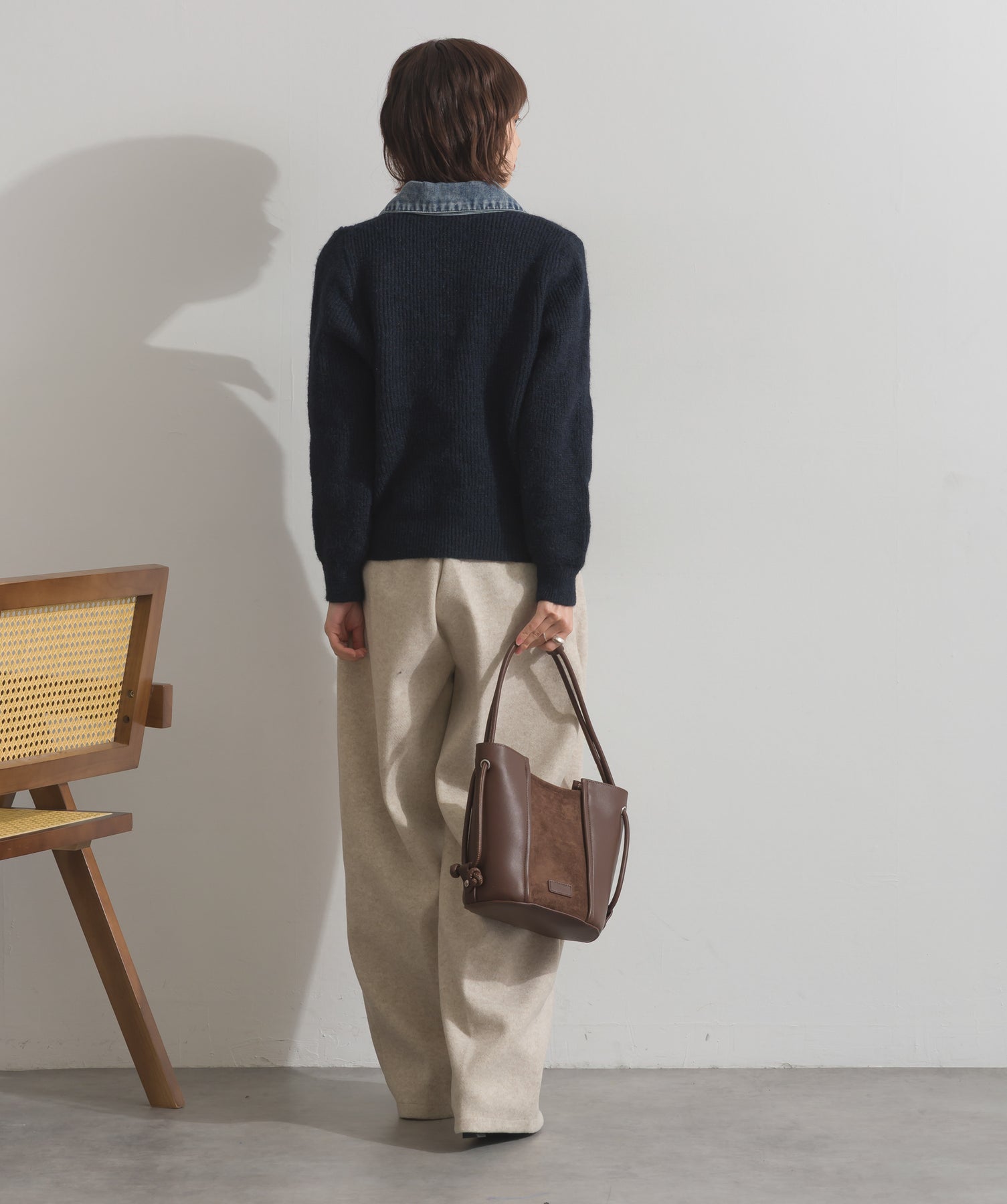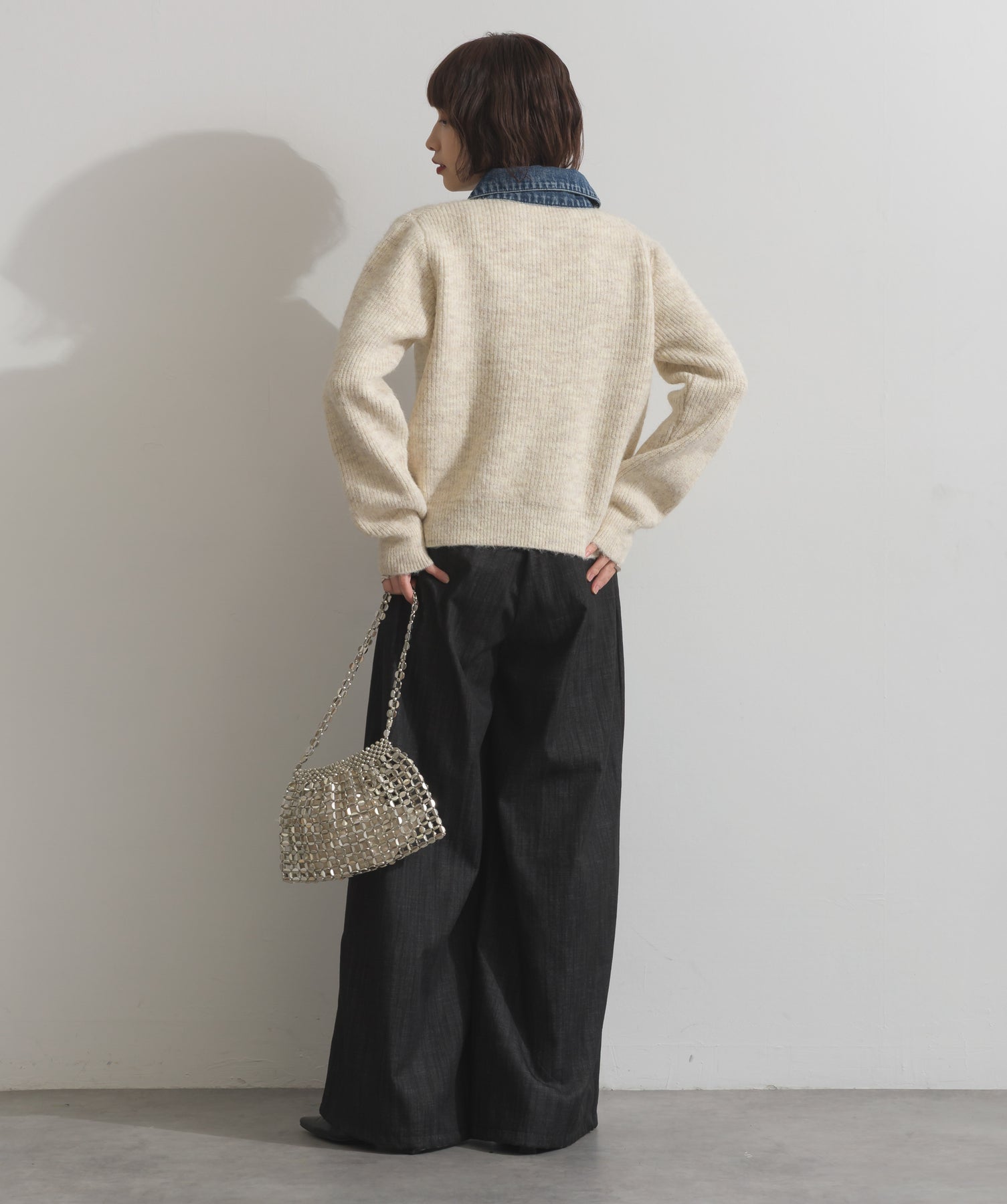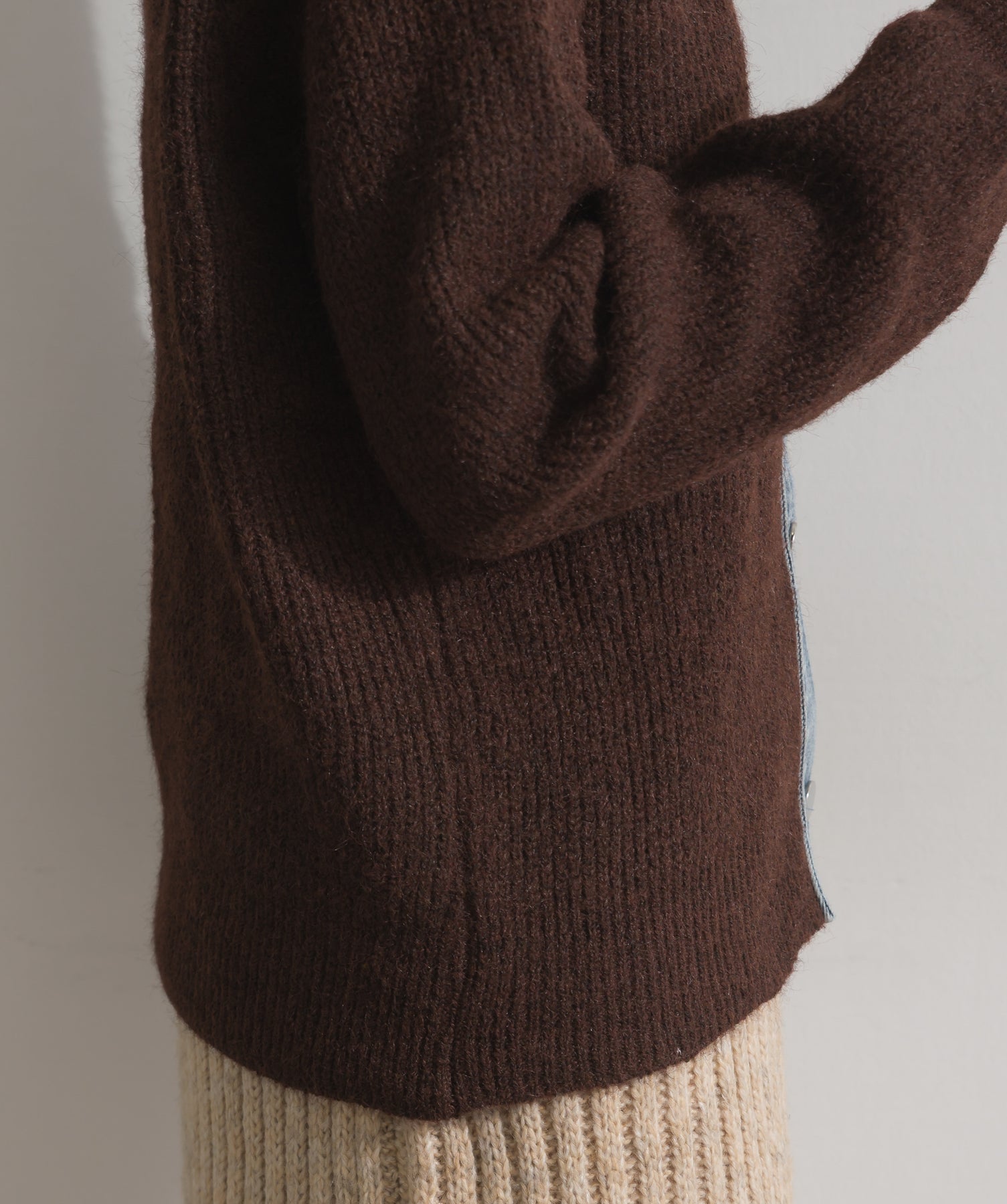 柔らかくふんわりと編み立てたリブニットをベースに、フロントや襟、ポケットにデニム素材をドッキング。異素材のコントラストが際立ち、立体感と奥行きのある表情を演出します。