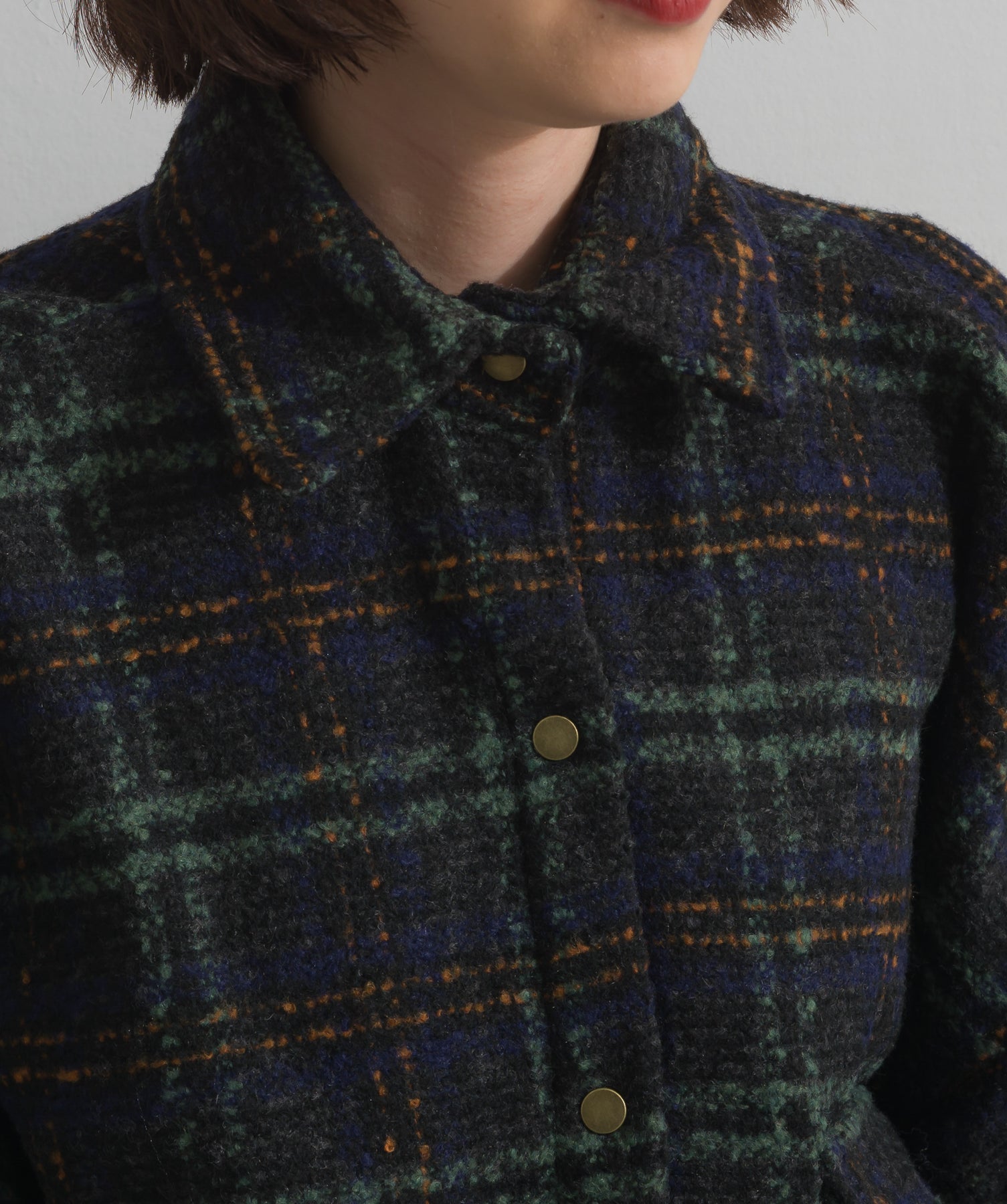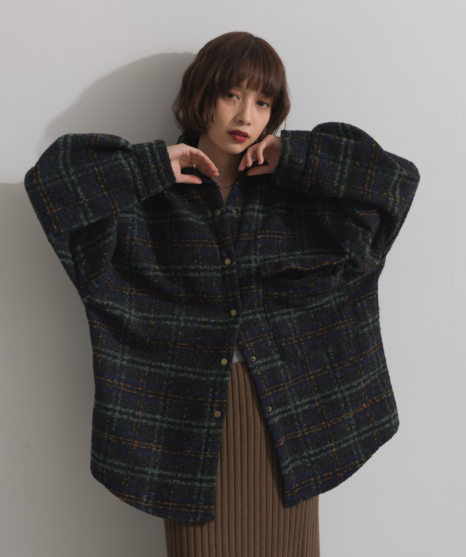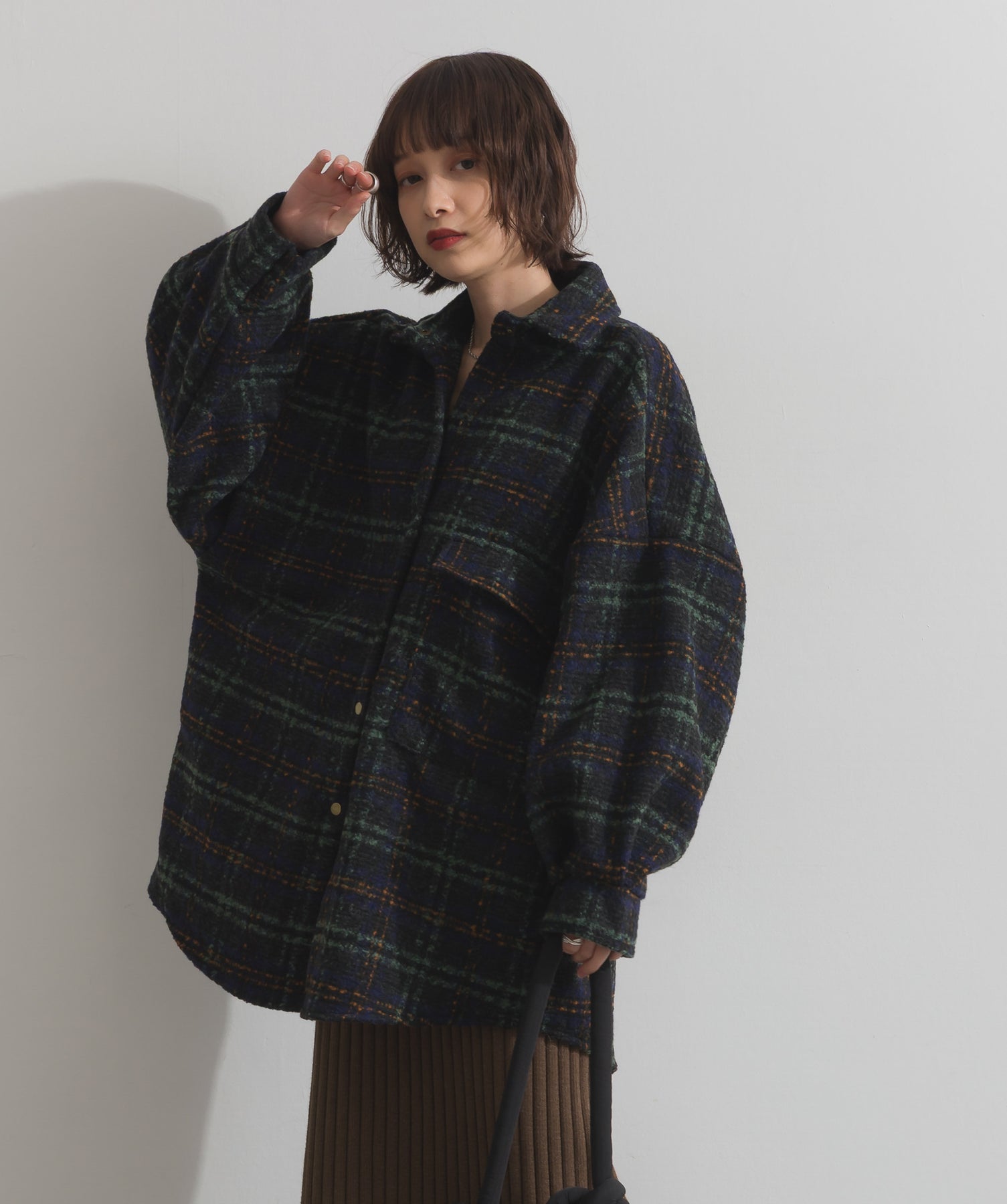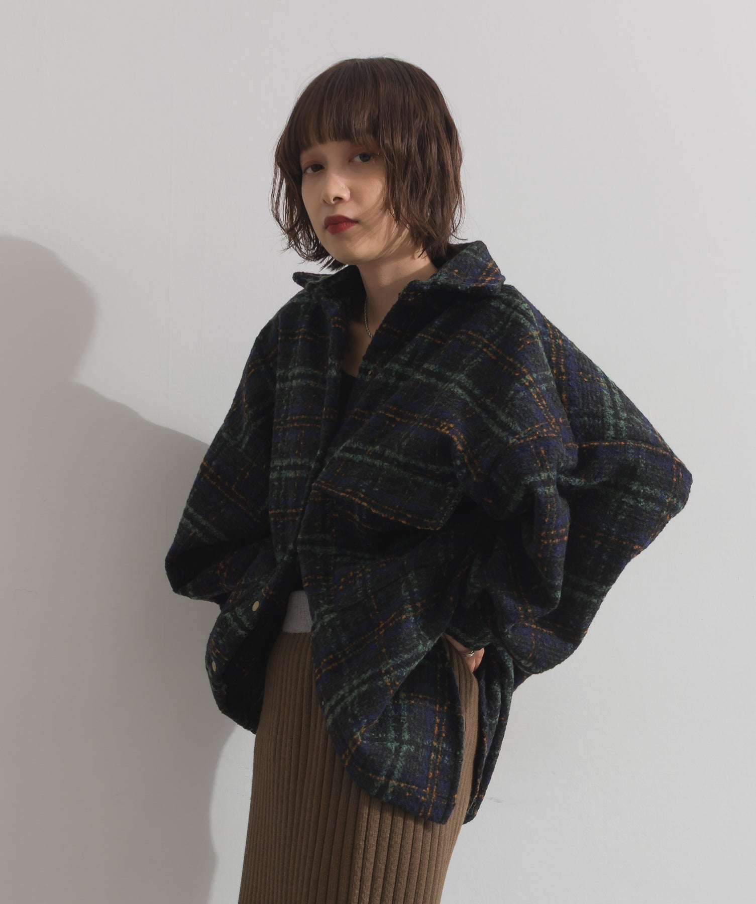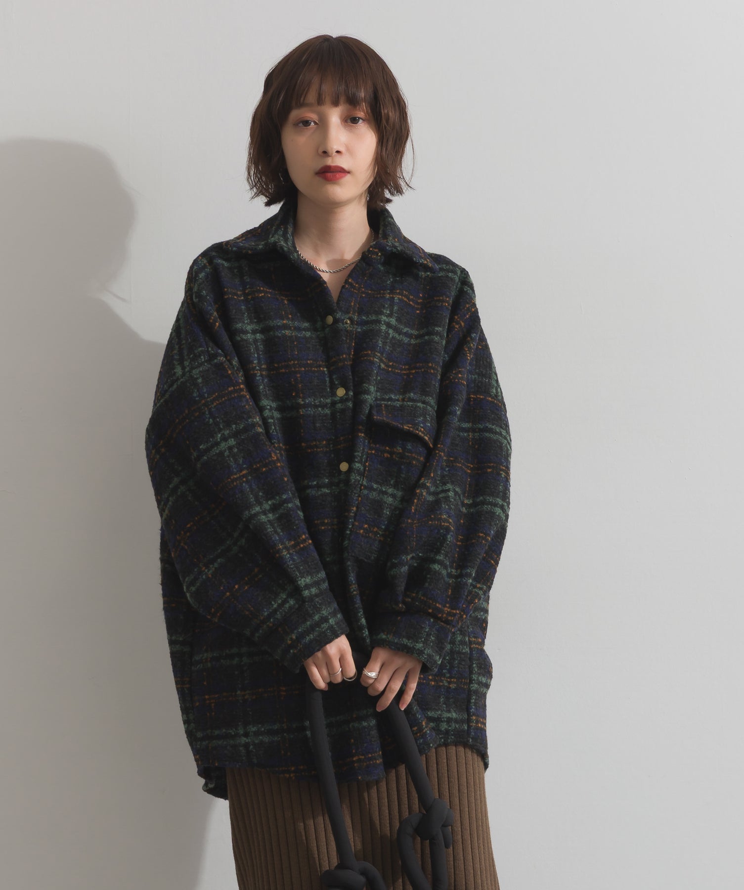 じっくり遊ぶ、大人の抜け感シャツアウター。-material-ふんわりとした表面感が魅力のブークレ素材を使用。 しっかりとした厚みがありながらも、軽く快適でデイリーに活躍します。--design-トラッドなチェック柄に程よいルーズ感をプラスした、確からしいバランス感が光る1着。 大きめの胸ポケットや、ドロップショルダーのシルエットが抜け感を演出し、羽織るだけでコーディネートを格上げします。 シャツ感覚で着られるのに、コート代わりにもなる万能アウター。