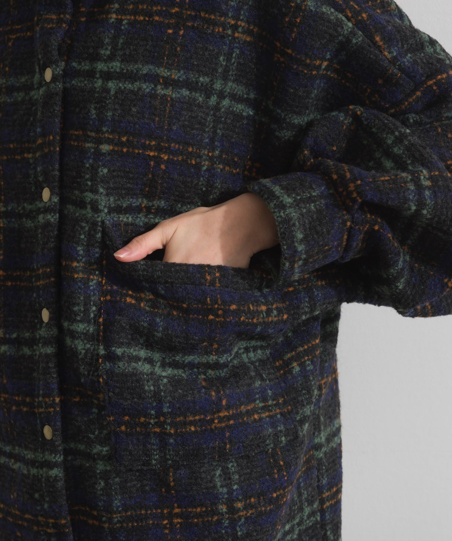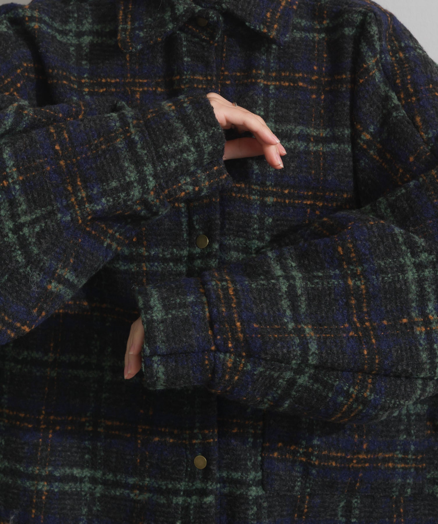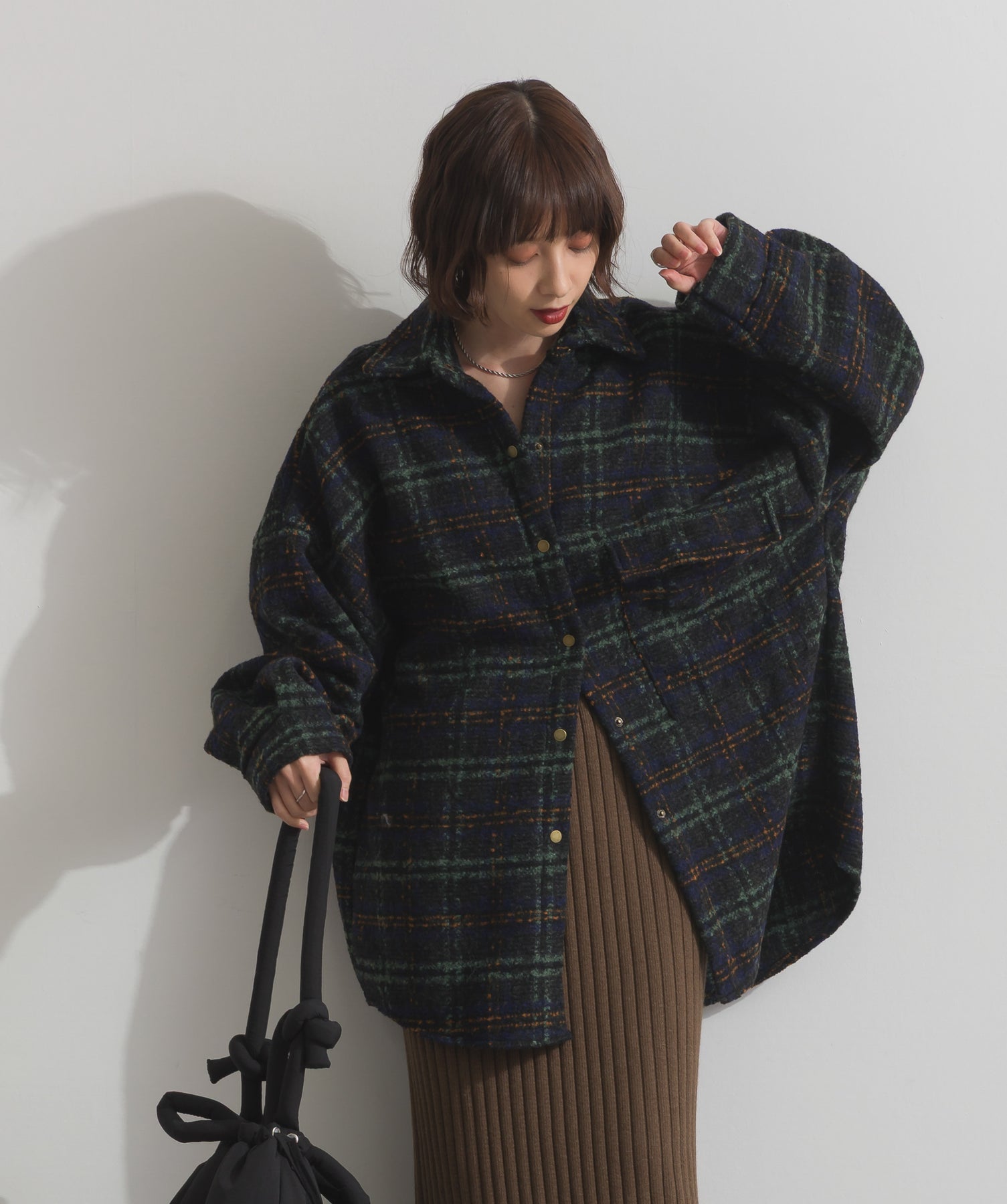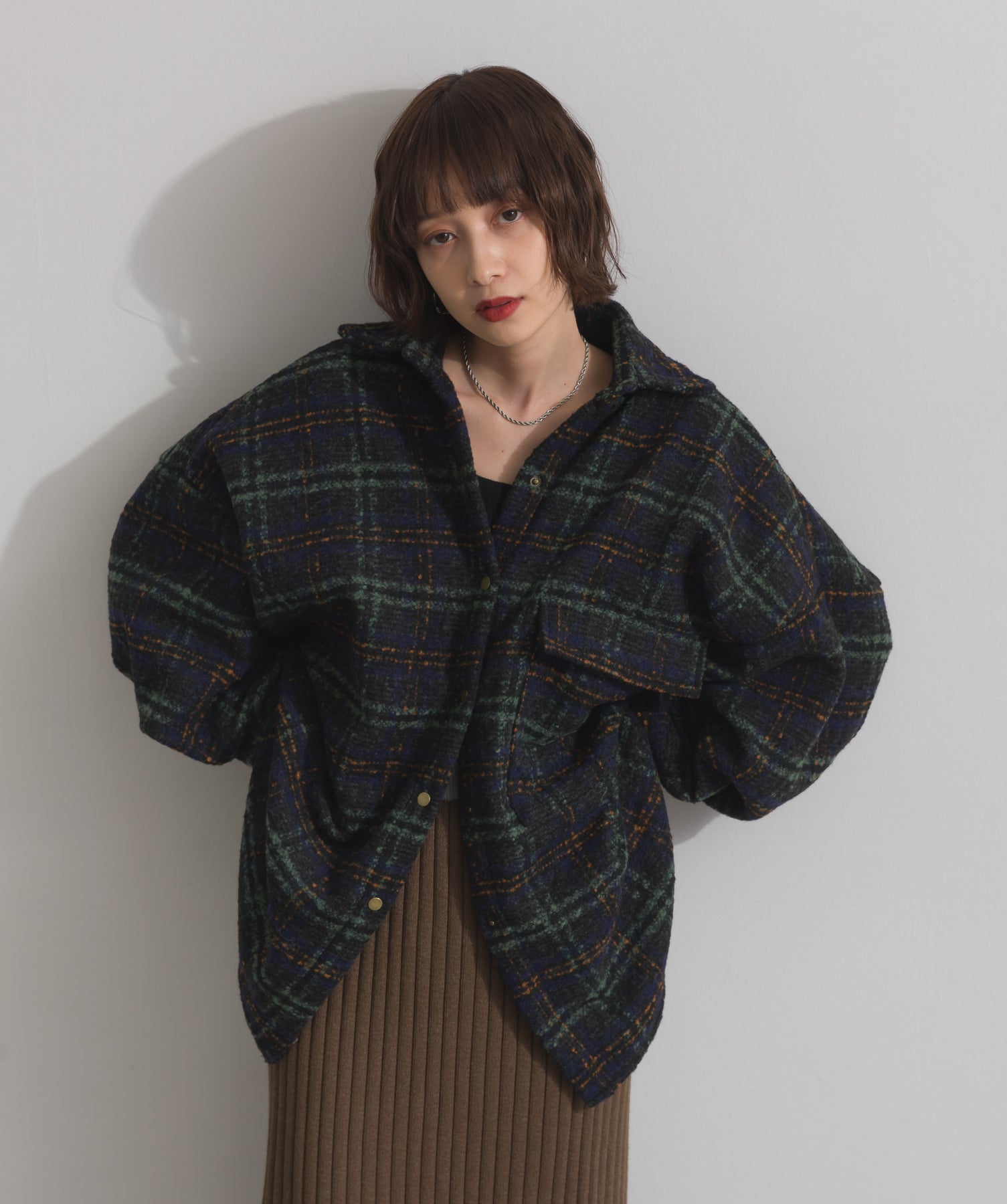 じっくり遊ぶ、大人の抜け感シャツアウター。-material-ふんわりとした表面感が魅力のブークレ素材を使用。 しっかりとした厚みがありながらも、軽く快適でデイリーに活躍します。--design-トラッドなチェック柄に程よいルーズ感をプラスした、確からしいバランス感が光る1着。 大きめの胸ポケットや、ドロップショルダーのシルエットが抜け感を演出し、羽織るだけでコーディネートを格上げします。 シャツ感覚で着られるのに、コート代わりにもなる万能アウター。