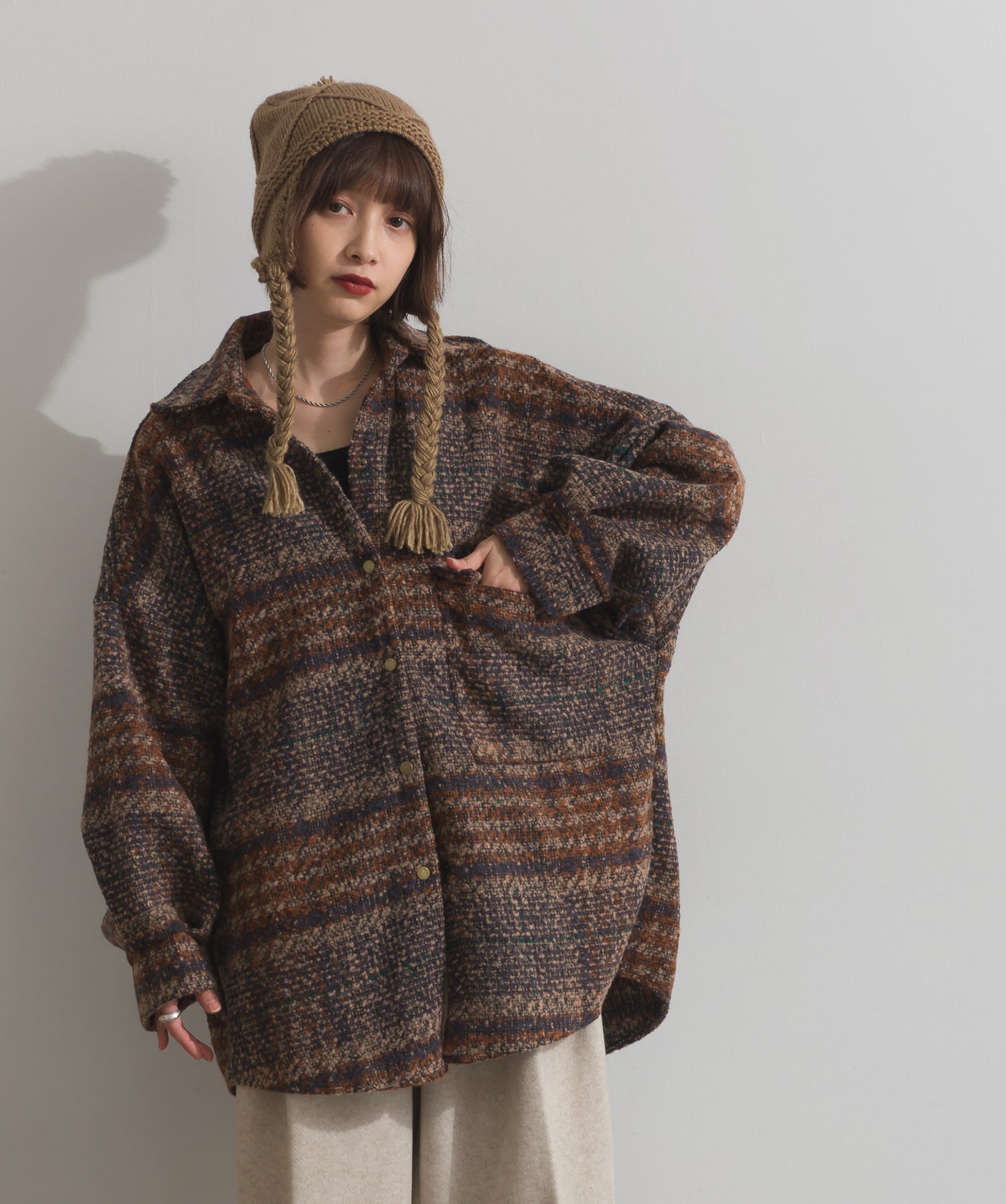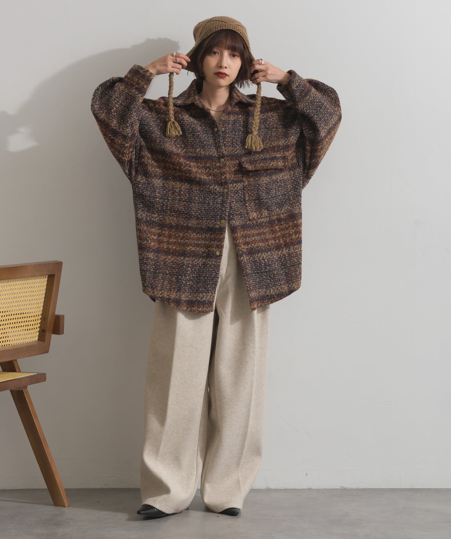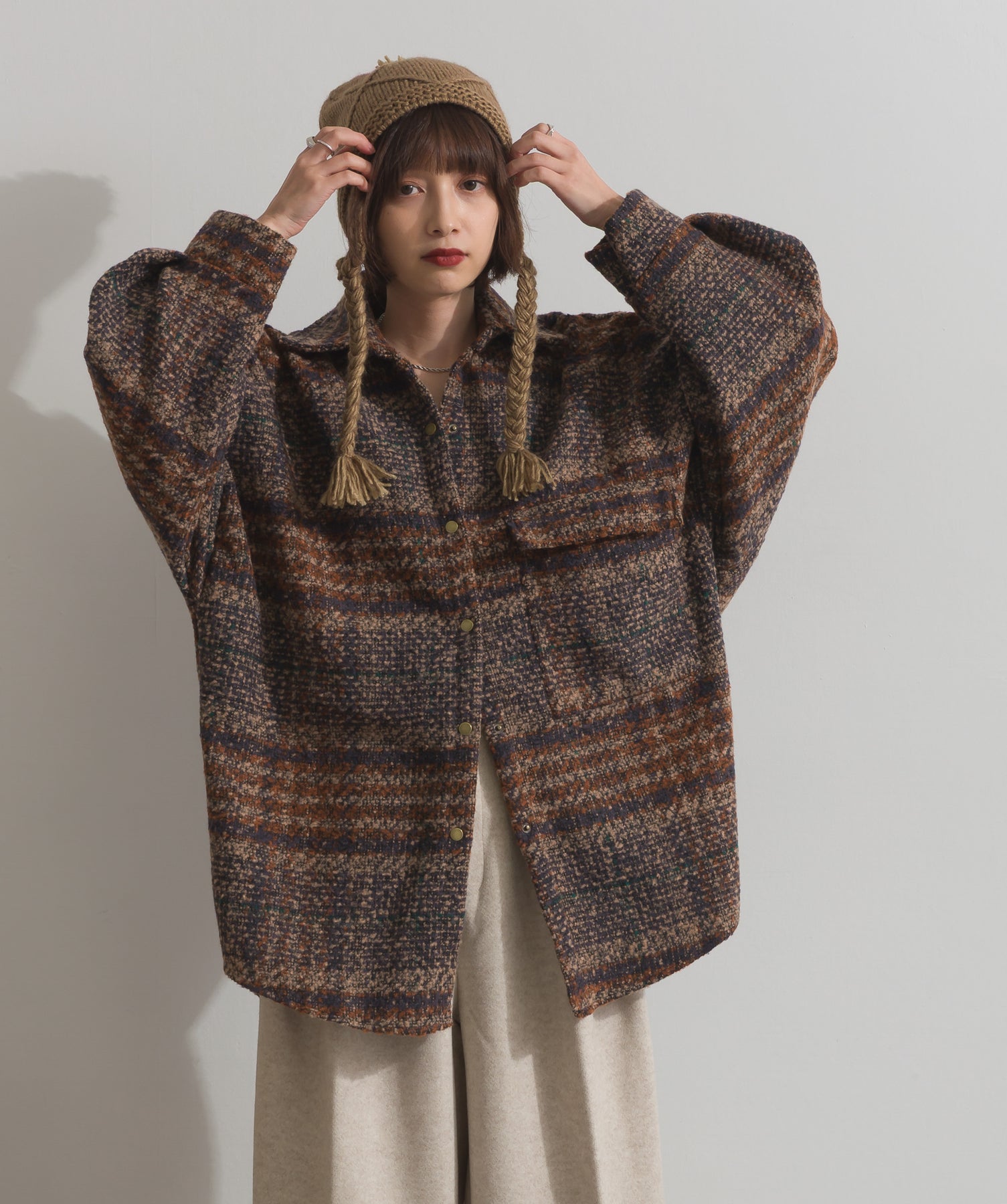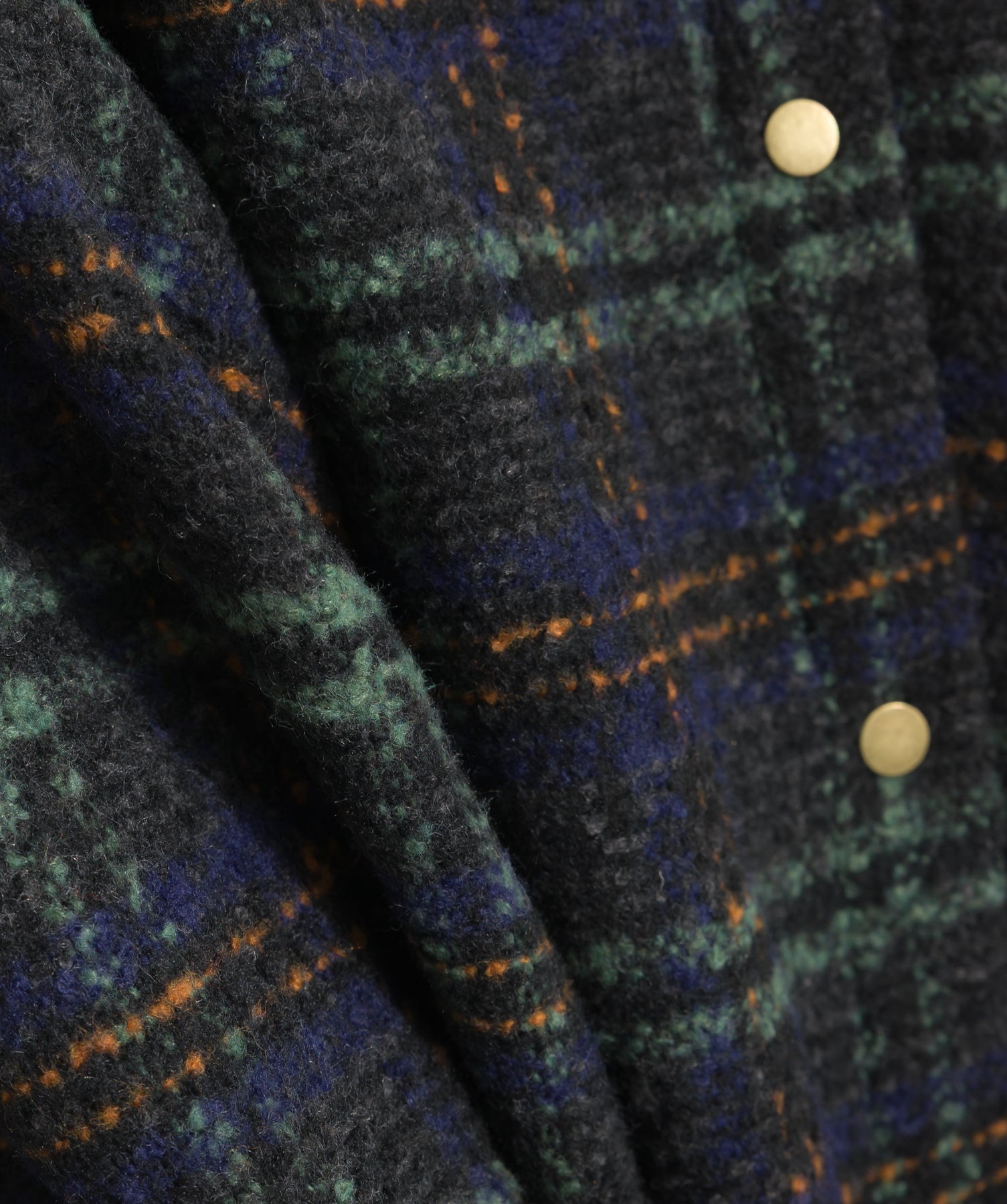 じっくり遊ぶ、大人の抜け感シャツアウター。-material-ふんわりとした表面感が魅力のブークレ素材を使用。 しっかりとした厚みがありながらも、軽く快適でデイリーに活躍します。--design-トラッドなチェック柄に程よいルーズ感をプラスした、確からしいバランス感が光る1着。 大きめの胸ポケットや、ドロップショルダーのシルエットが抜け感を演出し、羽織るだけでコーディネートを格上げします。 シャツ感覚で着られるのに、コート代わりにもなる万能アウター。