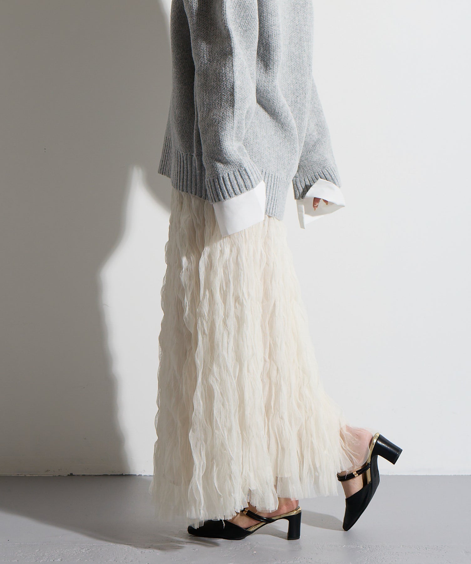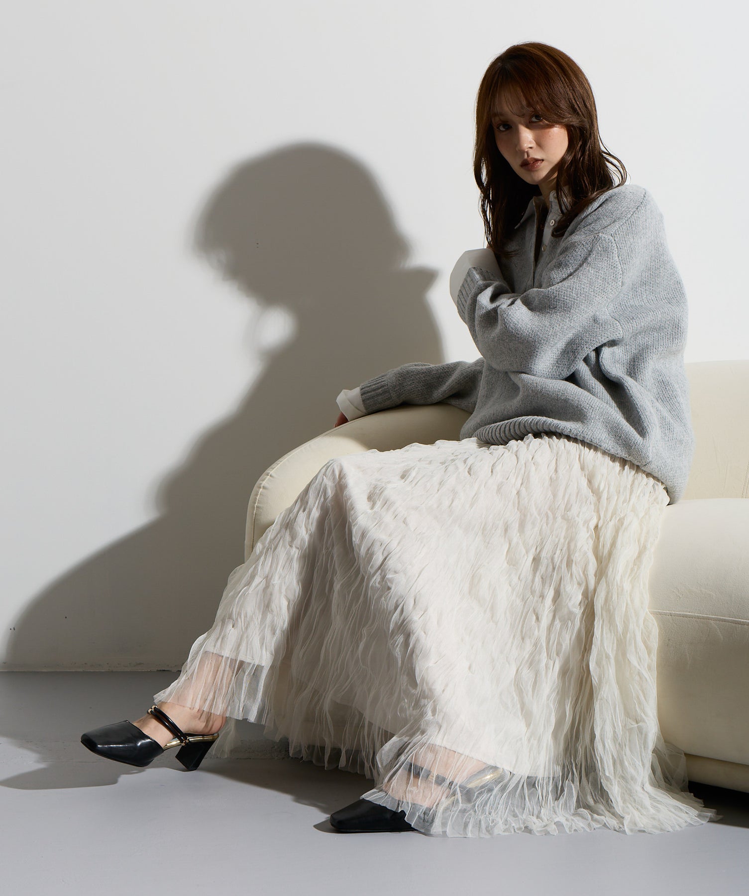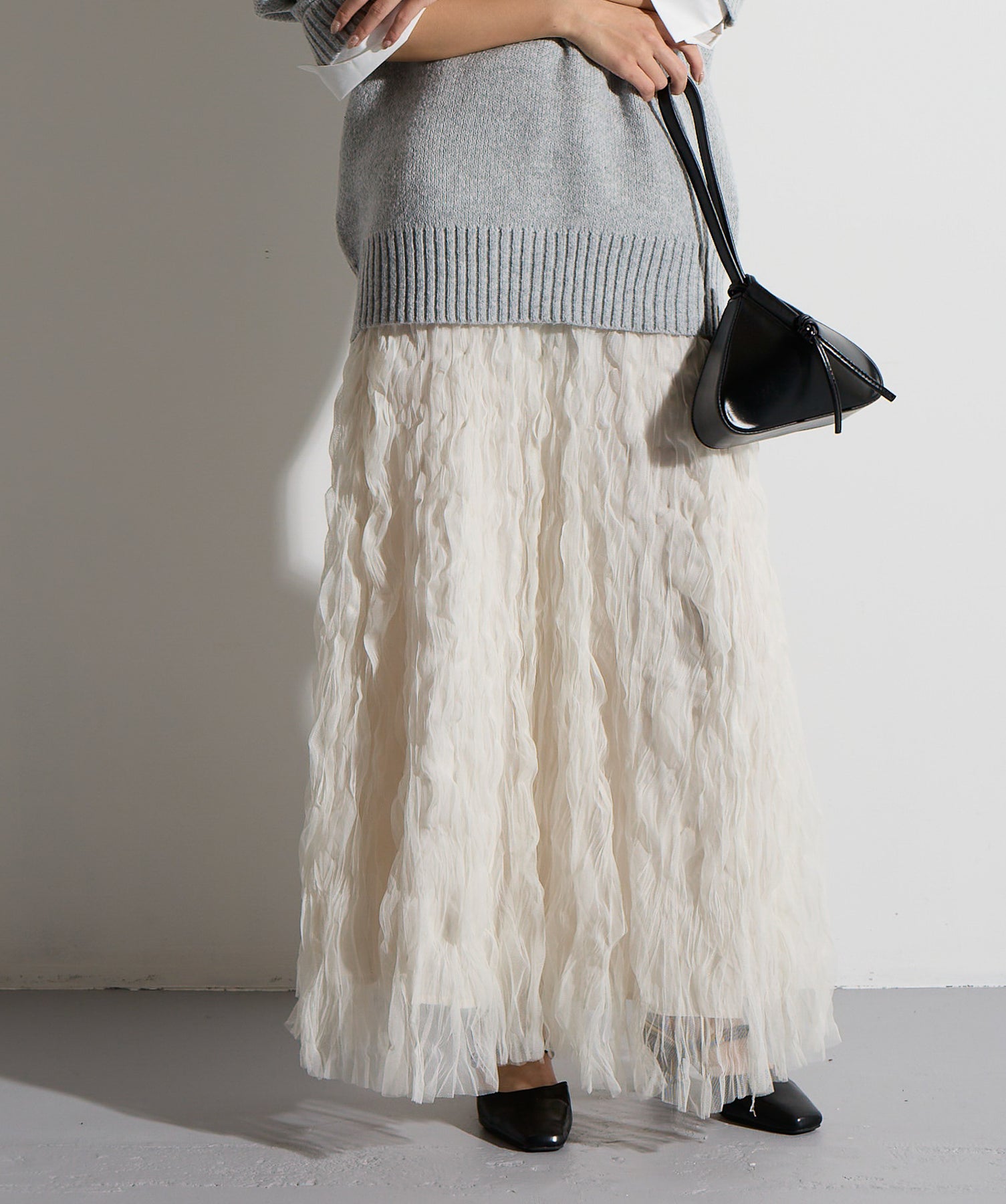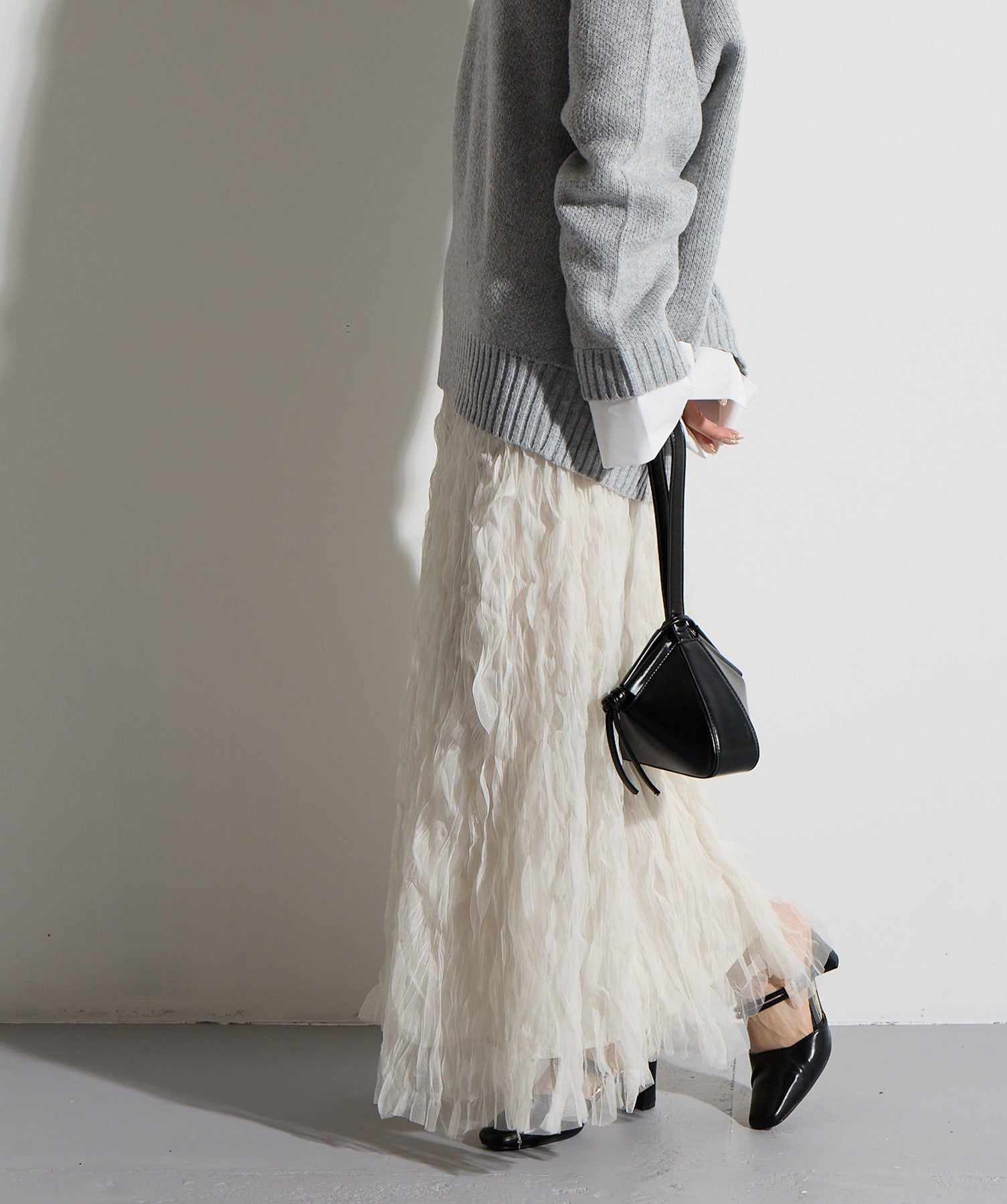 ボトムは表情のあるスカートを合わせることで、シンプルな配色の中にも動きをプラスしています。