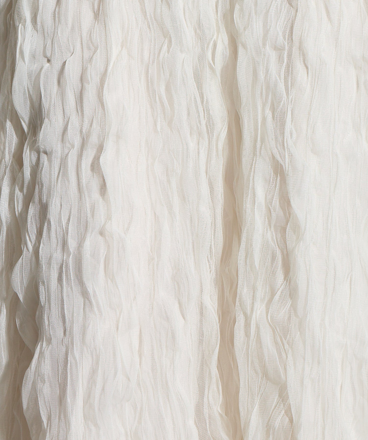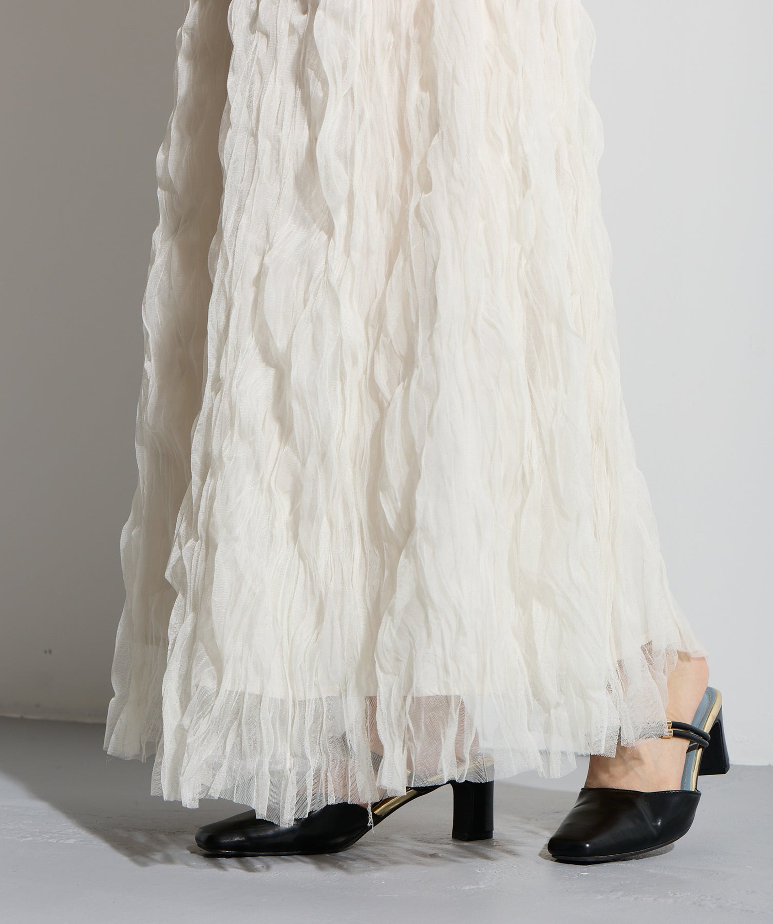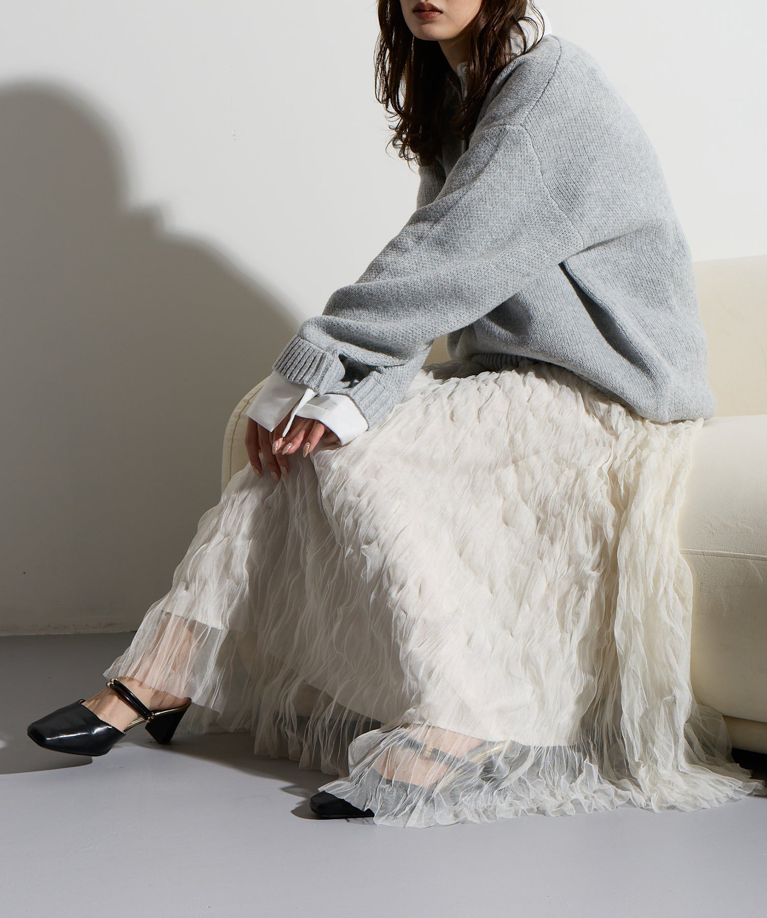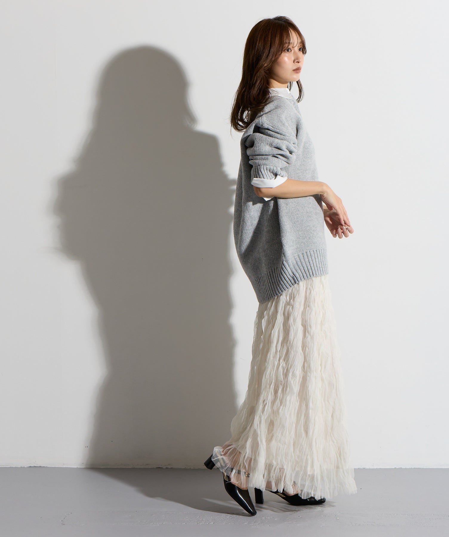 ボトムは表情のあるスカートを合わせることで、シンプルな配色の中にも動きをプラスしています。