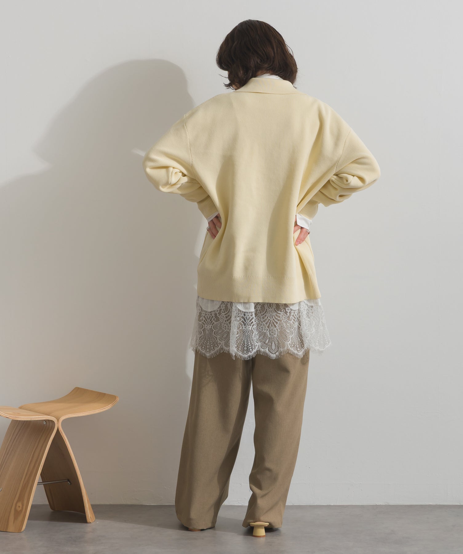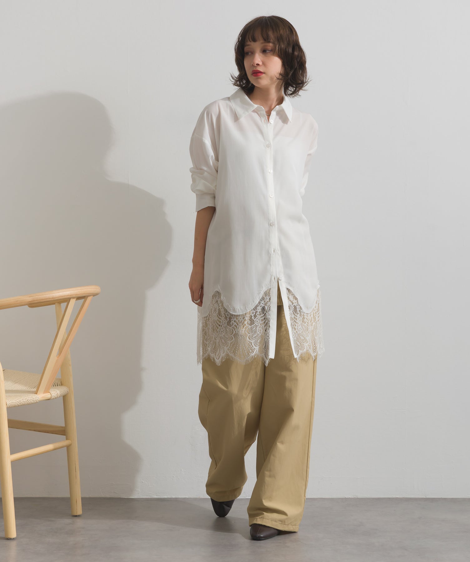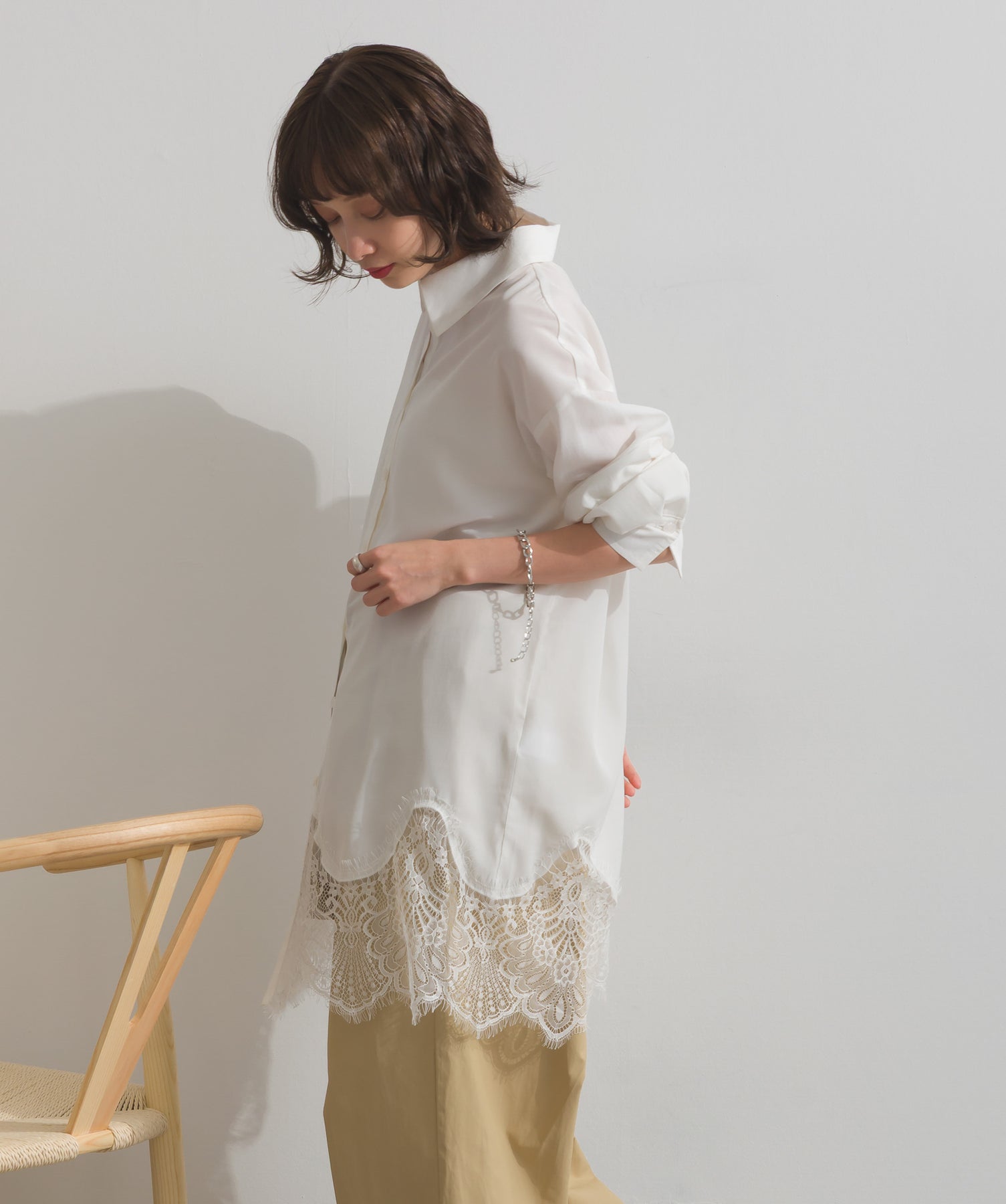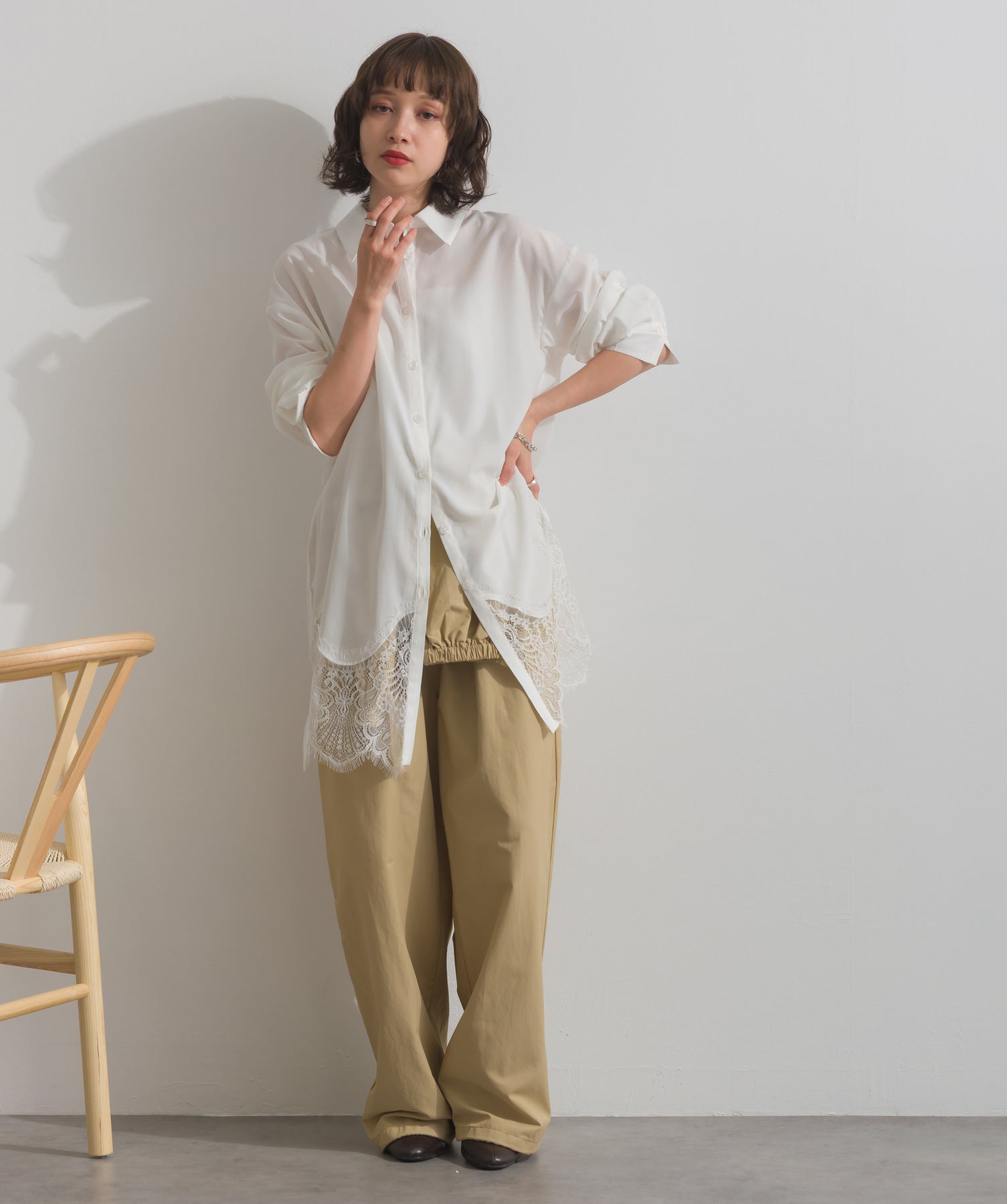 インナーの裾から覗くレースをポイントに、きちんと感のあるトップスに軽さと抜けをプラスしています。