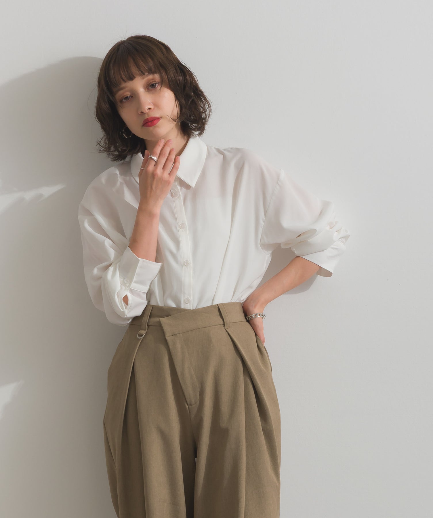 トップは程よくボリュームを持たせ、ボトムは落ち感のあるシルエットでバランスを調整。