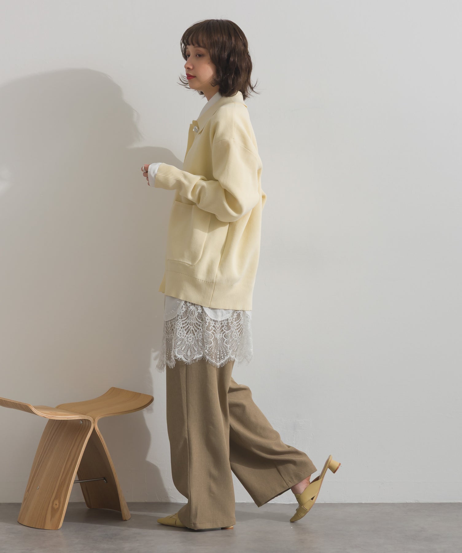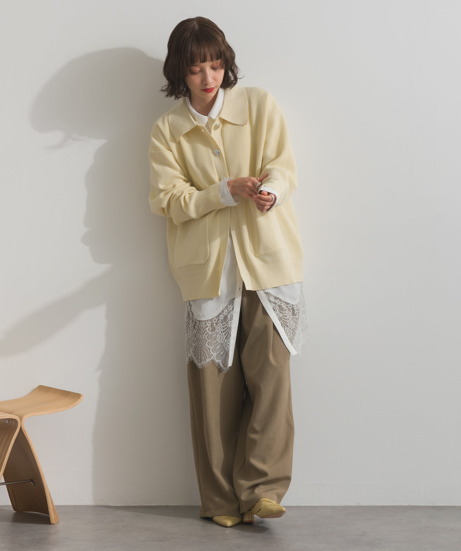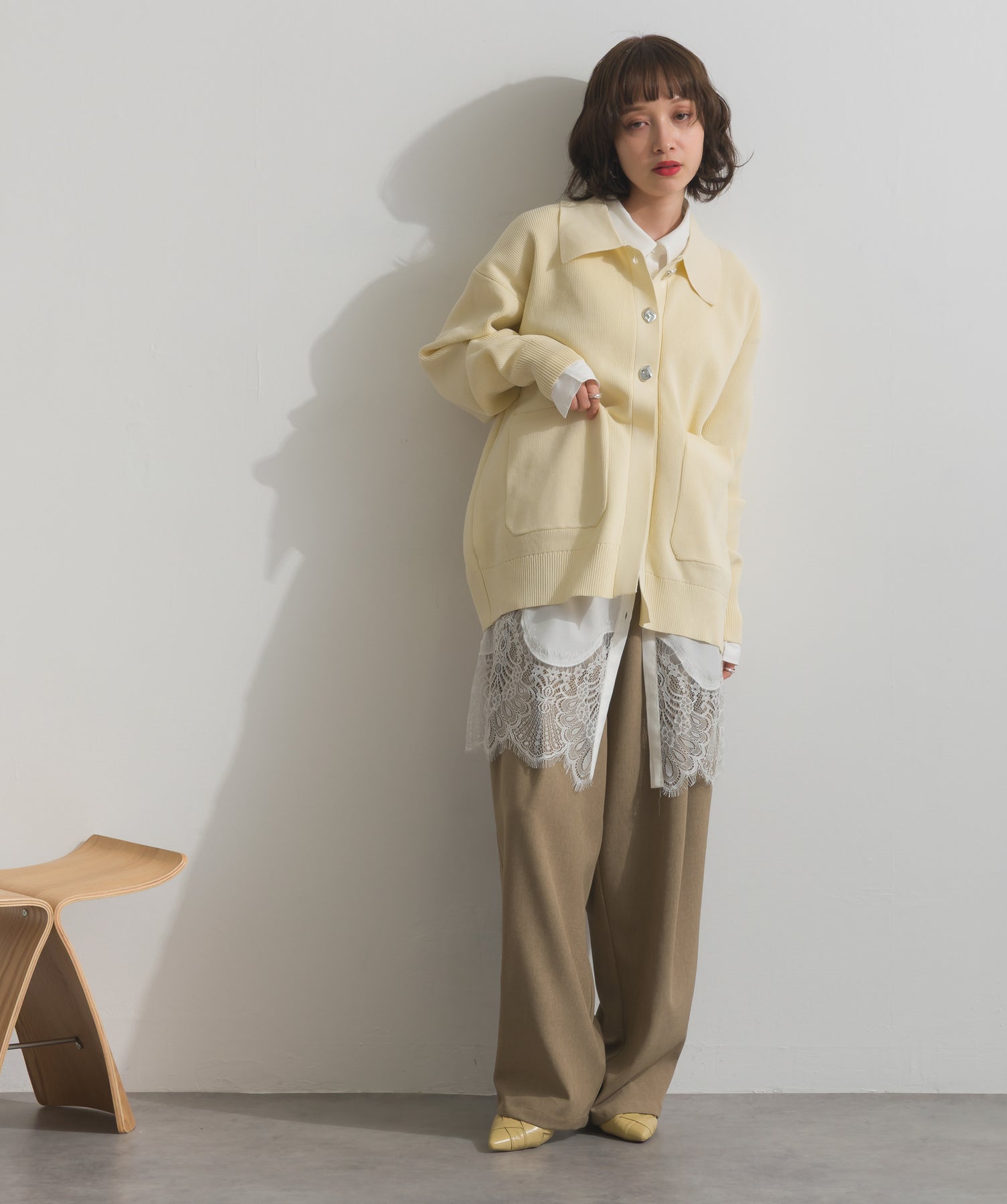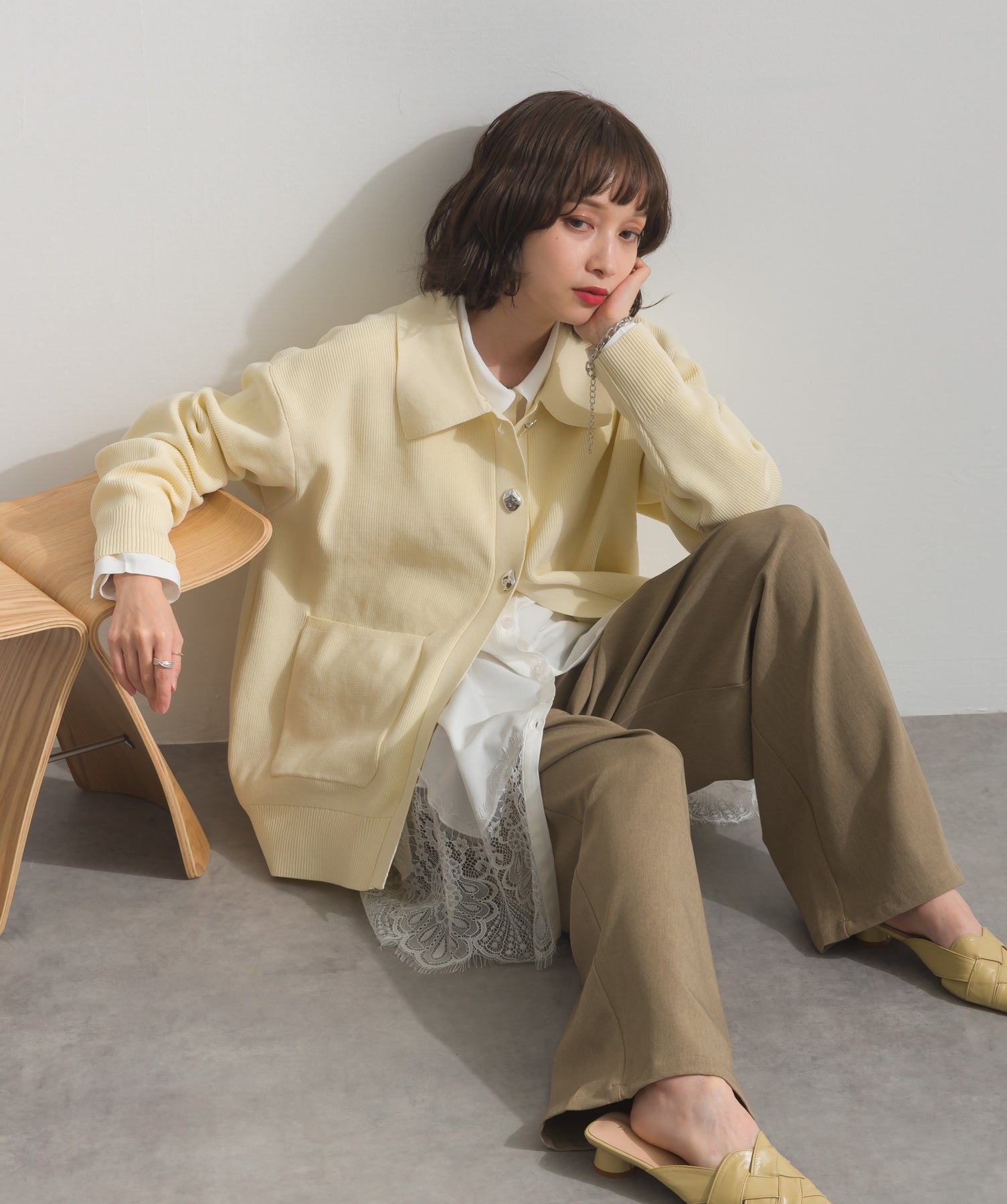 襟付きニットを主役に、今季注目のレイヤードを効かせたトレンドスタイル。