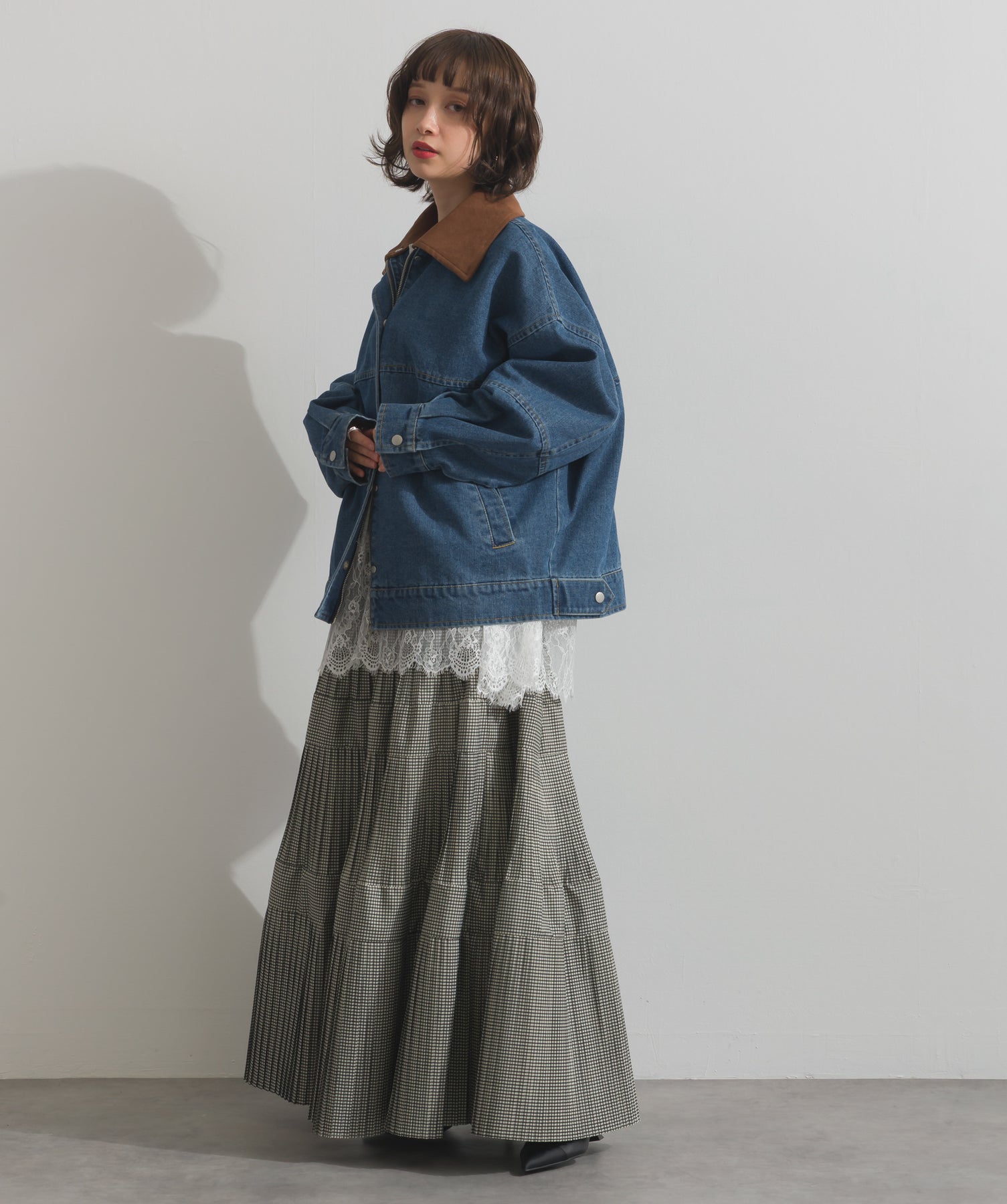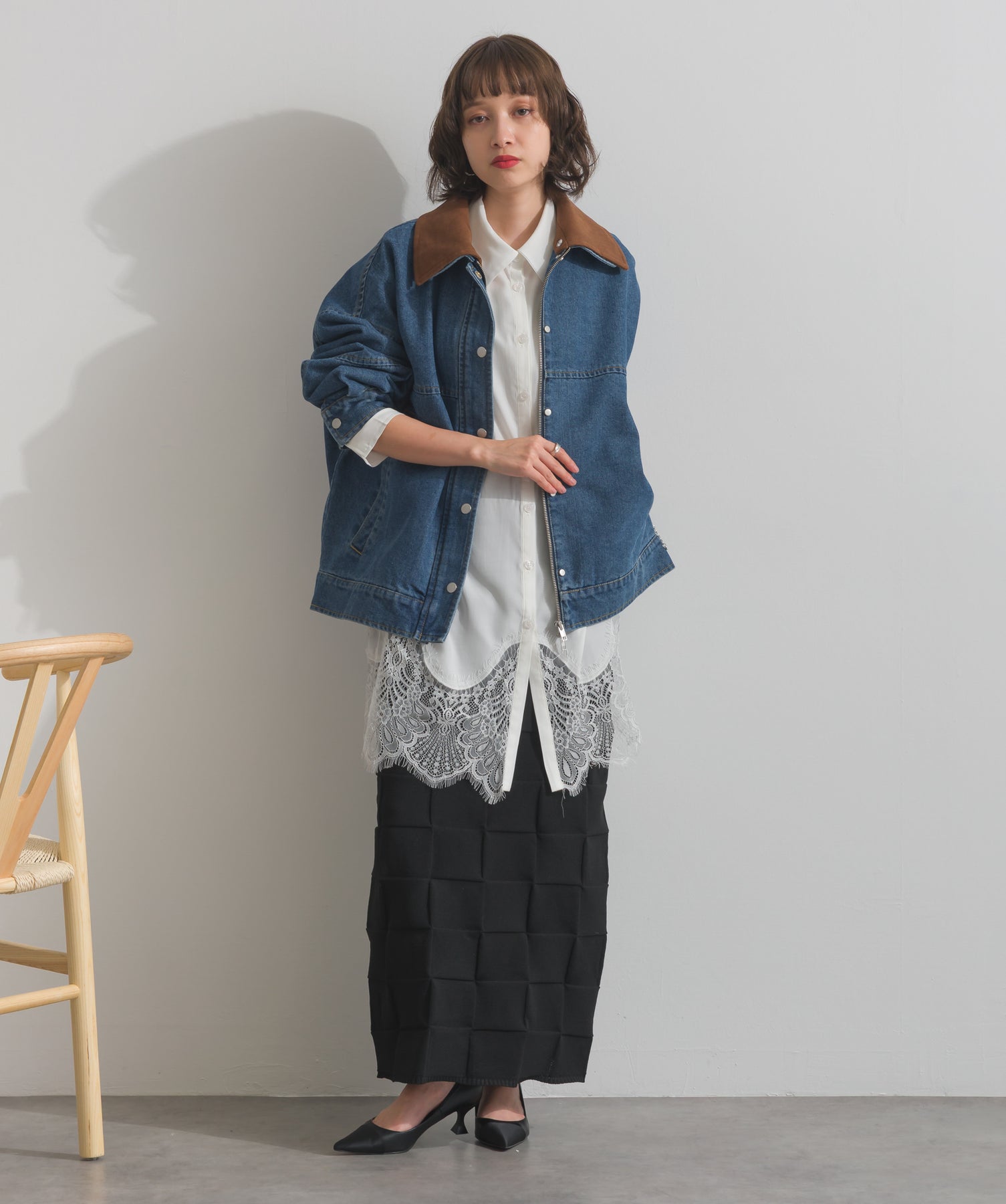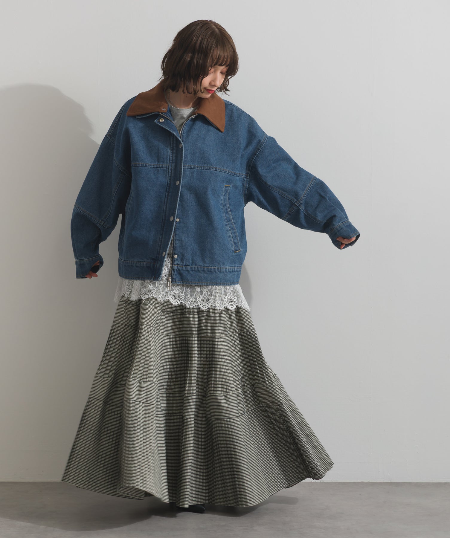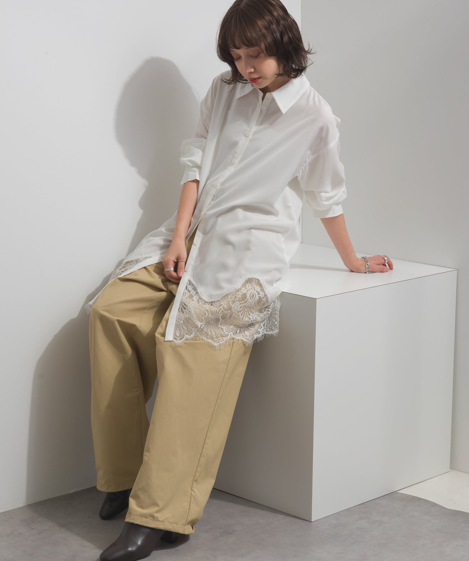 今季注目のレイヤードスタイルを軸に、裾から覗くレースを重ね着で効かせたトレンド感のあるスタイリング。