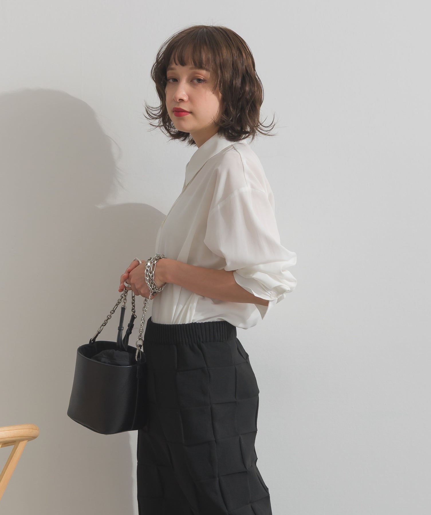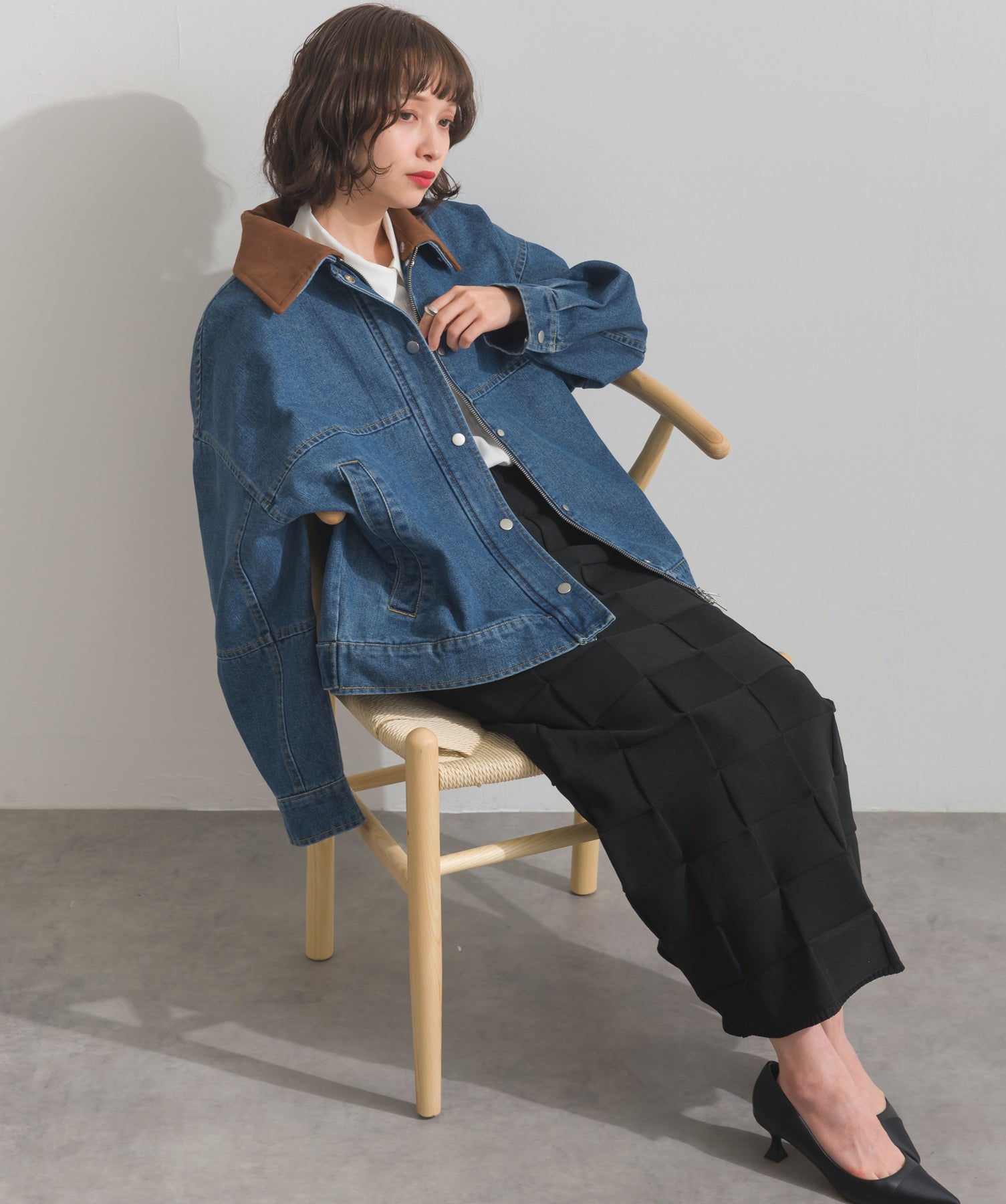 シャツのレイヤードによる軽さを活かしつつ、アウターは襟の切り替えデザインをポイントに、クラシックなムードをプラスしています。