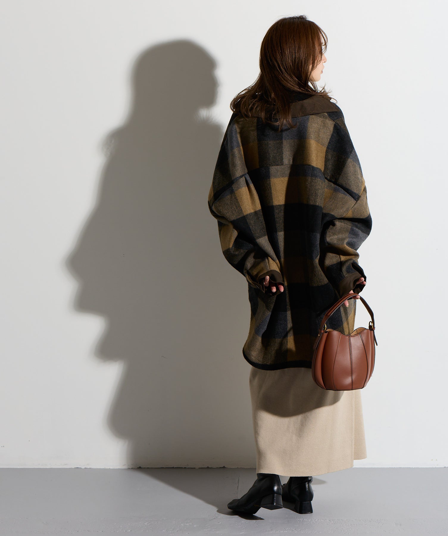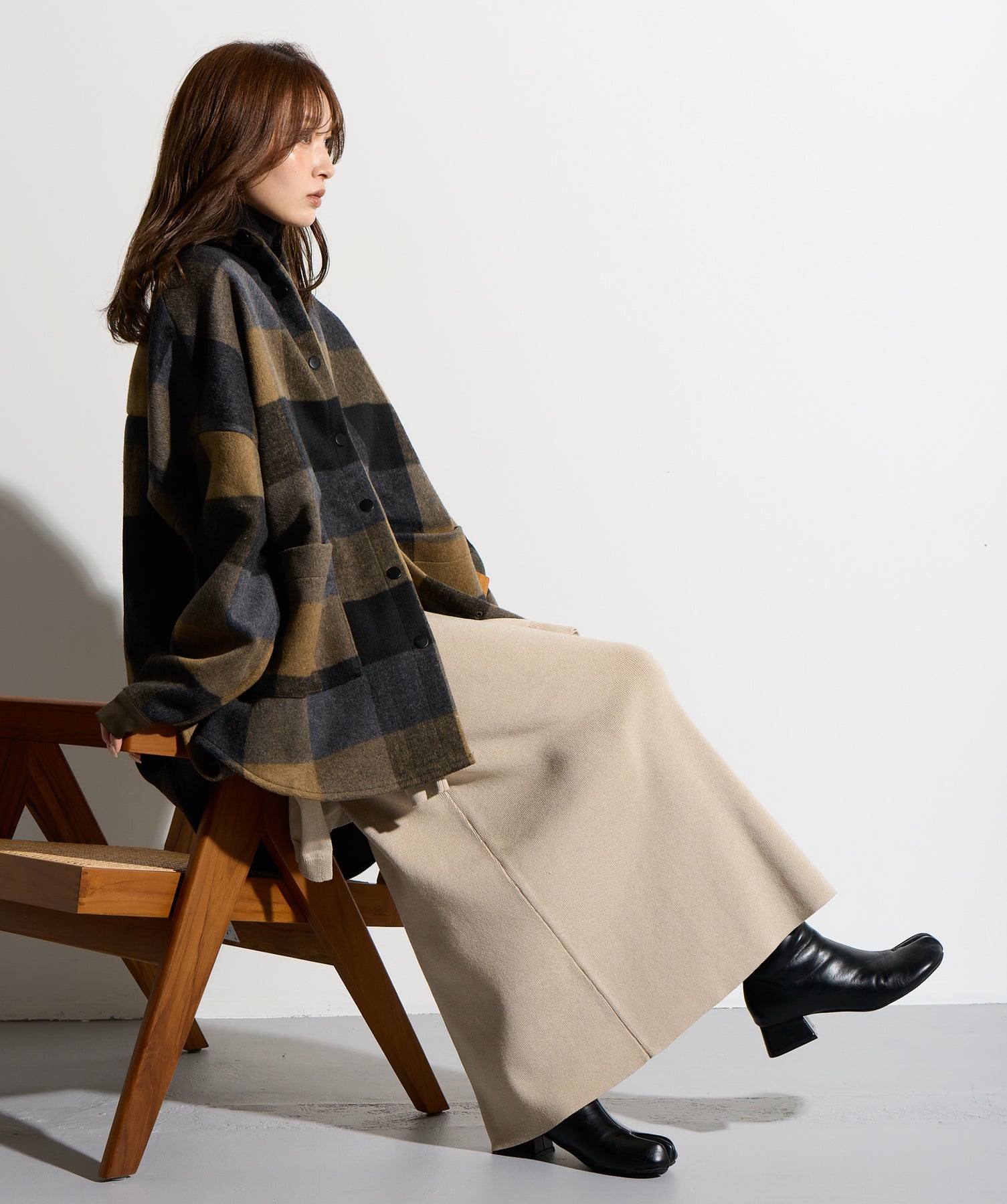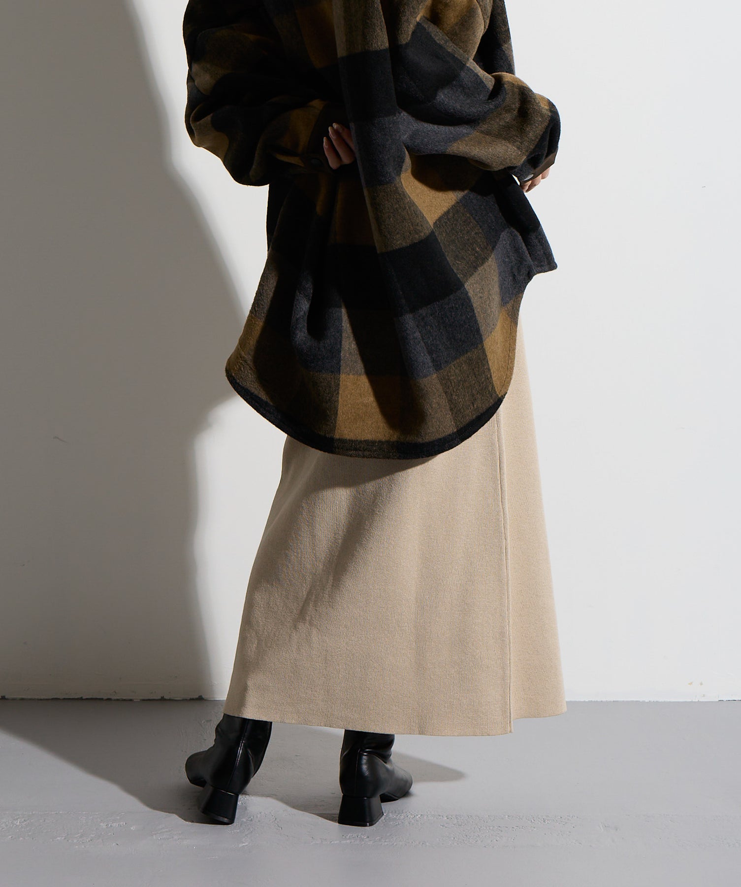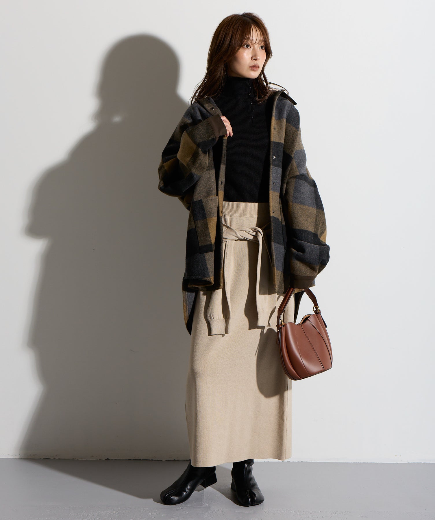 - STYLING POINT -ブラウン×ネイビーのチェックコートを主役に、ベージュの腰巻きニット風デザインスカートを合わせたコーディネート。スカートは同素材で仕立てた袖のようなディテールを腰まわりにあしらい、フロントで結ぶことで自然な立体感とアクセントをプラス。存在感のあるチェック柄に対して、ボトムは縦のラインを意識したシルエットで受け止め、全体をすっきりとまとめています。大人っぽくカジュアルに着こなすのがポイント。