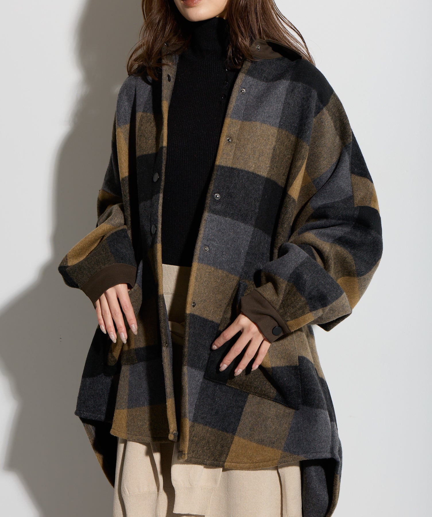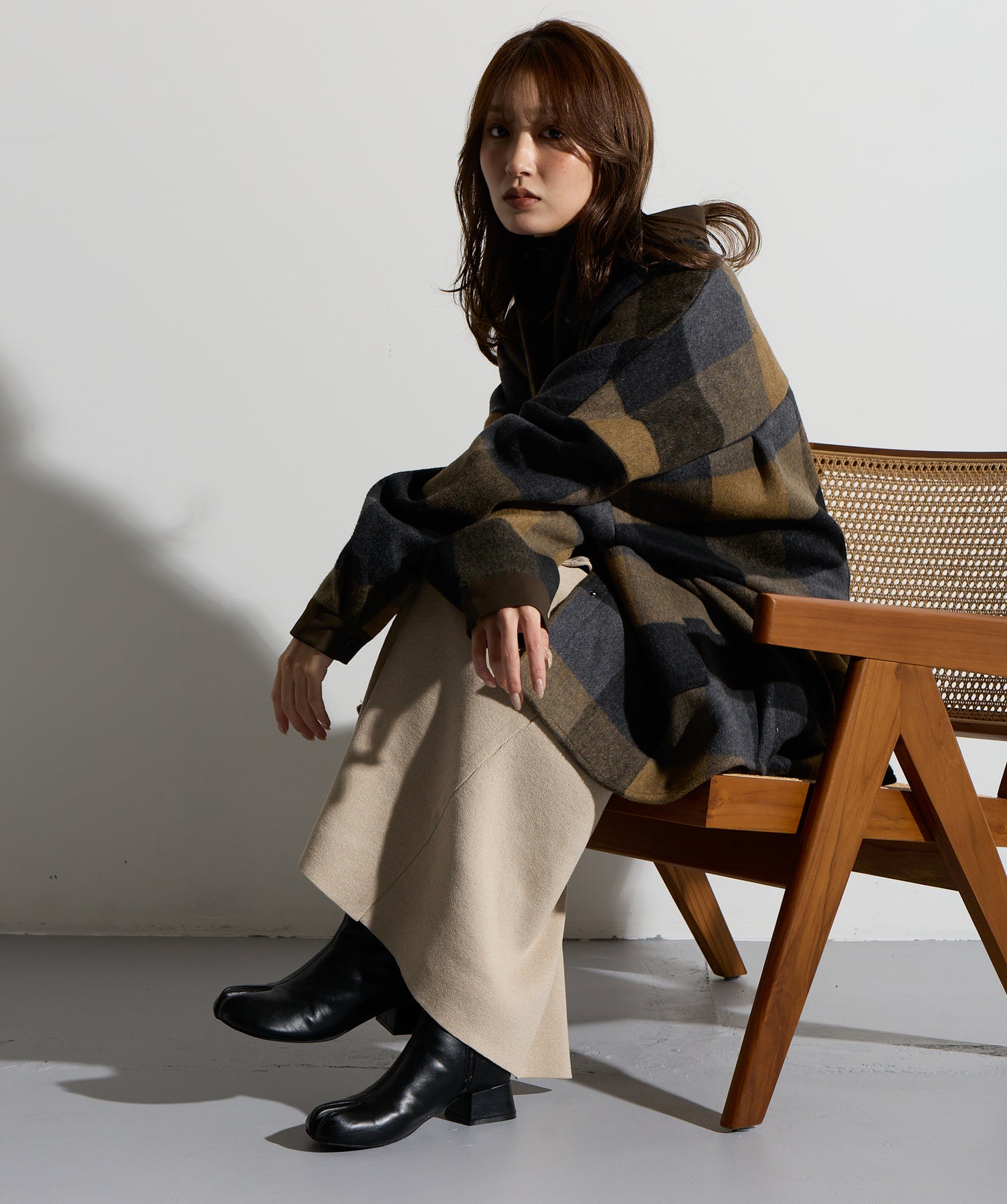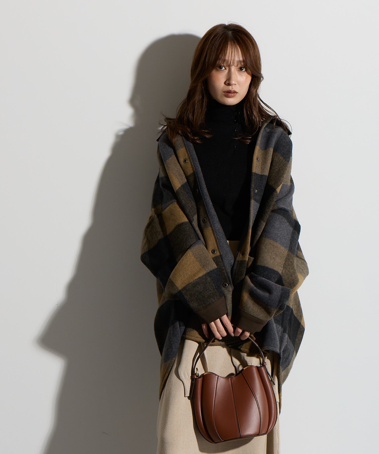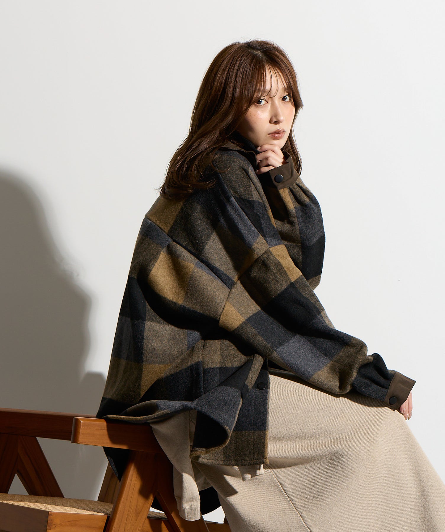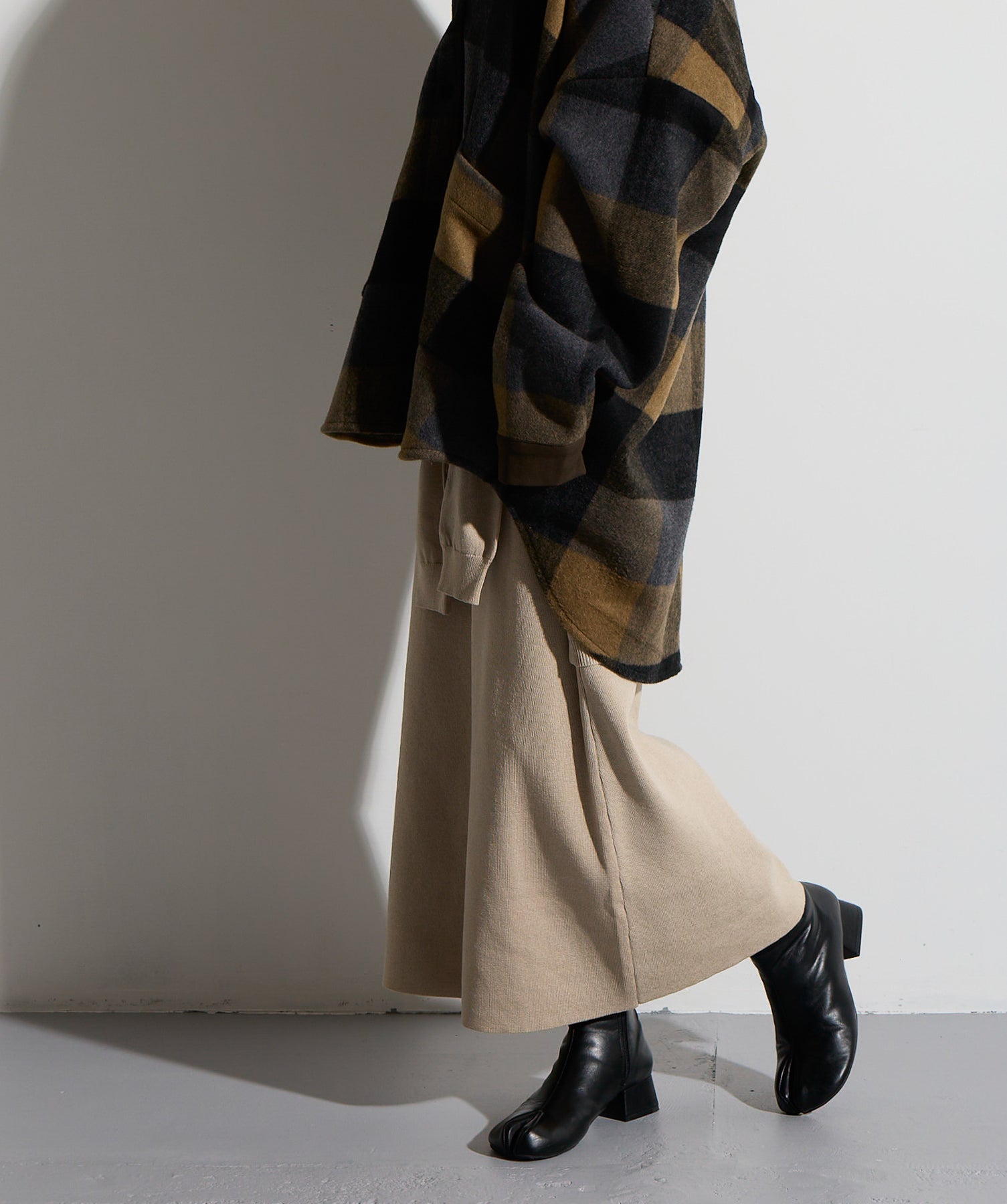 - STYLING POINT -ブラウン×ネイビーのチェックコートを主役に、ベージュの腰巻きニット風デザインスカートを合わせたコーディネート。スカートは同素材で仕立てた袖のようなディテールを腰まわりにあしらい、フロントで結ぶことで自然な立体感とアクセントをプラス。存在感のあるチェック柄に対して、ボトムは縦のラインを意識したシルエットで受け止め、全体をすっきりとまとめています。大人っぽくカジュアルに着こなすのがポイント。