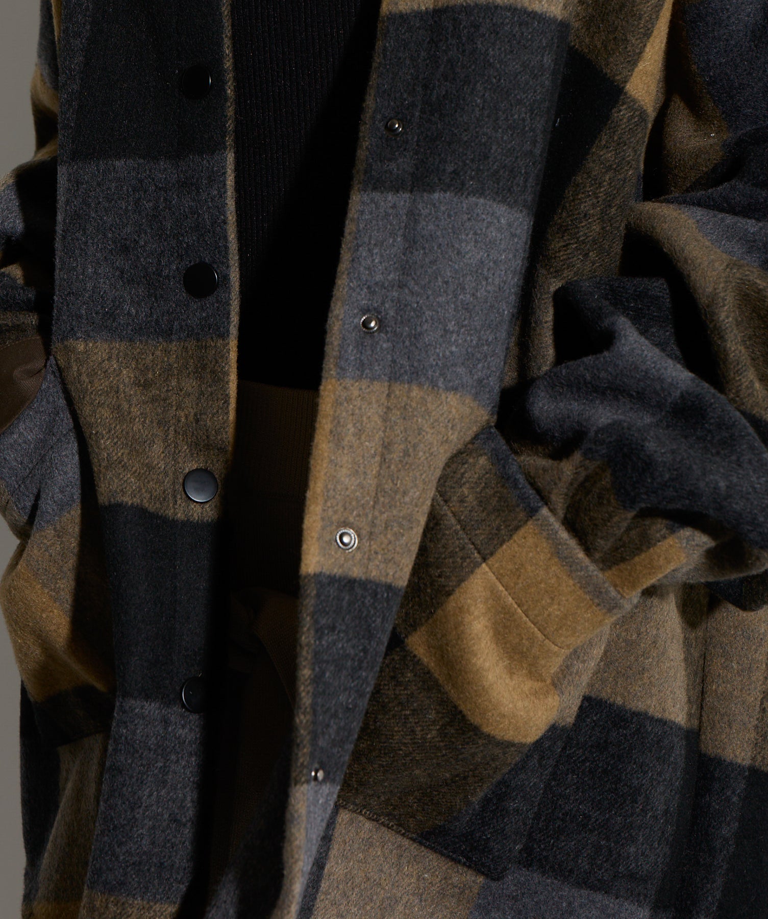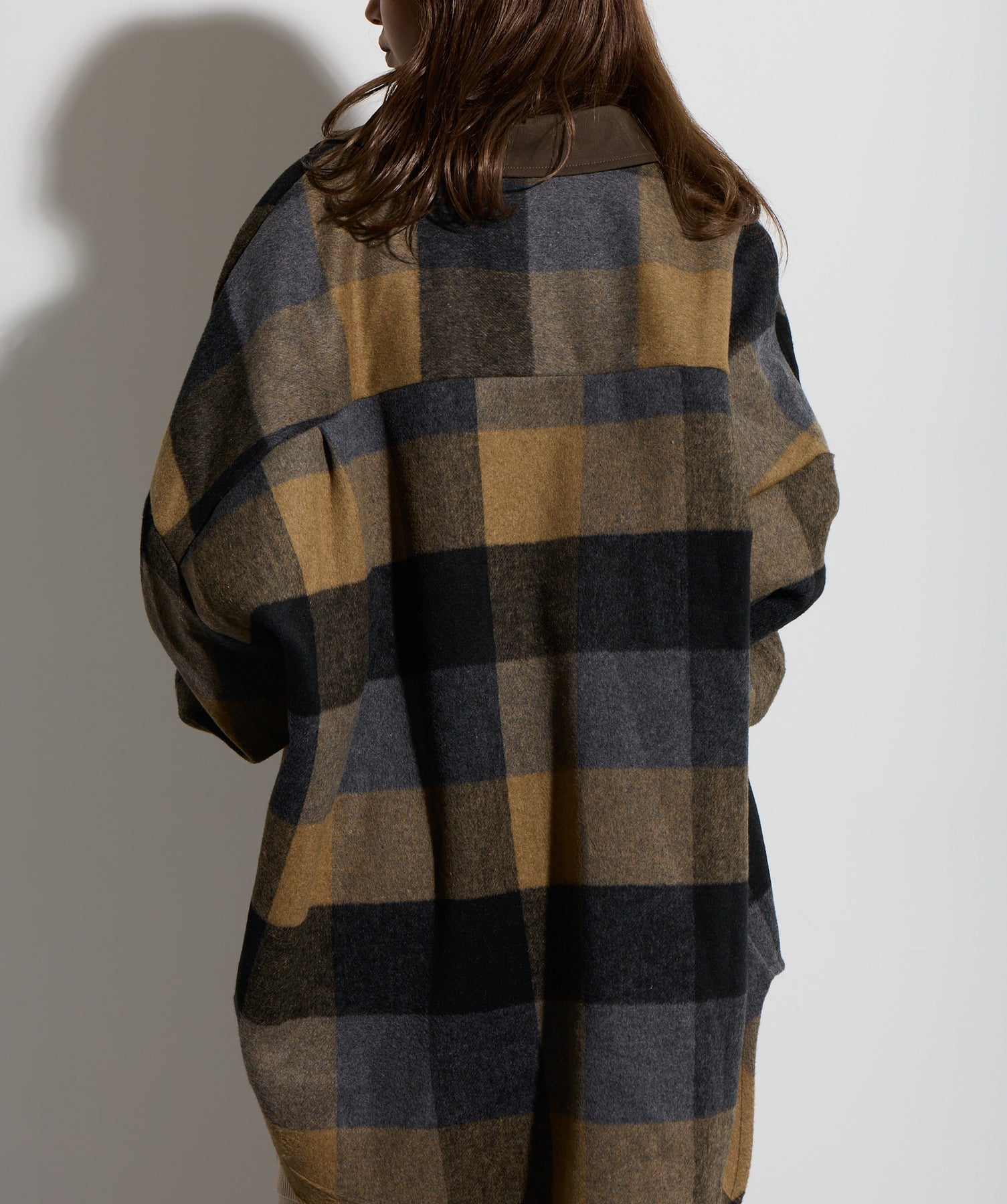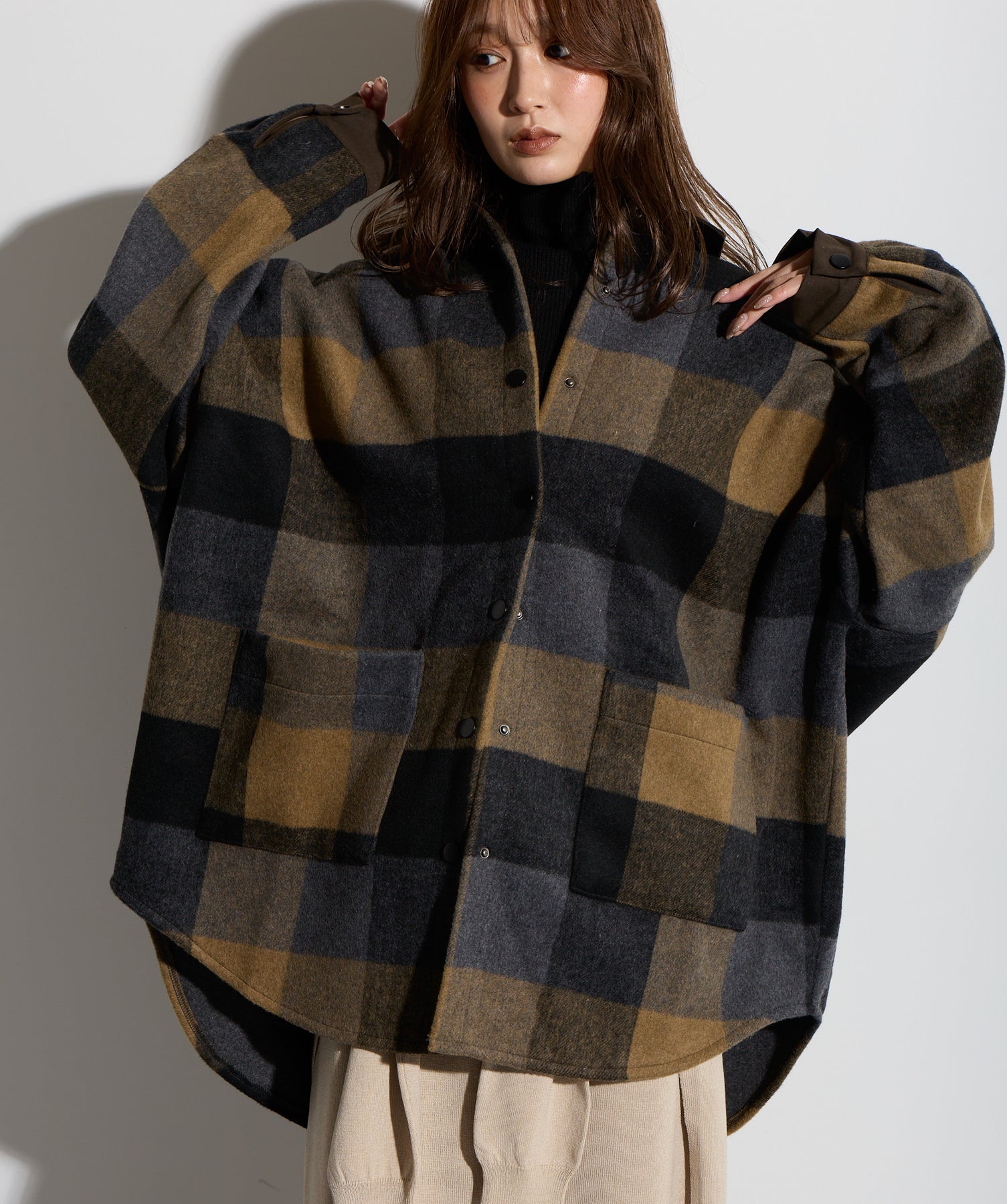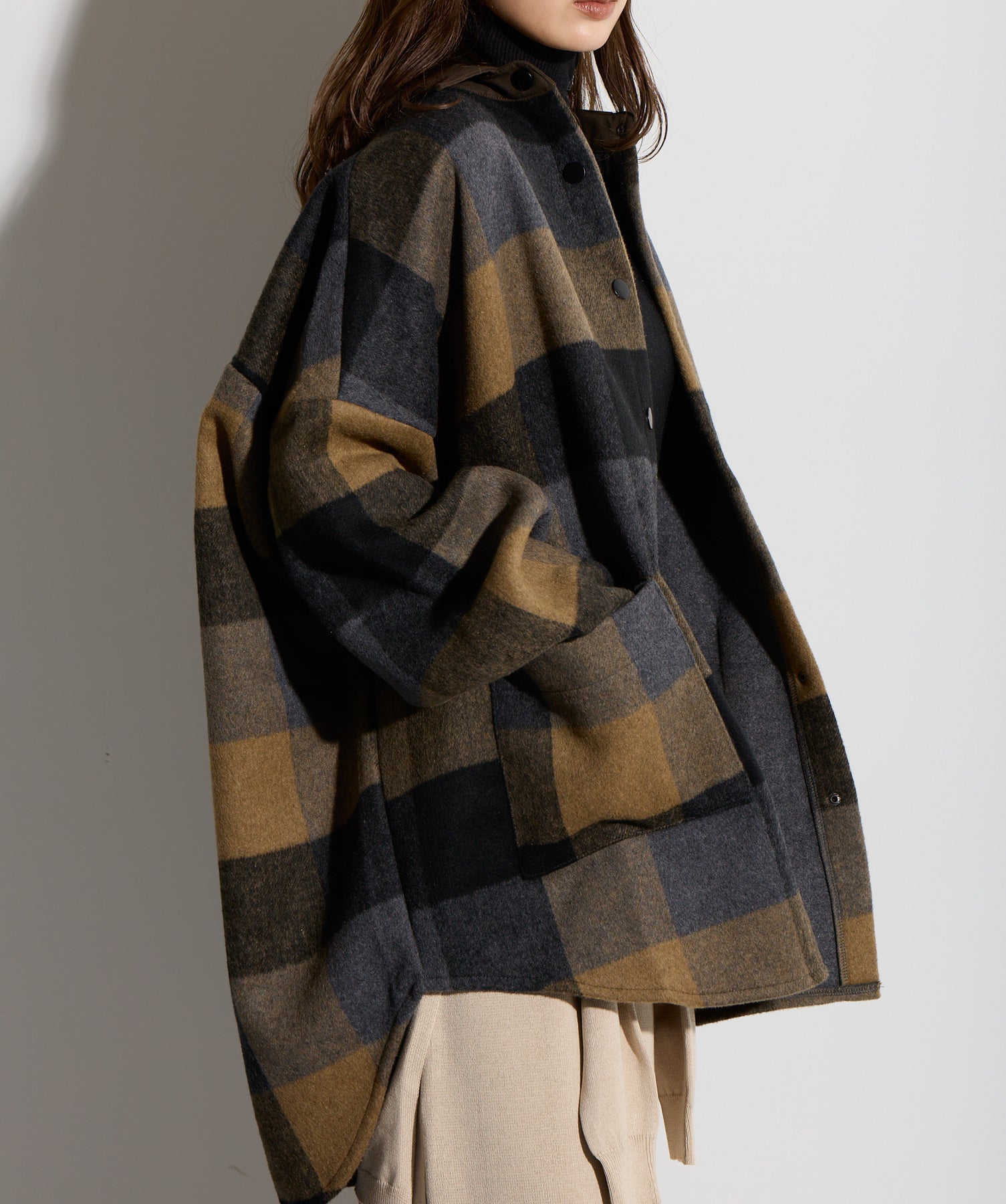 - STYLING POINT -ブラウン×ネイビーのチェックコートを主役に、ベージュの腰巻きニット風デザインスカートを合わせたコーディネート。スカートは同素材で仕立てた袖のようなディテールを腰まわりにあしらい、フロントで結ぶことで自然な立体感とアクセントをプラス。存在感のあるチェック柄に対して、ボトムは縦のラインを意識したシルエットで受け止め、全体をすっきりとまとめています。大人っぽくカジュアルに着こなすのがポイント。