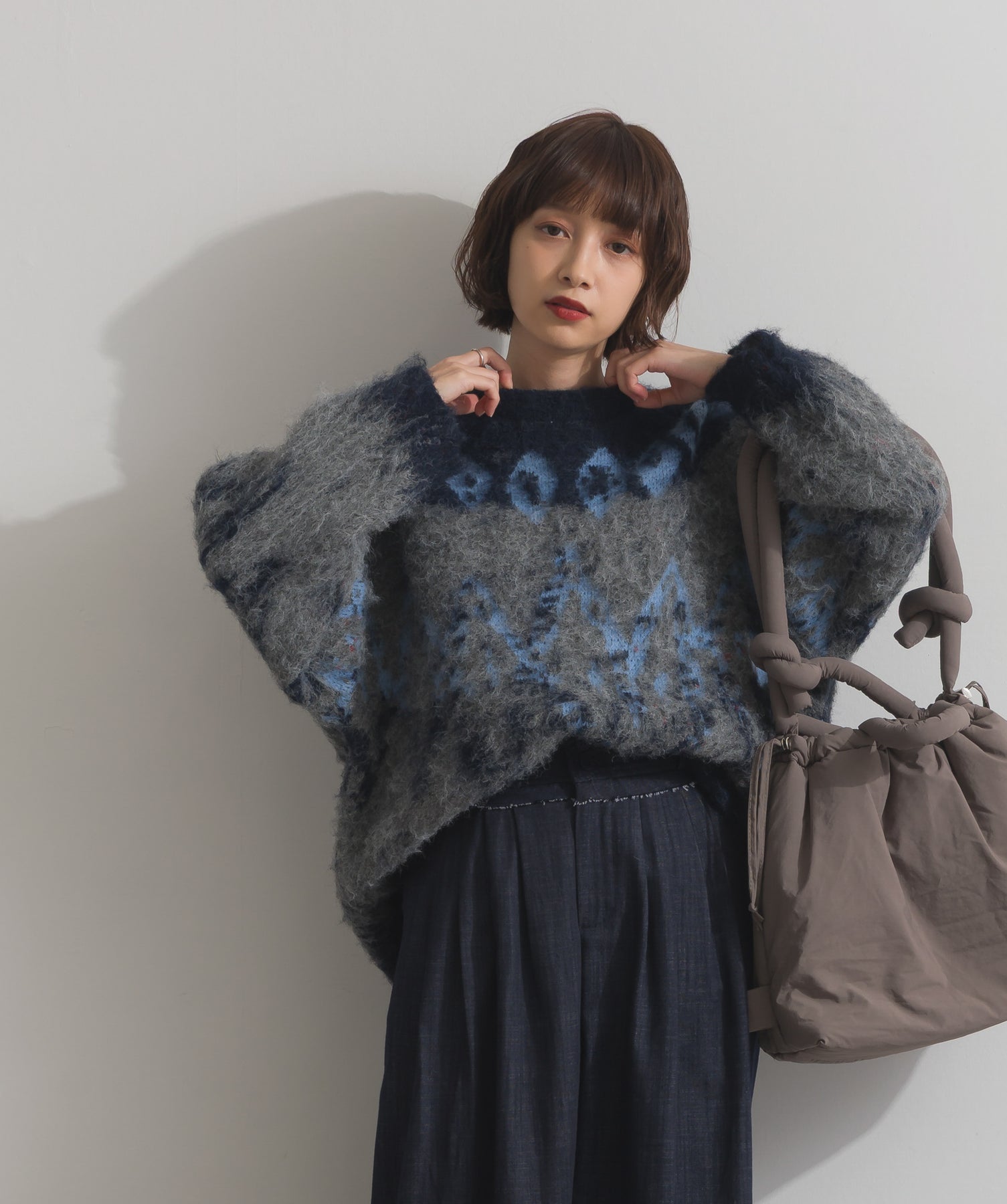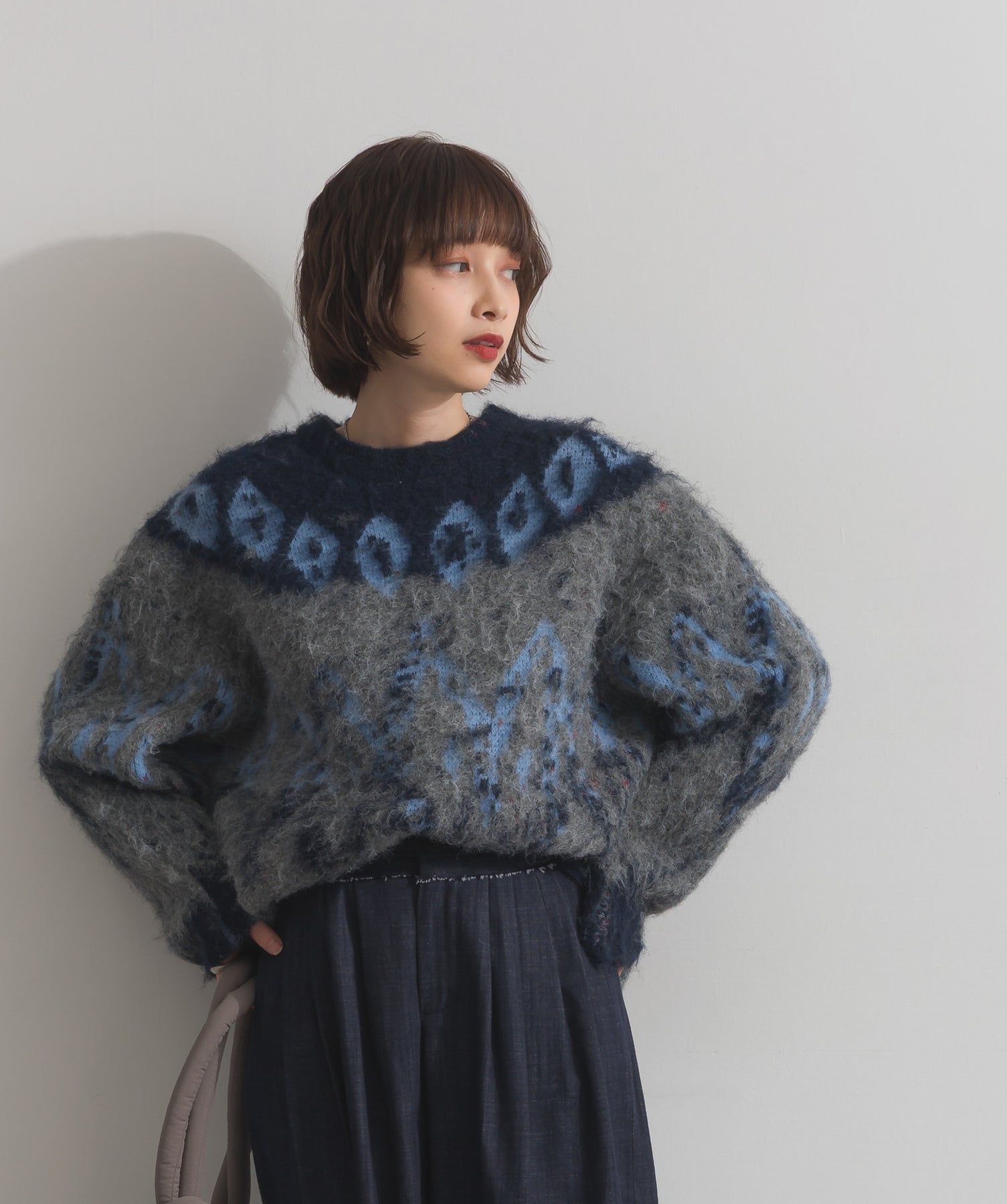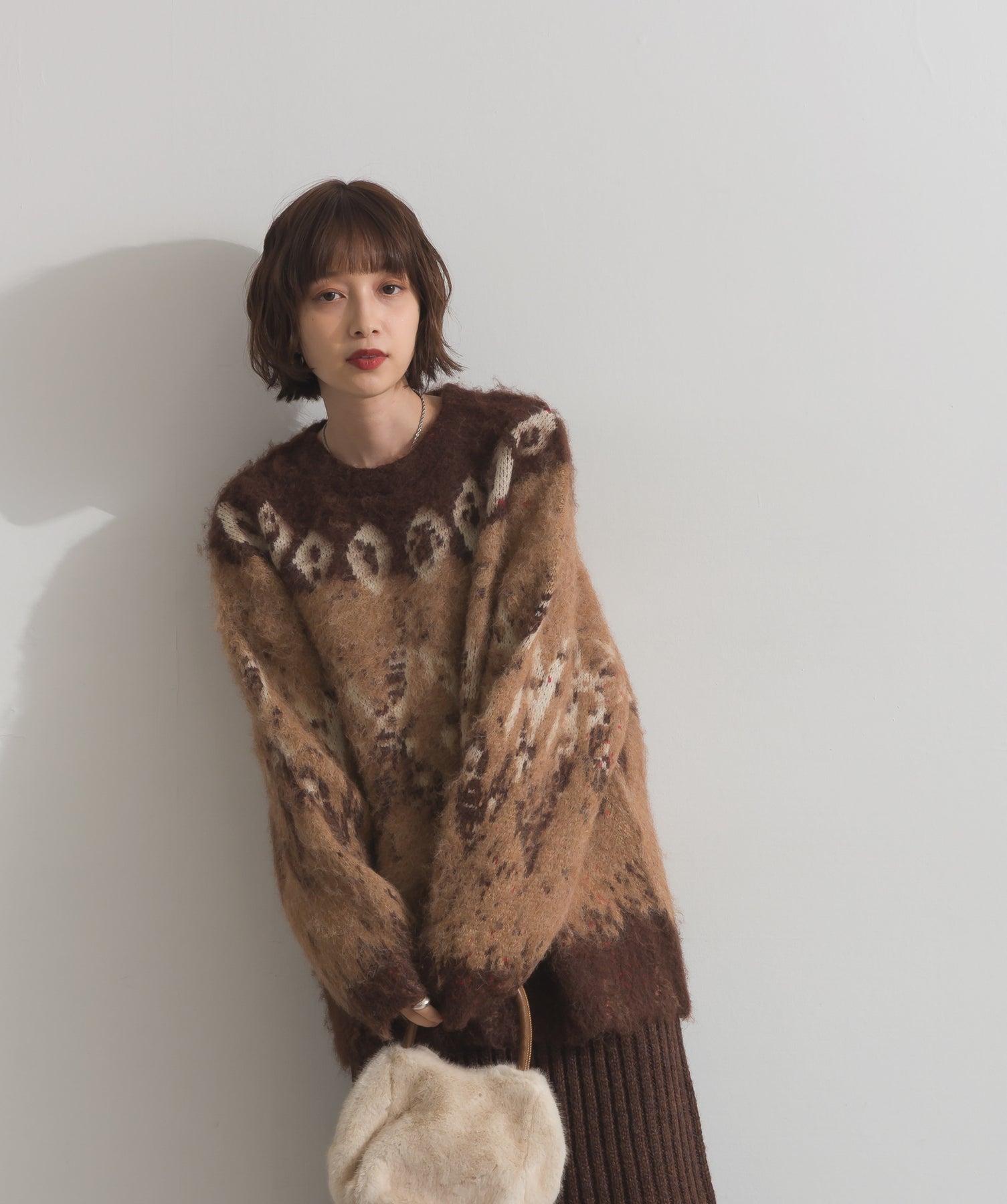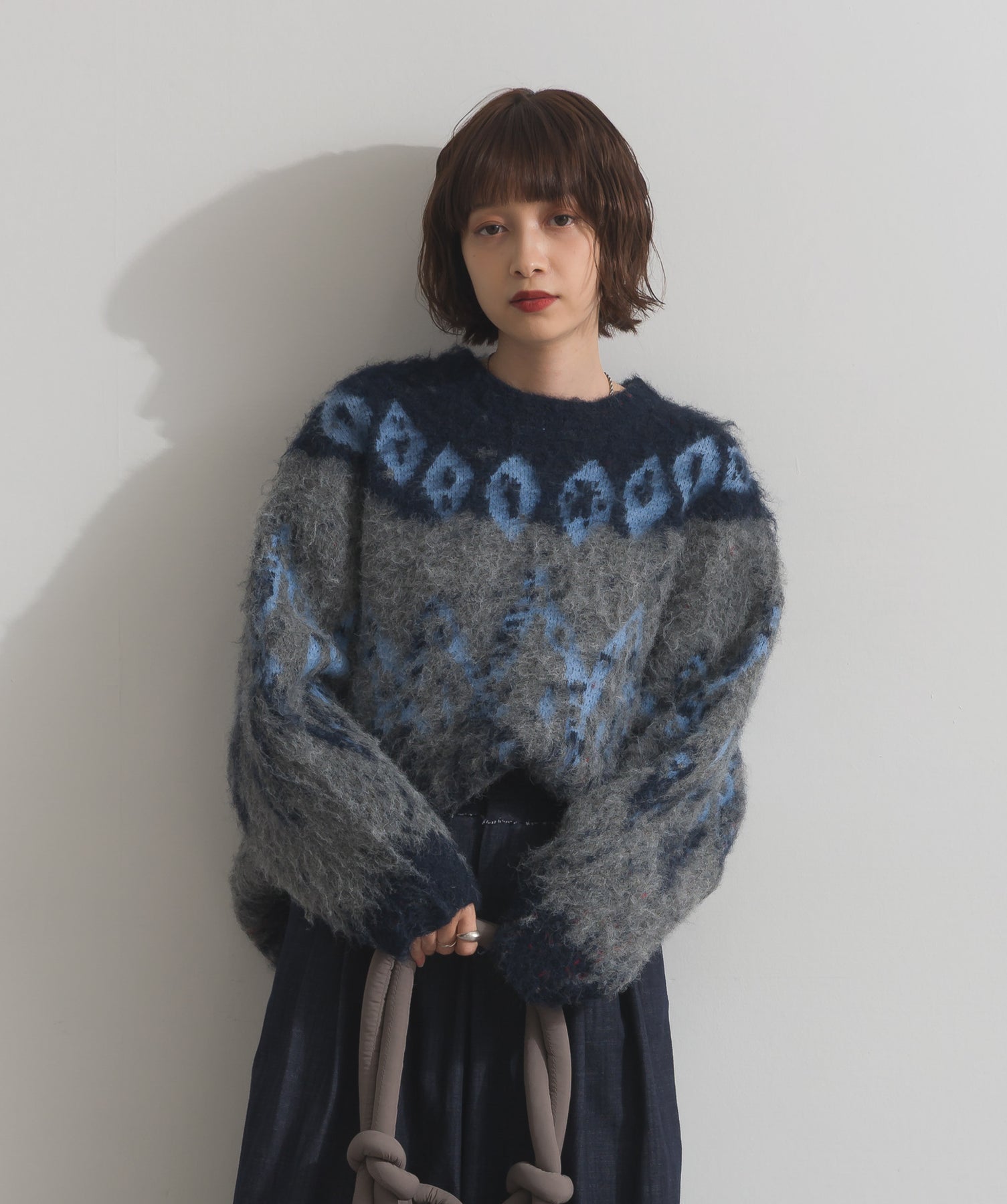 冬のミドを一枚で着る。存在感と暖かさを取り入れたノルディックニット。-material-ふんわりとしたシャギー素材を使用。軽やかな着心地ながらもしっかりと暖かく、肌あたりも優しいのでロングシーズン活躍します。空気を含んだようなふくらみのある編地が、柔らかさと防寒性を両立します。-design-思い切ったノルディックパターンが目を引く主役級プルオーバー。 ドロップショルダーとオーバーサイズのシルエットが抜け感を演出し、スタイリングに旬なバランスを加えます。 裾のランダムカットや毛足のある素材感が、ヴィンテージな雰囲気をプラス。 デニムやロングスカートと合わせるだけで、即馴染み感のある着こなしに。