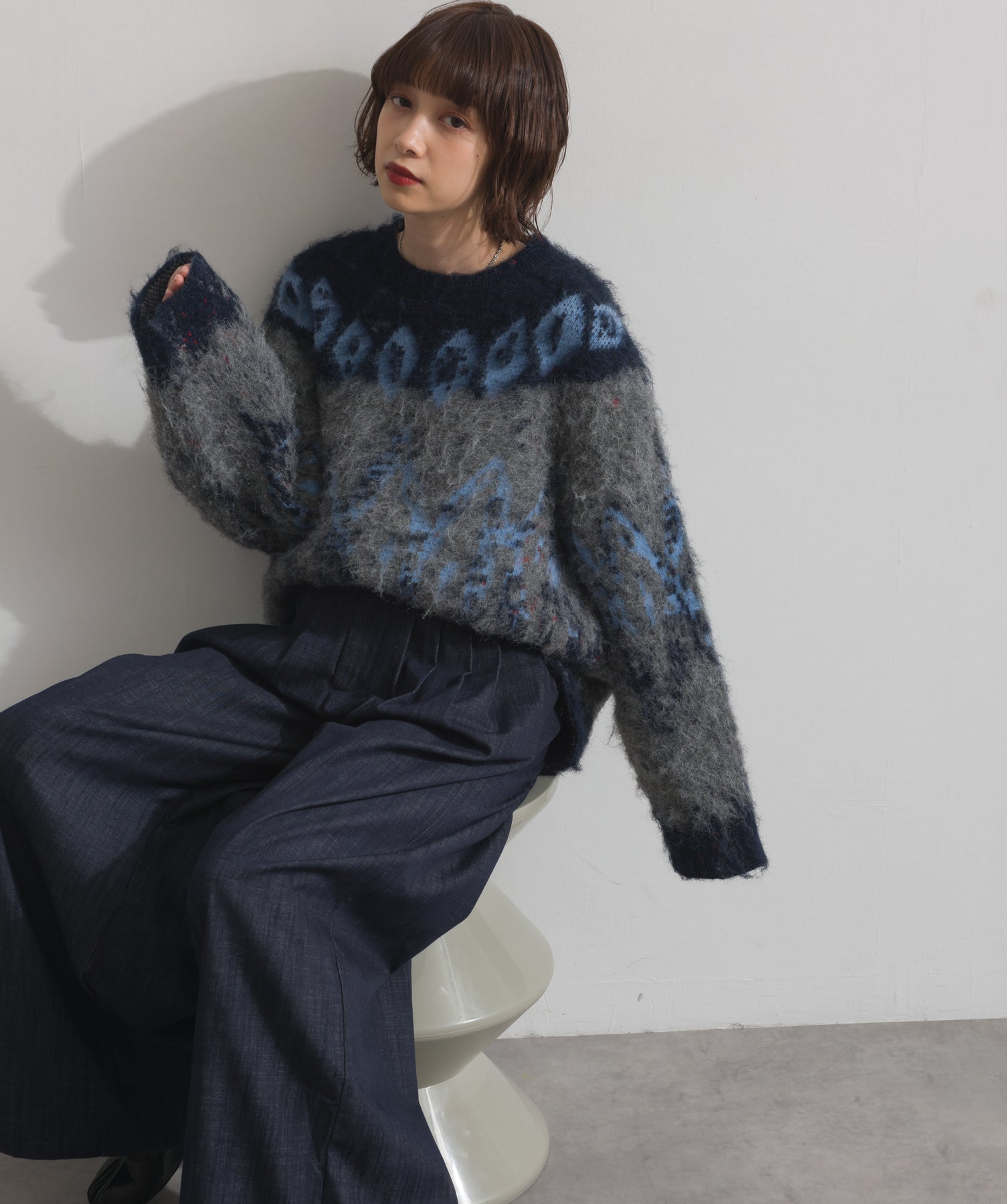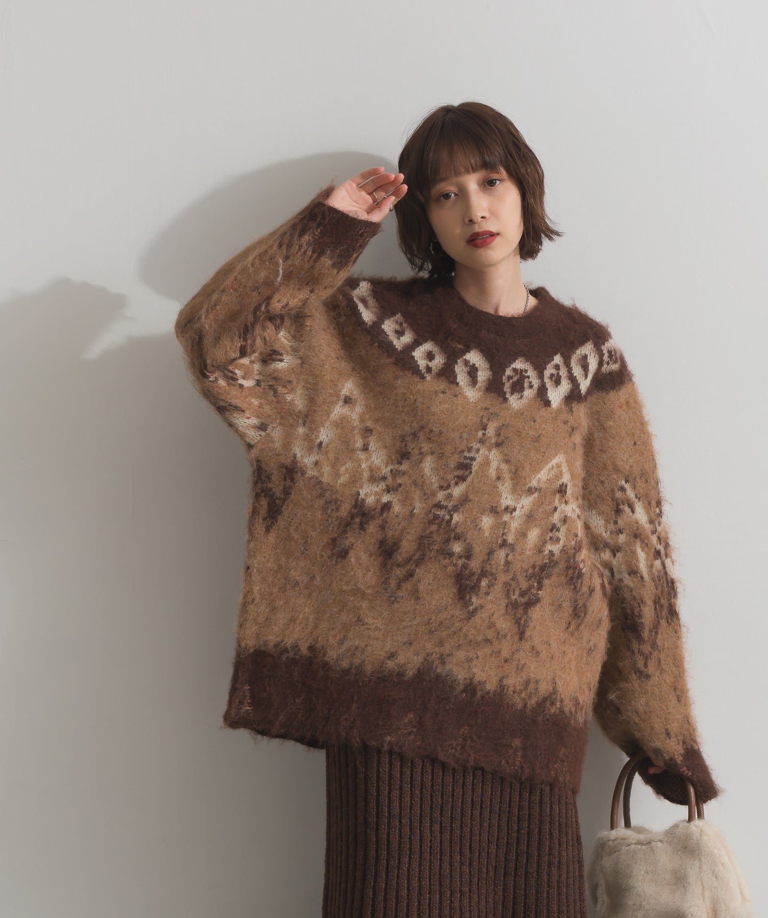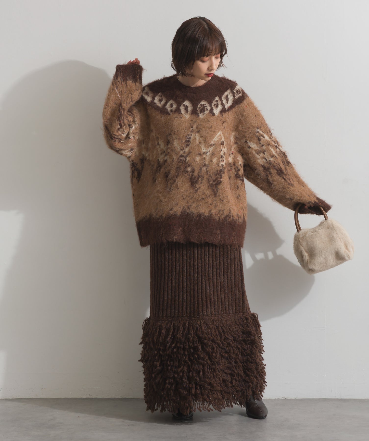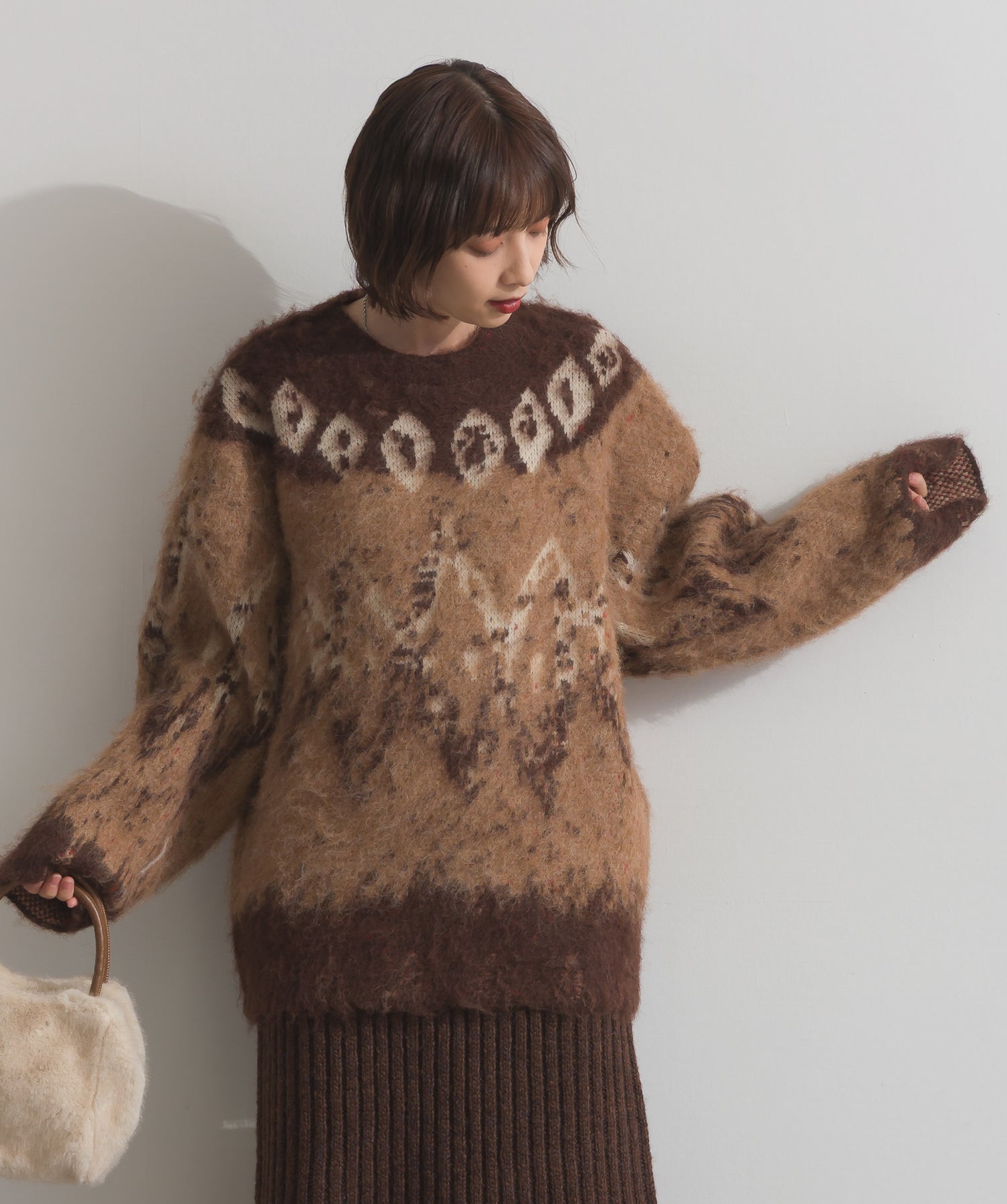 冬のミドを一枚で着る。存在感と暖かさを取り入れたノルディックニット。-material-ふんわりとしたシャギー素材を使用。軽やかな着心地ながらもしっかりと暖かく、肌あたりも優しいのでロングシーズン活躍します。空気を含んだようなふくらみのある編地が、柔らかさと防寒性を両立します。-design-思い切ったノルディックパターンが目を引く主役級プルオーバー。 ドロップショルダーとオーバーサイズのシルエットが抜け感を演出し、スタイリングに旬なバランスを加えます。 裾のランダムカットや毛足のある素材感が、ヴィンテージな雰囲気をプラス。 デニムやロングスカートと合わせるだけで、即馴染み感のある着こなしに。