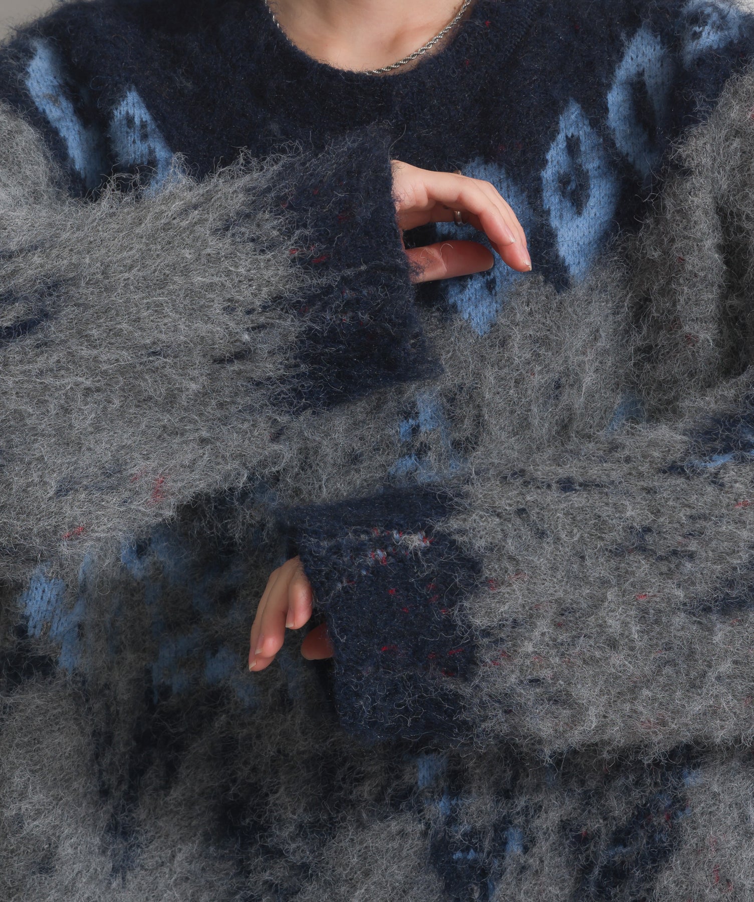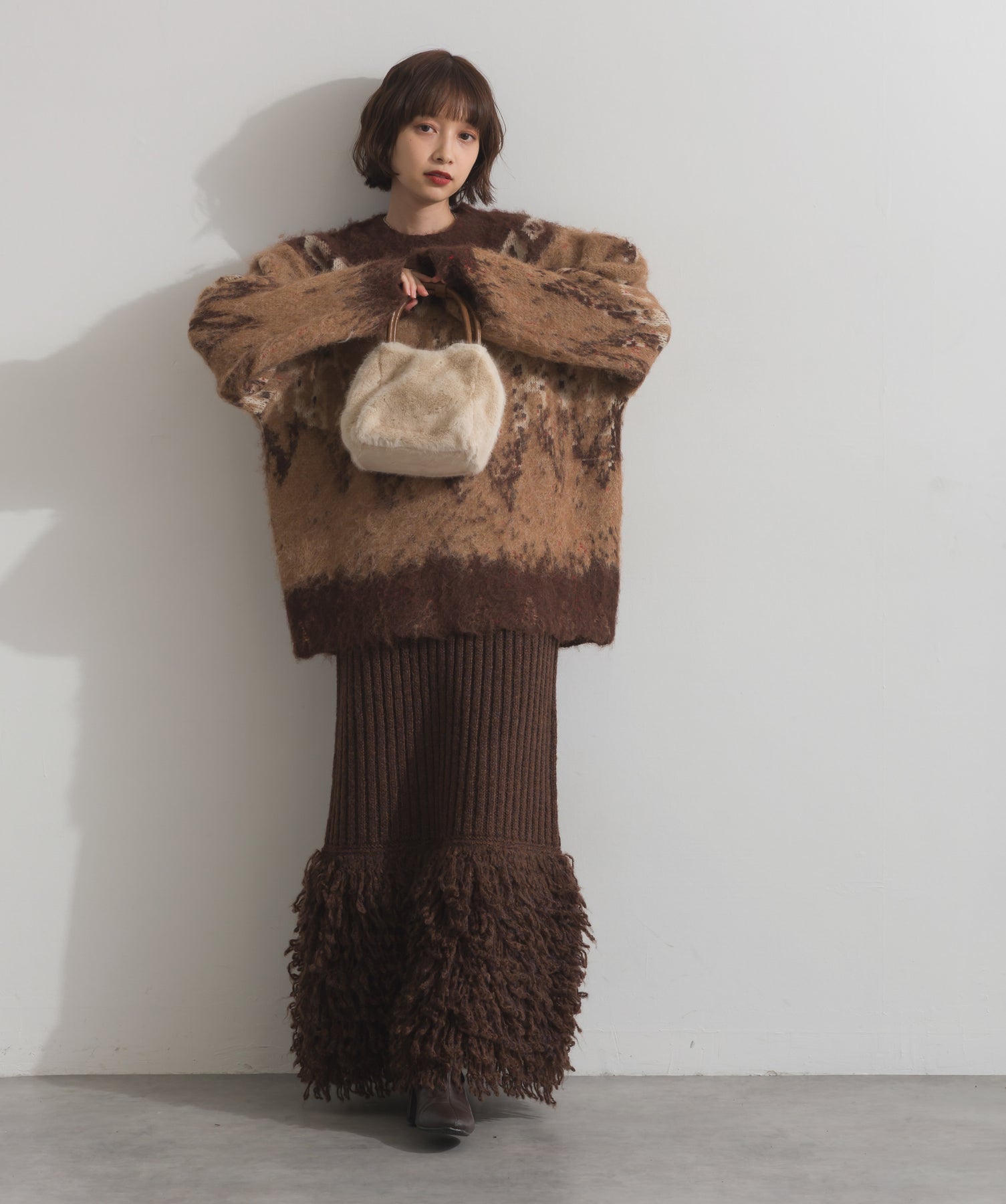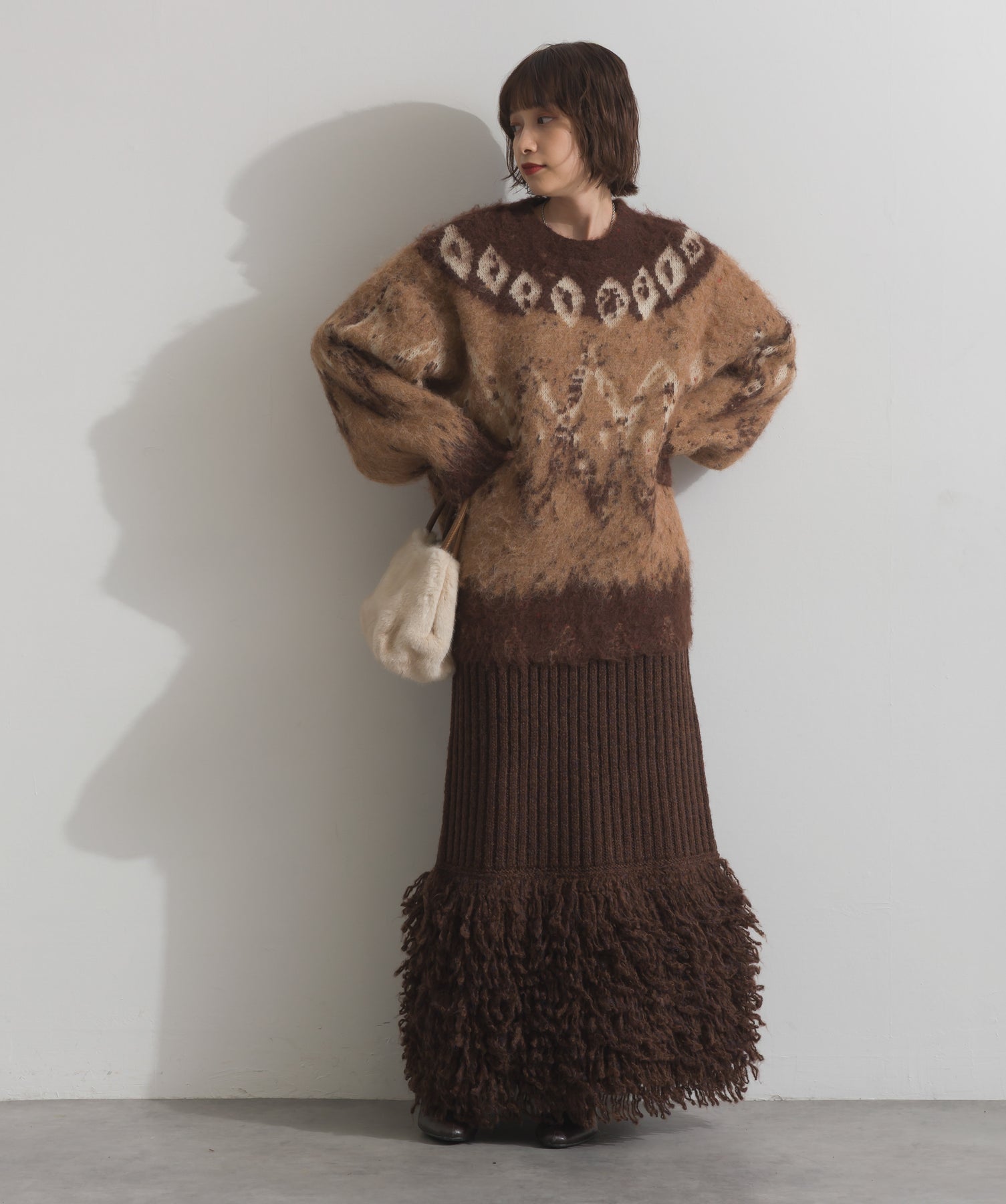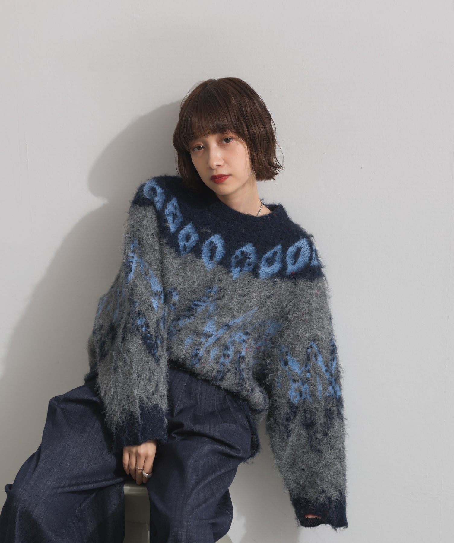 冬のミドを一枚で着る。存在感と暖かさを取り入れたノルディックニット。-material-ふんわりとしたシャギー素材を使用。軽やかな着心地ながらもしっかりと暖かく、肌あたりも優しいのでロングシーズン活躍します。空気を含んだようなふくらみのある編地が、柔らかさと防寒性を両立します。-design-思い切ったノルディックパターンが目を引く主役級プルオーバー。 ドロップショルダーとオーバーサイズのシルエットが抜け感を演出し、スタイリングに旬なバランスを加えます。 裾のランダムカットや毛足のある素材感が、ヴィンテージな雰囲気をプラス。 デニムやロングスカートと合わせるだけで、即馴染み感のある着こなしに。