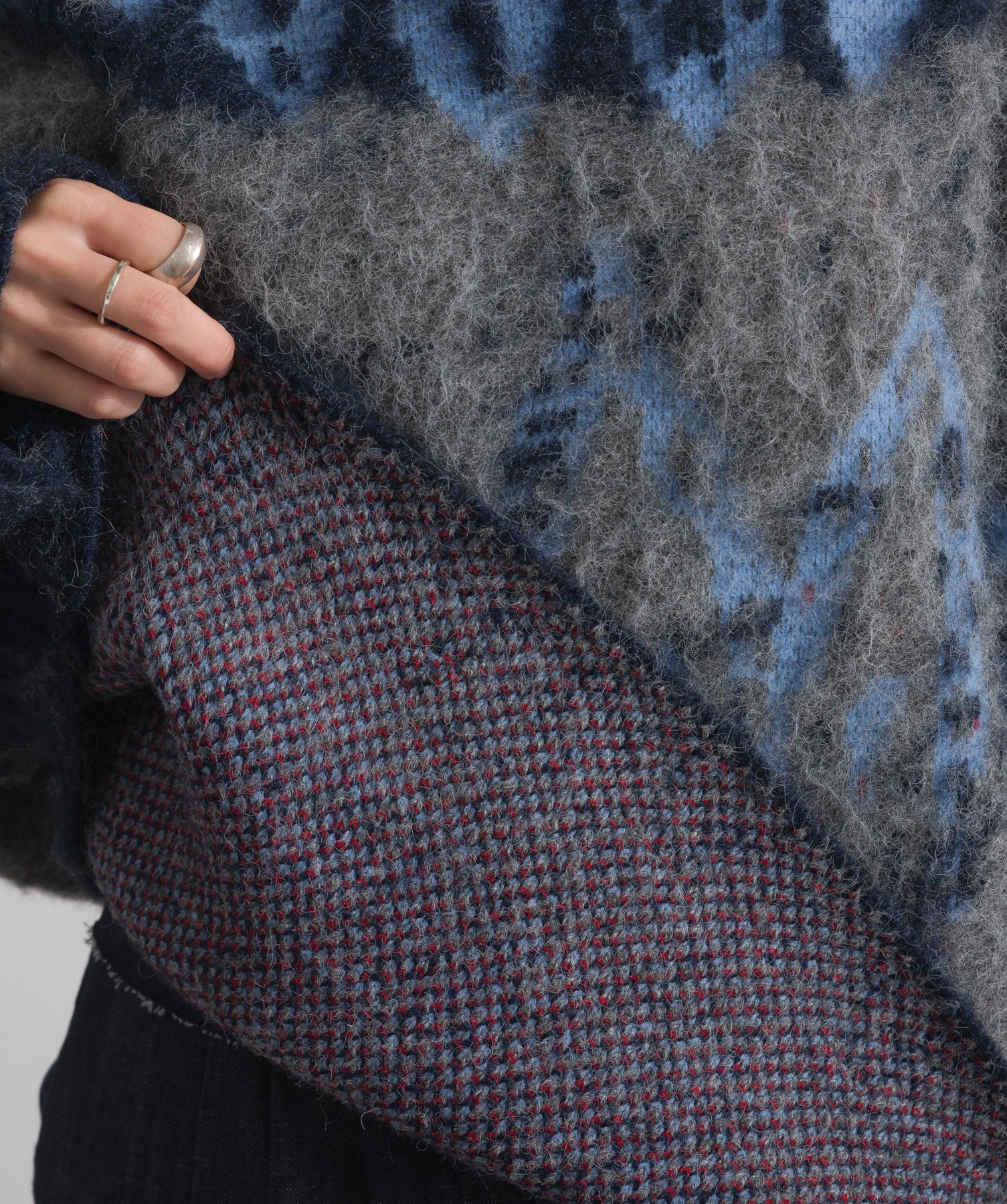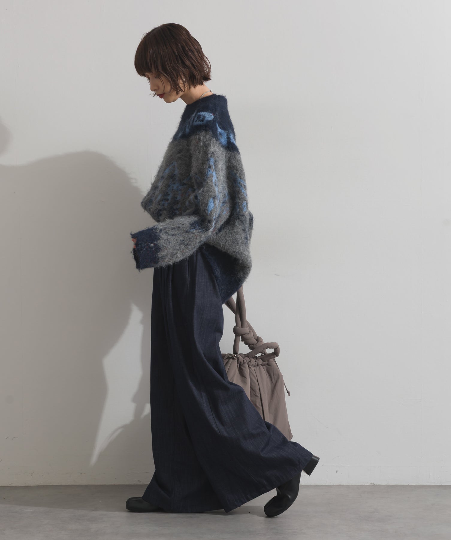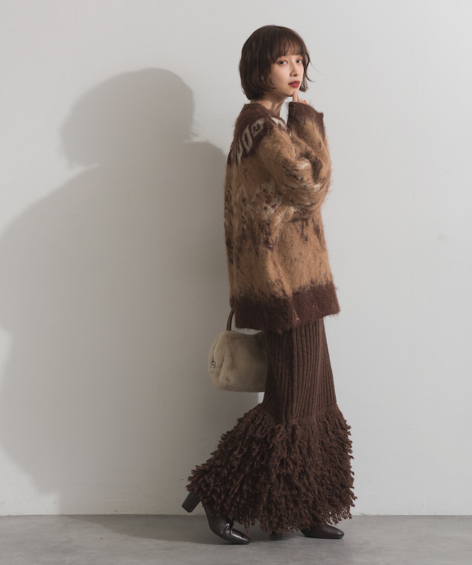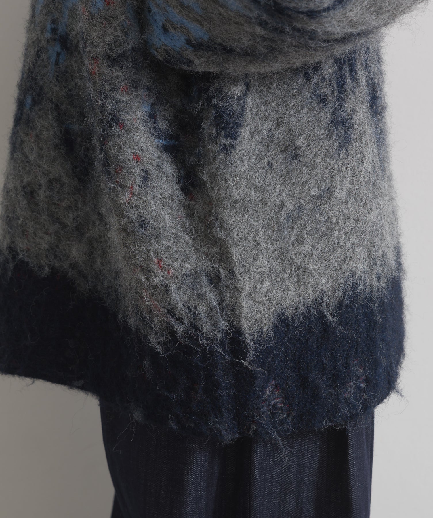 冬のミドを一枚で着る。存在感と暖かさを取り入れたノルディックニット。-material-ふんわりとしたシャギー素材を使用。軽やかな着心地ながらもしっかりと暖かく、肌あたりも優しいのでロングシーズン活躍します。空気を含んだようなふくらみのある編地が、柔らかさと防寒性を両立します。-design-思い切ったノルディックパターンが目を引く主役級プルオーバー。 ドロップショルダーとオーバーサイズのシルエットが抜け感を演出し、スタイリングに旬なバランスを加えます。 裾のランダムカットや毛足のある素材感が、ヴィンテージな雰囲気をプラス。 デニムやロングスカートと合わせるだけで、即馴染み感のある着こなしに。