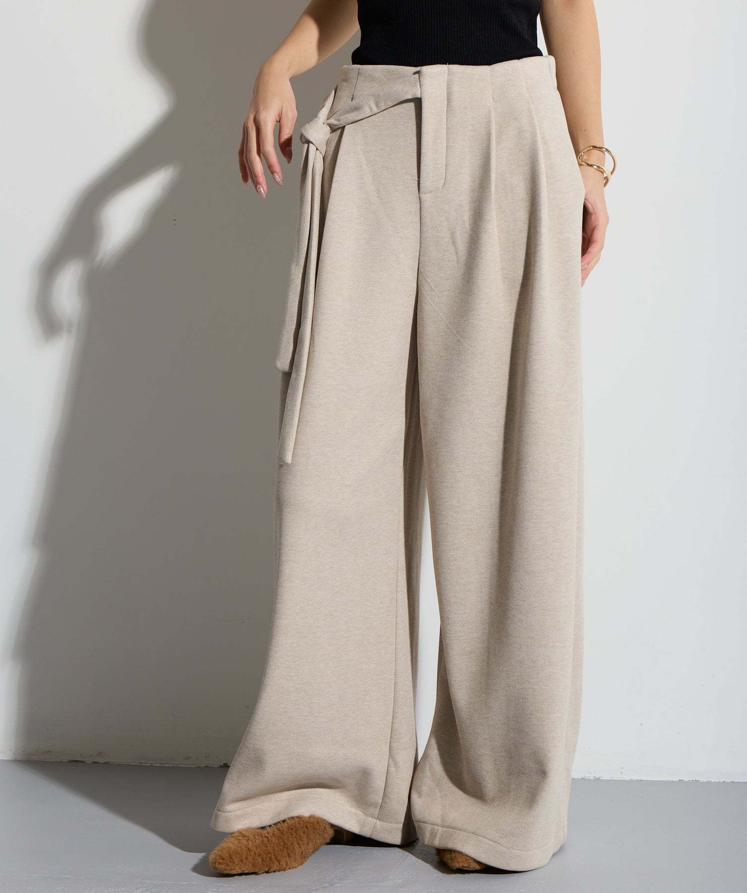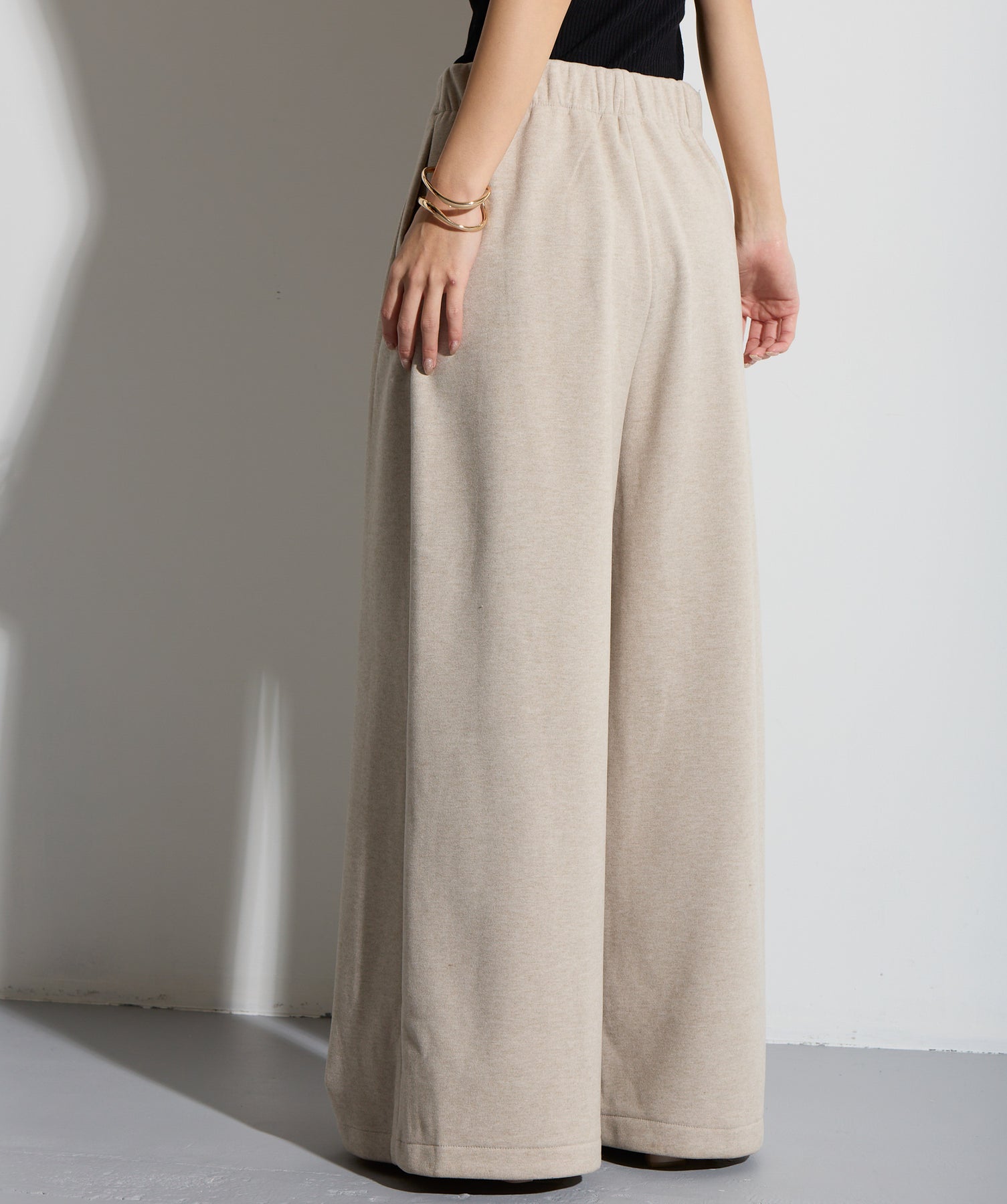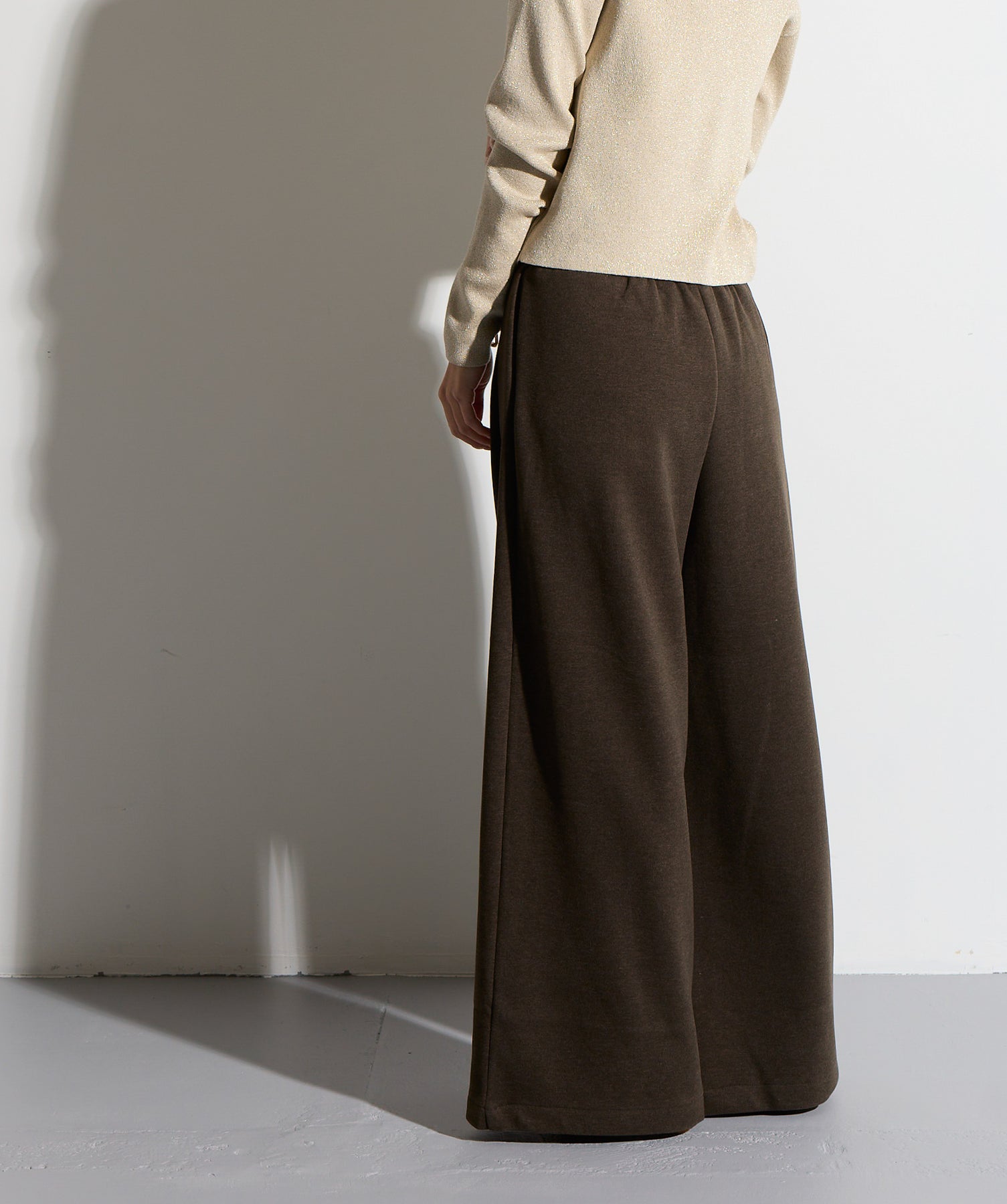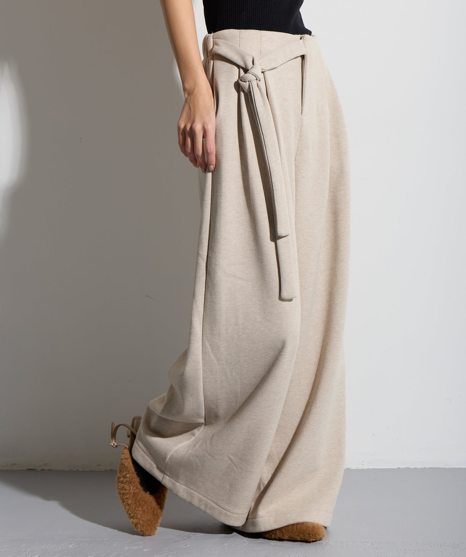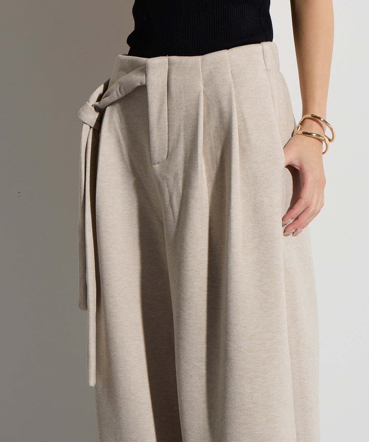 計算された抜け感と美シルエット。洗練モードなワイドパンツ。-material-落ち感のあるポンチライク素材を使用。 なめらかな肌触りと程よい厚みで、シルエットを美しくキープしながら快適な穿き心地を実現。シワになりにくく、ロングシーズン活躍できるイージーケア素材です。-design-ウエストのラップ風ディテールがアクセントになった、ミニマルながら印象的なデザイン。やや高めのウエスト位置とタック入りのワイドシルエットが脚を長く見せ、スタイルアップを叶えます。後ろウエストはゴム仕様でリラクシーな穿き心地。シャープにも、ラフにも、幅広いトップスと好相性な万能パンツです。
