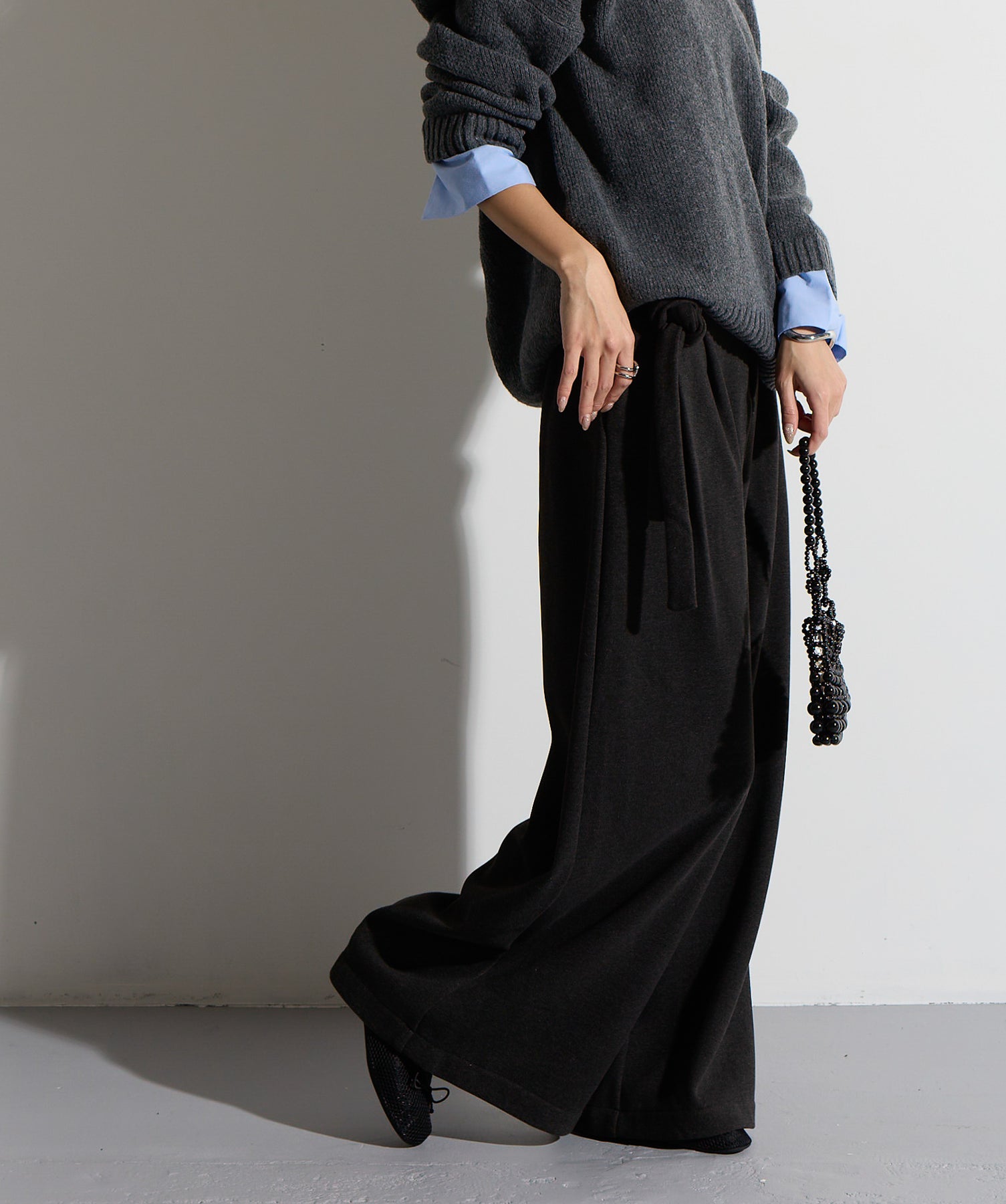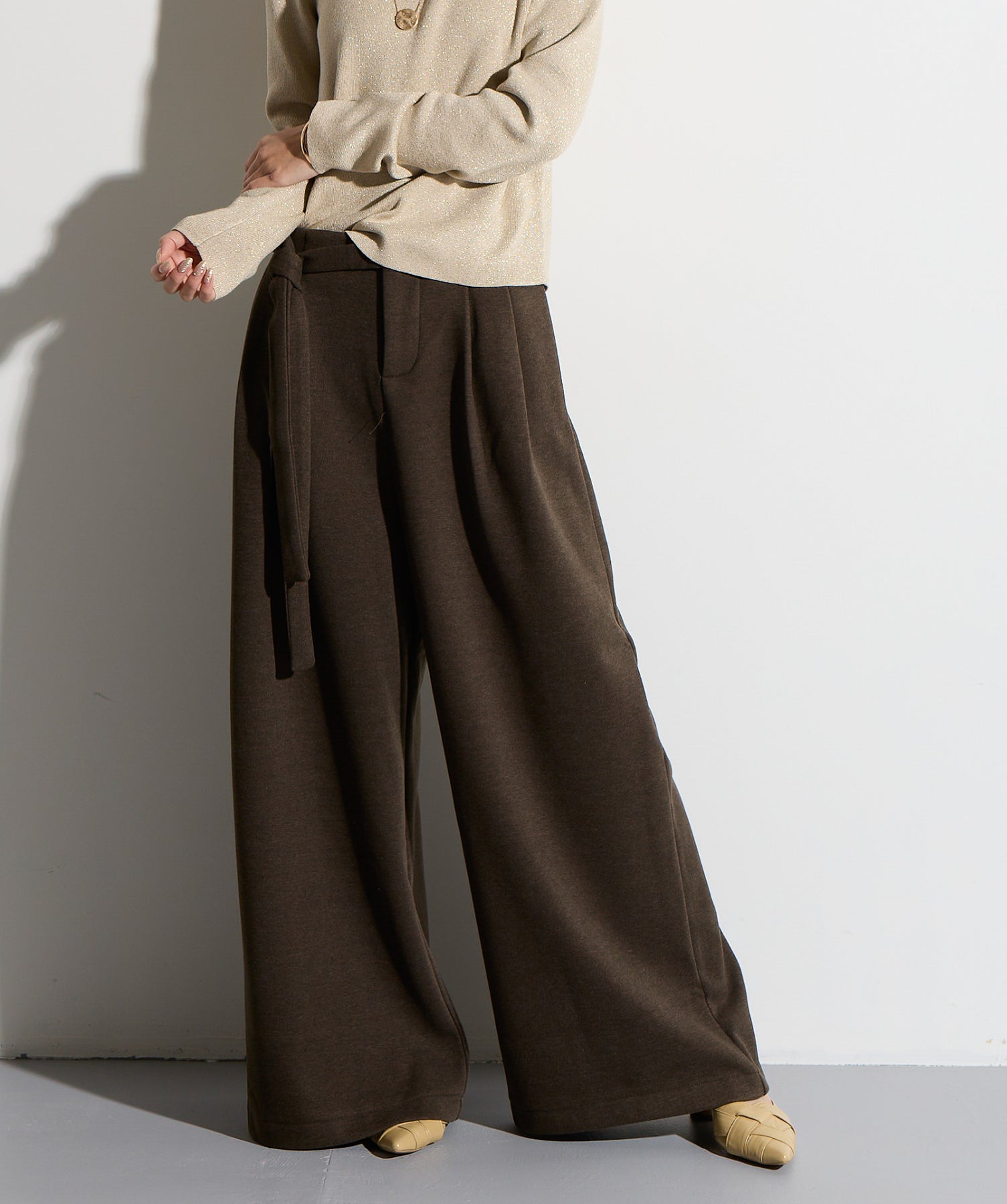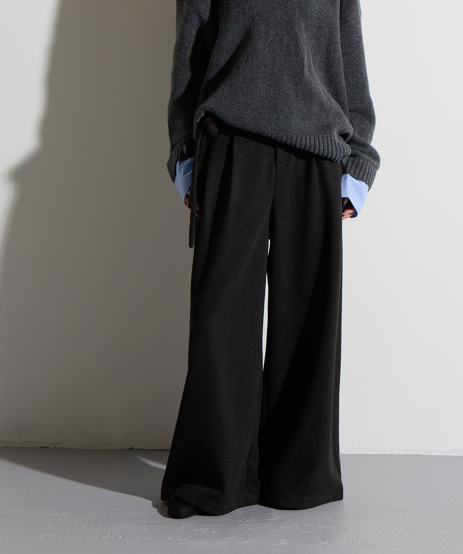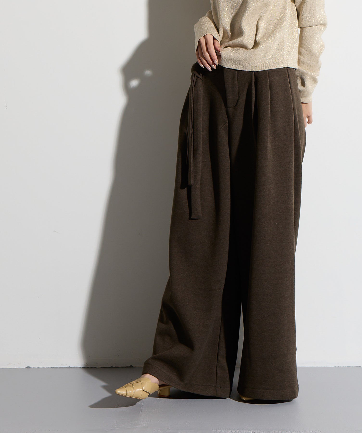 計算された抜け感と美シルエット。洗練モードなワイドパンツ。-material-落ち感のあるポンチライク素材を使用。 なめらかな肌触りと程よい厚みで、シルエットを美しくキープしながら快適な穿き心地を実現。シワになりにくく、ロングシーズン活躍できるイージーケア素材です。-design-ウエストのラップ風ディテールがアクセントになった、ミニマルながら印象的なデザイン。やや高めのウエスト位置とタック入りのワイドシルエットが脚を長く見せ、スタイルアップを叶えます。後ろウエストはゴム仕様でリラクシーな穿き心地。シャープにも、ラフにも、幅広いトップスと好相性な万能パンツです。