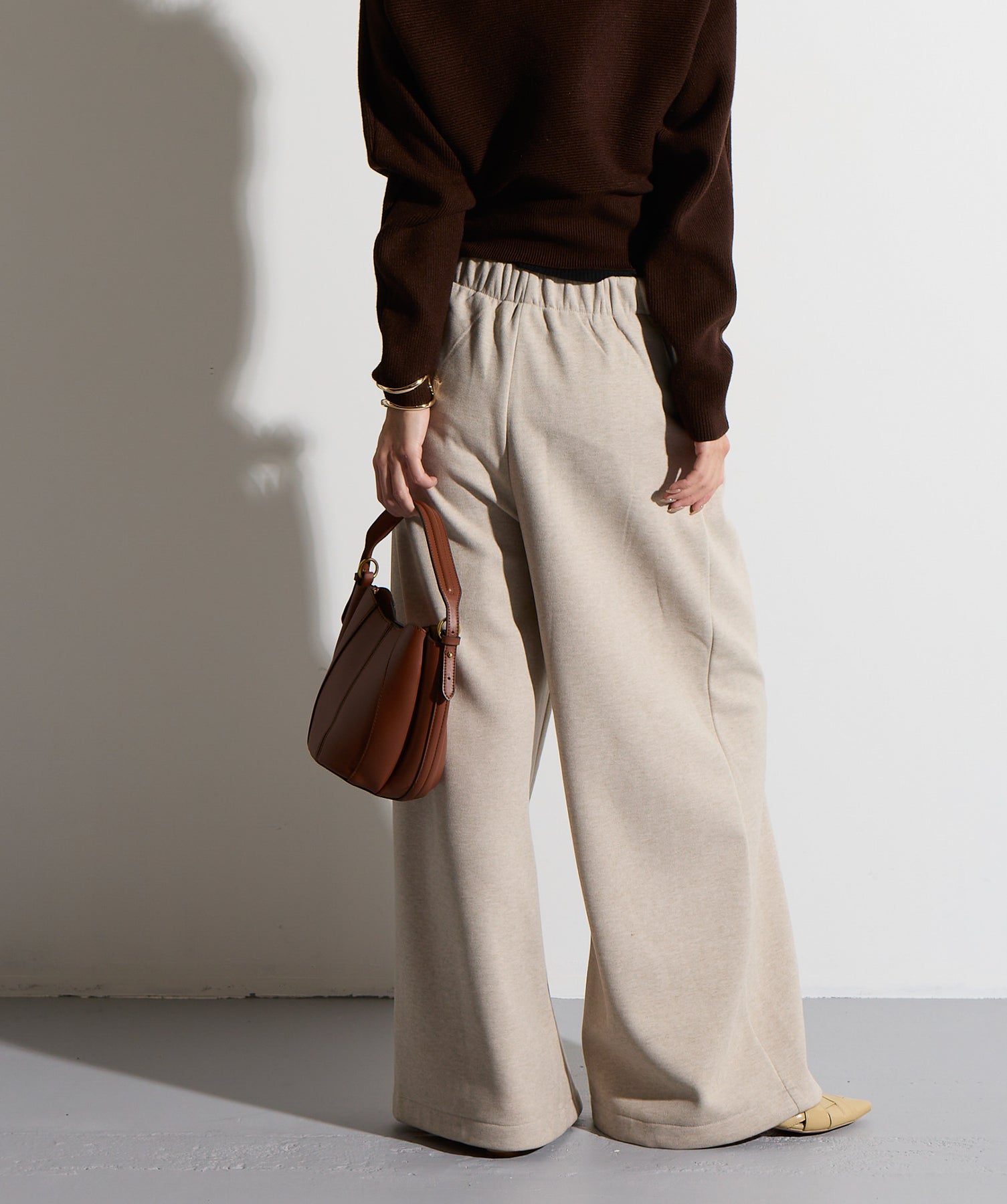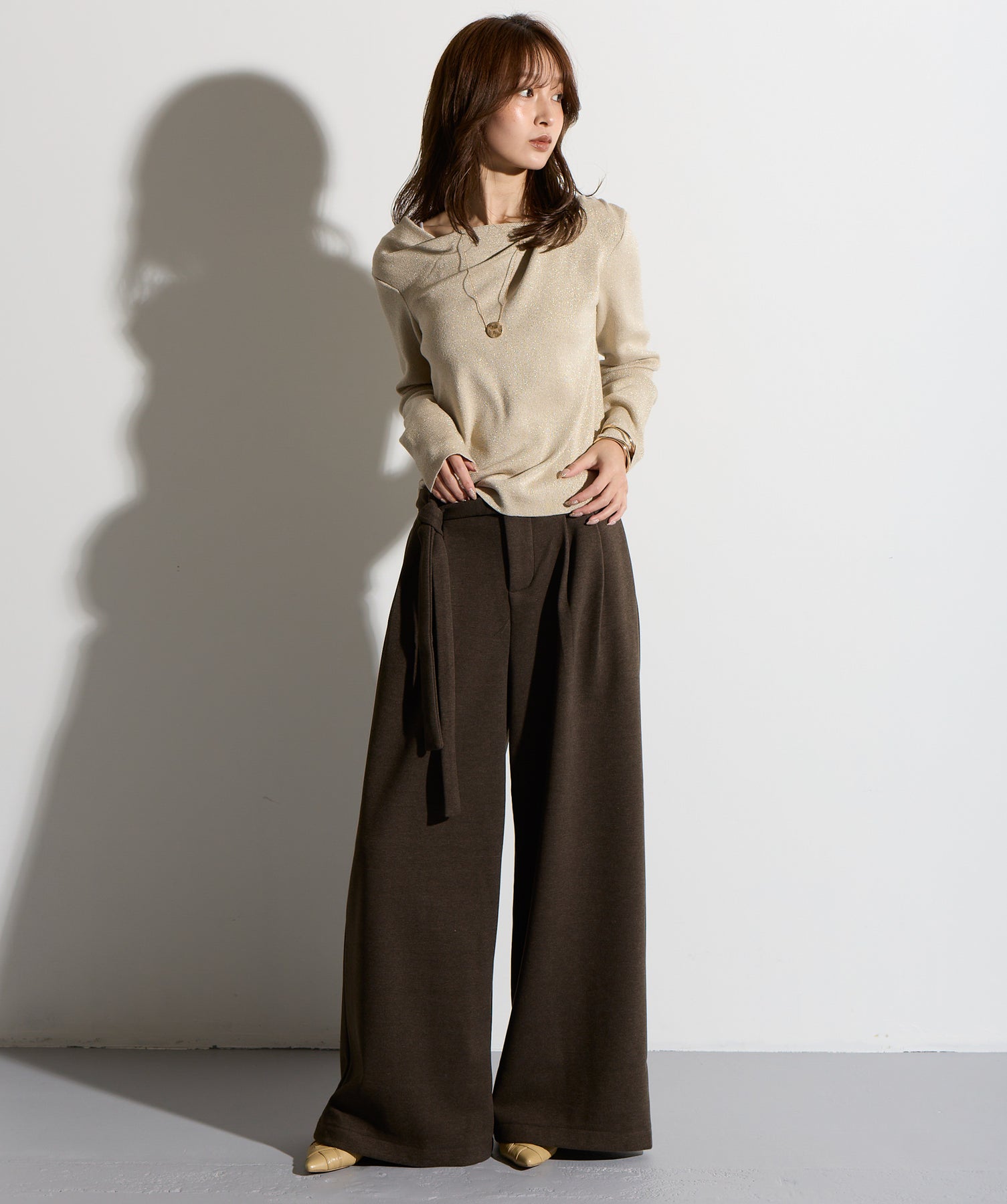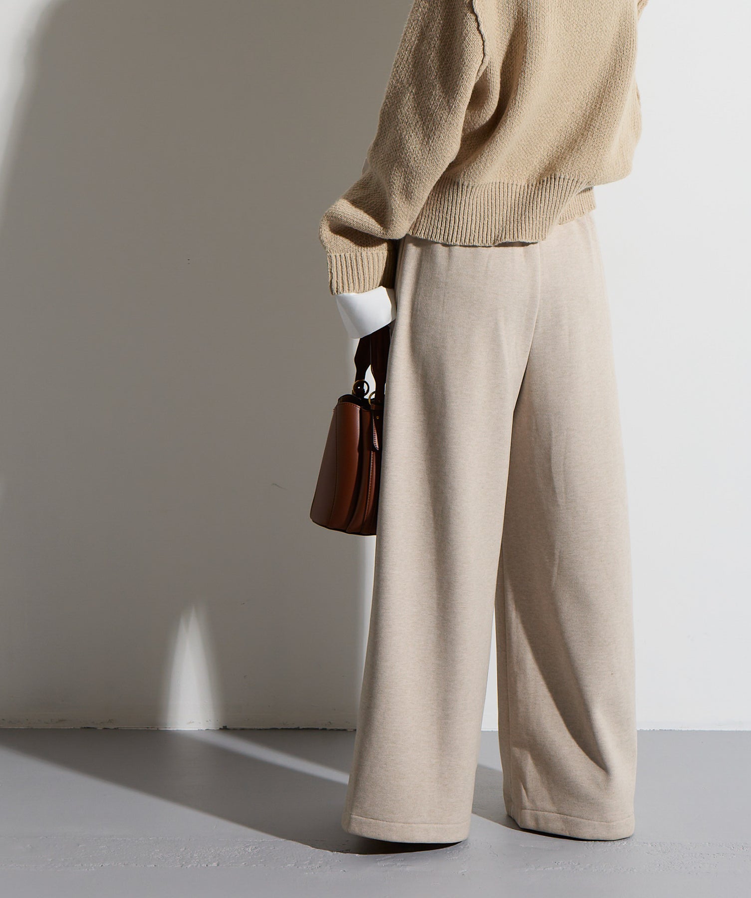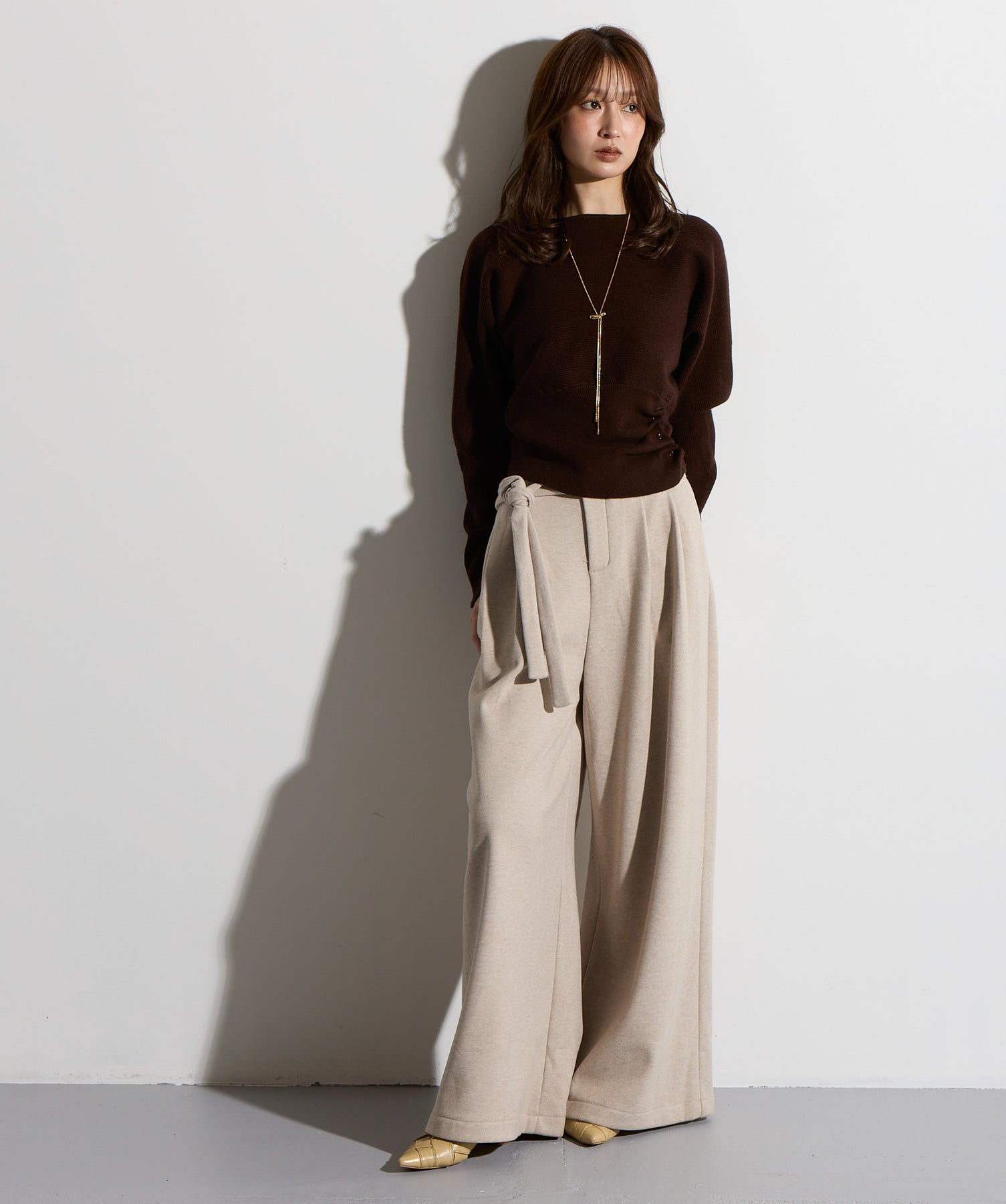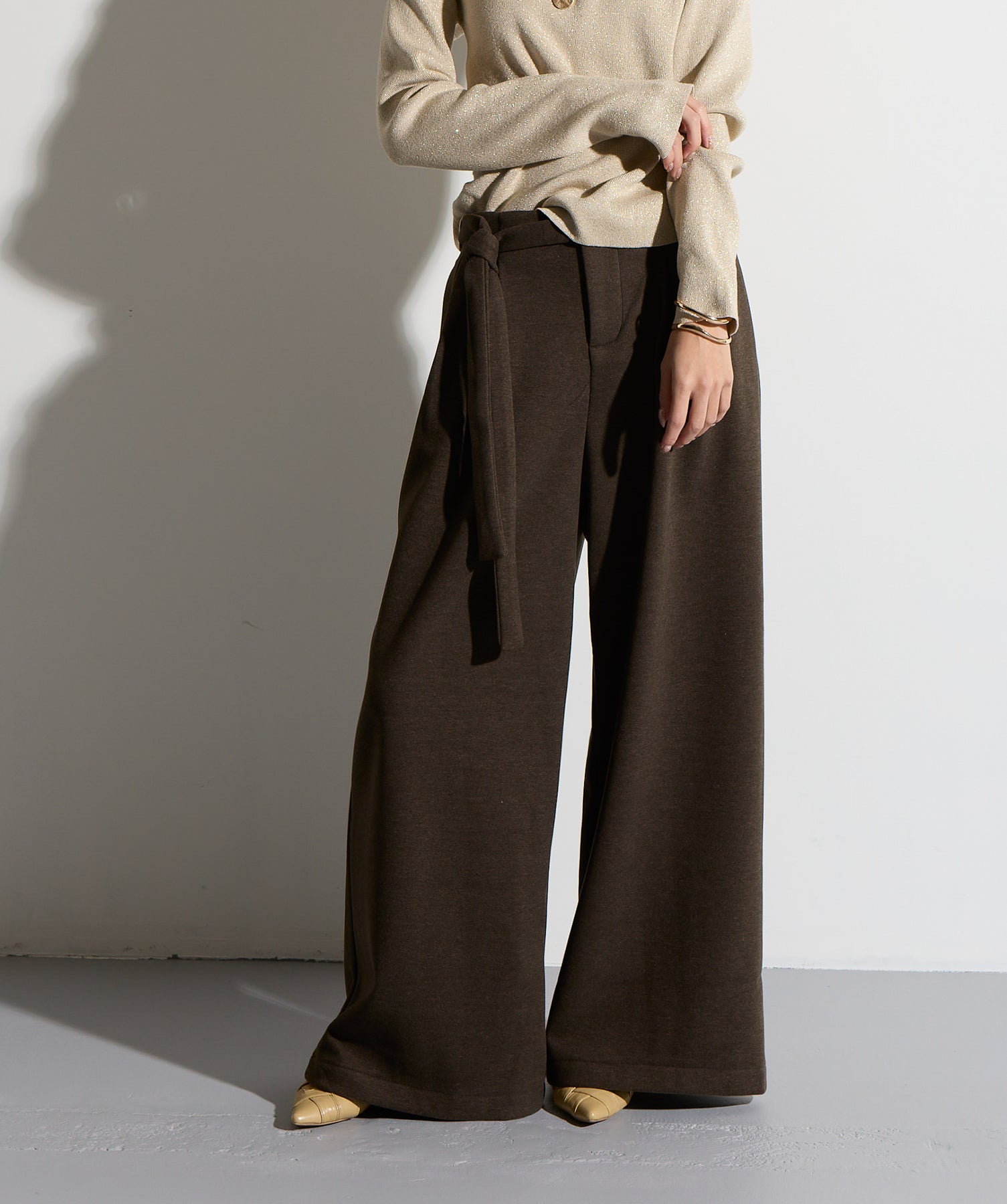 計算された抜け感と美シルエット。洗練モードなワイドパンツ。-material-落ち感のあるポンチライク素材を使用。 なめらかな肌触りと程よい厚みで、シルエットを美しくキープしながら快適な穿き心地を実現。シワになりにくく、ロングシーズン活躍できるイージーケア素材です。-design-ウエストのラップ風ディテールがアクセントになった、ミニマルながら印象的なデザイン。やや高めのウエスト位置とタック入りのワイドシルエットが脚を長く見せ、スタイルアップを叶えます。後ろウエストはゴム仕様でリラクシーな穿き心地。シャープにも、ラフにも、幅広いトップスと好相性な万能パンツです。