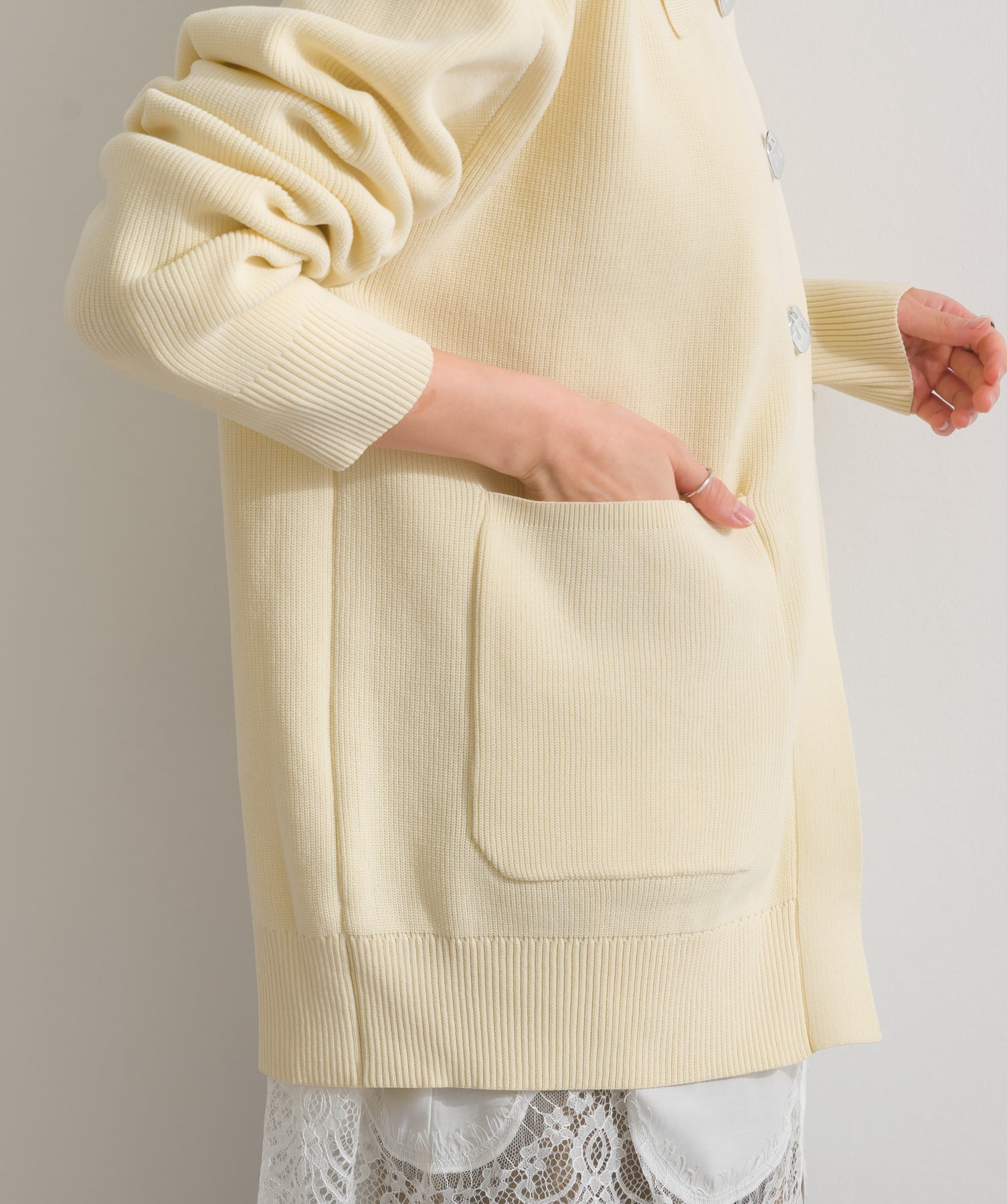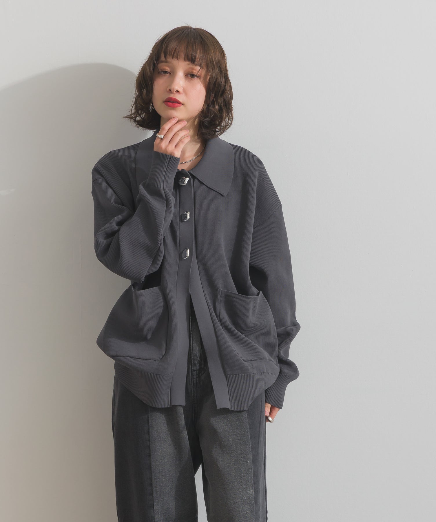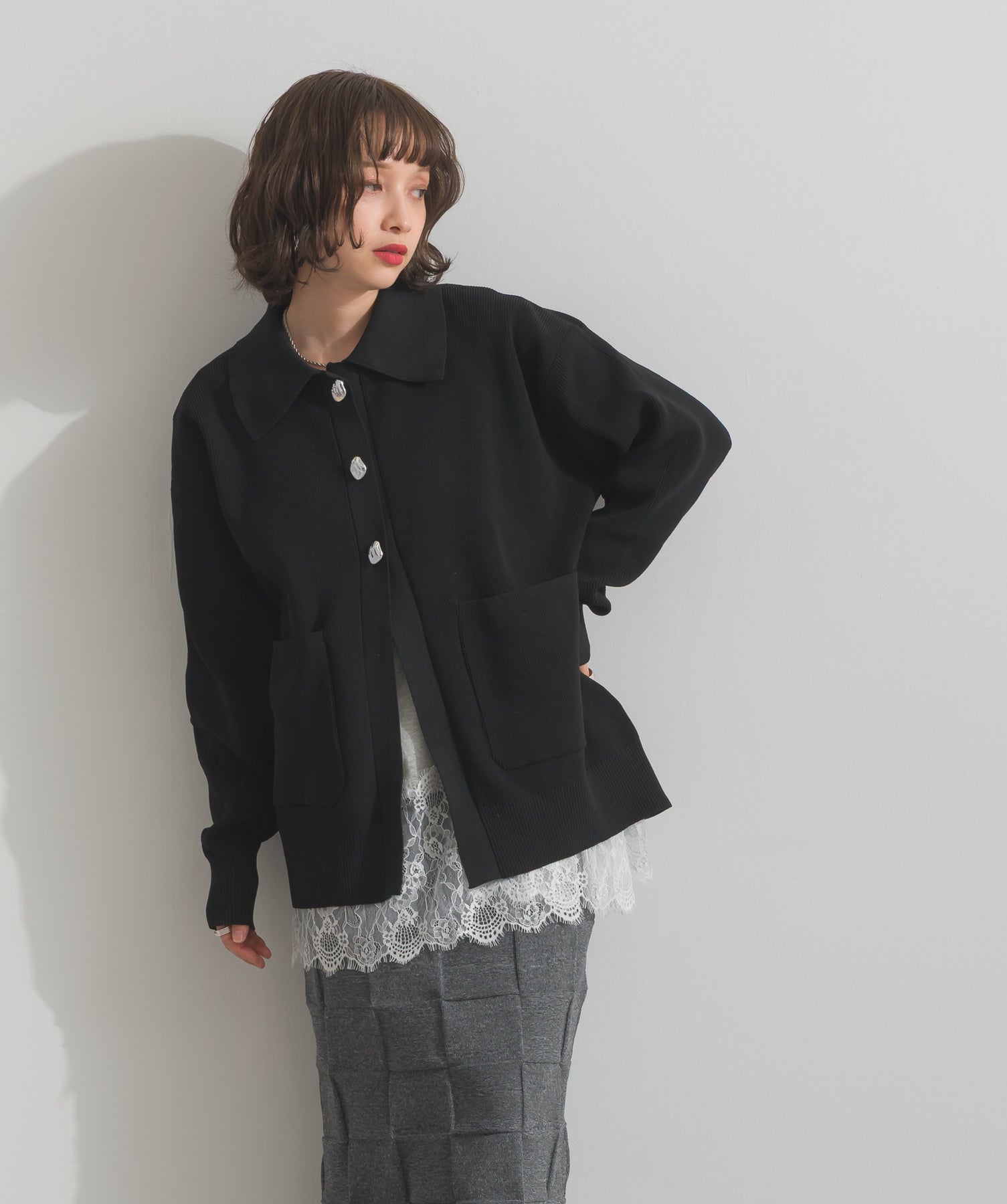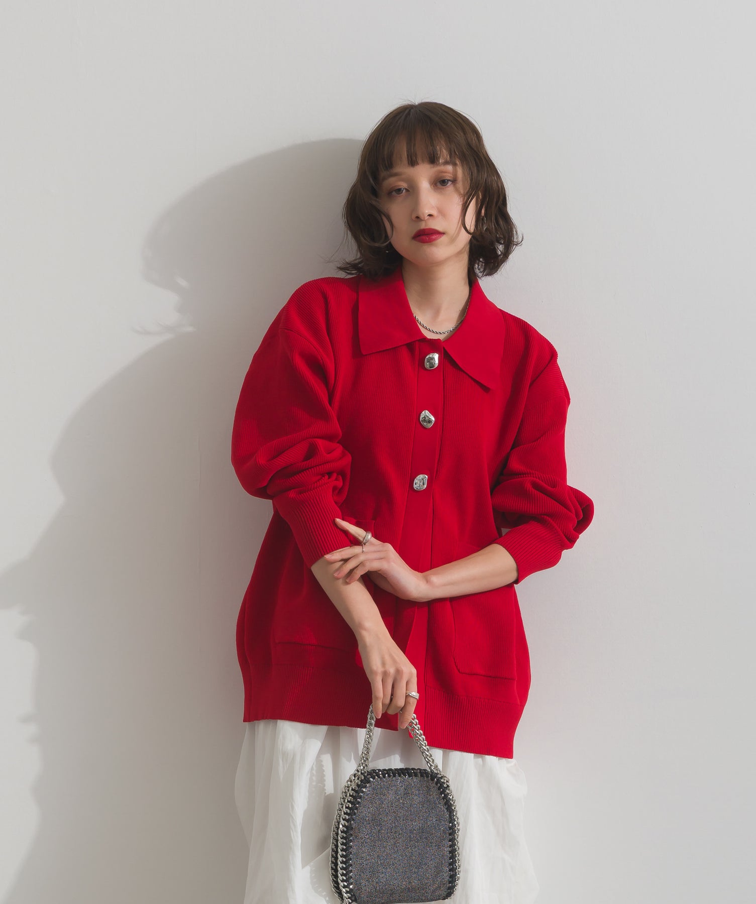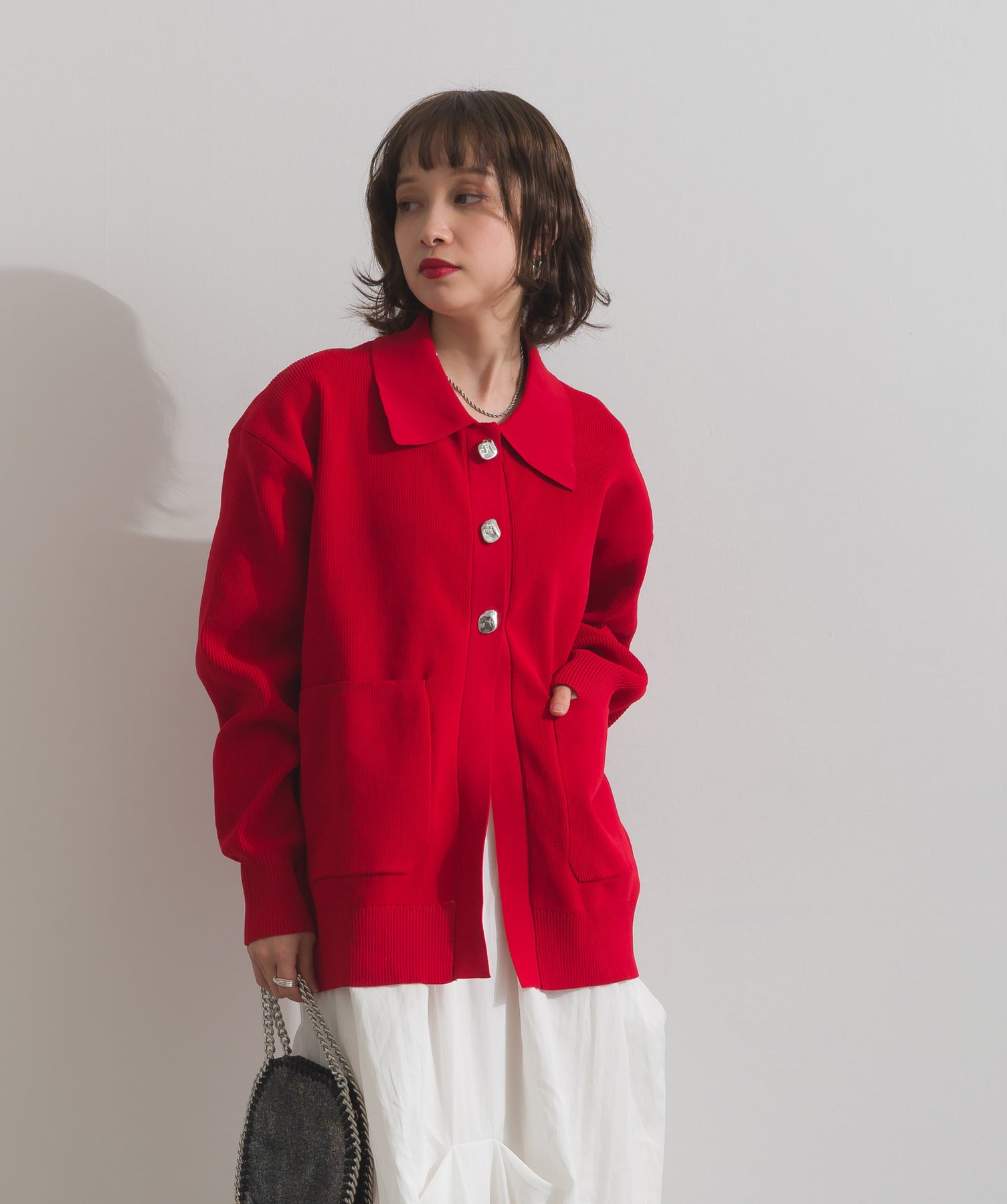 一点投入で決まる、クリーン&モードな襟付きニット。甘さを抑えた洗練シルエットに、輝くメタルボタンがアクセント。きちんと感とこなれ感を両立する主役カーディガン。-material-ポリエステル混のふくらみ感あるニット素材を使用し、軽やかな着心地とイージーケア性を実現。さらりとしたタッチで肌離れも良く、長いシーズン着回し可能。型崩れしにくいしっかりとした編み地で、日常使いにも頼れる1枚。-design-広めの衿デザインとメタルボタンがモードな表情を加え、ベーシックながらも存在感のある仕上がりに。ゆるやかな肩落ちラインと程よくゆとりを持たせたサイジングが、リラックスしたムードを演出。前開きで羽織りとしてはもちろん、ボタンを留めてトップス風にも着用可能。