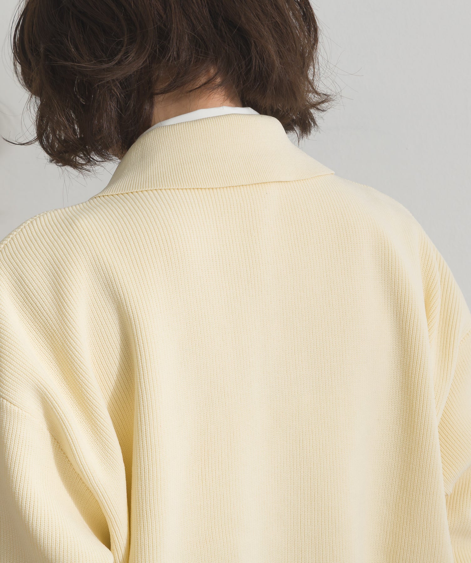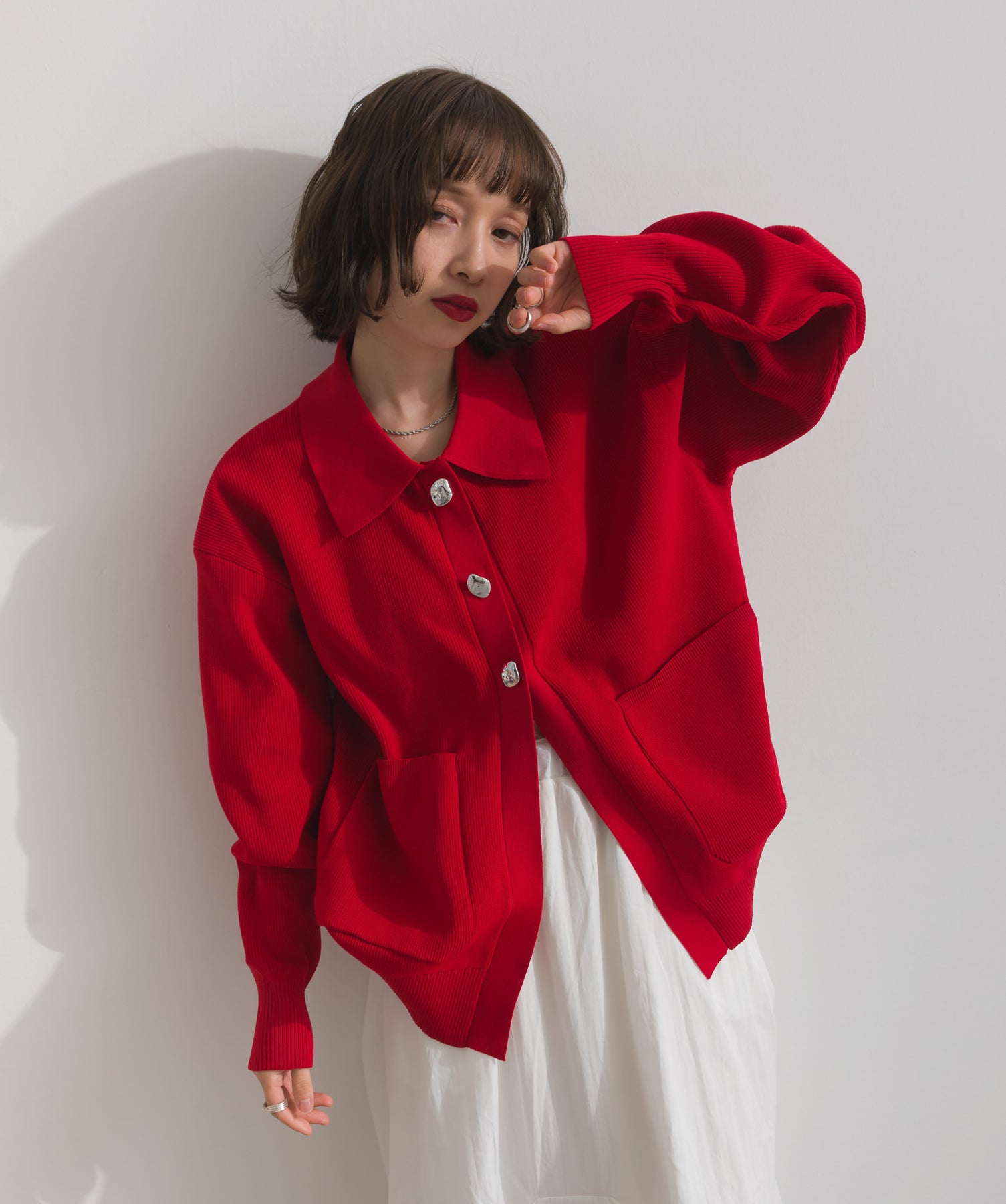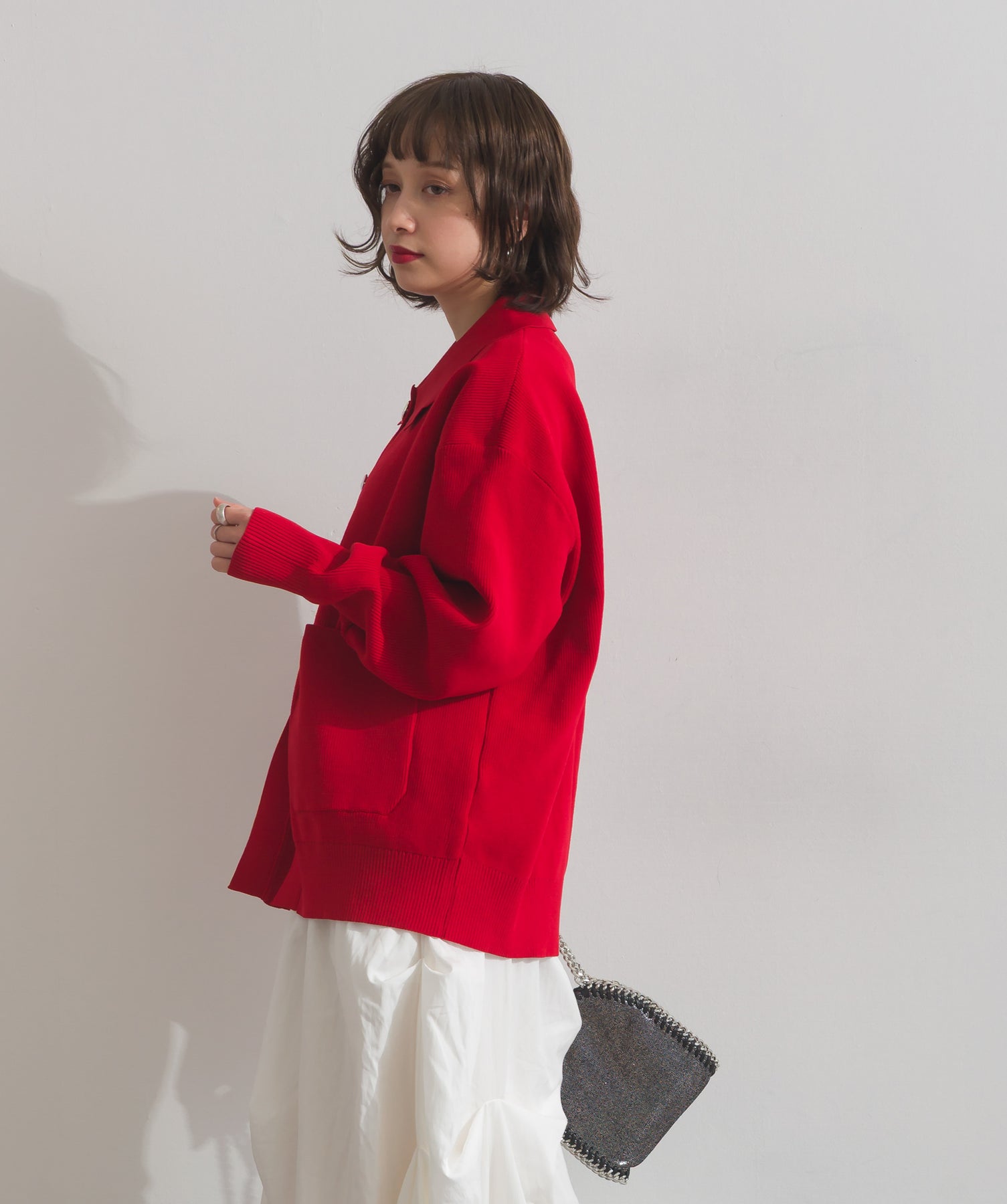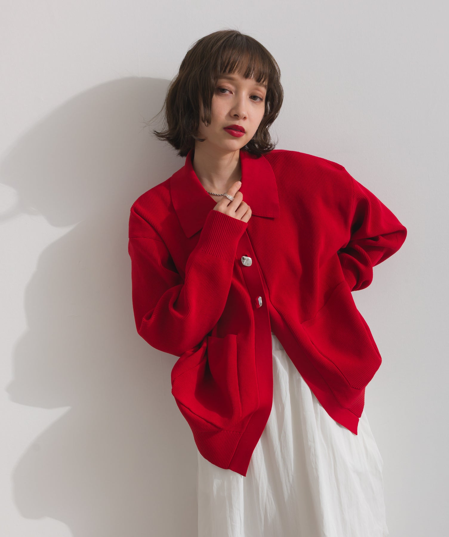 一点投入で決まる、クリーン&モードな襟付きニット。甘さを抑えた洗練シルエットに、輝くメタルボタンがアクセント。きちんと感とこなれ感を両立する主役カーディガン。-material-ポリエステル混のふくらみ感あるニット素材を使用し、軽やかな着心地とイージーケア性を実現。さらりとしたタッチで肌離れも良く、長いシーズン着回し可能。型崩れしにくいしっかりとした編み地で、日常使いにも頼れる1枚。-design-広めの衿デザインとメタルボタンがモードな表情を加え、ベーシックながらも存在感のある仕上がりに。ゆるやかな肩落ちラインと程よくゆとりを持たせたサイジングが、リラックスしたムードを演出。前開きで羽織りとしてはもちろん、ボタンを留めてトップス風にも着用可能。