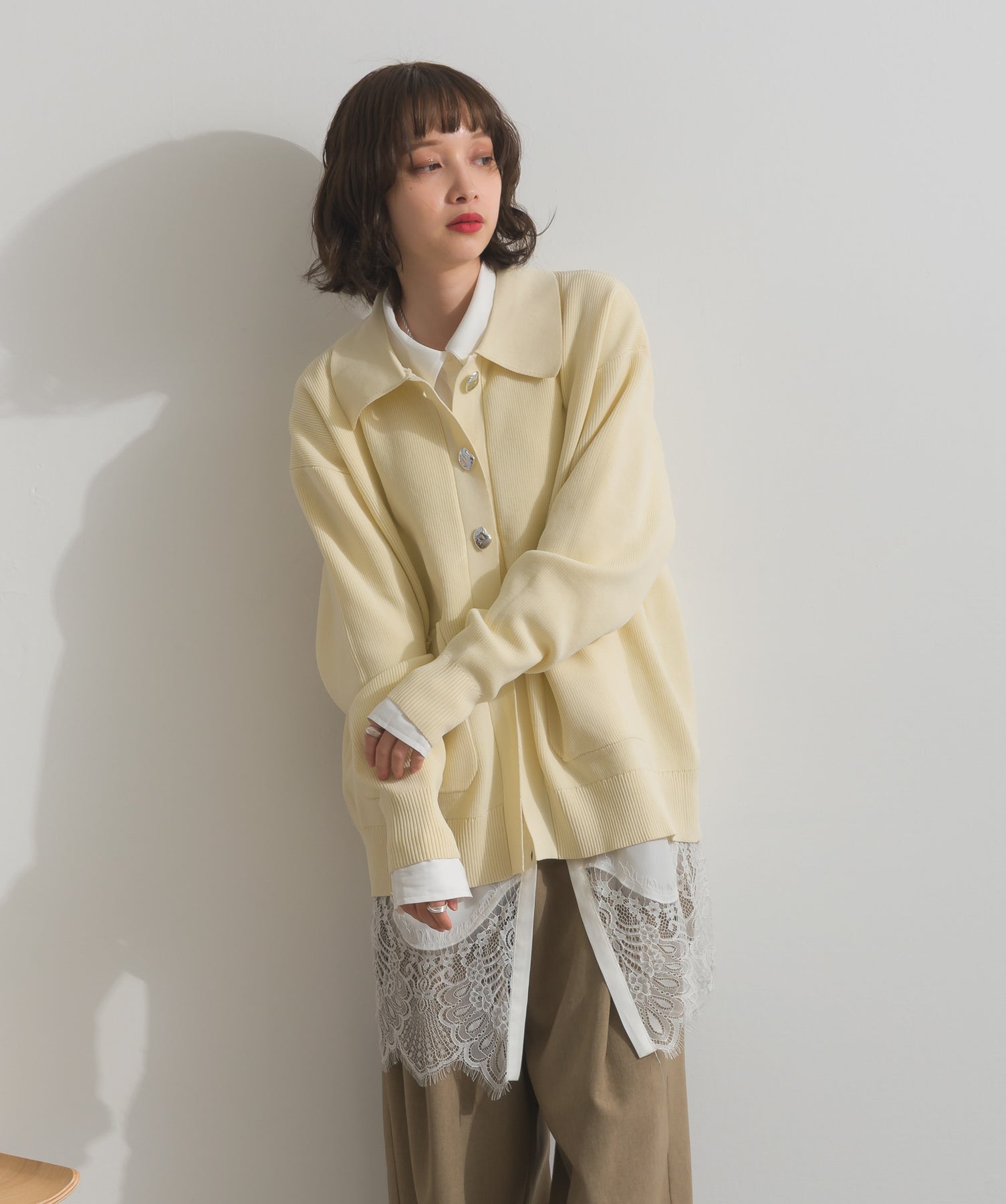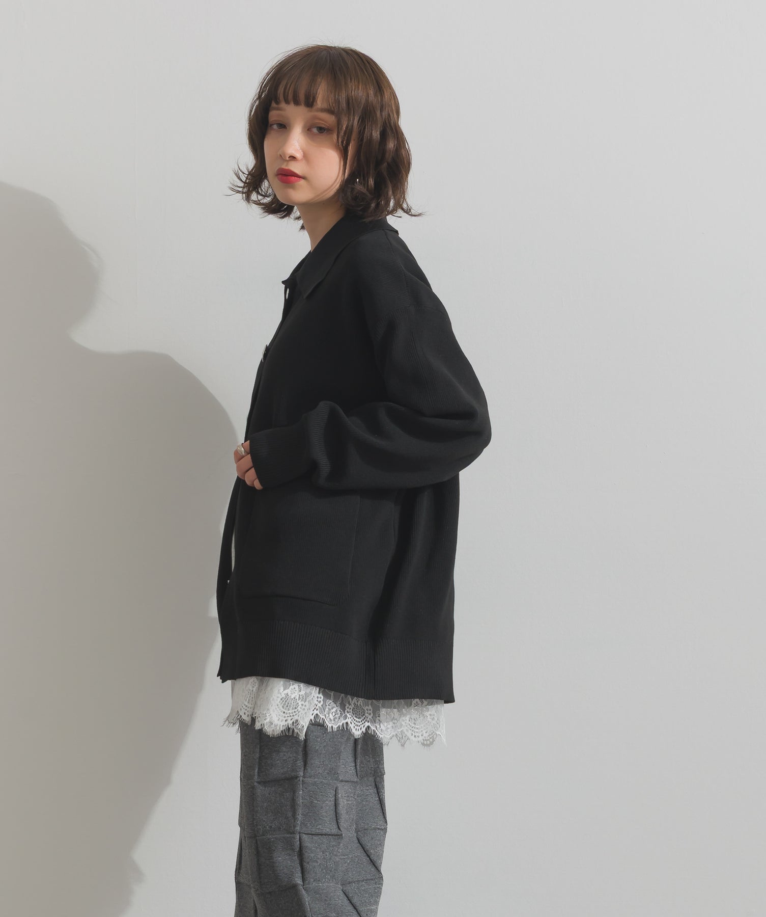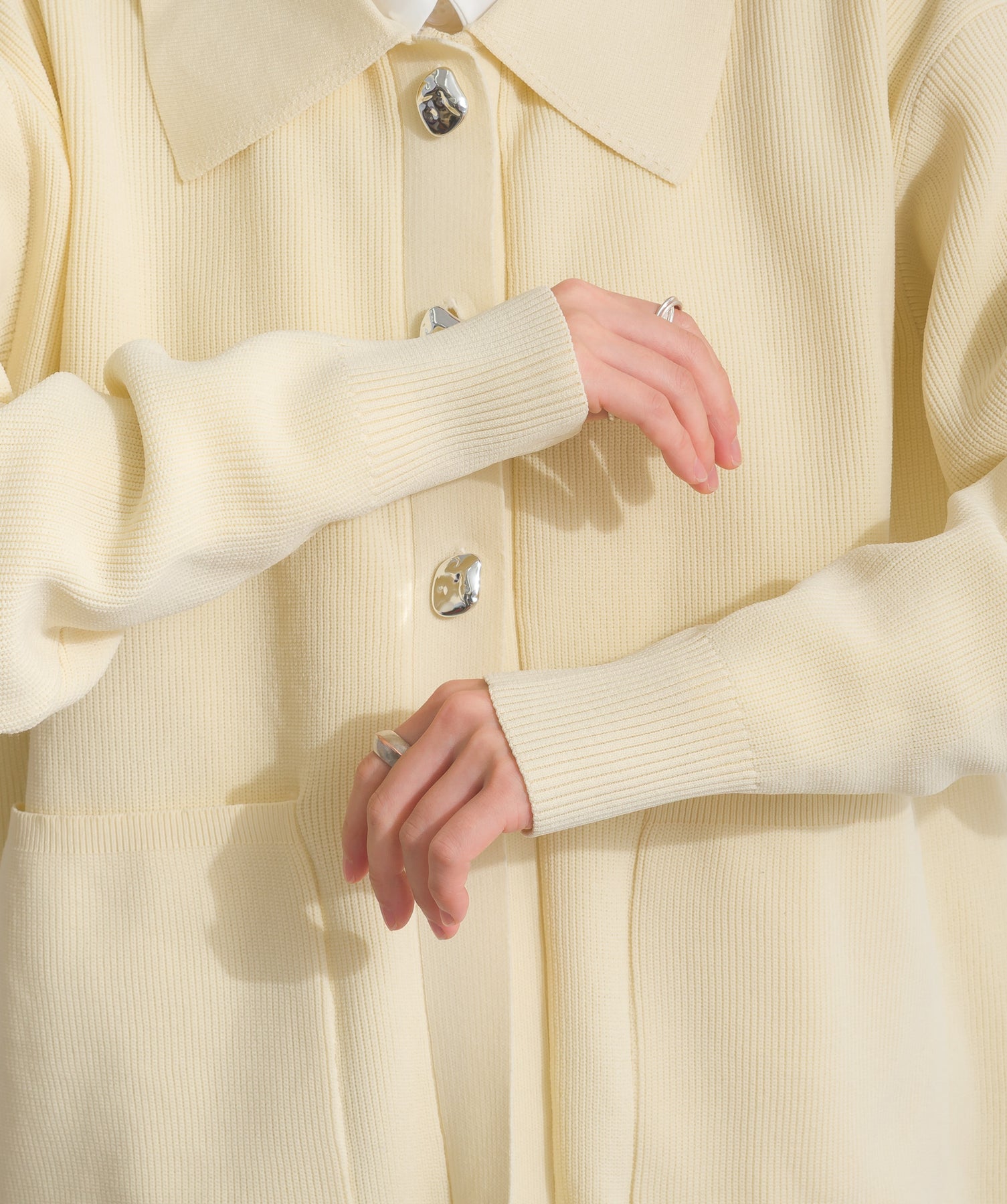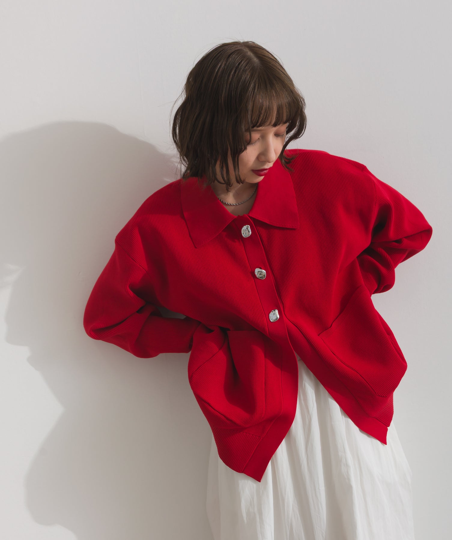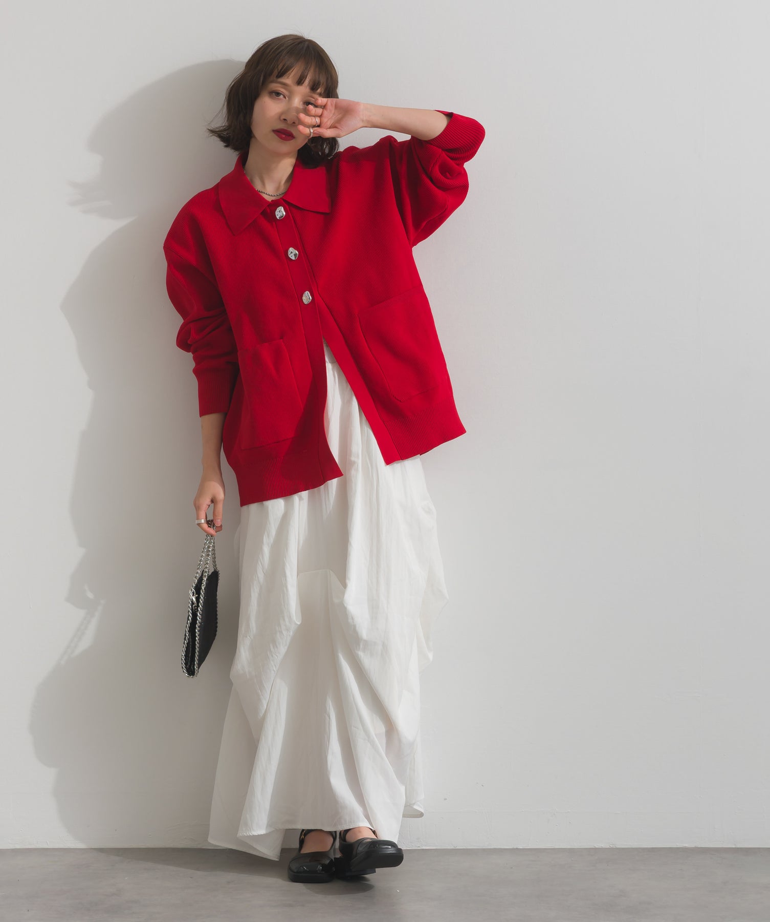 一点投入で決まる、クリーン&モードな襟付きニット。甘さを抑えた洗練シルエットに、輝くメタルボタンがアクセント。きちんと感とこなれ感を両立する主役カーディガン。-material-ポリエステル混のふくらみ感あるニット素材を使用し、軽やかな着心地とイージーケア性を実現。さらりとしたタッチで肌離れも良く、長いシーズン着回し可能。型崩れしにくいしっかりとした編み地で、日常使いにも頼れる1枚。-design-広めの衿デザインとメタルボタンがモードな表情を加え、ベーシックながらも存在感のある仕上がりに。ゆるやかな肩落ちラインと程よくゆとりを持たせたサイジングが、リラックスしたムードを演出。前開きで羽織りとしてはもちろん、ボタンを留めてトップス風にも着用可能。