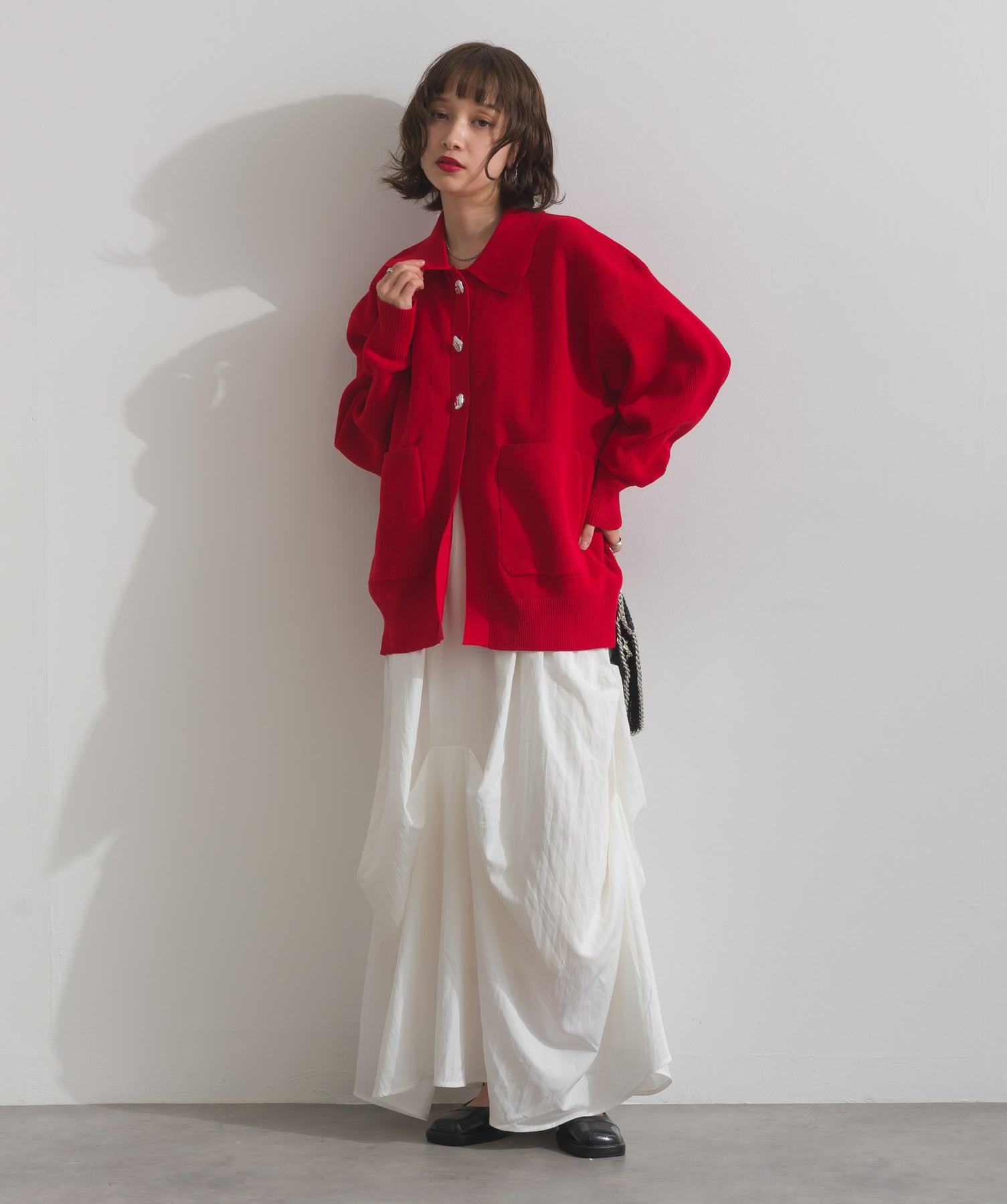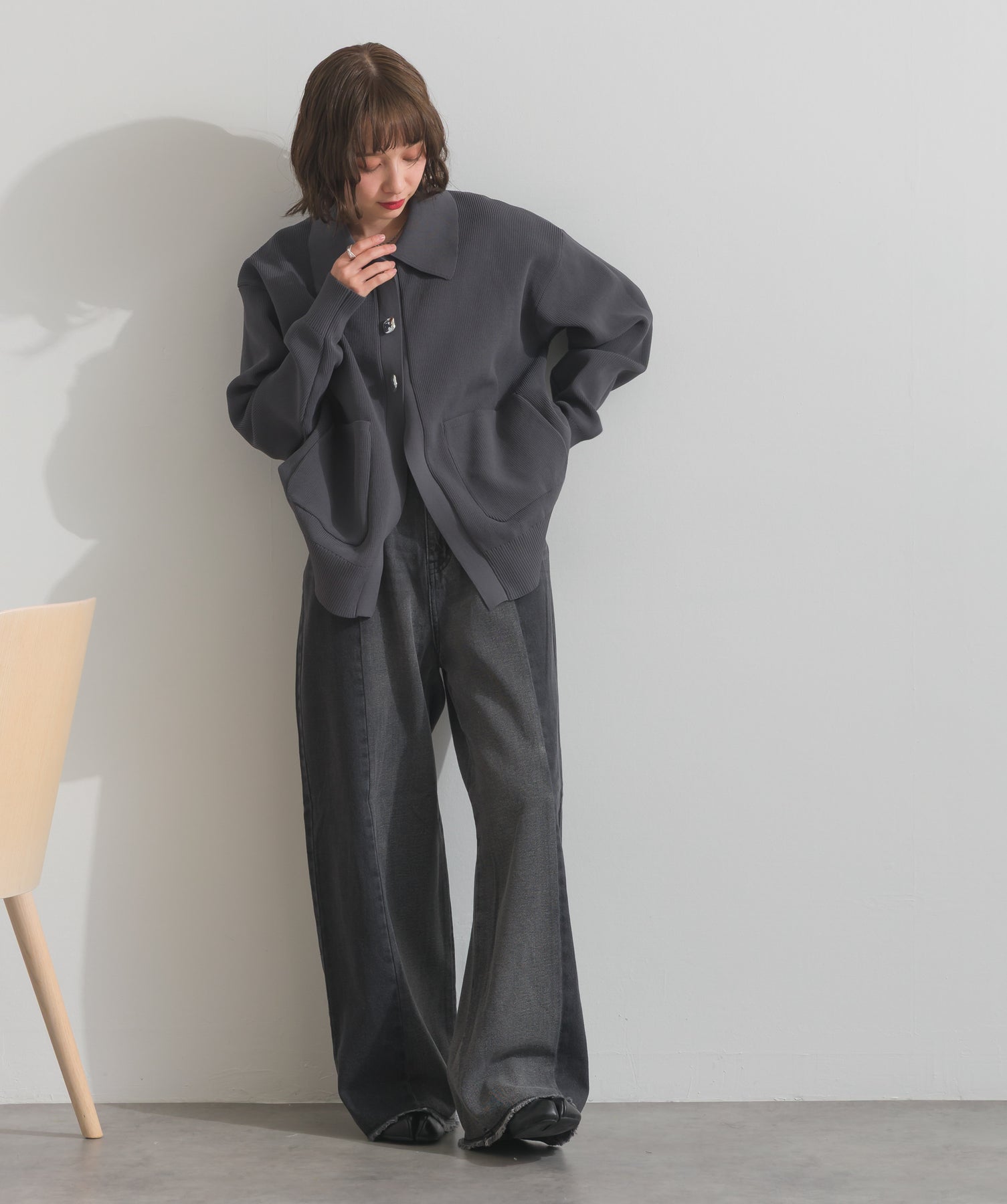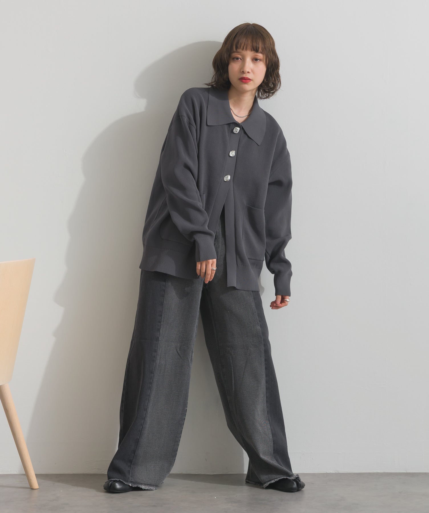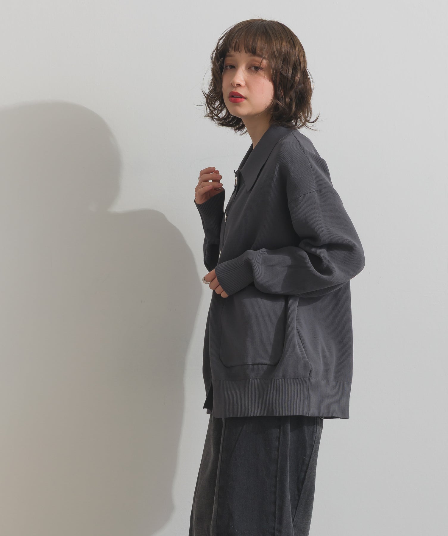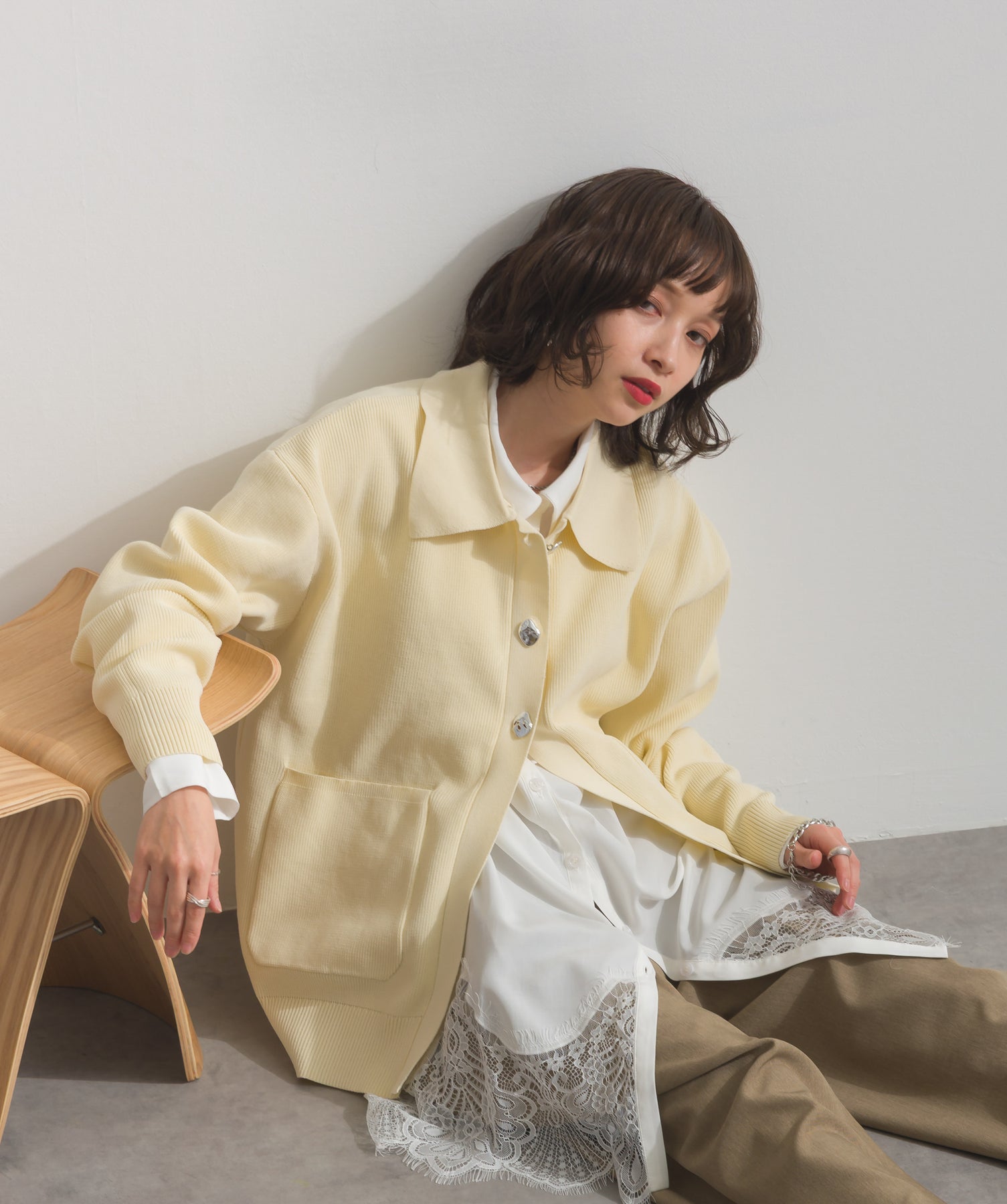 一点投入で決まる、クリーン&モードな襟付きニット。甘さを抑えた洗練シルエットに、輝くメタルボタンがアクセント。きちんと感とこなれ感を両立する主役カーディガン。-material-ポリエステル混のふくらみ感あるニット素材を使用し、軽やかな着心地とイージーケア性を実現。さらりとしたタッチで肌離れも良く、長いシーズン着回し可能。型崩れしにくいしっかりとした編み地で、日常使いにも頼れる1枚。-design-広めの衿デザインとメタルボタンがモードな表情を加え、ベーシックながらも存在感のある仕上がりに。ゆるやかな肩落ちラインと程よくゆとりを持たせたサイジングが、リラックスしたムードを演出。前開きで羽織りとしてはもちろん、ボタンを留めてトップス風にも着用可能。