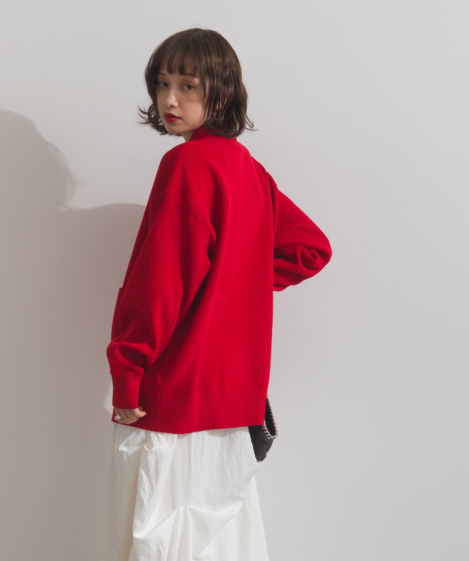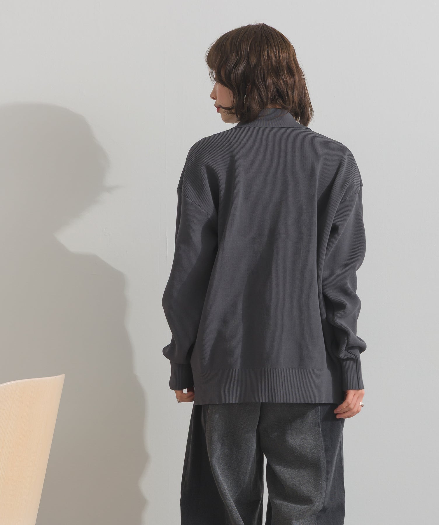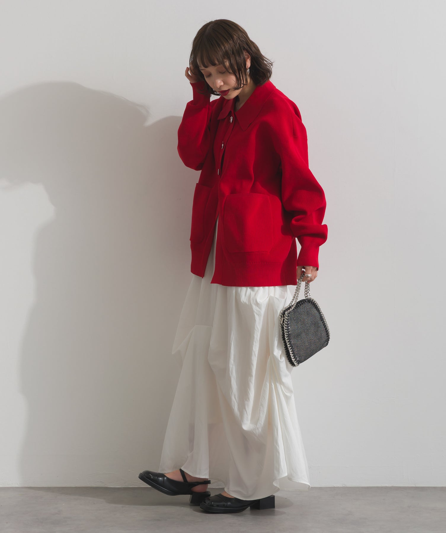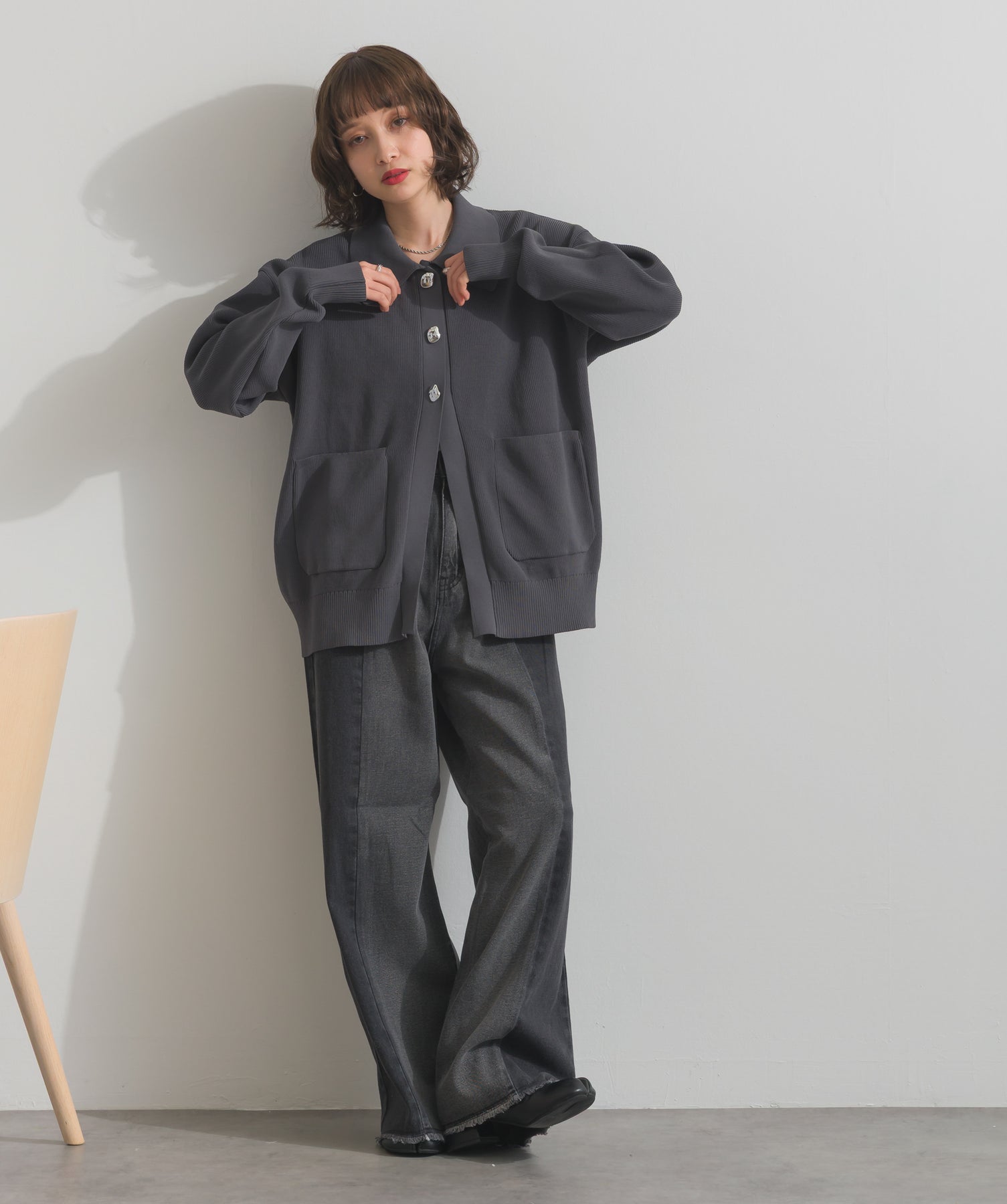 一点投入で決まる、クリーン&モードな襟付きニット。甘さを抑えた洗練シルエットに、輝くメタルボタンがアクセント。きちんと感とこなれ感を両立する主役カーディガン。-material-ポリエステル混のふくらみ感あるニット素材を使用し、軽やかな着心地とイージーケア性を実現。さらりとしたタッチで肌離れも良く、長いシーズン着回し可能。型崩れしにくいしっかりとした編み地で、日常使いにも頼れる1枚。-design-広めの衿デザインとメタルボタンがモードな表情を加え、ベーシックながらも存在感のある仕上がりに。ゆるやかな肩落ちラインと程よくゆとりを持たせたサイジングが、リラックスしたムードを演出。前開きで羽織りとしてはもちろん、ボタンを留めてトップス風にも着用可能。