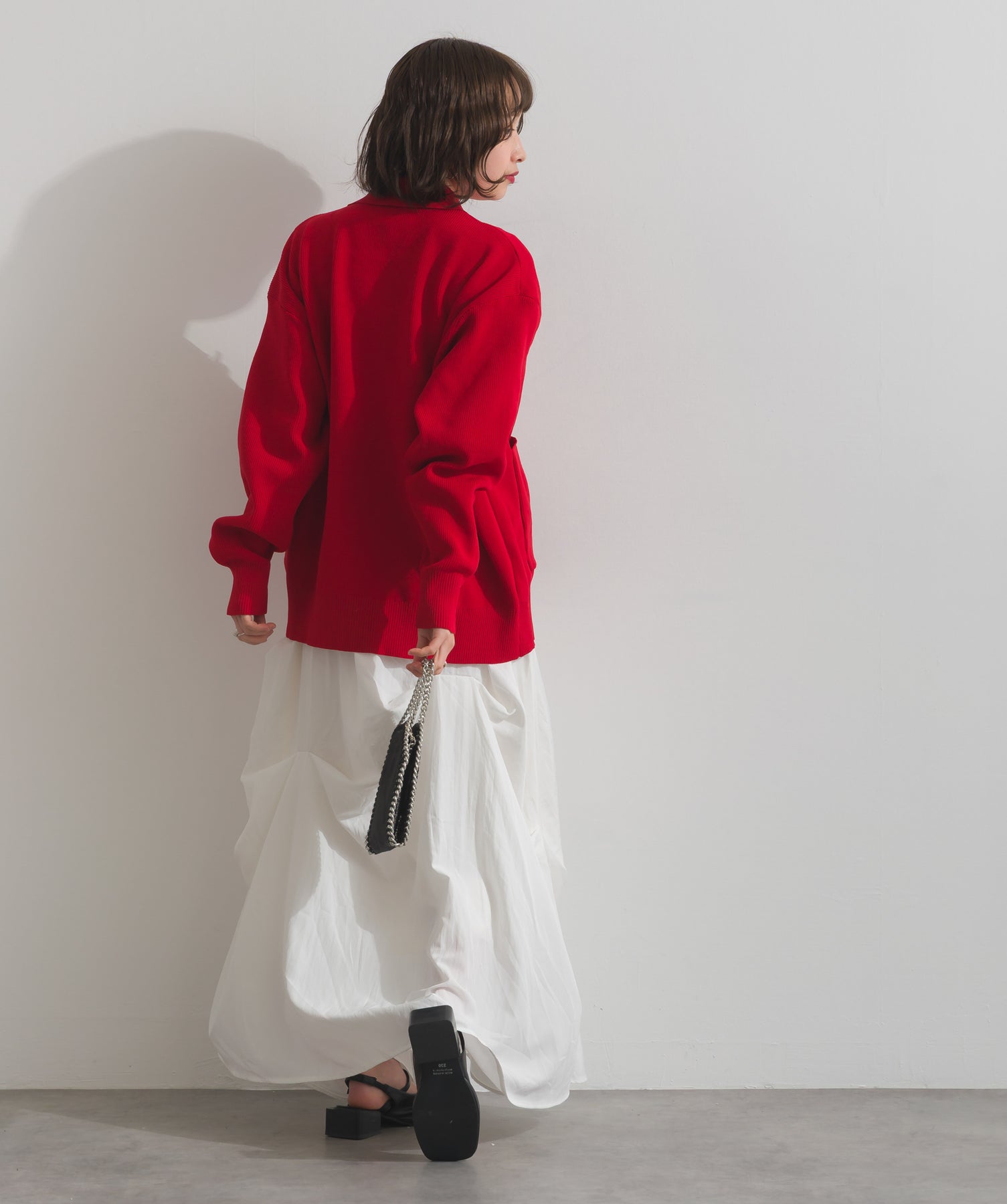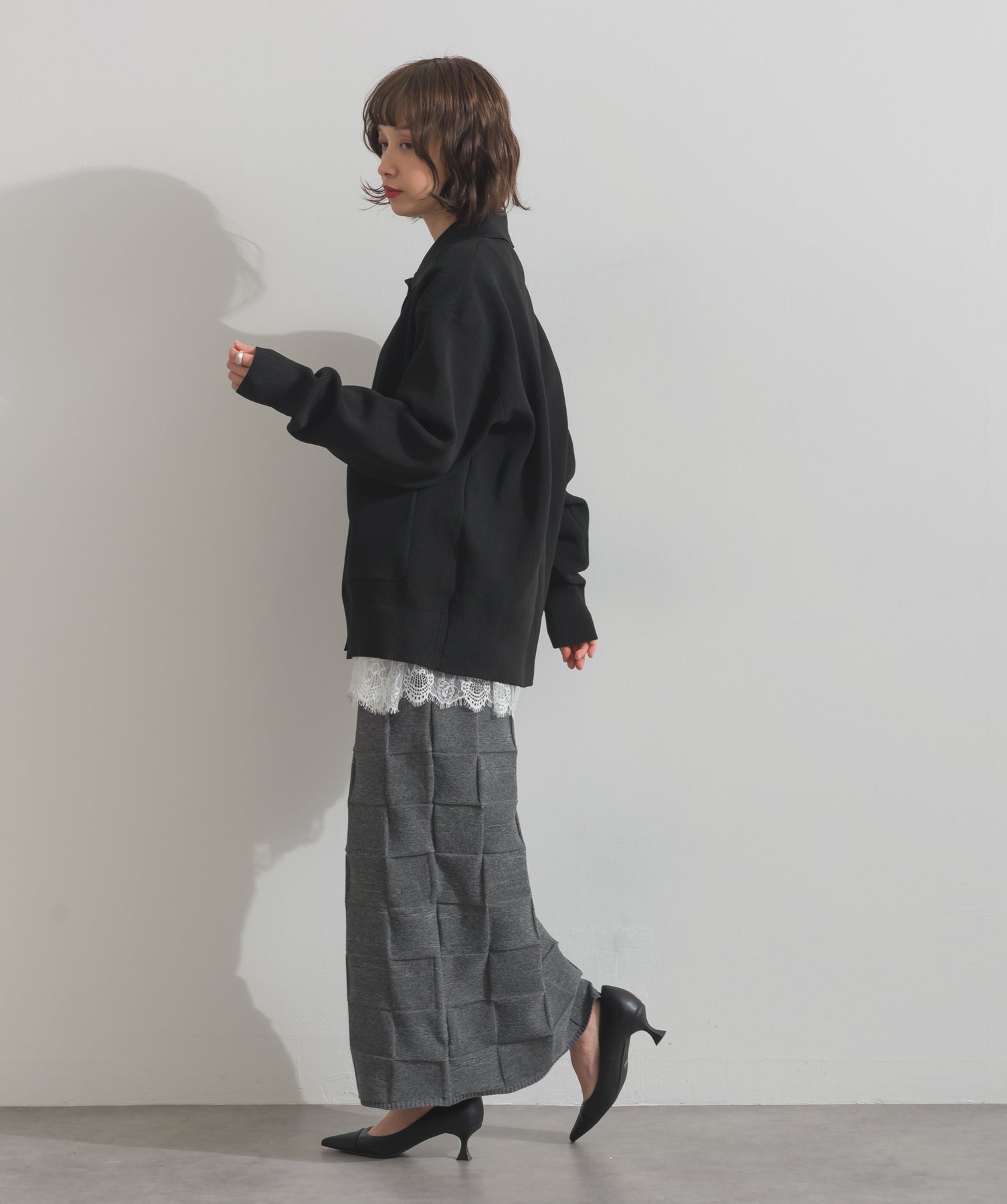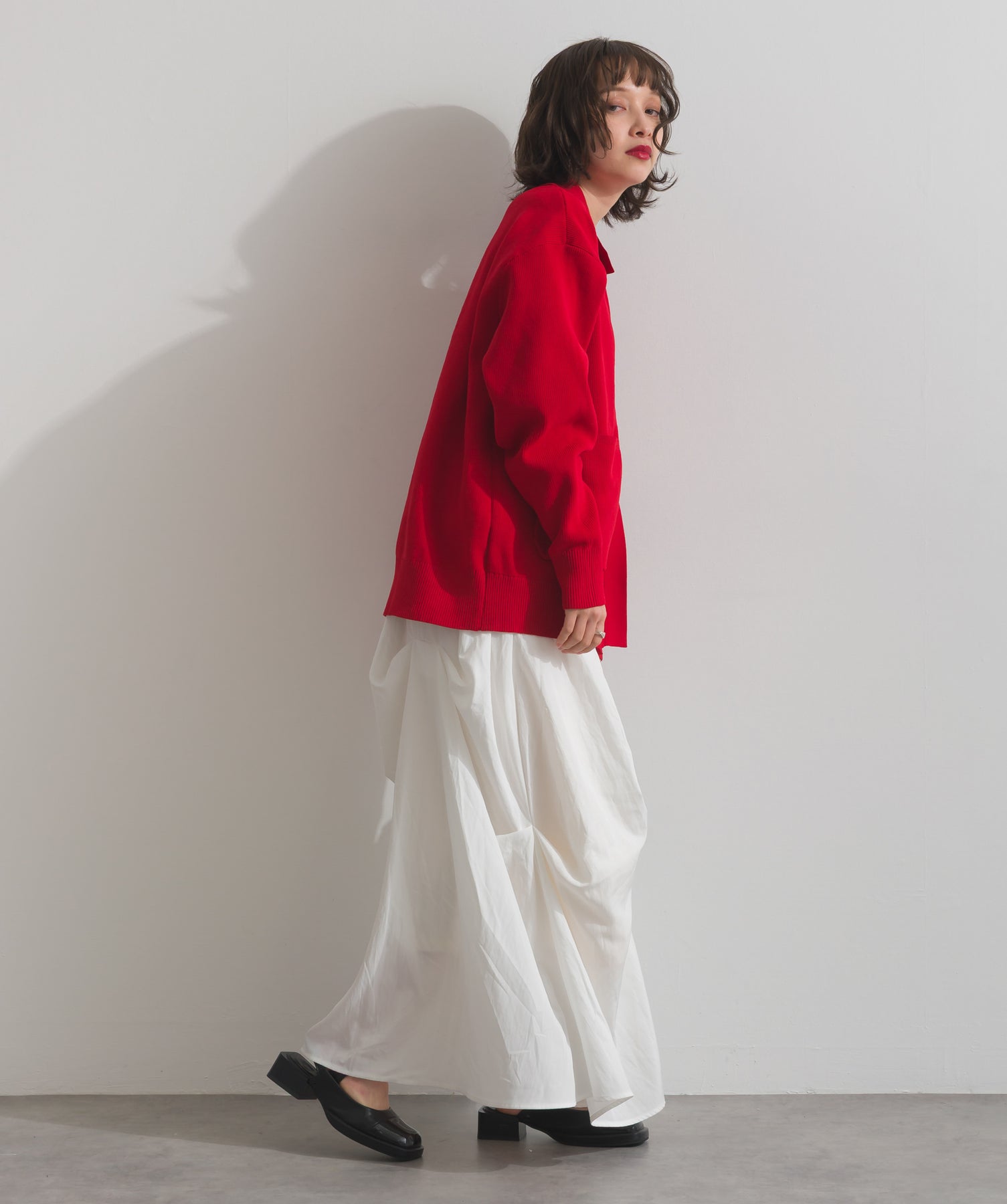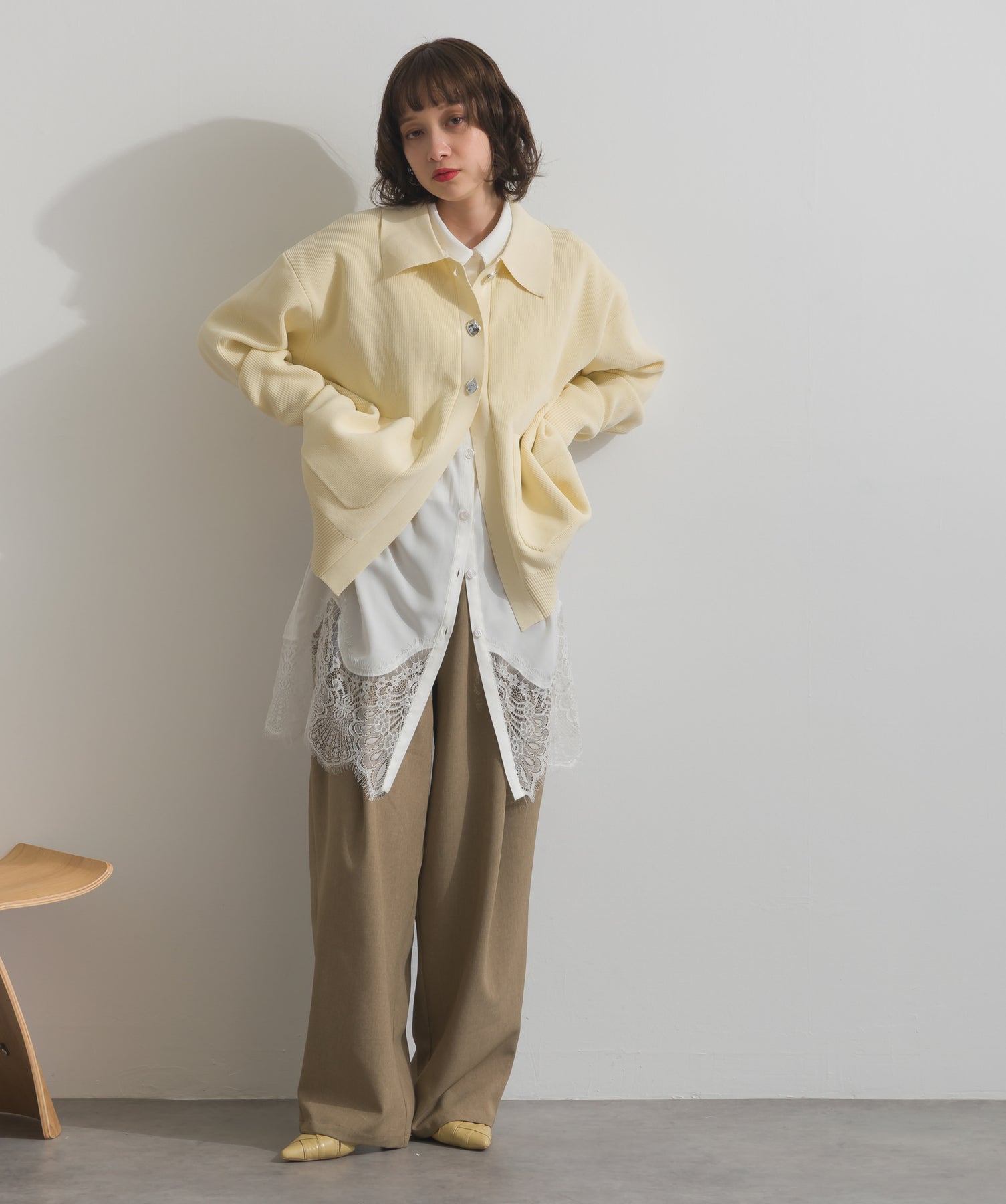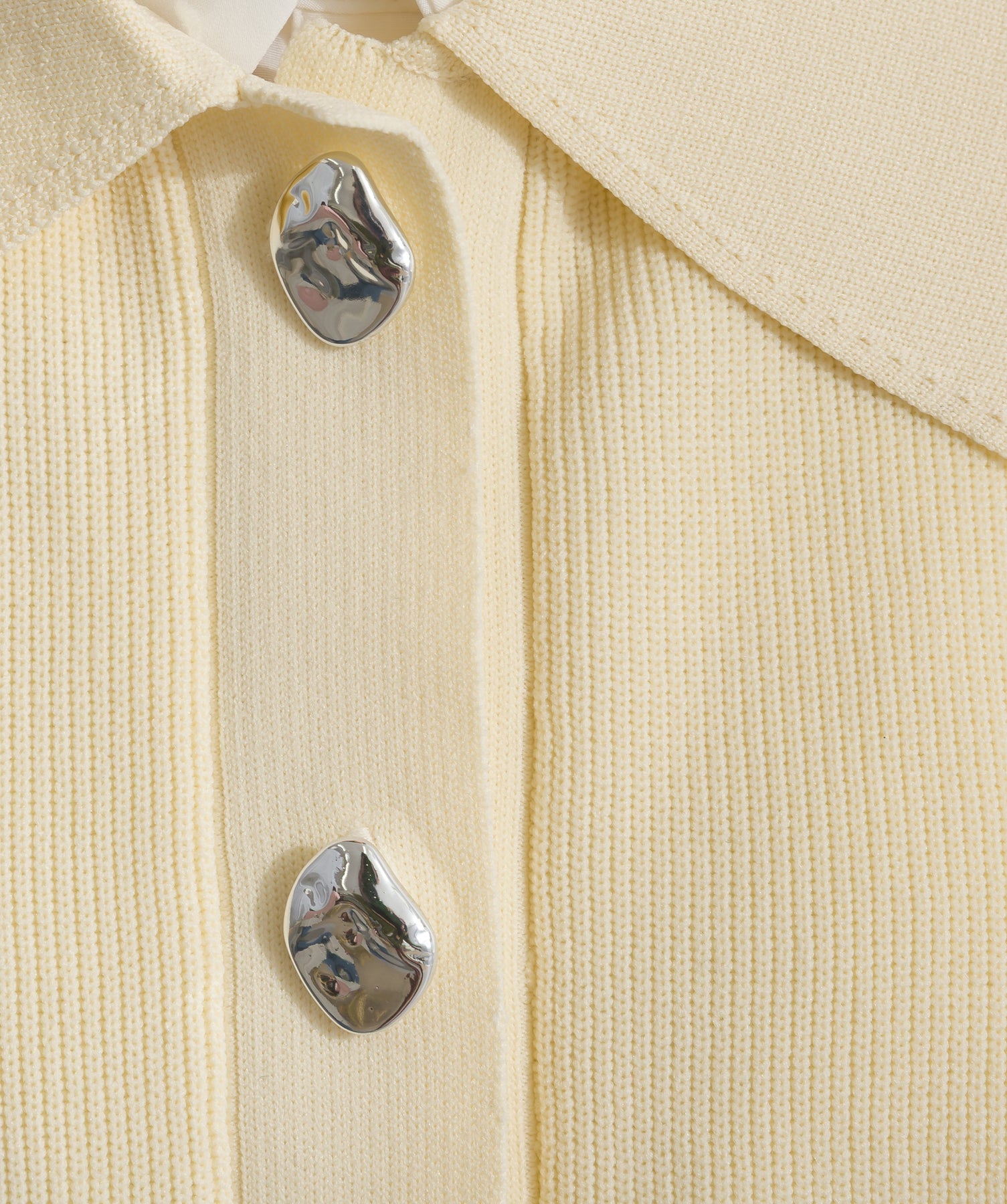 一点投入で決まる、クリーン&モードな襟付きニット。甘さを抑えた洗練シルエットに、輝くメタルボタンがアクセント。きちんと感とこなれ感を両立する主役カーディガン。-material-ポリエステル混のふくらみ感あるニット素材を使用し、軽やかな着心地とイージーケア性を実現。さらりとしたタッチで肌離れも良く、長いシーズン着回し可能。型崩れしにくいしっかりとした編み地で、日常使いにも頼れる1枚。-design-広めの衿デザインとメタルボタンがモードな表情を加え、ベーシックながらも存在感のある仕上がりに。ゆるやかな肩落ちラインと程よくゆとりを持たせたサイジングが、リラックスしたムードを演出。前開きで羽織りとしてはもちろん、ボタンを留めてトップス風にも着用可能。