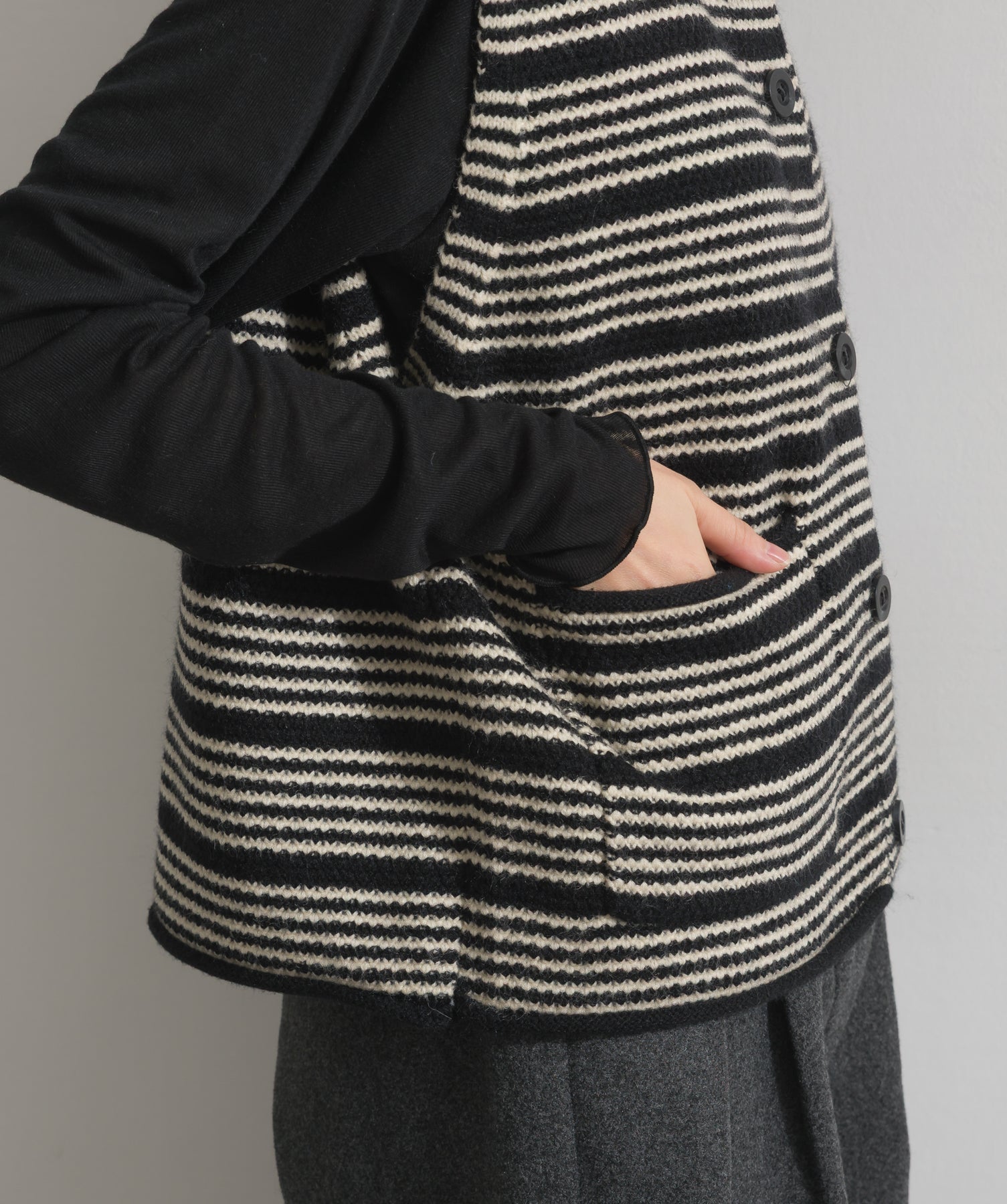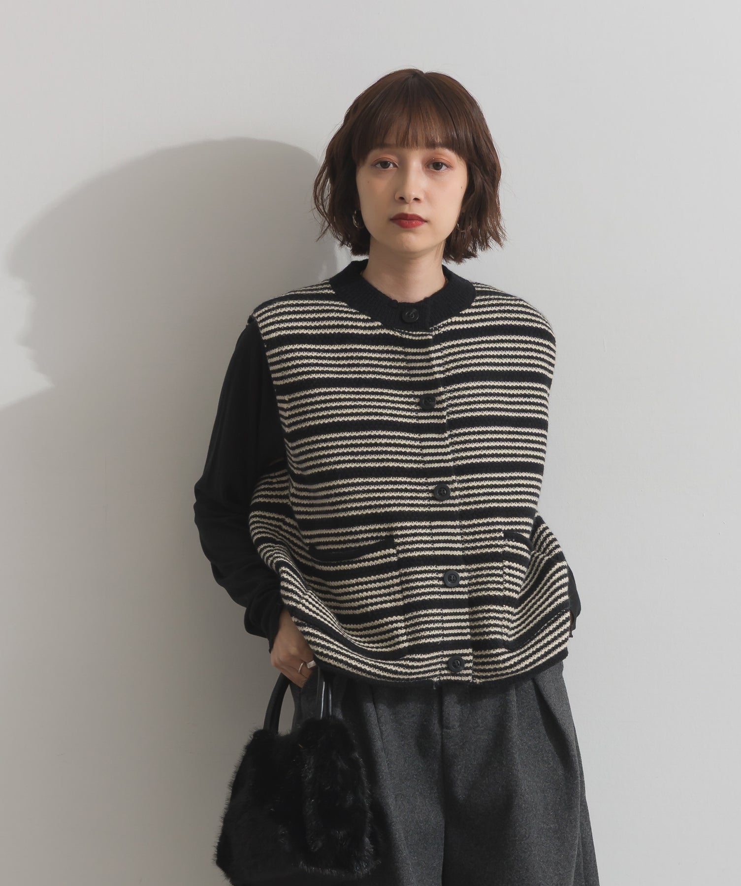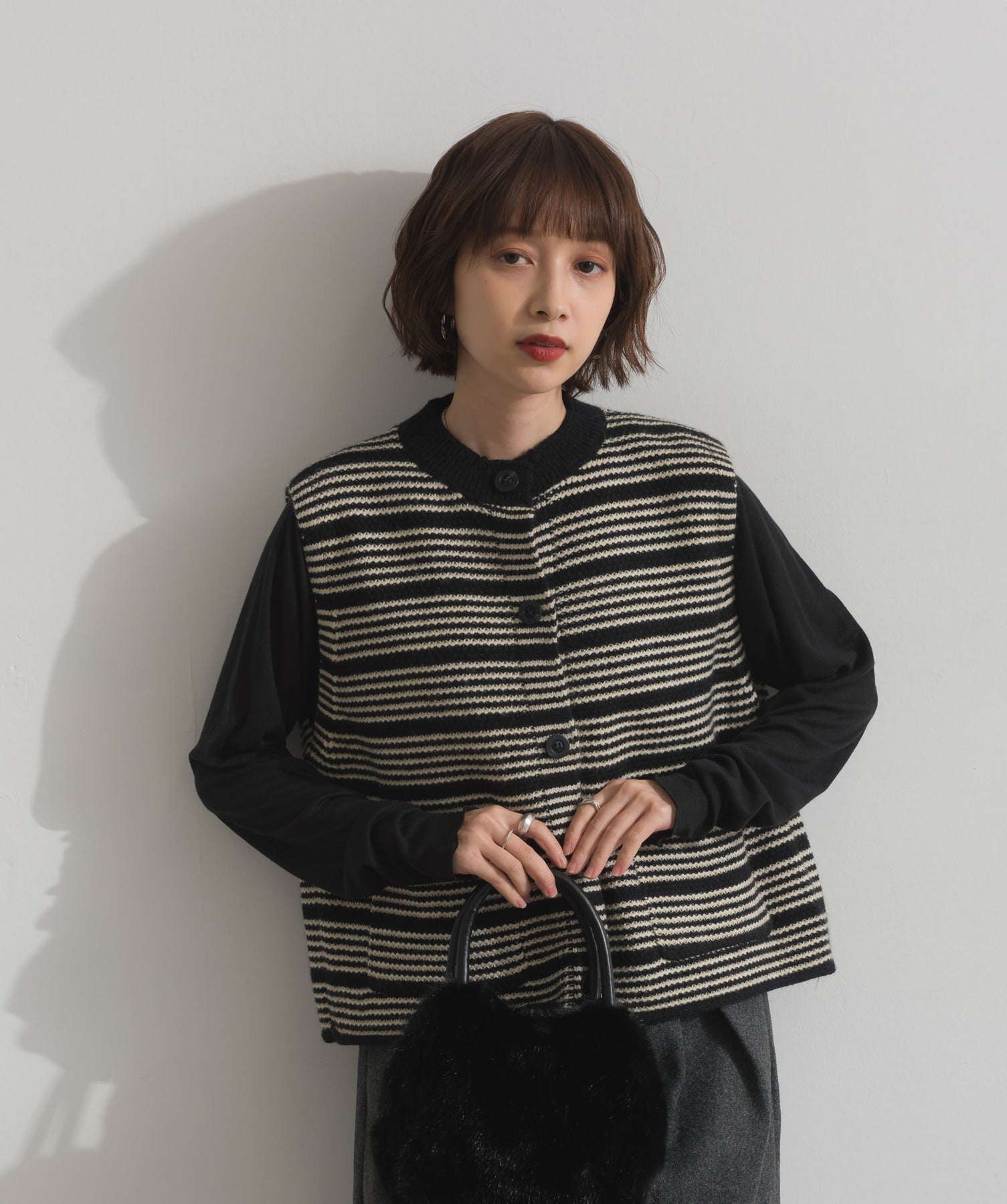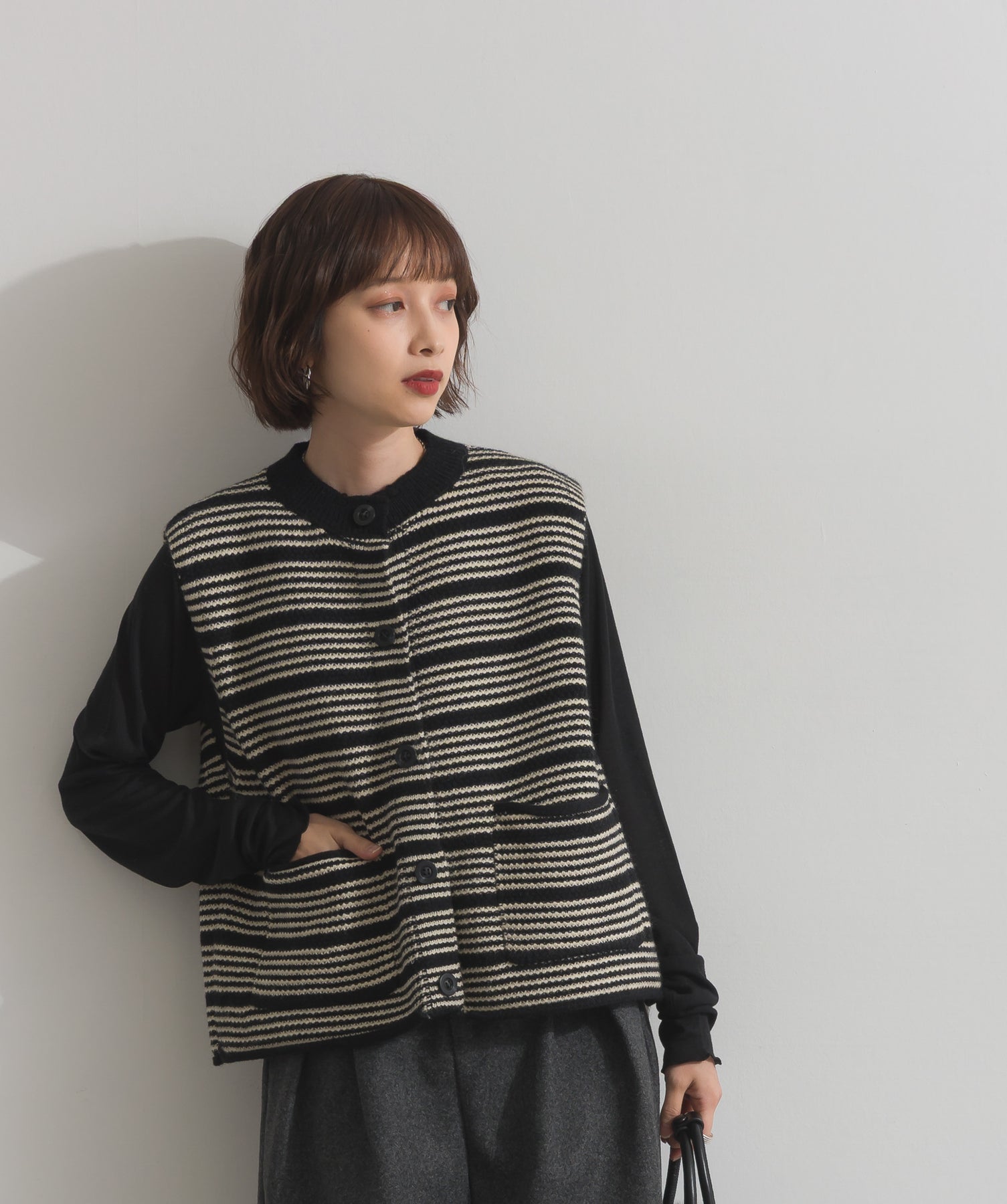 こなれ感を格上げする、万能ニットベスト。一枚足すだけで奥行きが生まれ、レイヤードスタイルを格上げしてくれるニットベスト。洗練されたバランス感で、秋冬のコーデをスタイリッシュに。-material-柔らかく温かみのあるニット素材を使用。程よい厚みで軽やかさを保ちつつ、防寒性も兼備。チクチク感のない快適な肌触りで、長時間の着用もストレスフリー。-design-クラシカルなクルーネックと、フロントのボタンデザインが特徴的な一枚。ストライプ柄と無地の2タイプ展開で、着回し力の高い汎用性を実現。裾のストレートカットとゆったりめの身幅が、トレンド感あるボックスシルエットを演出。パンツにもスカートにもバランス良くマッチし、レイヤードの幅を広げてくれる主役アイテム。