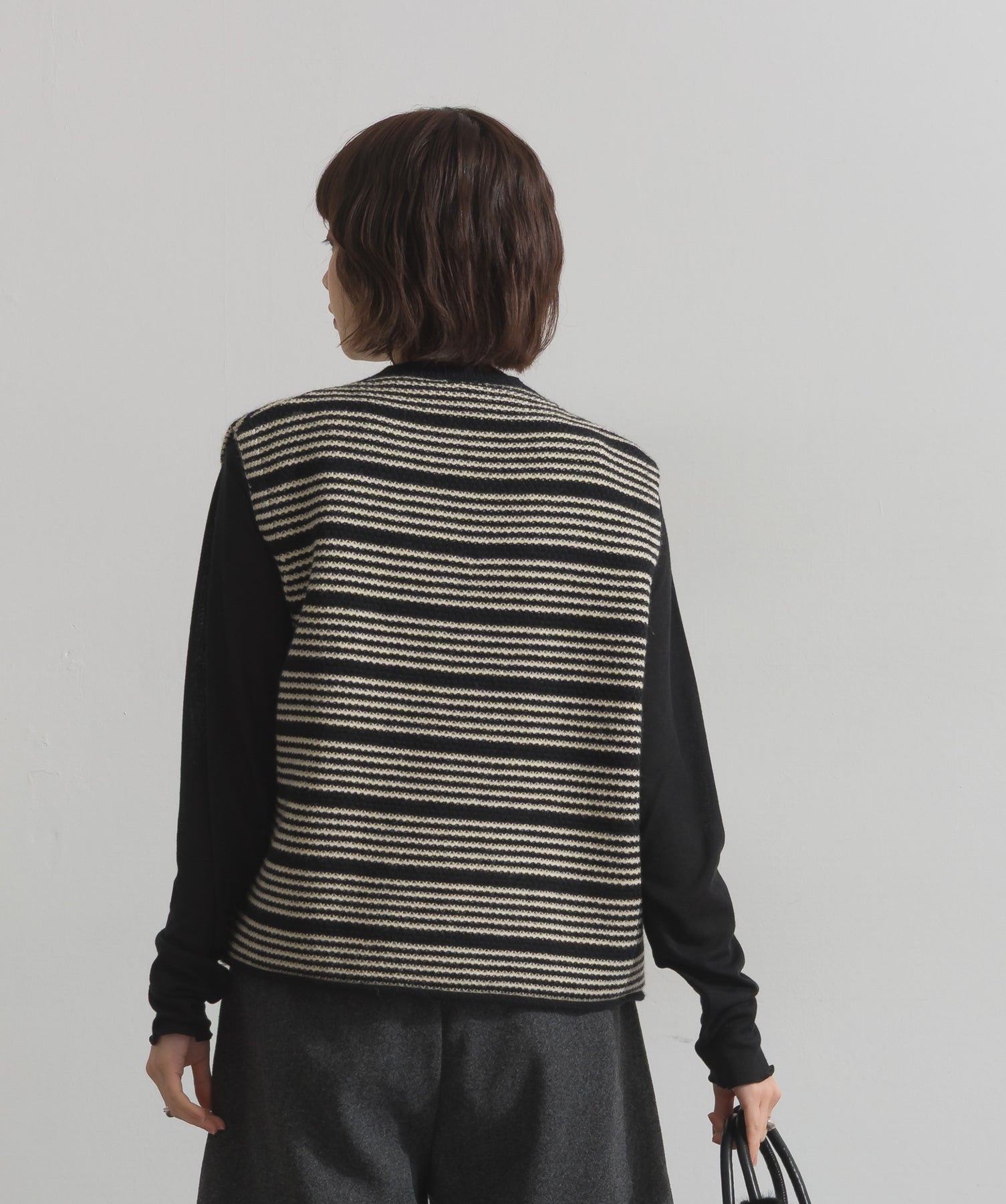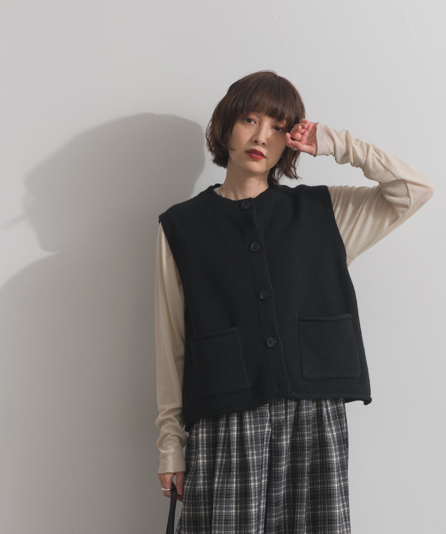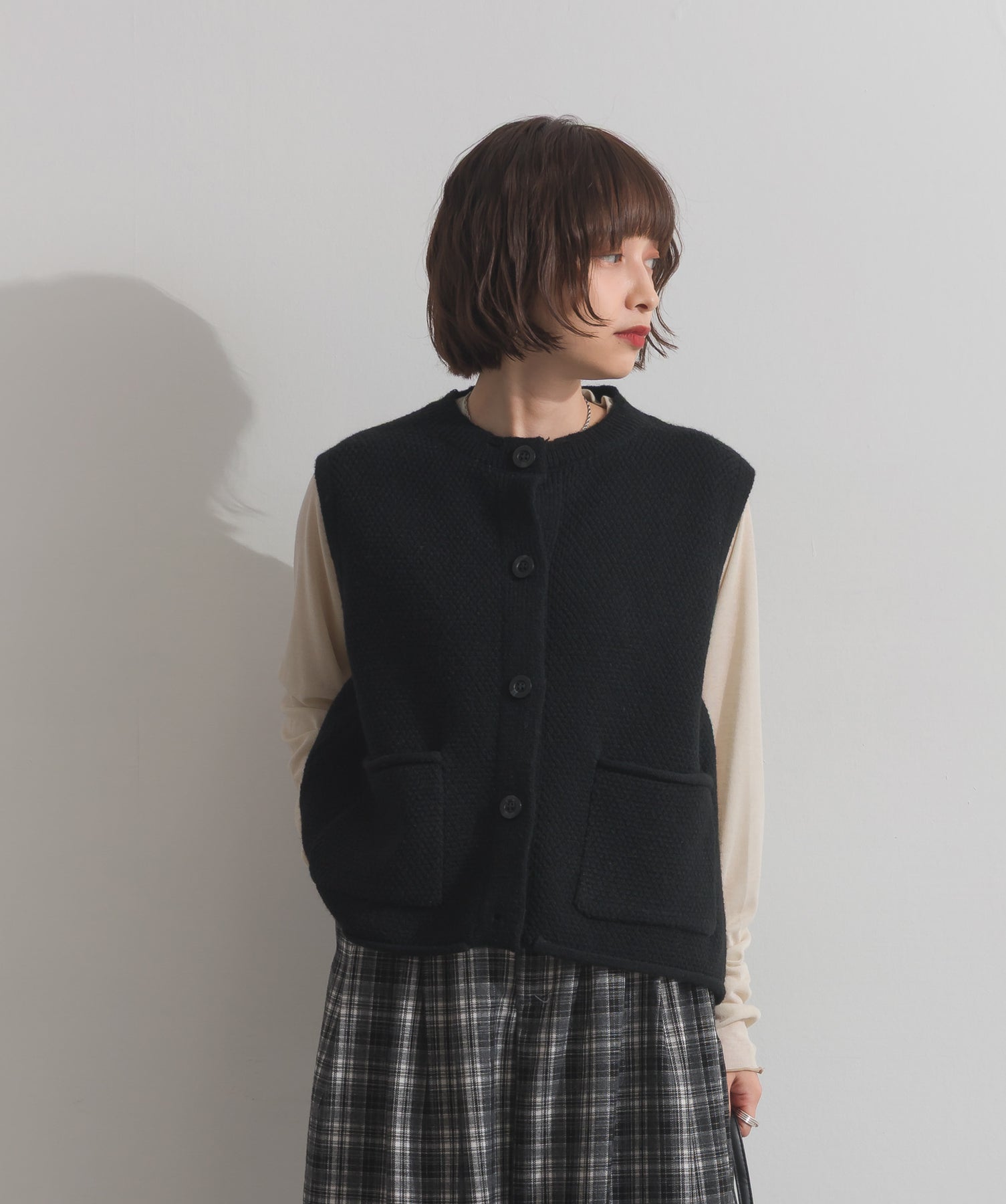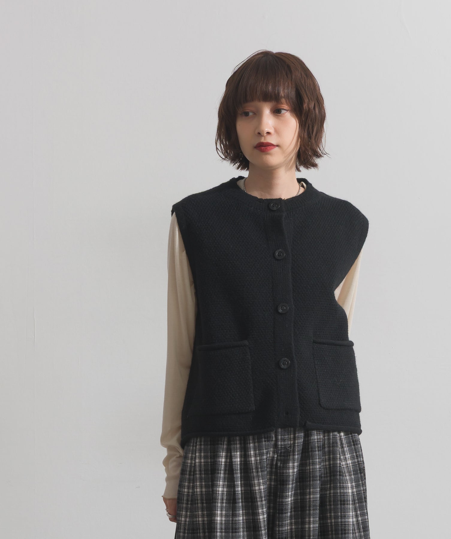 こなれ感を格上げする、万能ニットベスト。一枚足すだけで奥行きが生まれ、レイヤードスタイルを格上げしてくれるニットベスト。洗練されたバランス感で、秋冬のコーデをスタイリッシュに。-material-柔らかく温かみのあるニット素材を使用。程よい厚みで軽やかさを保ちつつ、防寒性も兼備。チクチク感のない快適な肌触りで、長時間の着用もストレスフリー。-design-クラシカルなクルーネックと、フロントのボタンデザインが特徴的な一枚。ストライプ柄と無地の2タイプ展開で、着回し力の高い汎用性を実現。裾のストレートカットとゆったりめの身幅が、トレンド感あるボックスシルエットを演出。パンツにもスカートにもバランス良くマッチし、レイヤードの幅を広げてくれる主役アイテム。
