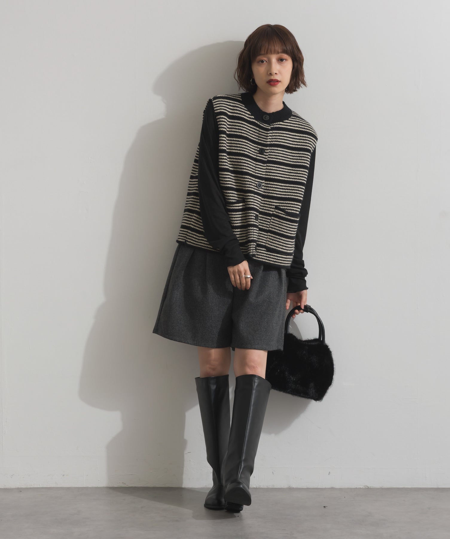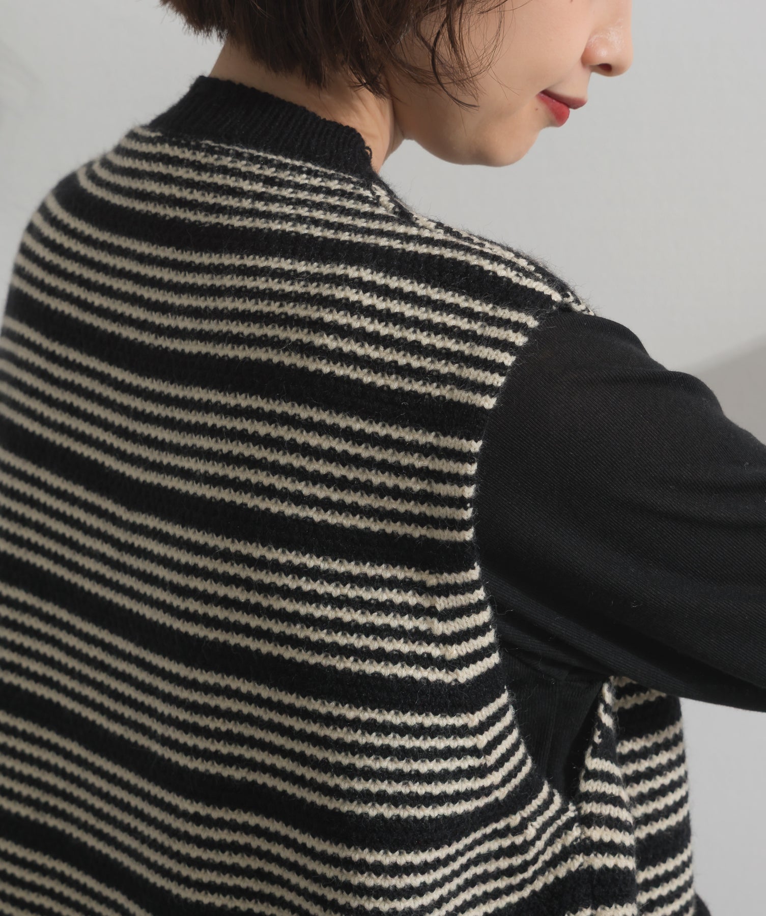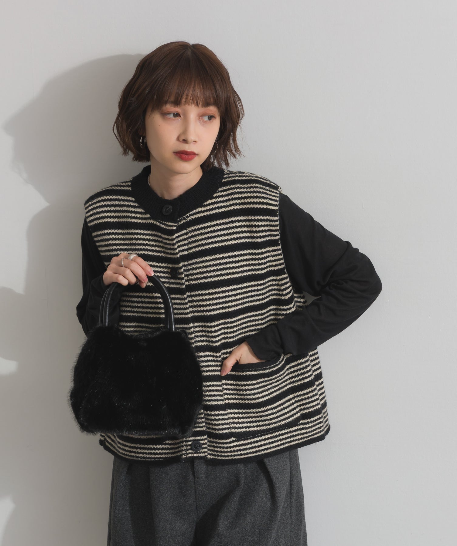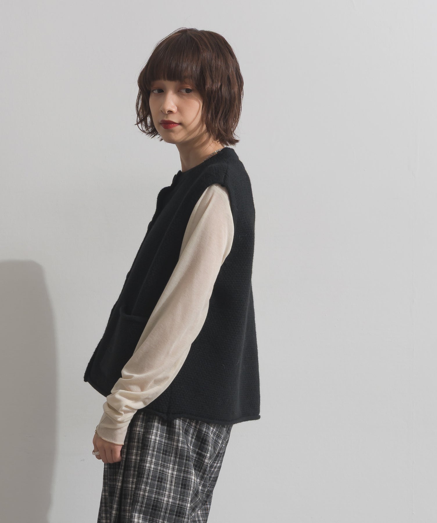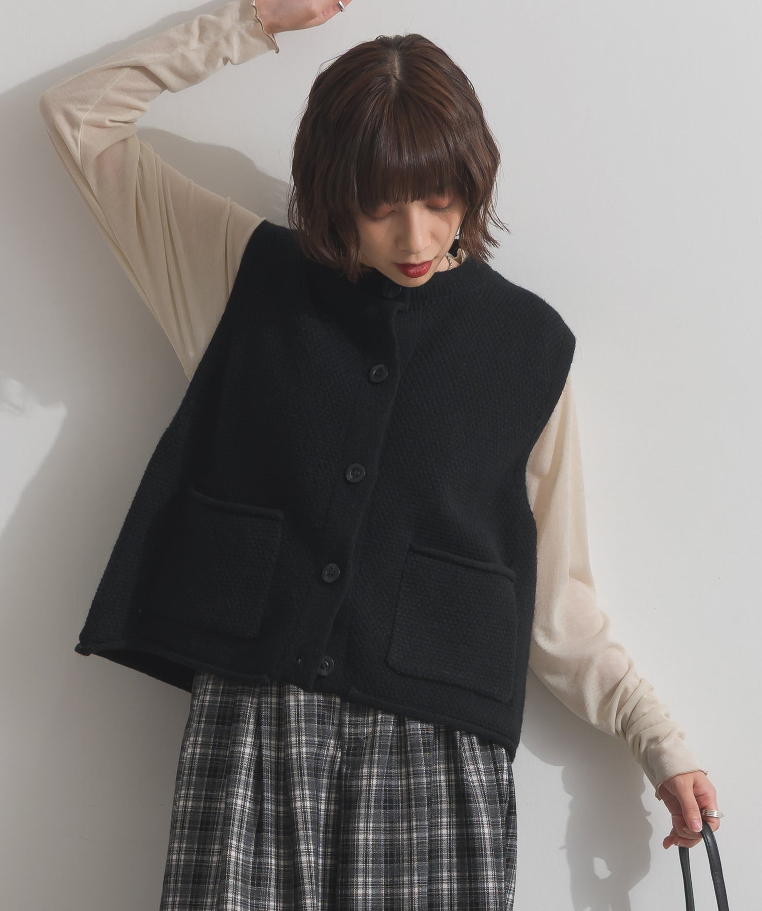 こなれ感を格上げする、万能ニットベスト。一枚足すだけで奥行きが生まれ、レイヤードスタイルを格上げしてくれるニットベスト。洗練されたバランス感で、秋冬のコーデをスタイリッシュに。-material-柔らかく温かみのあるニット素材を使用。程よい厚みで軽やかさを保ちつつ、防寒性も兼備。チクチク感のない快適な肌触りで、長時間の着用もストレスフリー。-design-クラシカルなクルーネックと、フロントのボタンデザインが特徴的な一枚。ストライプ柄と無地の2タイプ展開で、着回し力の高い汎用性を実現。裾のストレートカットとゆったりめの身幅が、トレンド感あるボックスシルエットを演出。パンツにもスカートにもバランス良くマッチし、レイヤードの幅を広げてくれる主役アイテム。
