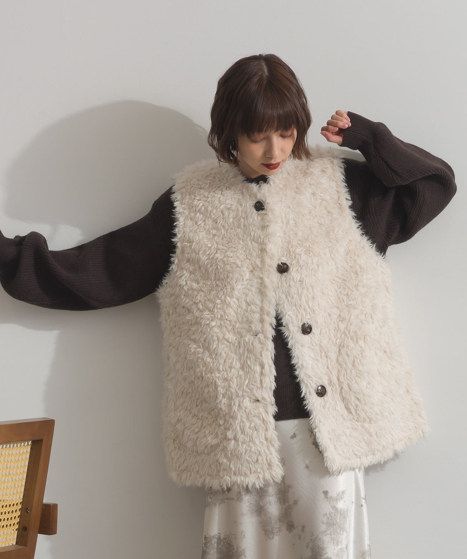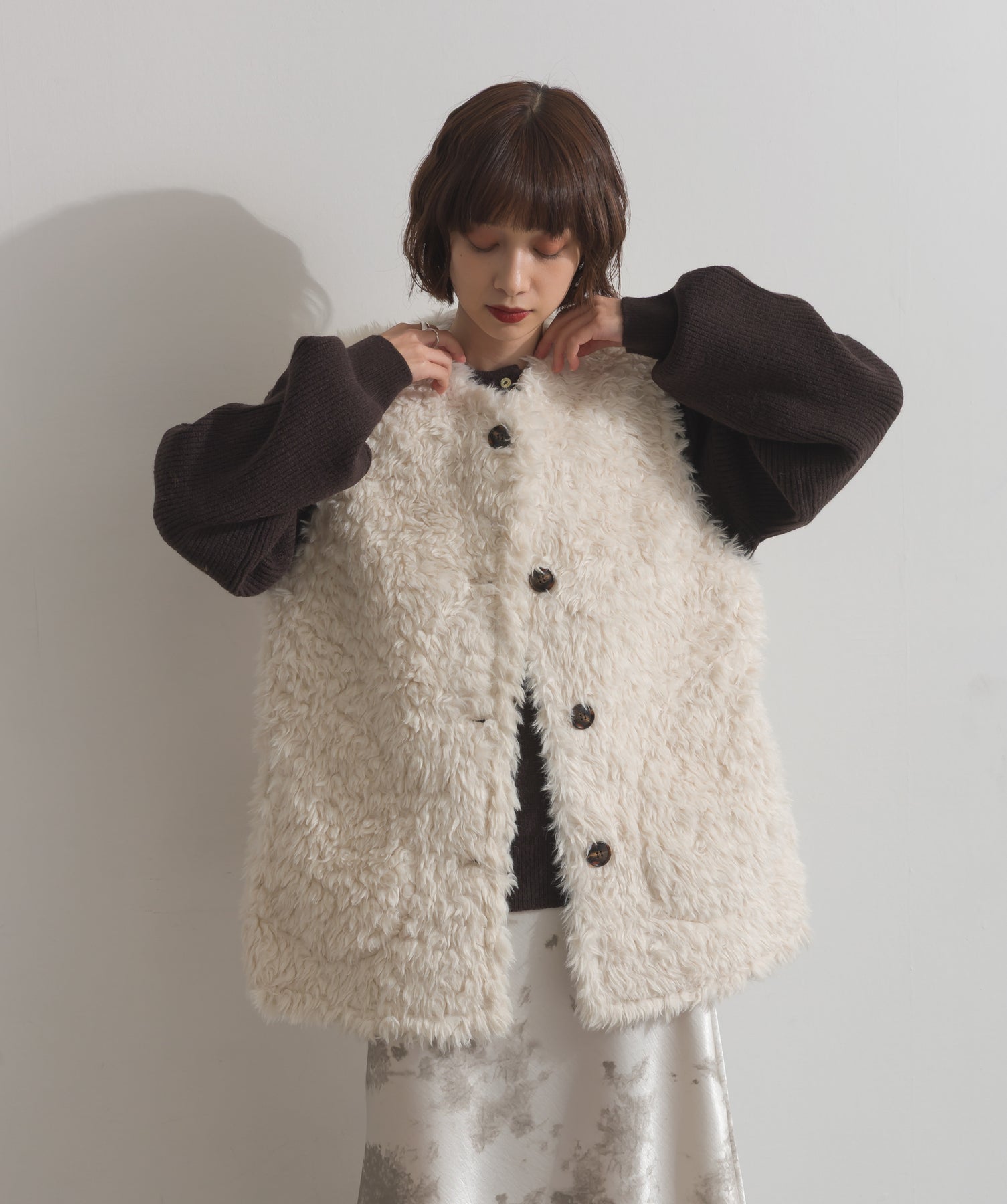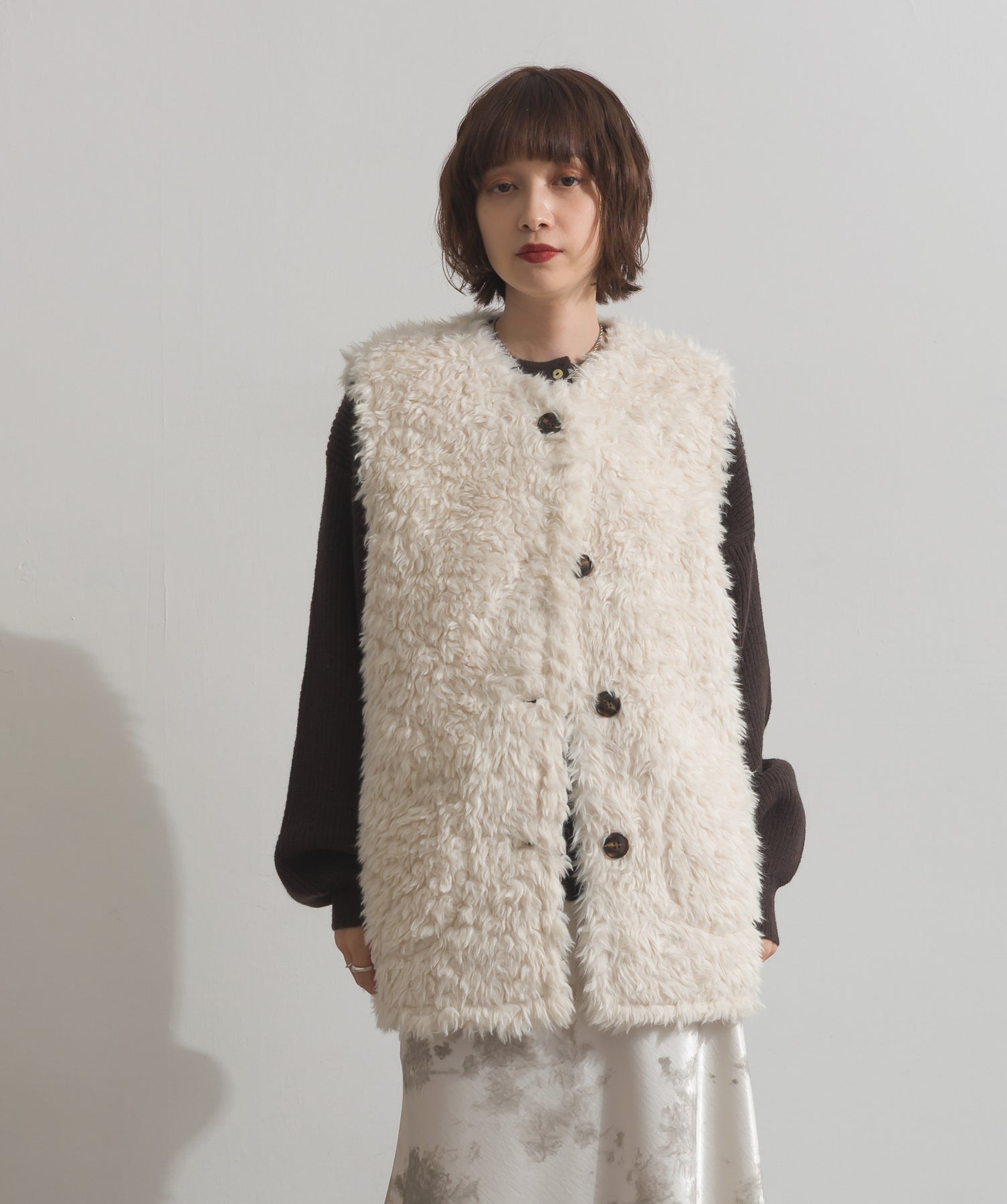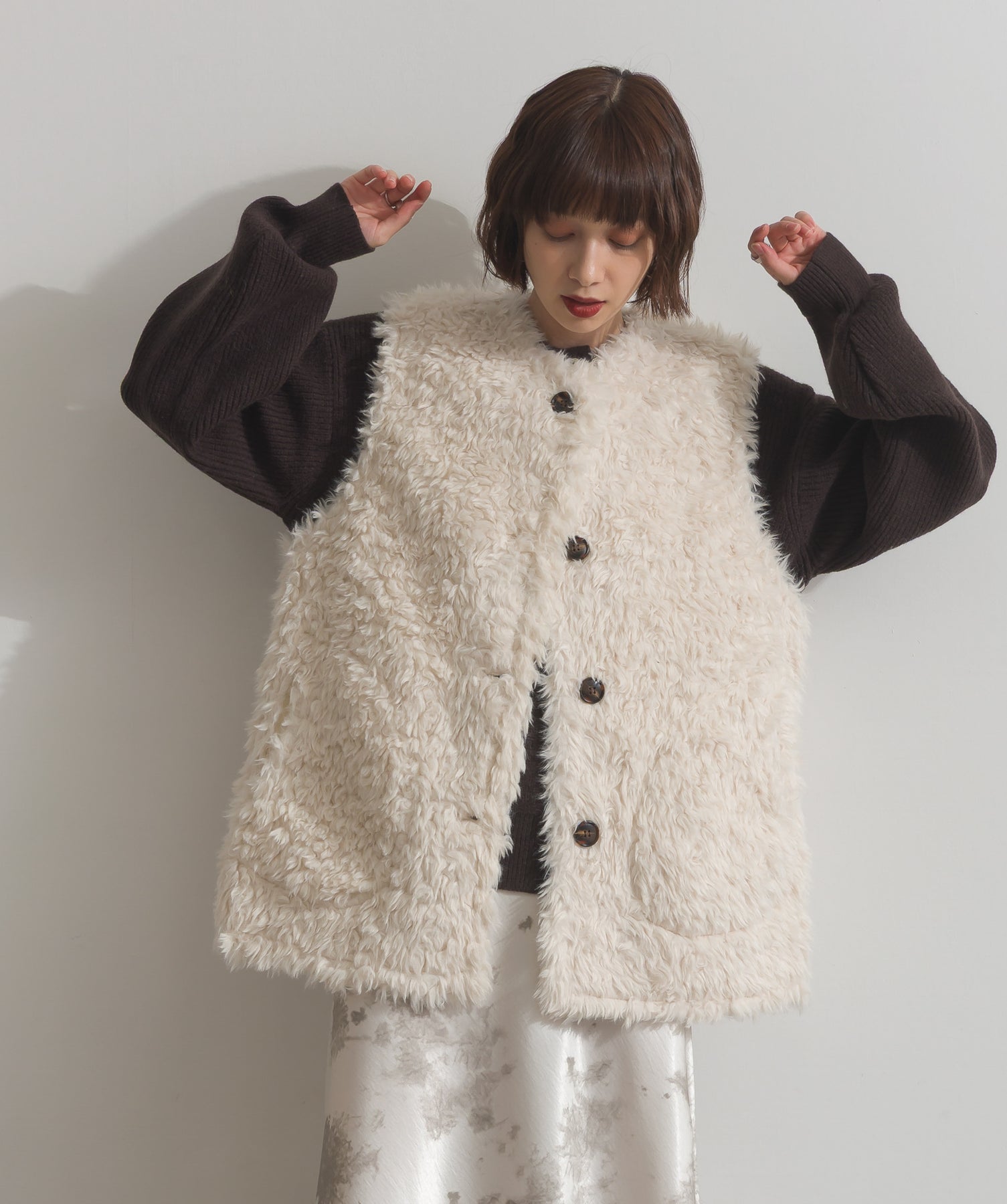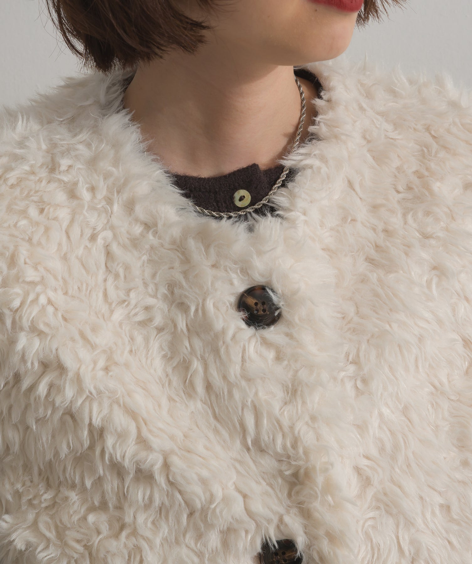 柔らかく、鋭く。今季主役のボアファー。-material-軽やかでボリューム感のあるシャギーボア素材を使用。柔らかな肌触りながらも毛足の立った表情で、存在感を放ちます。防寒性にも優れており、秋冬のレイヤードに最適な一枚です。-design-シンプルながらも目を引くデザイン。程よくオーバーなシルエットがこなれ感を演出し、前立てのボタンやVネック仕様がスタイリングに立体感をプラス。ニットやシャツに合わせるだけで、抜け感のあるトレンドライクな着こなしが完成します。ボトムスを選ばず、ワイドパンツやスカートとも好相性。