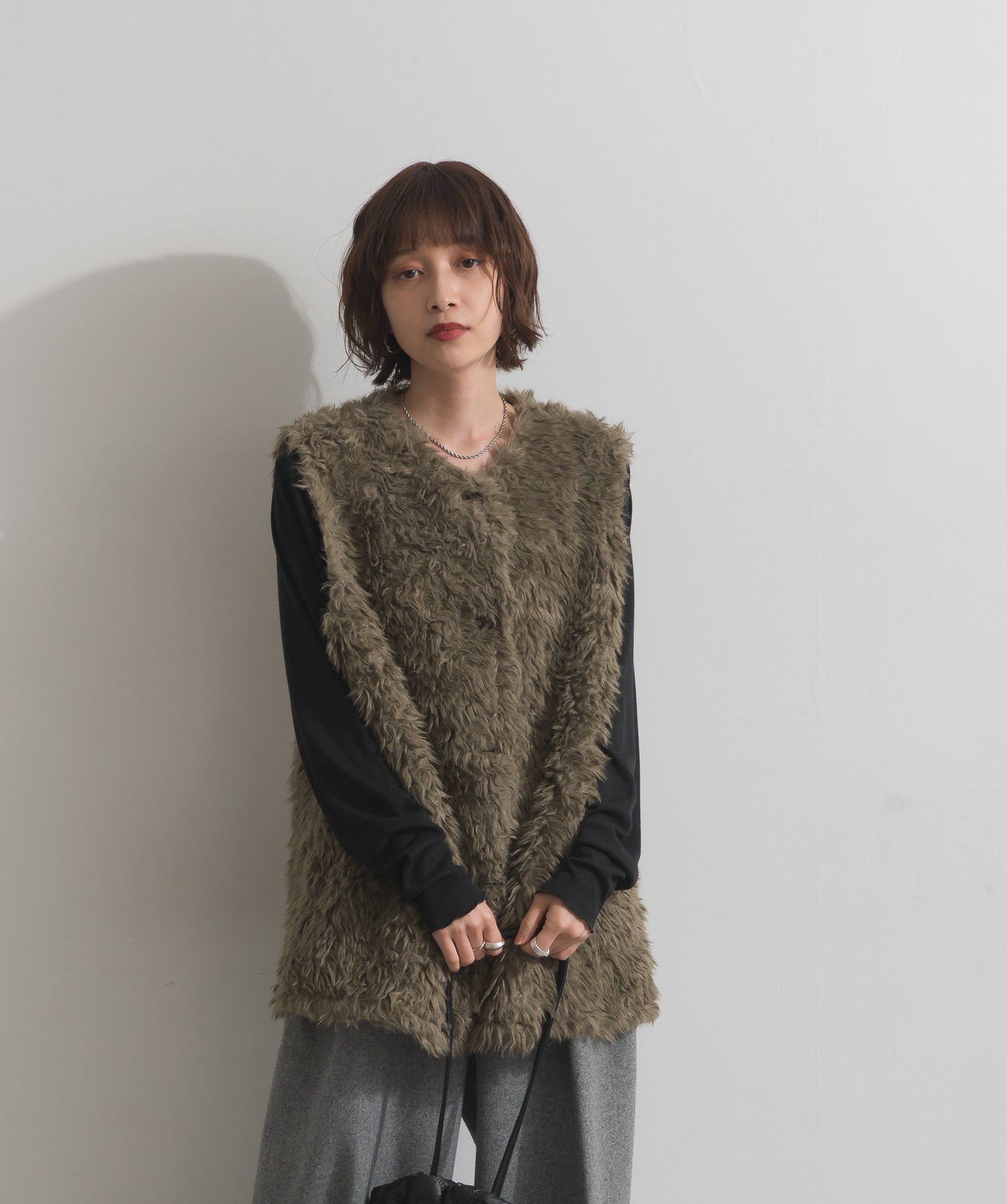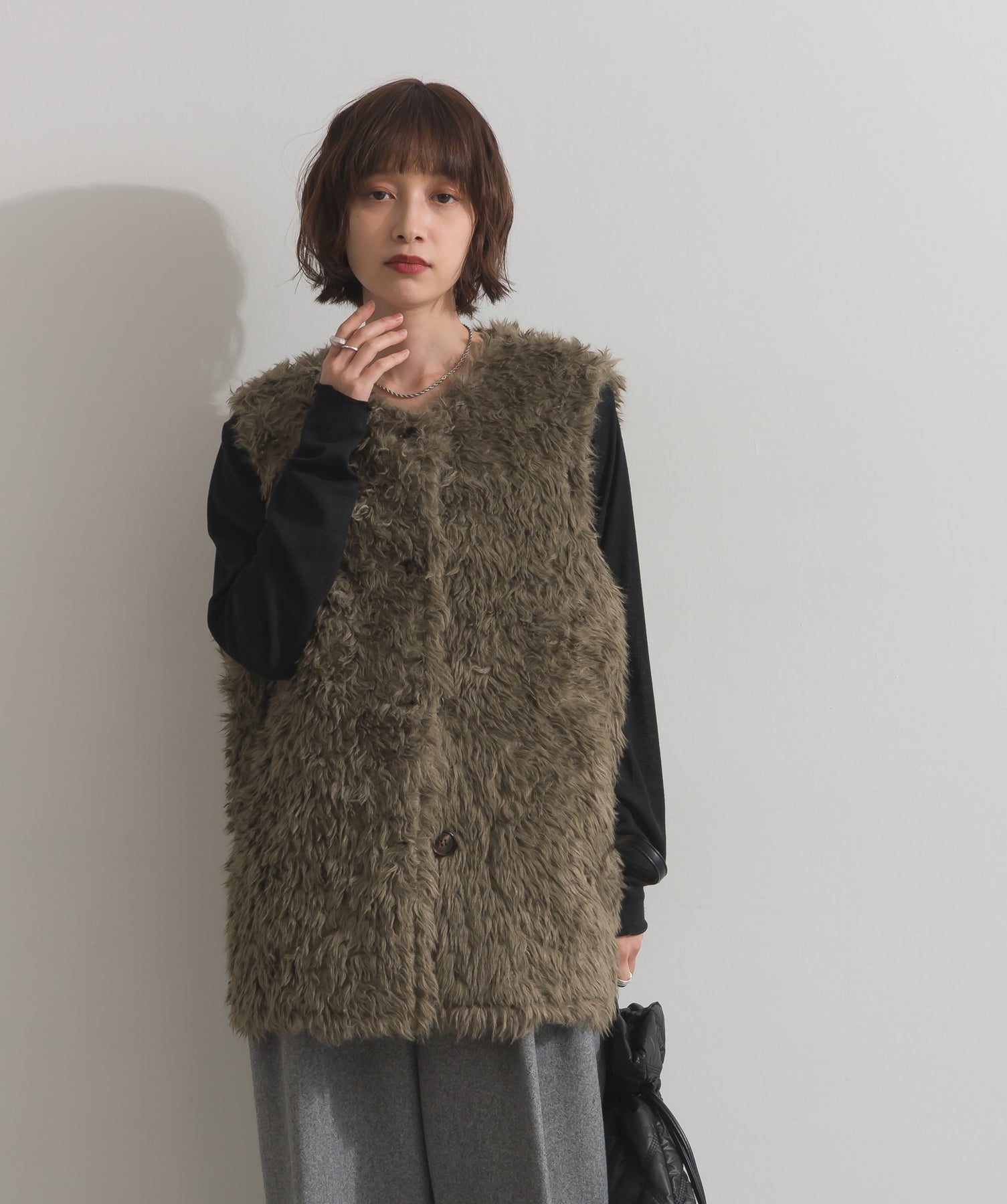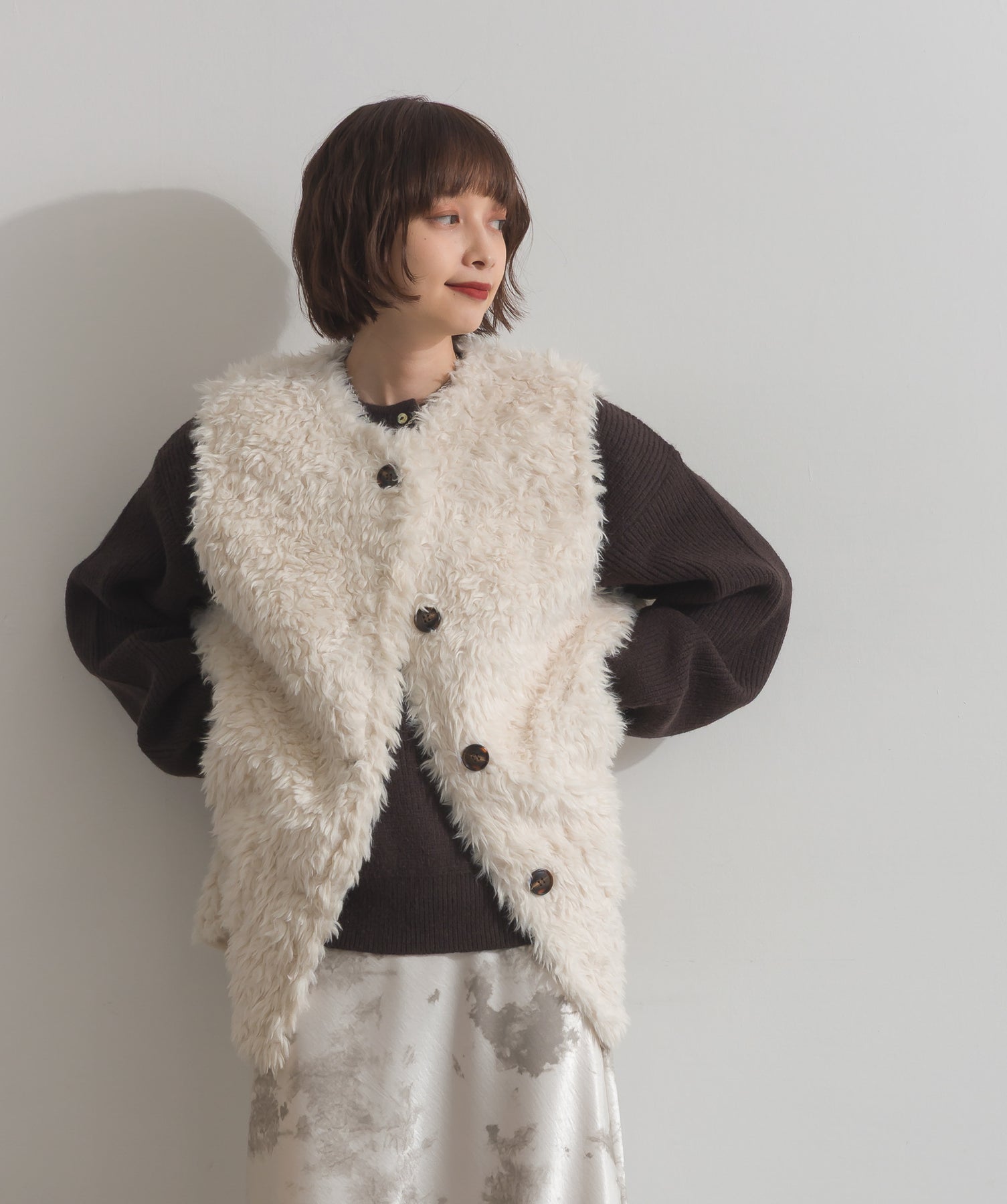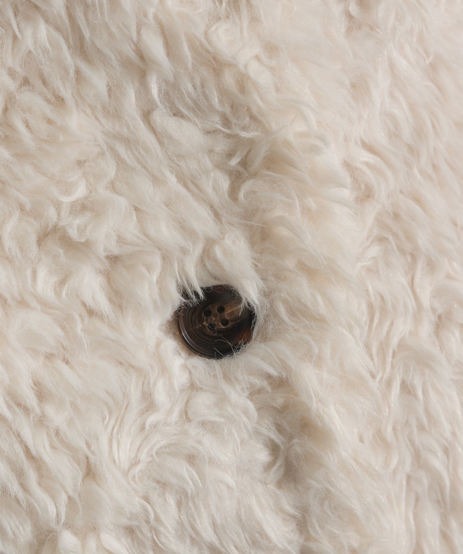 柔らかく、鋭く。今季主役のボアファー。-material-軽やかでボリューム感のあるシャギーボア素材を使用。柔らかな肌触りながらも毛足の立った表情で、存在感を放ちます。防寒性にも優れており、秋冬のレイヤードに最適な一枚です。-design-シンプルながらも目を引くデザイン。程よくオーバーなシルエットがこなれ感を演出し、前立てのボタンやVネック仕様がスタイリングに立体感をプラス。ニットやシャツに合わせるだけで、抜け感のあるトレンドライクな着こなしが完成します。ボトムスを選ばず、ワイドパンツやスカートとも好相性。
