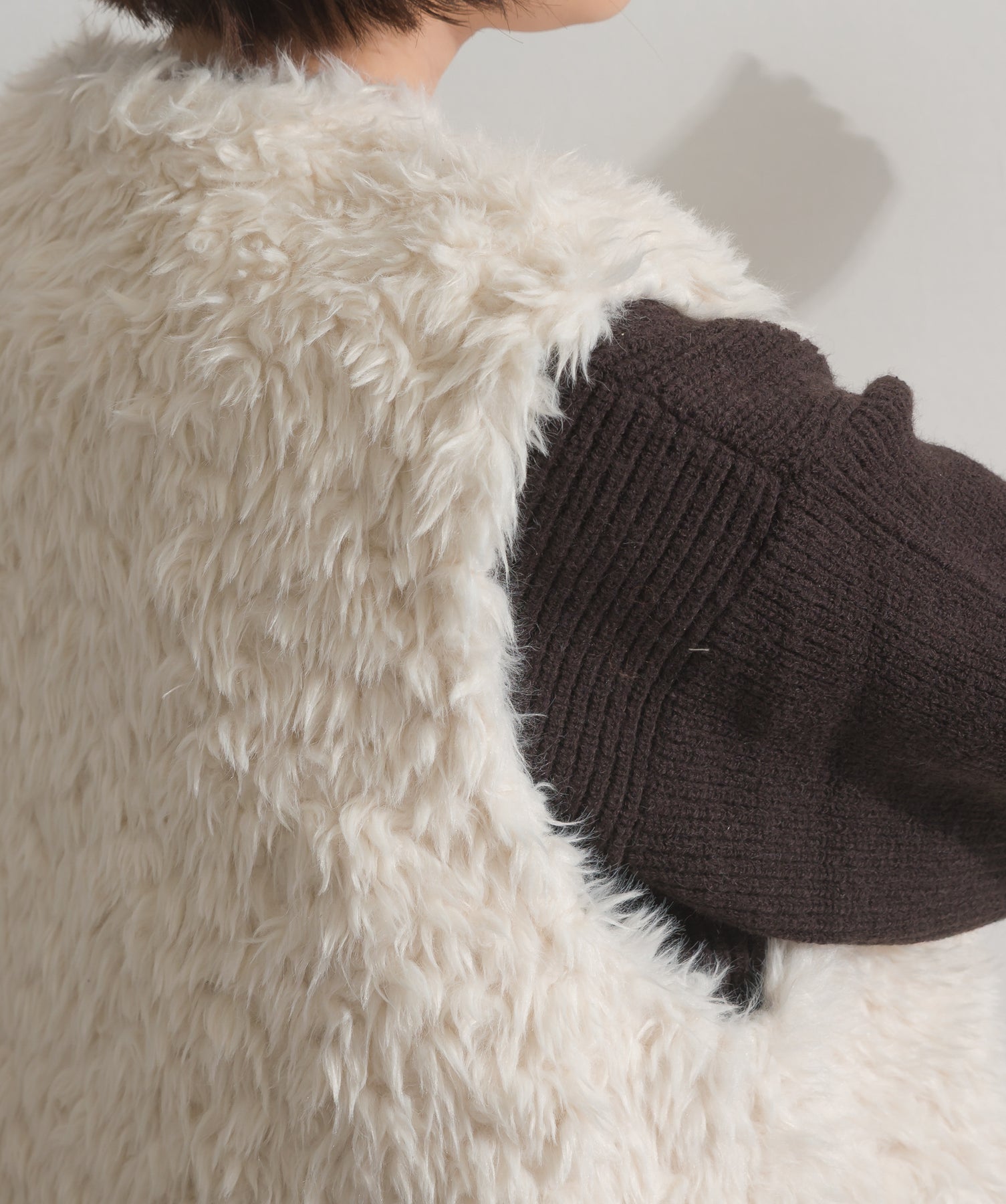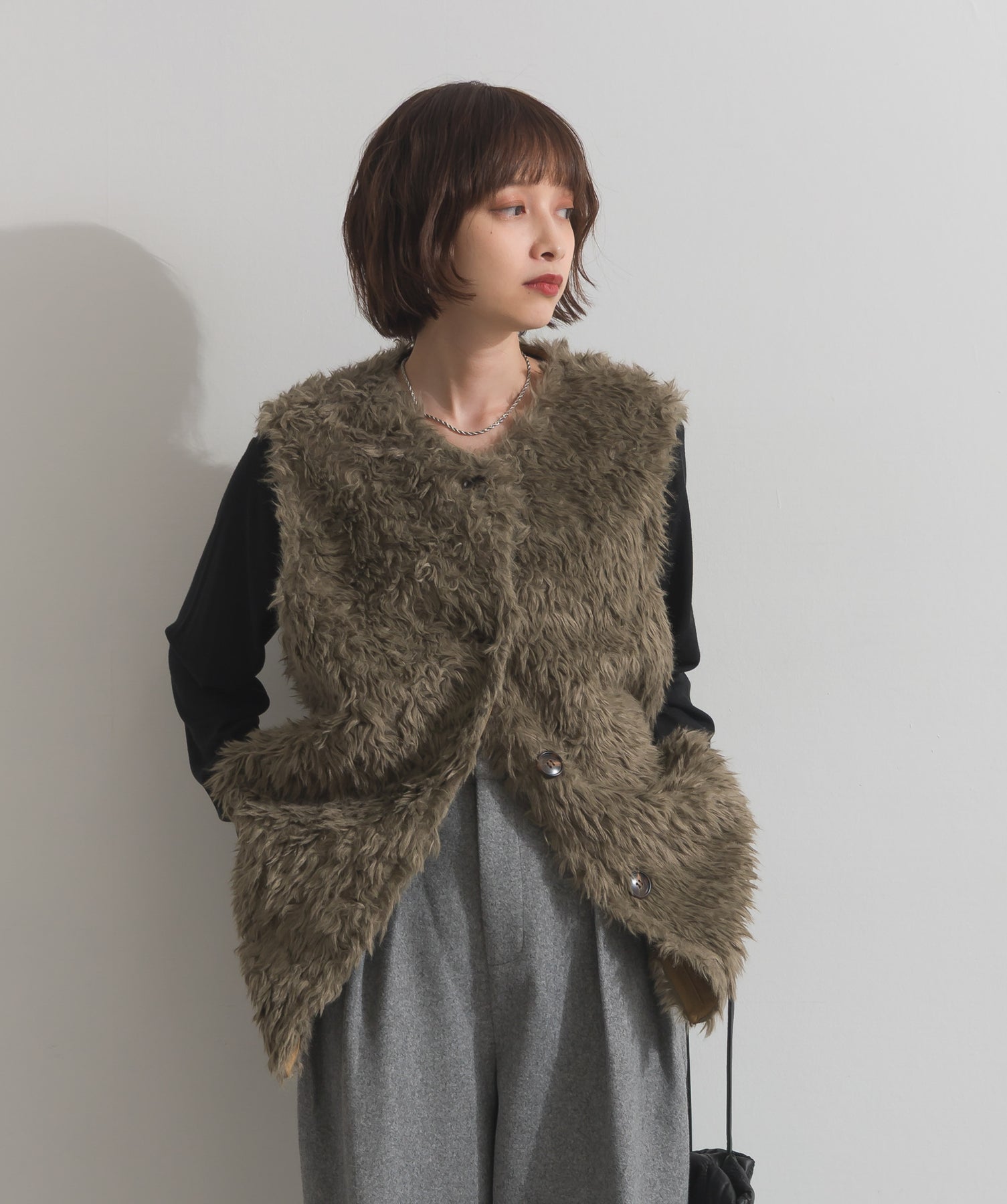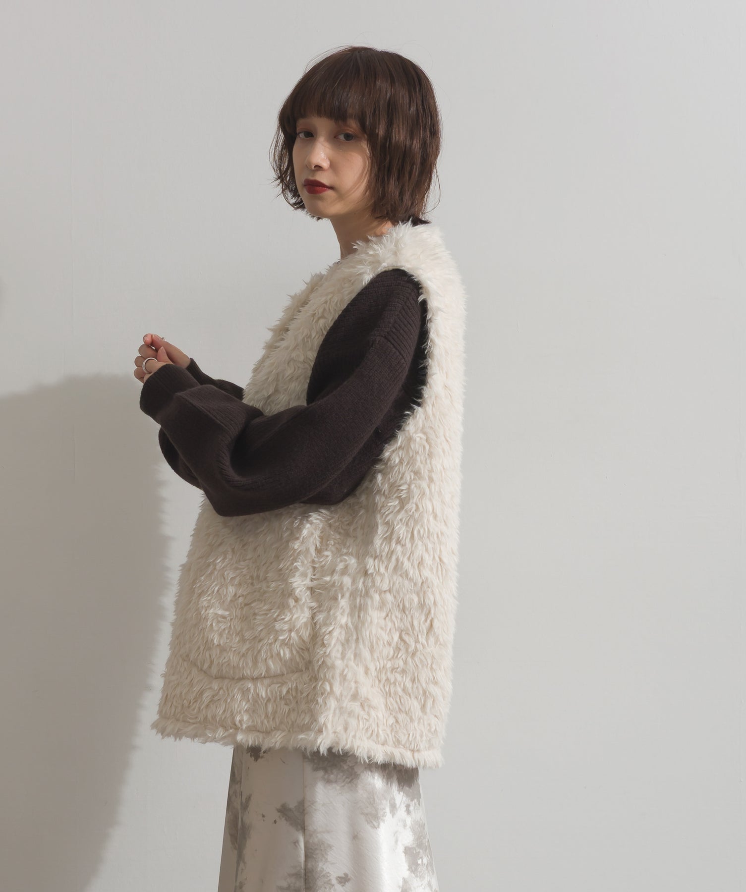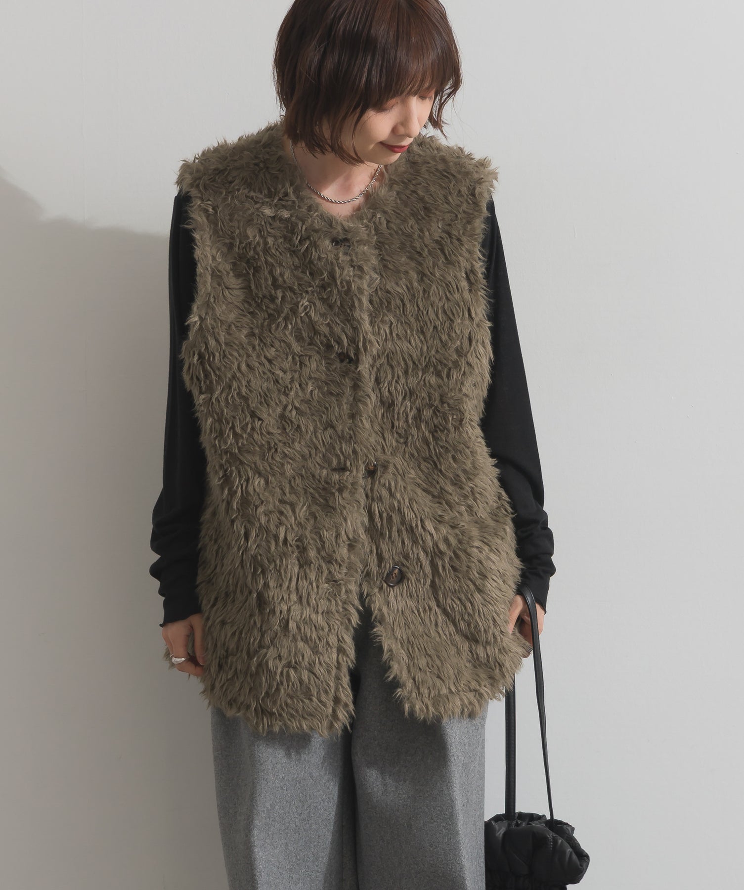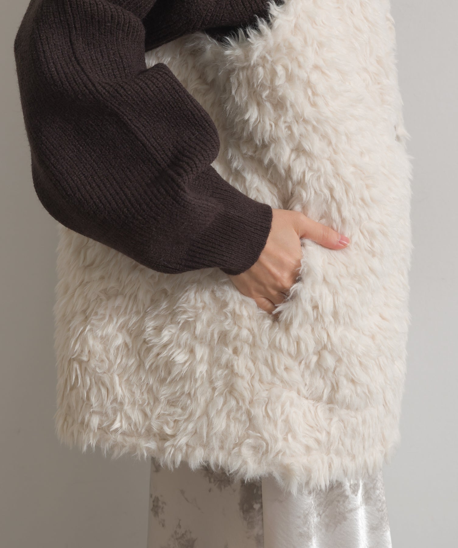 柔らかく、鋭く。今季主役のボアファー。-material-軽やかでボリューム感のあるシャギーボア素材を使用。柔らかな肌触りながらも毛足の立った表情で、存在感を放ちます。防寒性にも優れており、秋冬のレイヤードに最適な一枚です。-design-シンプルながらも目を引くデザイン。程よくオーバーなシルエットがこなれ感を演出し、前立てのボタンやVネック仕様がスタイリングに立体感をプラス。ニットやシャツに合わせるだけで、抜け感のあるトレンドライクな着こなしが完成します。ボトムスを選ばず、ワイドパンツやスカートとも好相性。