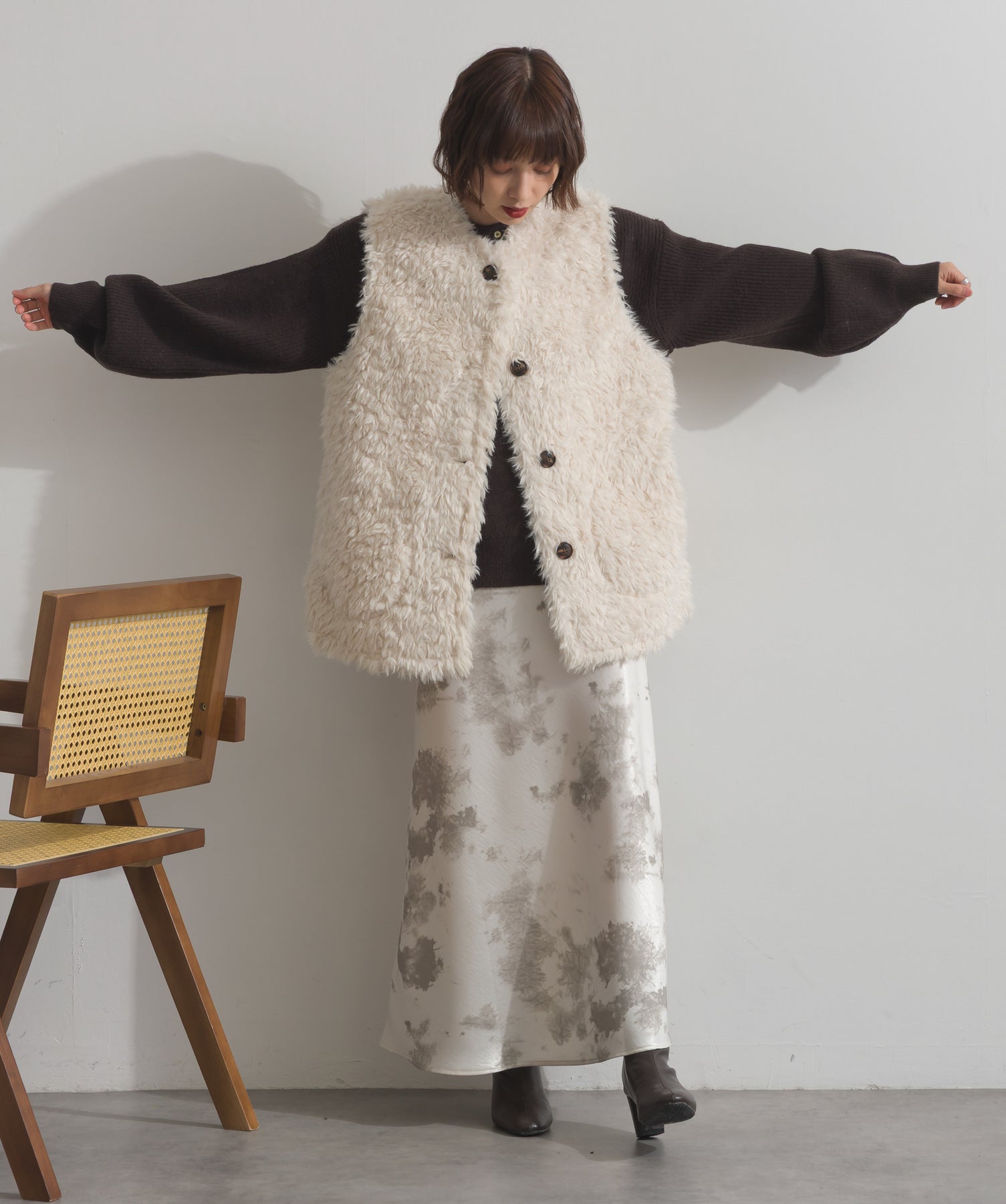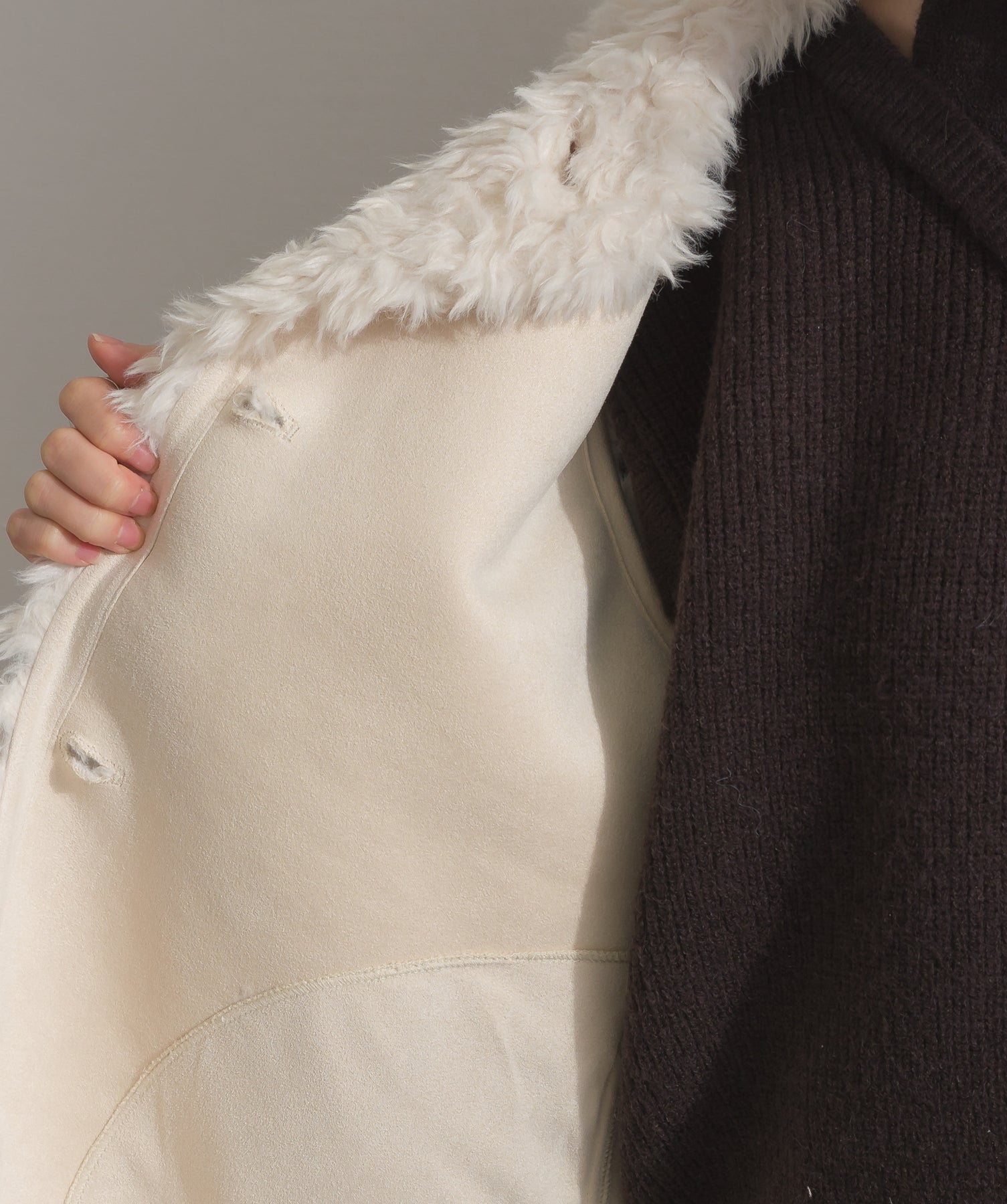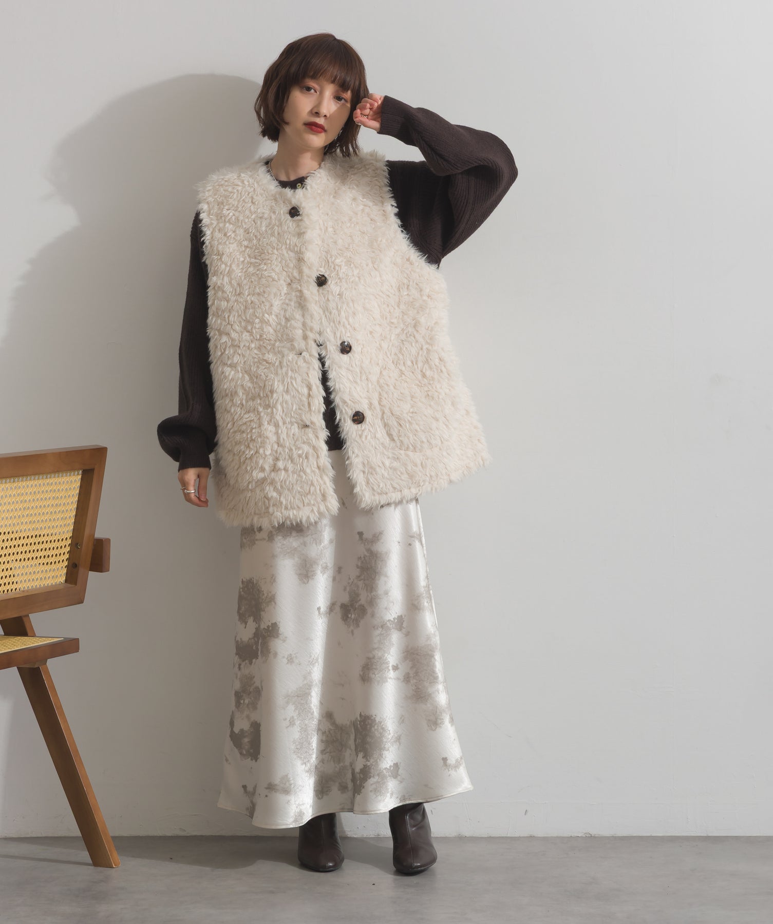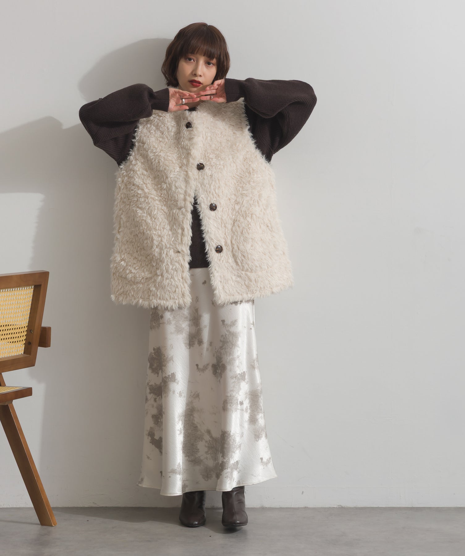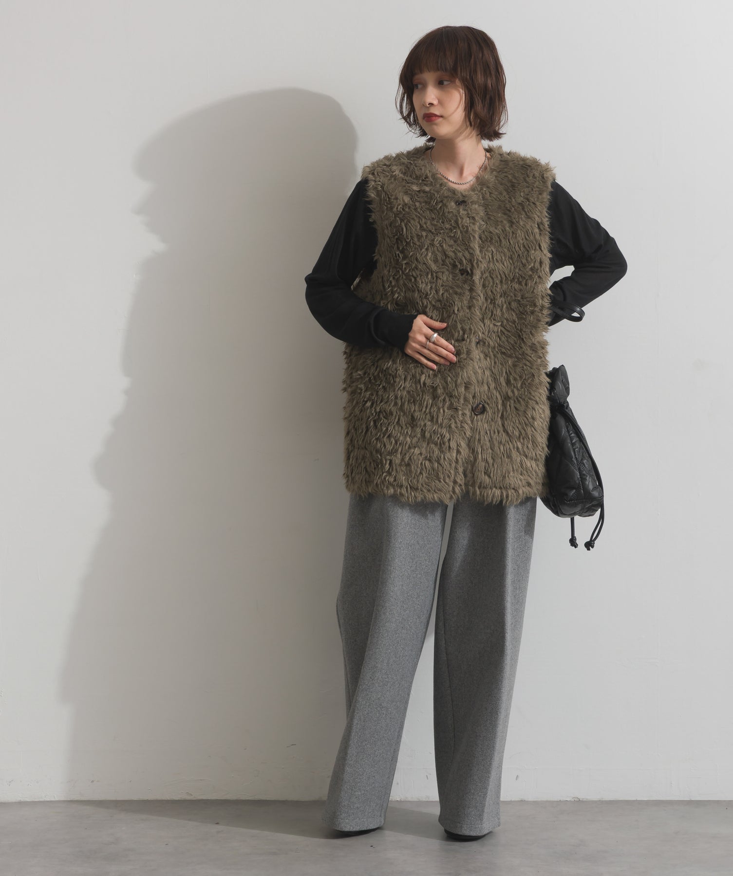 柔らかく、鋭く。今季主役のボアファー。-material-軽やかでボリューム感のあるシャギーボア素材を使用。柔らかな肌触りながらも毛足の立った表情で、存在感を放ちます。防寒性にも優れており、秋冬のレイヤードに最適な一枚です。-design-シンプルながらも目を引くデザイン。程よくオーバーなシルエットがこなれ感を演出し、前立てのボタンやVネック仕様がスタイリングに立体感をプラス。ニットやシャツに合わせるだけで、抜け感のあるトレンドライクな着こなしが完成します。ボトムスを選ばず、ワイドパンツやスカートとも好相性。