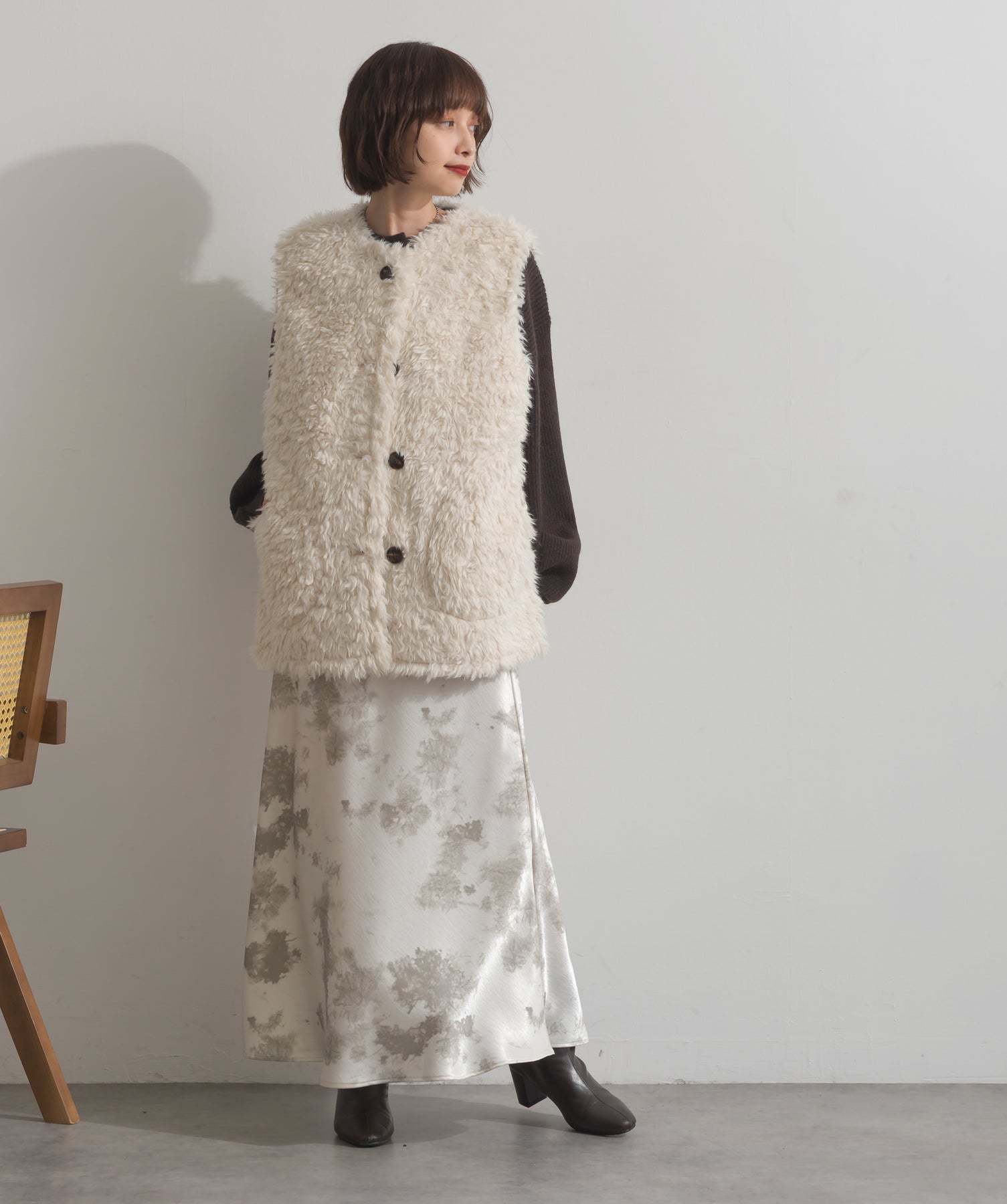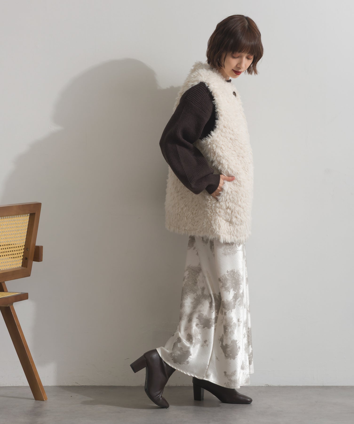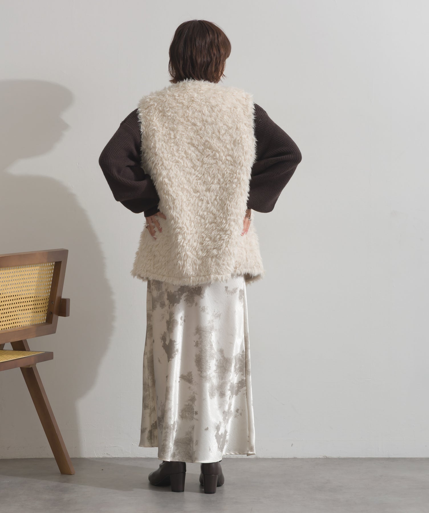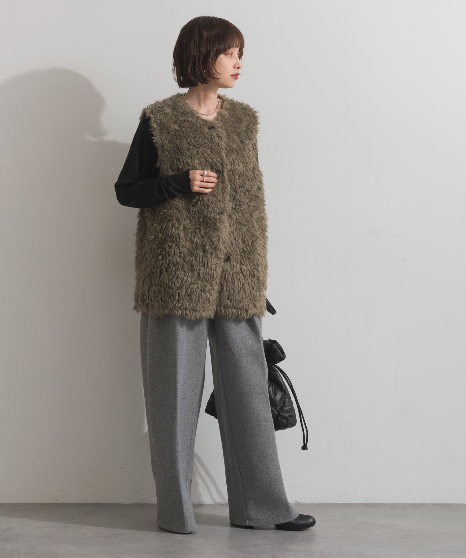 柔らかく、鋭く。今季主役のボアファー。-material-軽やかでボリューム感のあるシャギーボア素材を使用。柔らかな肌触りながらも毛足の立った表情で、存在感を放ちます。防寒性にも優れており、秋冬のレイヤードに最適な一枚です。-design-シンプルながらも目を引くデザイン。程よくオーバーなシルエットがこなれ感を演出し、前立てのボタンやVネック仕様がスタイリングに立体感をプラス。ニットやシャツに合わせるだけで、抜け感のあるトレンドライクな着こなしが完成します。ボトムスを選ばず、ワイドパンツやスカートとも好相性。