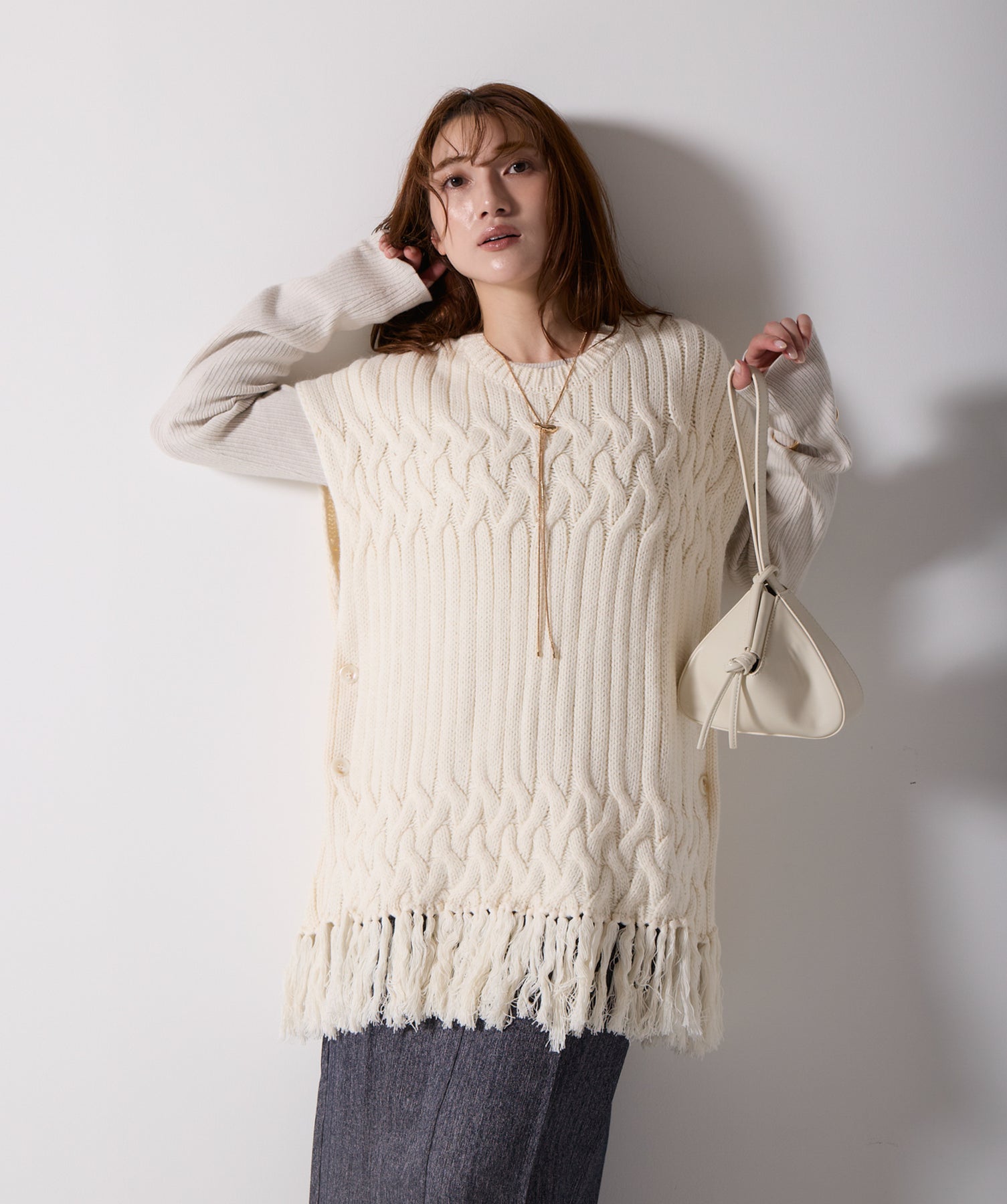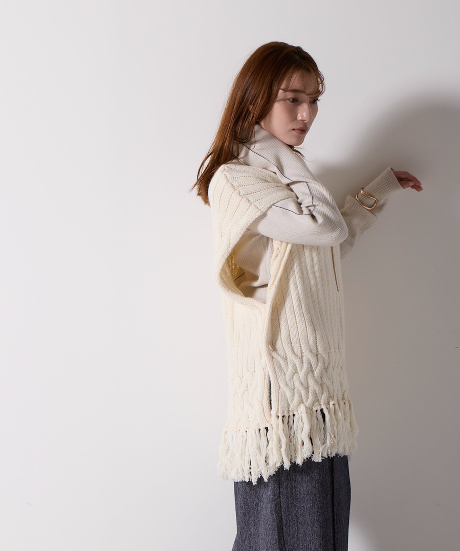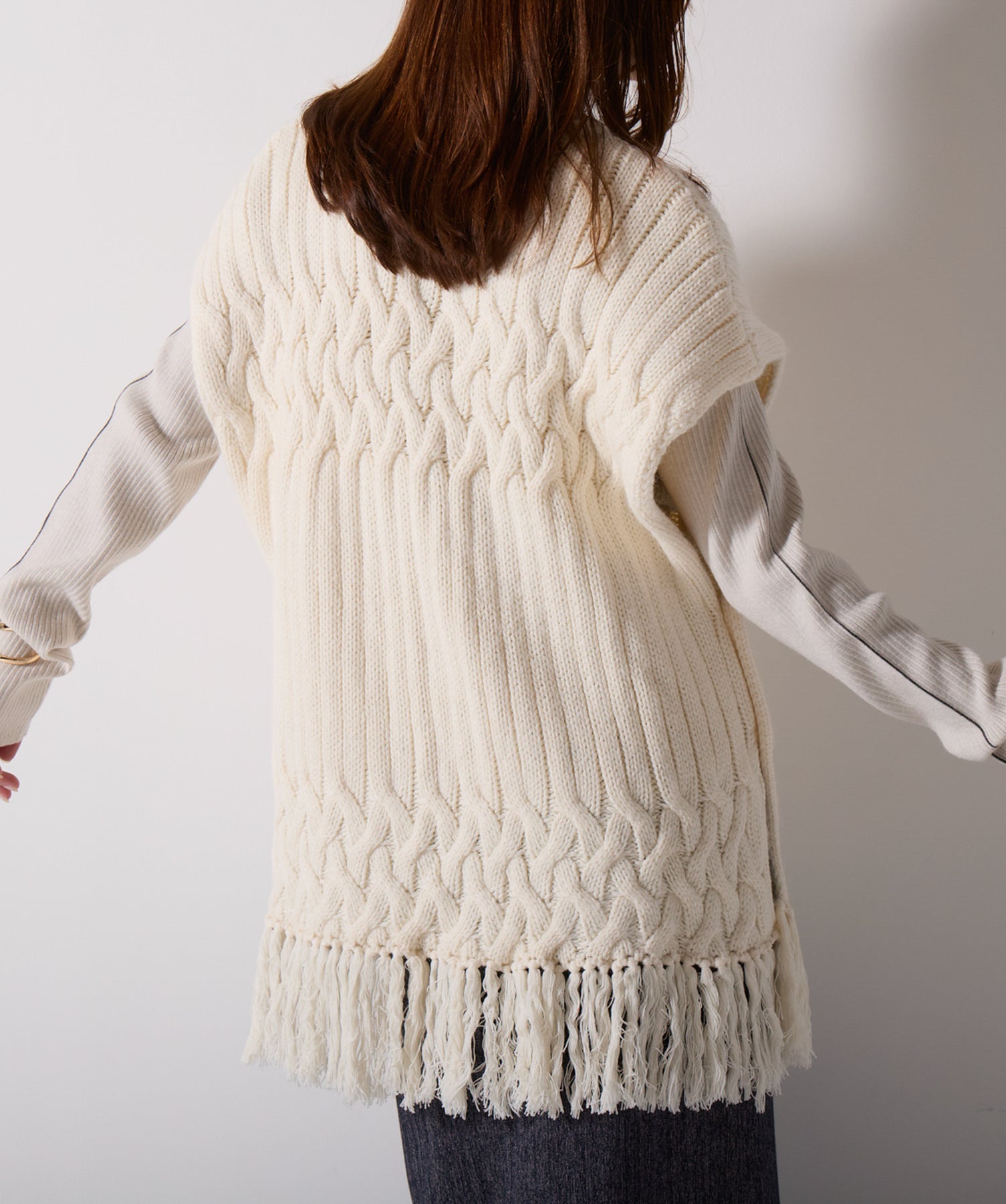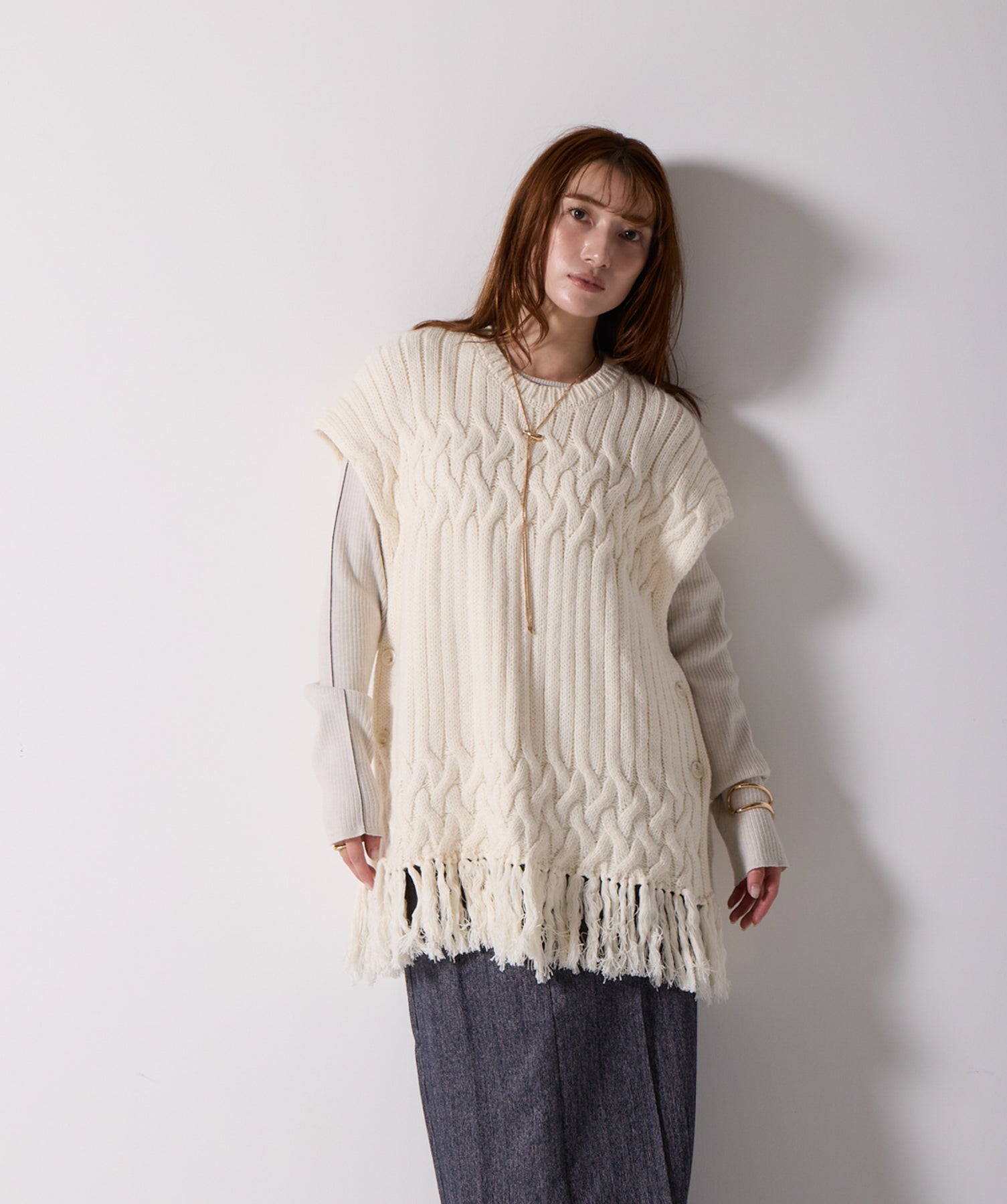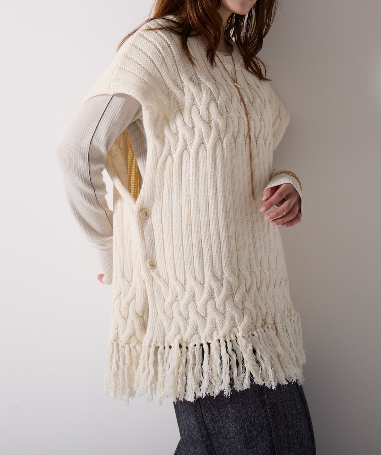立体感と動きをまとう、主役級ニットベスト。-material- ローゲージで編み立てたケーブルニットは、存在感のある凹凸が特徴。ふっくらとした厚みとやわらかなタッチがボディラインを拾いすぎず、快適な着心地を叶えます。裾の大胆なフリンジがニュアンスを加え、動くたびに揺れるディテールが視線を惹きつけます。-design- 肩を覆うフレンチスリーブとロング丈のバランスが絶妙で、レイヤードするだけでこなれ感のあるスタイルに仕上がります。フロント両サイドにはボタン付きのスリットが施されており、シルエットに表情を持たせながらインナーとの組み合わせも自在に。甘さを抑えたフォルムとテクスチャーが、大人のカジュアルにモードなエッセンスを加えます。・素材:綿60% アクリル40%