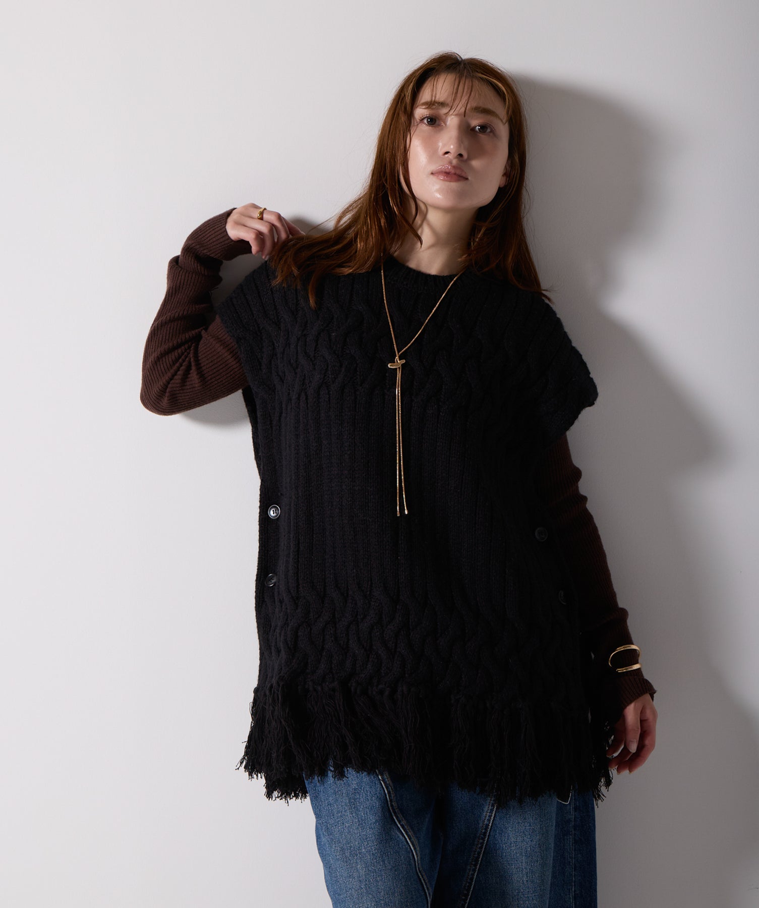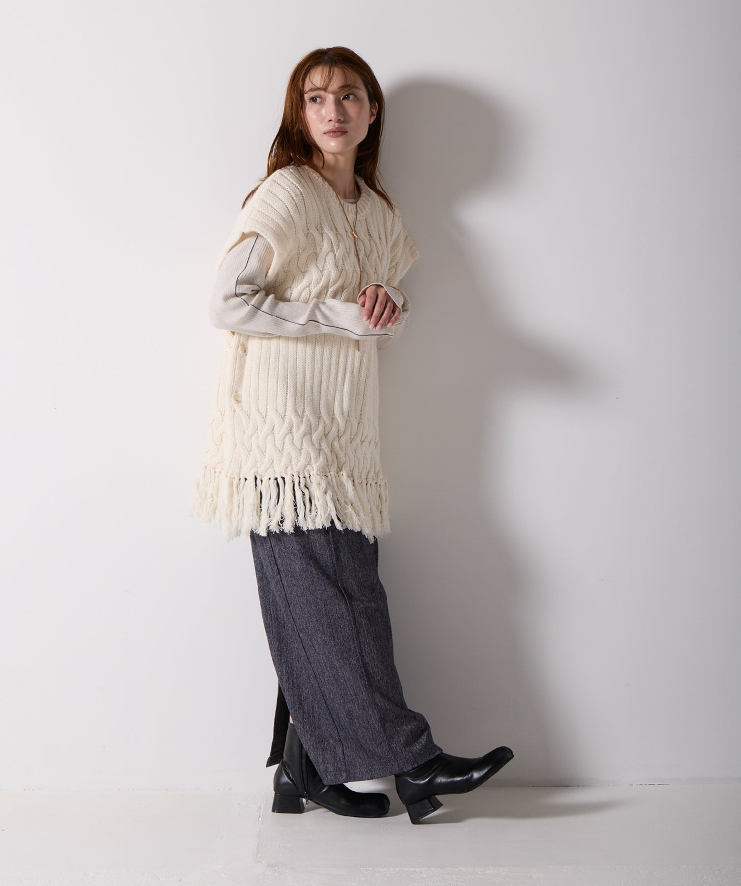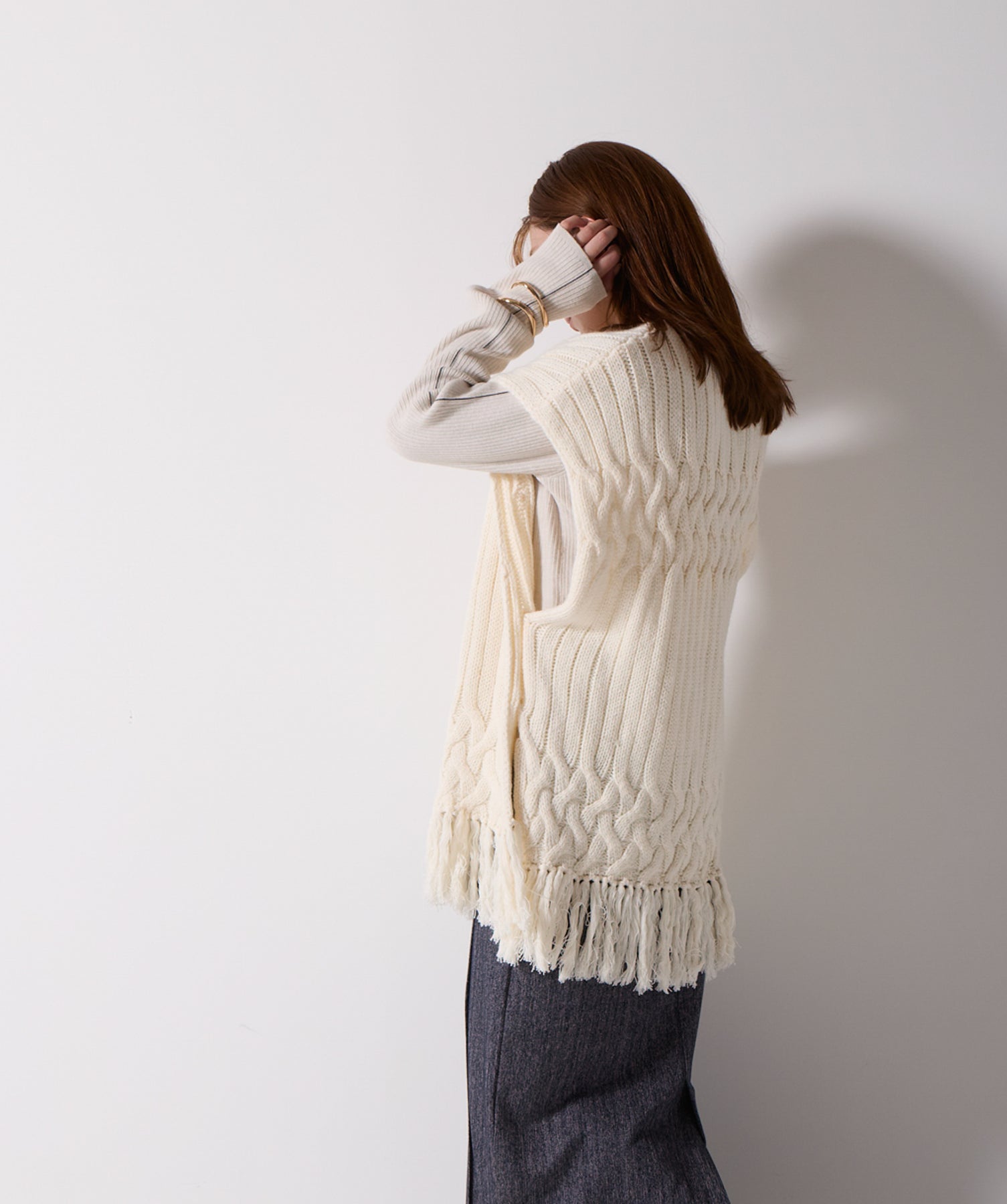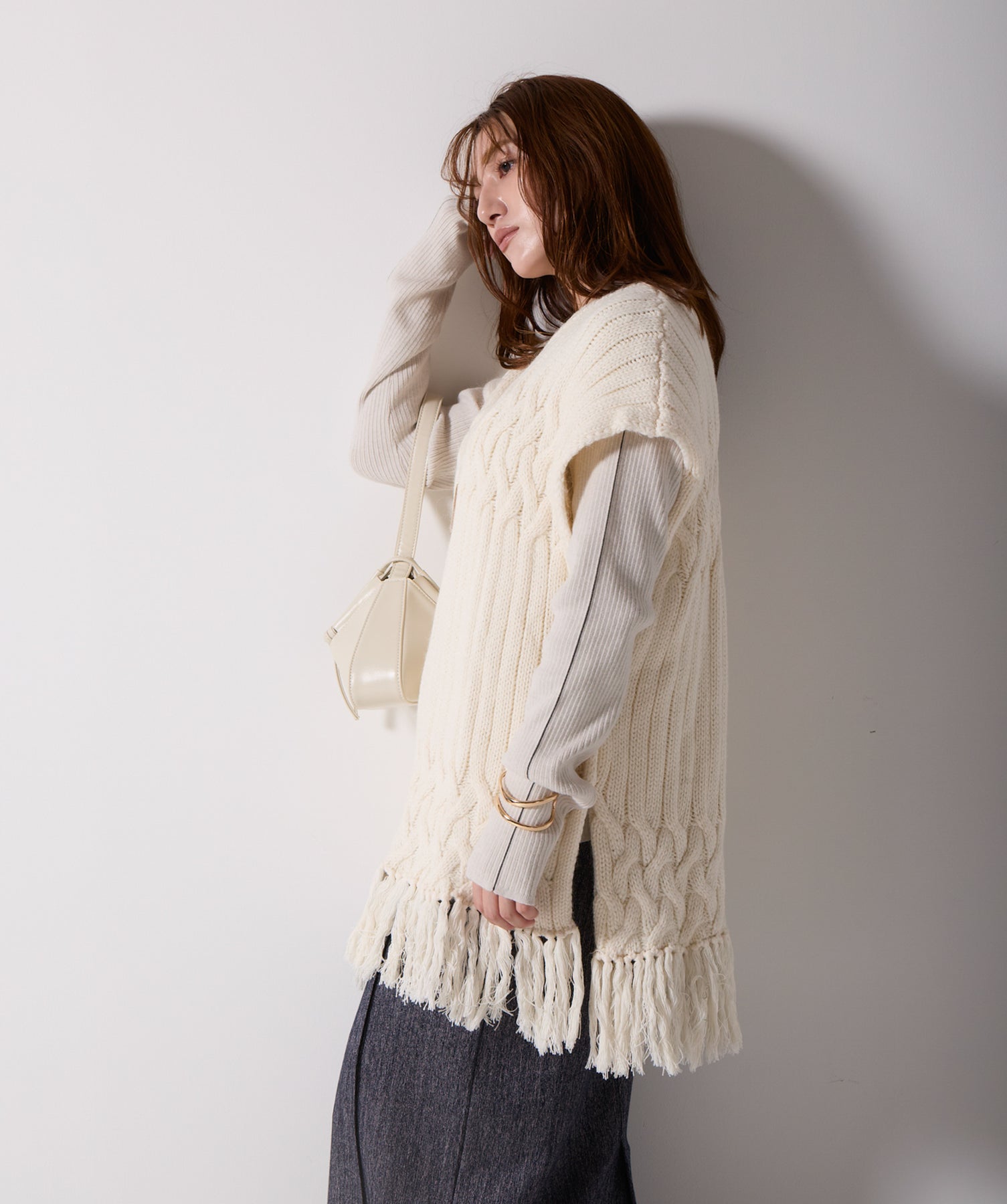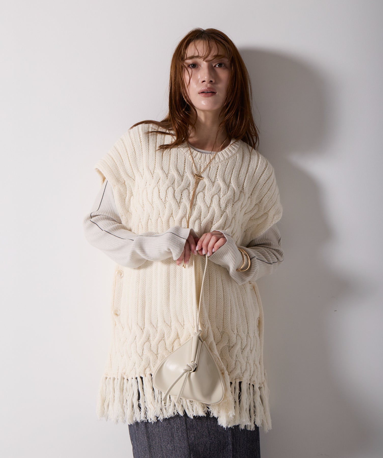 立体感と動きをまとう、主役級ニットベスト。-material- ローゲージで編み立てたケーブルニットは、存在感のある凹凸が特徴。ふっくらとした厚みとやわらかなタッチがボディラインを拾いすぎず、快適な着心地を叶えます。裾の大胆なフリンジがニュアンスを加え、動くたびに揺れるディテールが視線を惹きつけます。-design- 肩を覆うフレンチスリーブとロング丈のバランスが絶妙で、レイヤードするだけでこなれ感のあるスタイルに仕上がります。フロント両サイドにはボタン付きのスリットが施されており、シルエットに表情を持たせながらインナーとの組み合わせも自在に。甘さを抑えたフォルムとテクスチャーが、大人のカジュアルにモードなエッセンスを加えます。・素材:綿60% アクリル40%