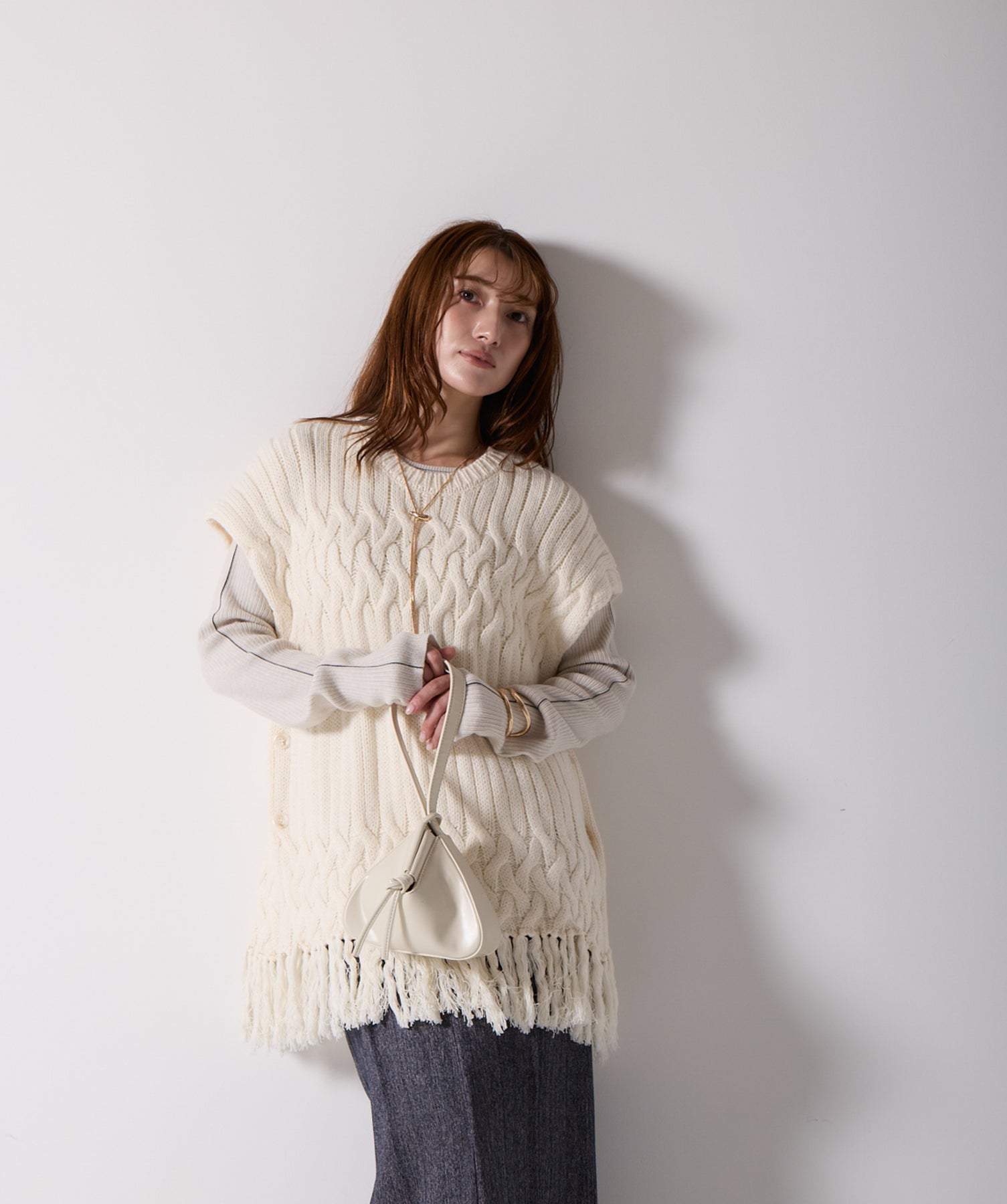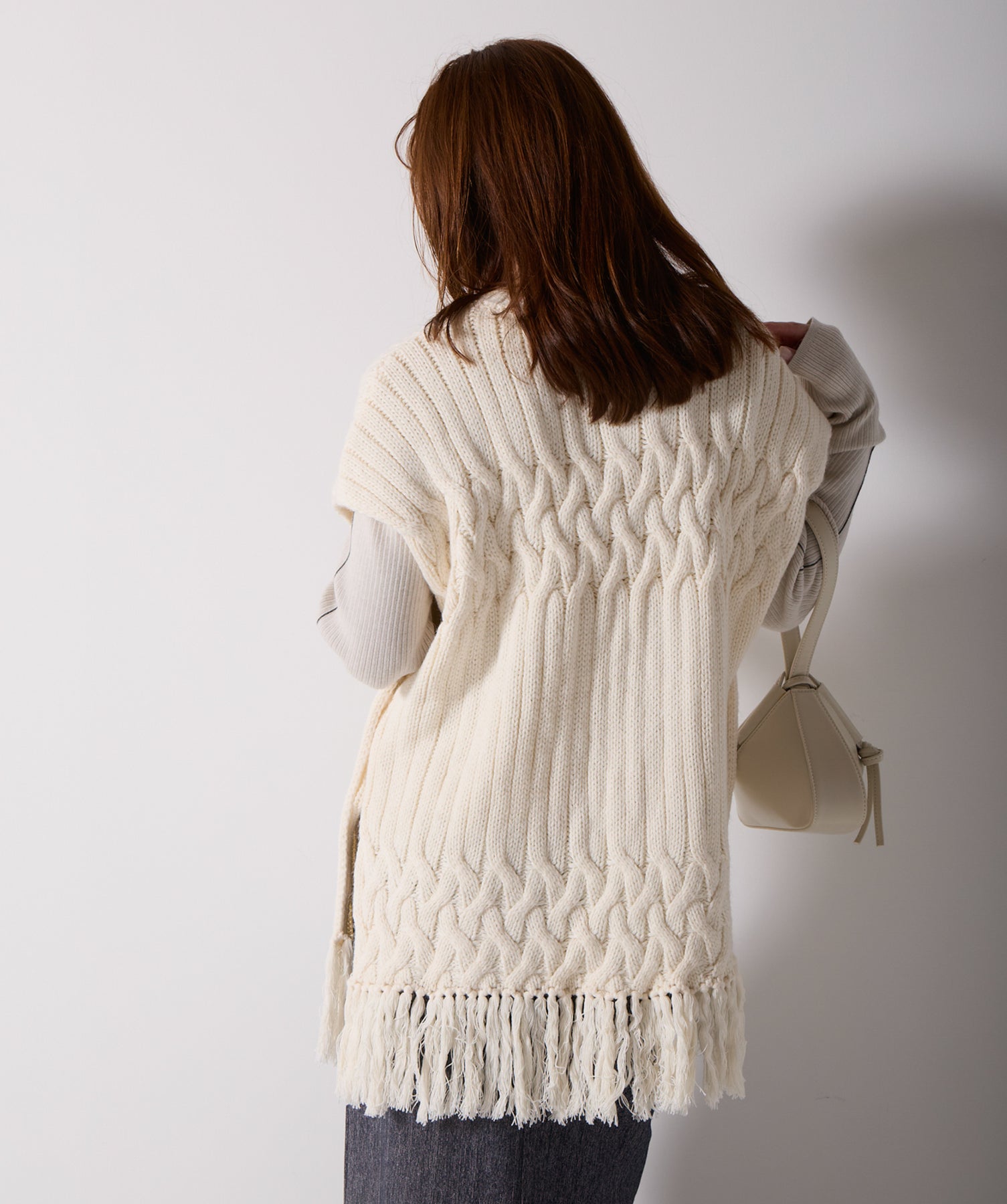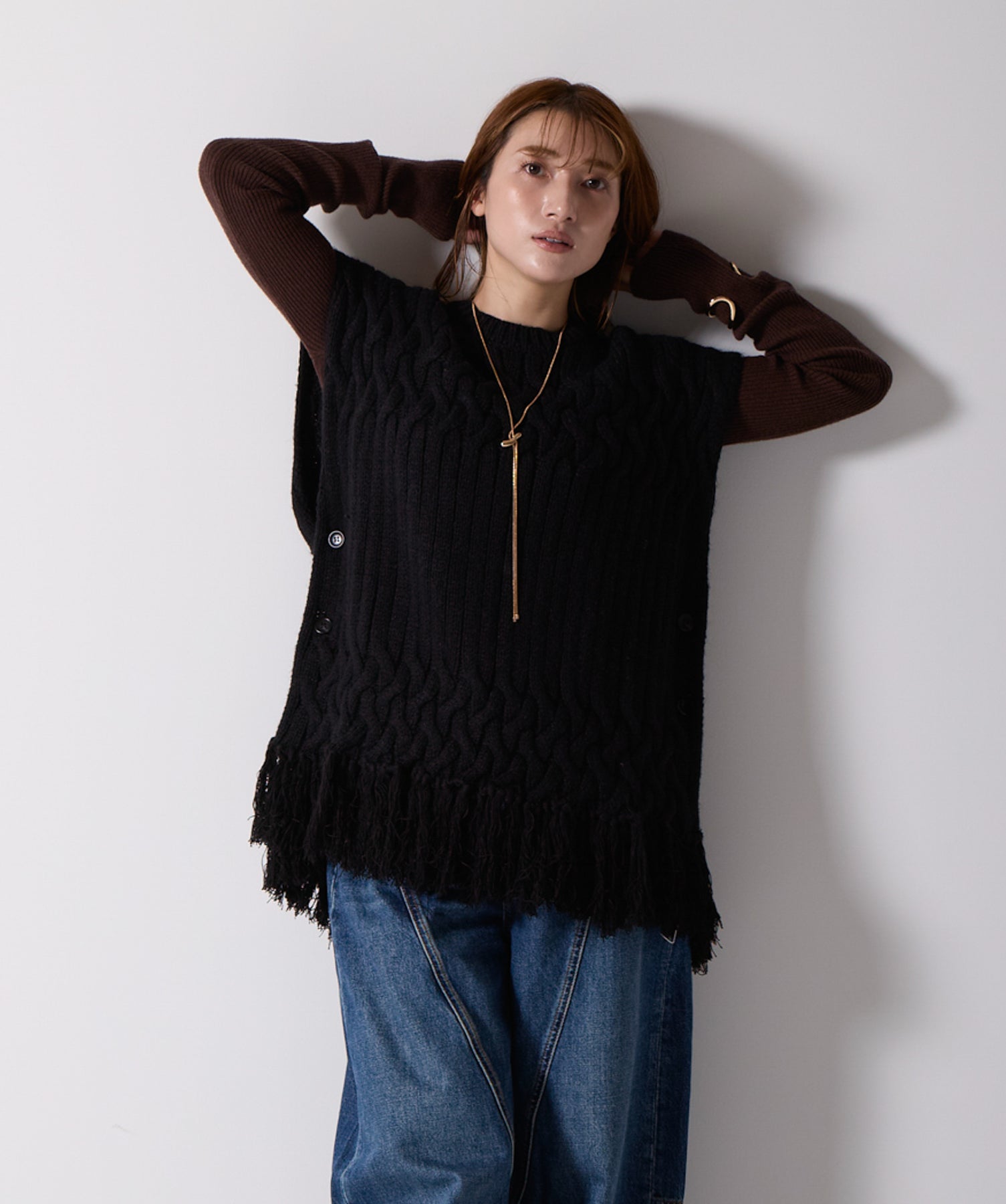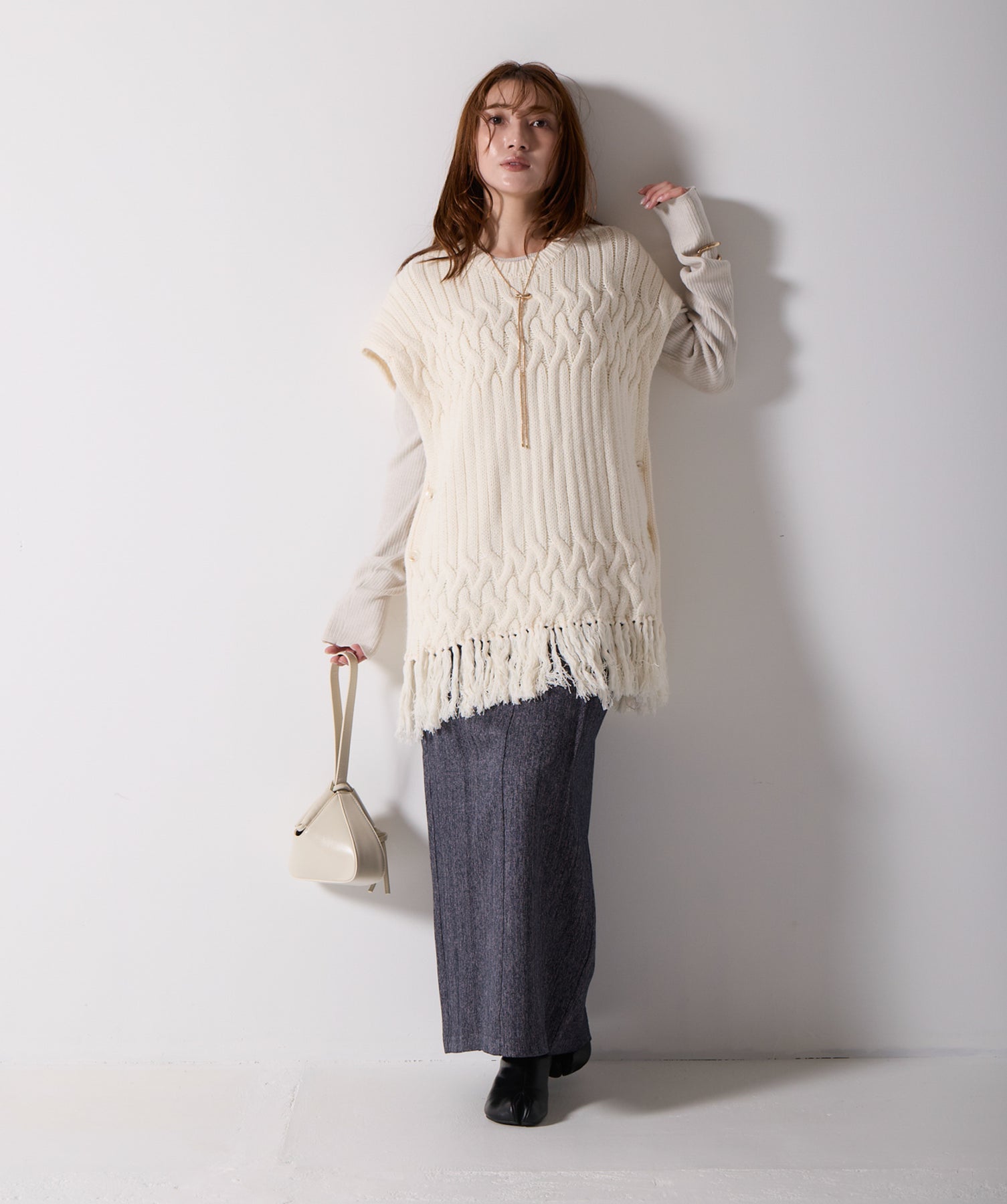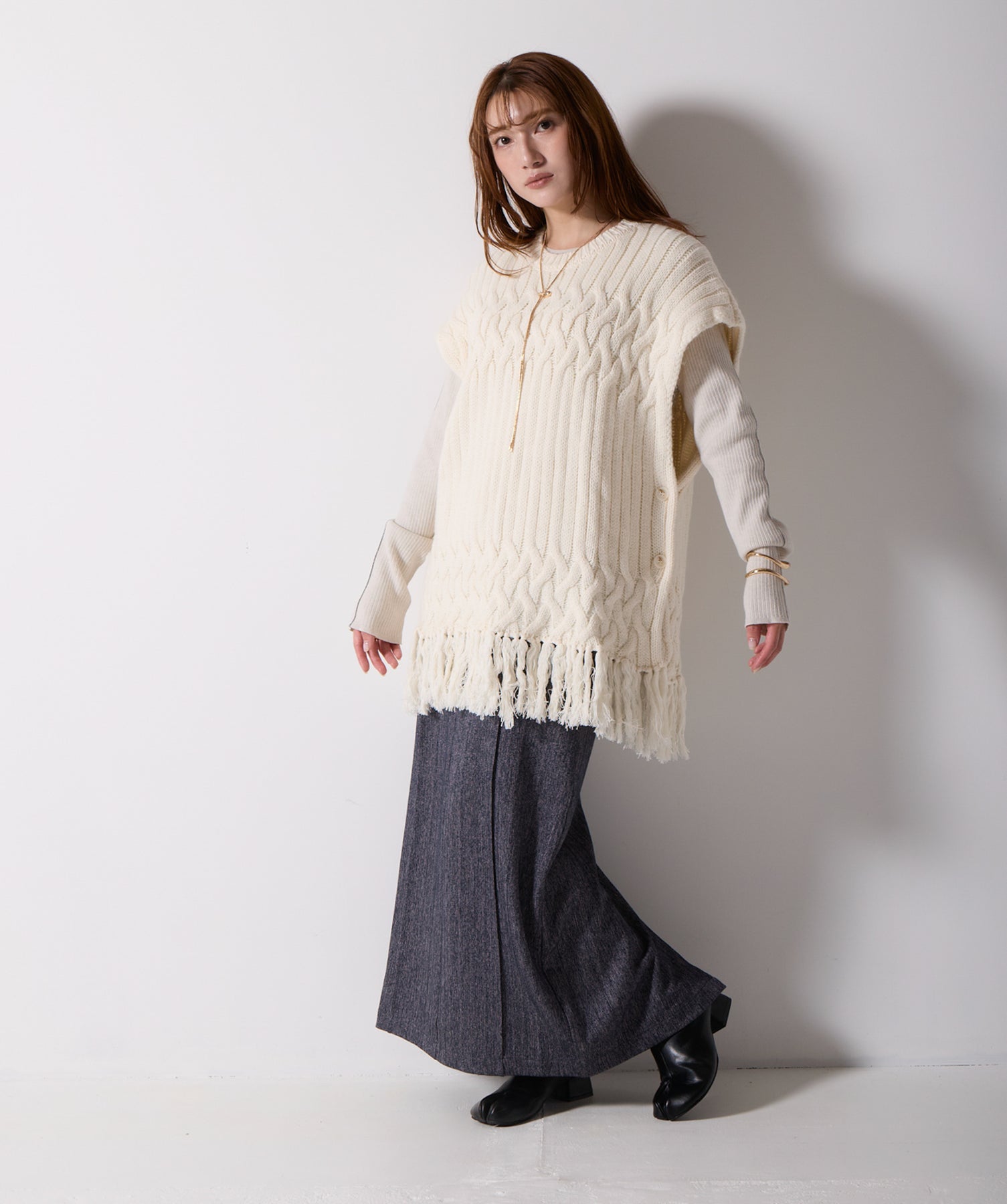立体感と動きをまとう、主役級ニットベスト。-material- ローゲージで編み立てたケーブルニットは、存在感のある凹凸が特徴。ふっくらとした厚みとやわらかなタッチがボディラインを拾いすぎず、快適な着心地を叶えます。裾の大胆なフリンジがニュアンスを加え、動くたびに揺れるディテールが視線を惹きつけます。-design- 肩を覆うフレンチスリーブとロング丈のバランスが絶妙で、レイヤードするだけでこなれ感のあるスタイルに仕上がります。フロント両サイドにはボタン付きのスリットが施されており、シルエットに表情を持たせながらインナーとの組み合わせも自在に。甘さを抑えたフォルムとテクスチャーが、大人のカジュアルにモードなエッセンスを加えます。・素材:綿60% アクリル40%