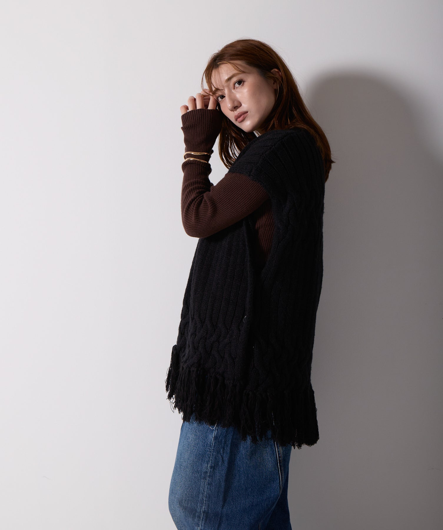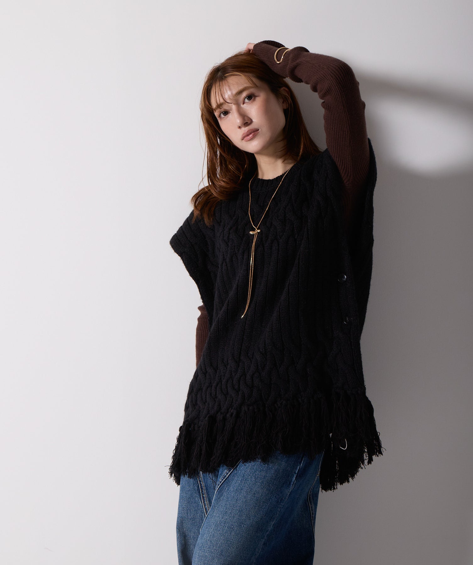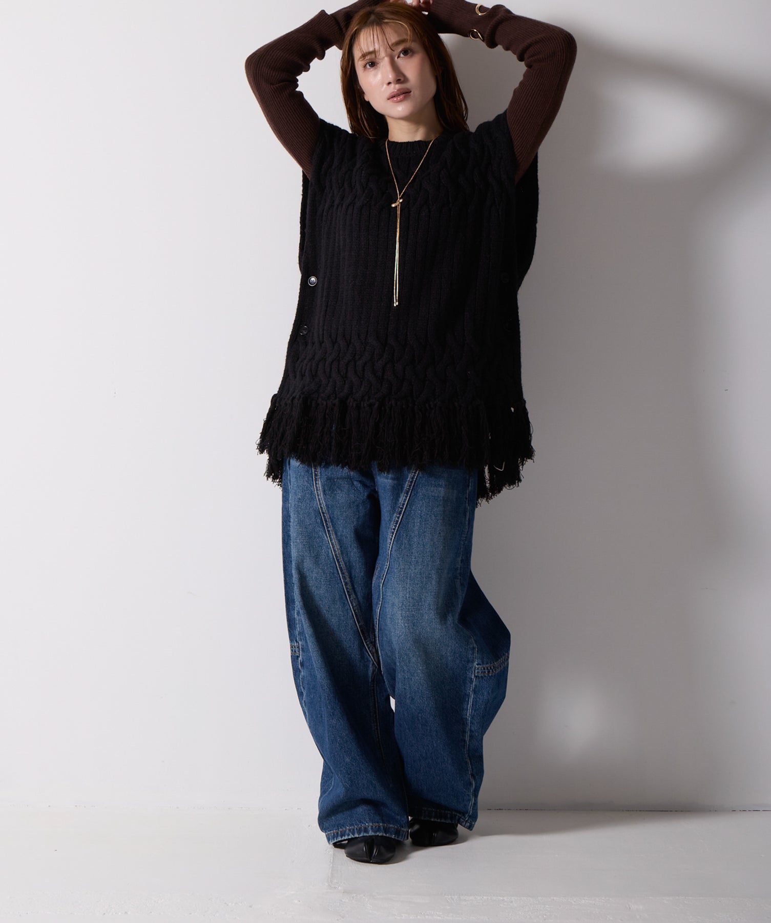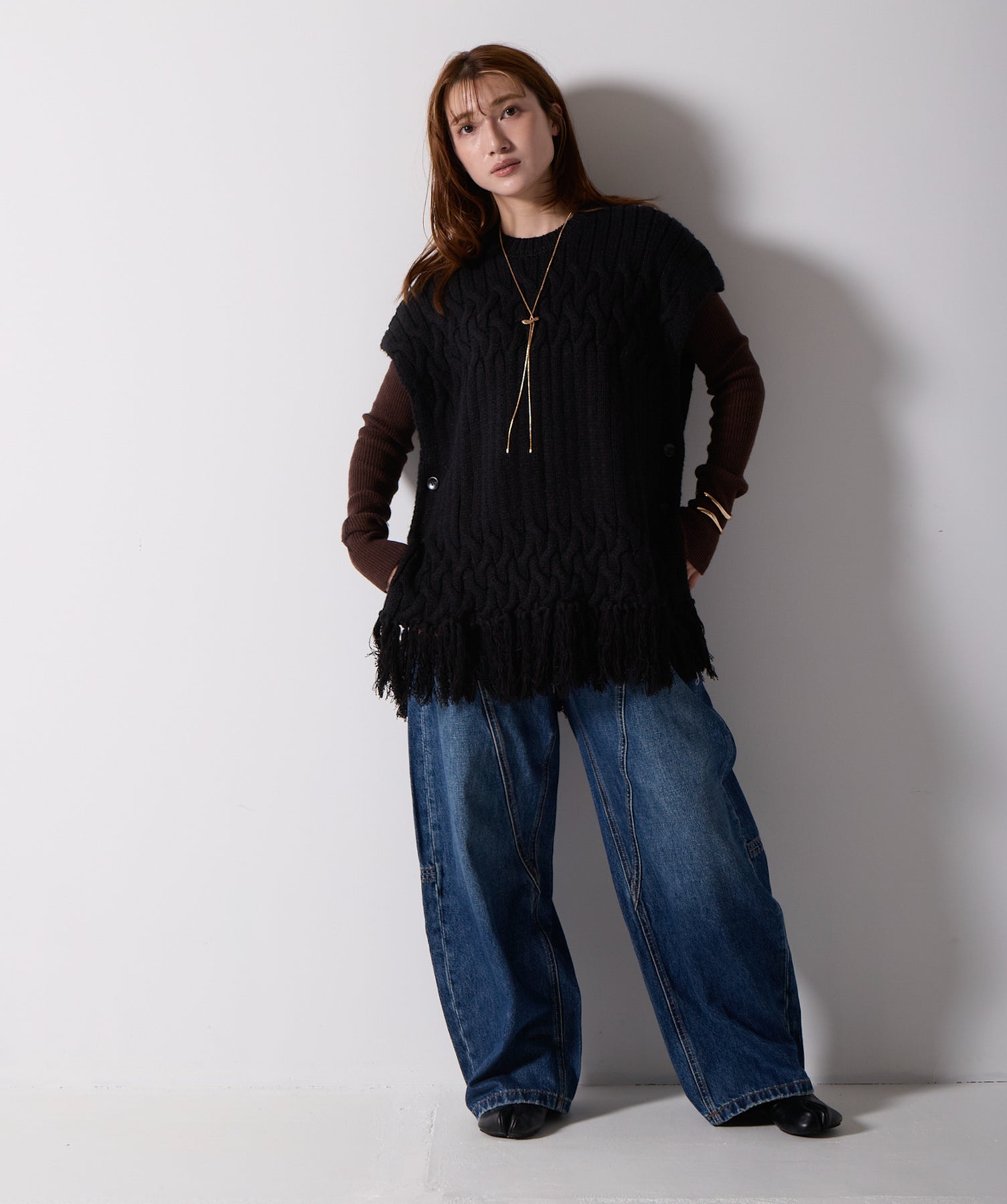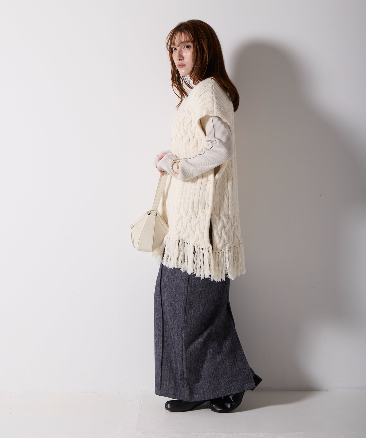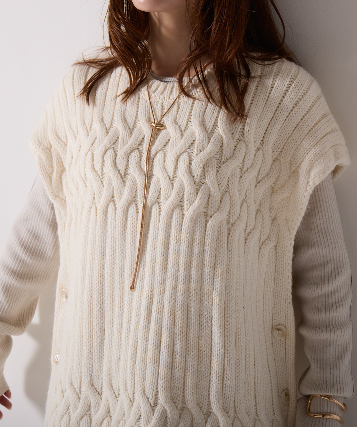 立体感と動きをまとう、主役級ニットベスト。-material- ローゲージで編み立てたケーブルニットは、存在感のある凹凸が特徴。ふっくらとした厚みとやわらかなタッチがボディラインを拾いすぎず、快適な着心地を叶えます。裾の大胆なフリンジがニュアンスを加え、動くたびに揺れるディテールが視線を惹きつけます。-design- 肩を覆うフレンチスリーブとロング丈のバランスが絶妙で、レイヤードするだけでこなれ感のあるスタイルに仕上がります。フロント両サイドにはボタン付きのスリットが施されており、シルエットに表情を持たせながらインナーとの組み合わせも自在に。甘さを抑えたフォルムとテクスチャーが、大人のカジュアルにモードなエッセンスを加えます。・素材:綿60% アクリル40%