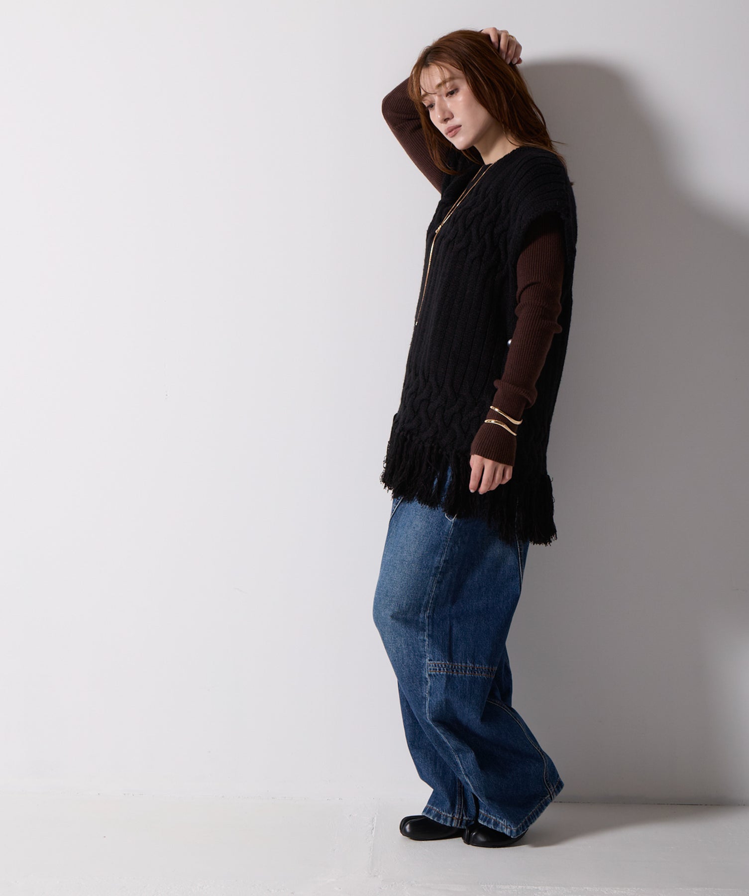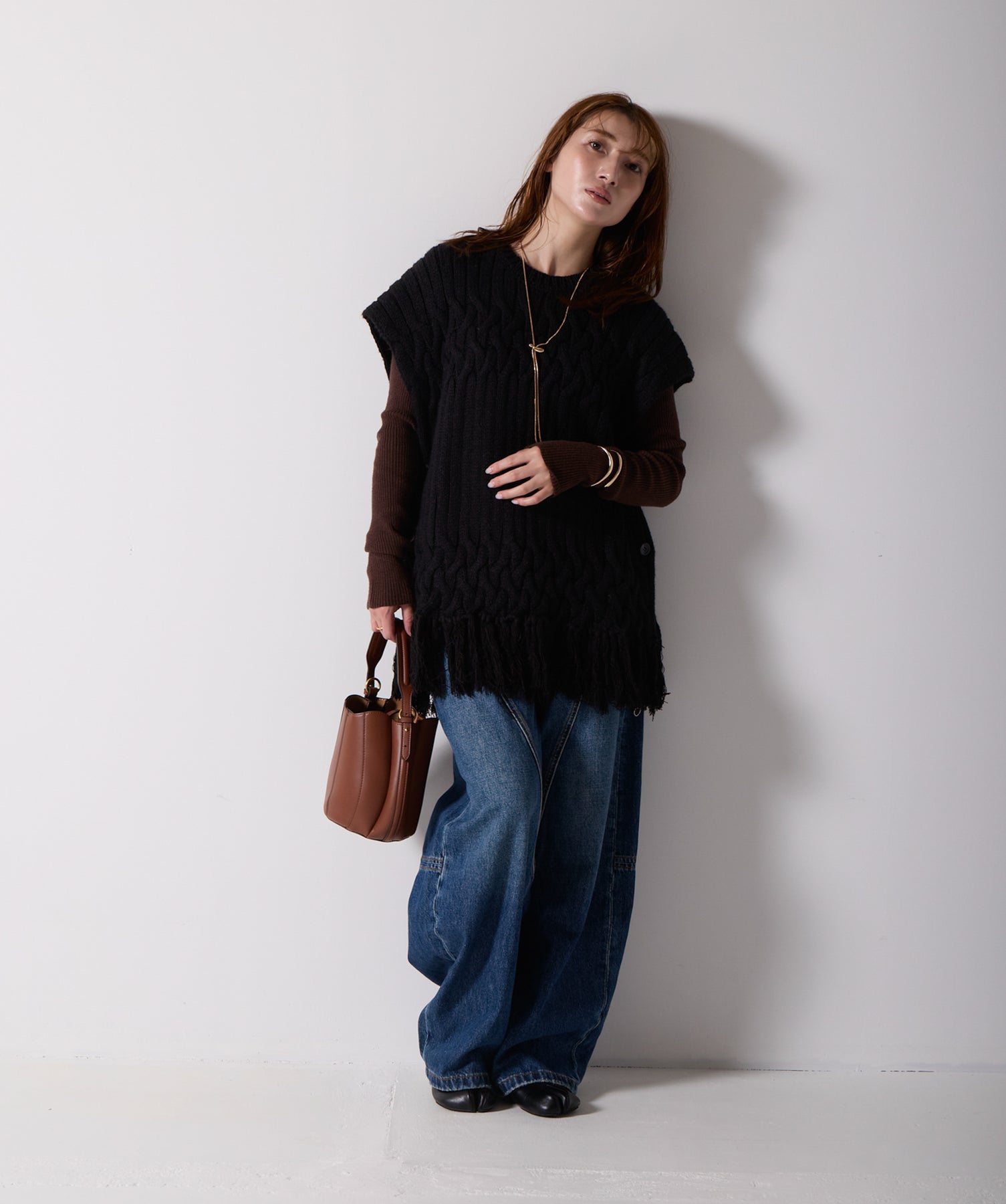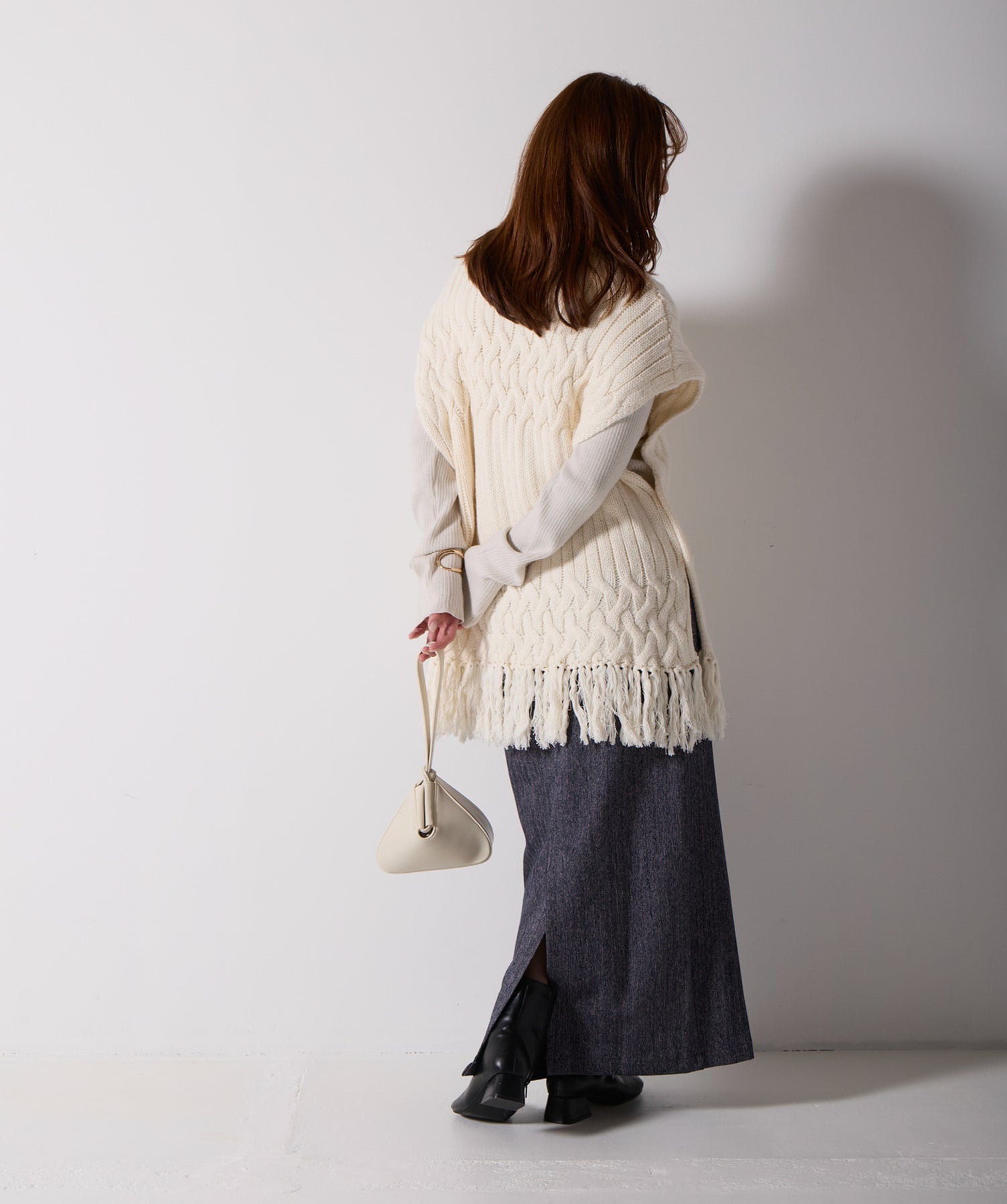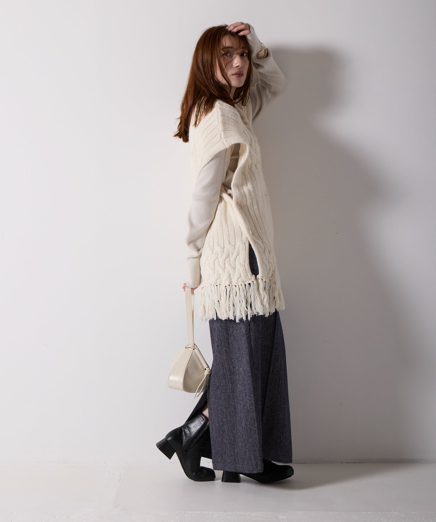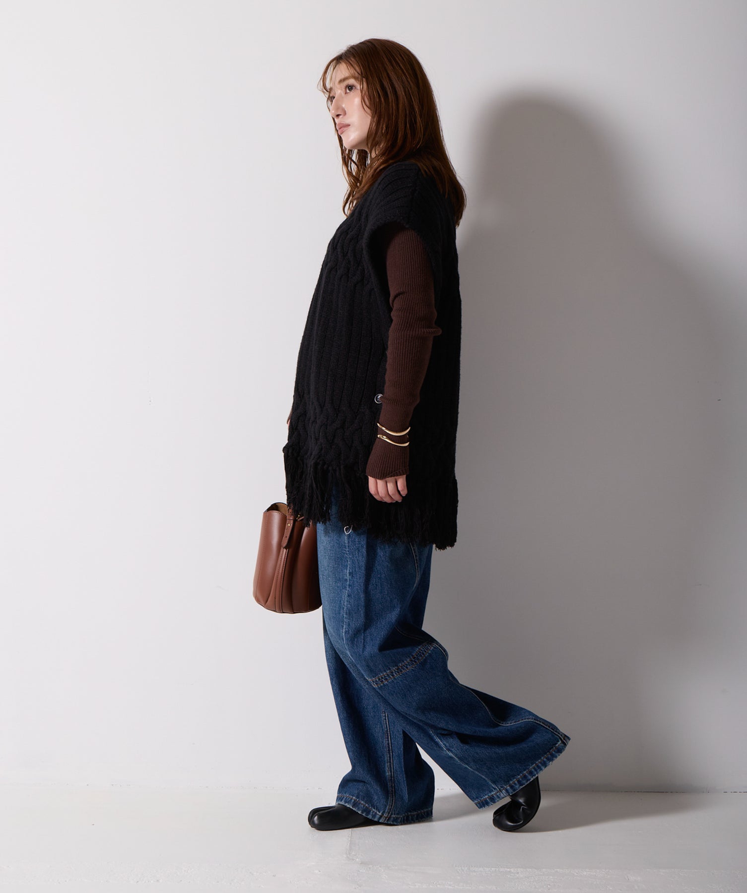 立体感と動きをまとう、主役級ニットベスト。-material- ローゲージで編み立てたケーブルニットは、存在感のある凹凸が特徴。ふっくらとした厚みとやわらかなタッチがボディラインを拾いすぎず、快適な着心地を叶えます。裾の大胆なフリンジがニュアンスを加え、動くたびに揺れるディテールが視線を惹きつけます。-design- 肩を覆うフレンチスリーブとロング丈のバランスが絶妙で、レイヤードするだけでこなれ感のあるスタイルに仕上がります。フロント両サイドにはボタン付きのスリットが施されており、シルエットに表情を持たせながらインナーとの組み合わせも自在に。甘さを抑えたフォルムとテクスチャーが、大人のカジュアルにモードなエッセンスを加えます。・素材:綿60% アクリル40%