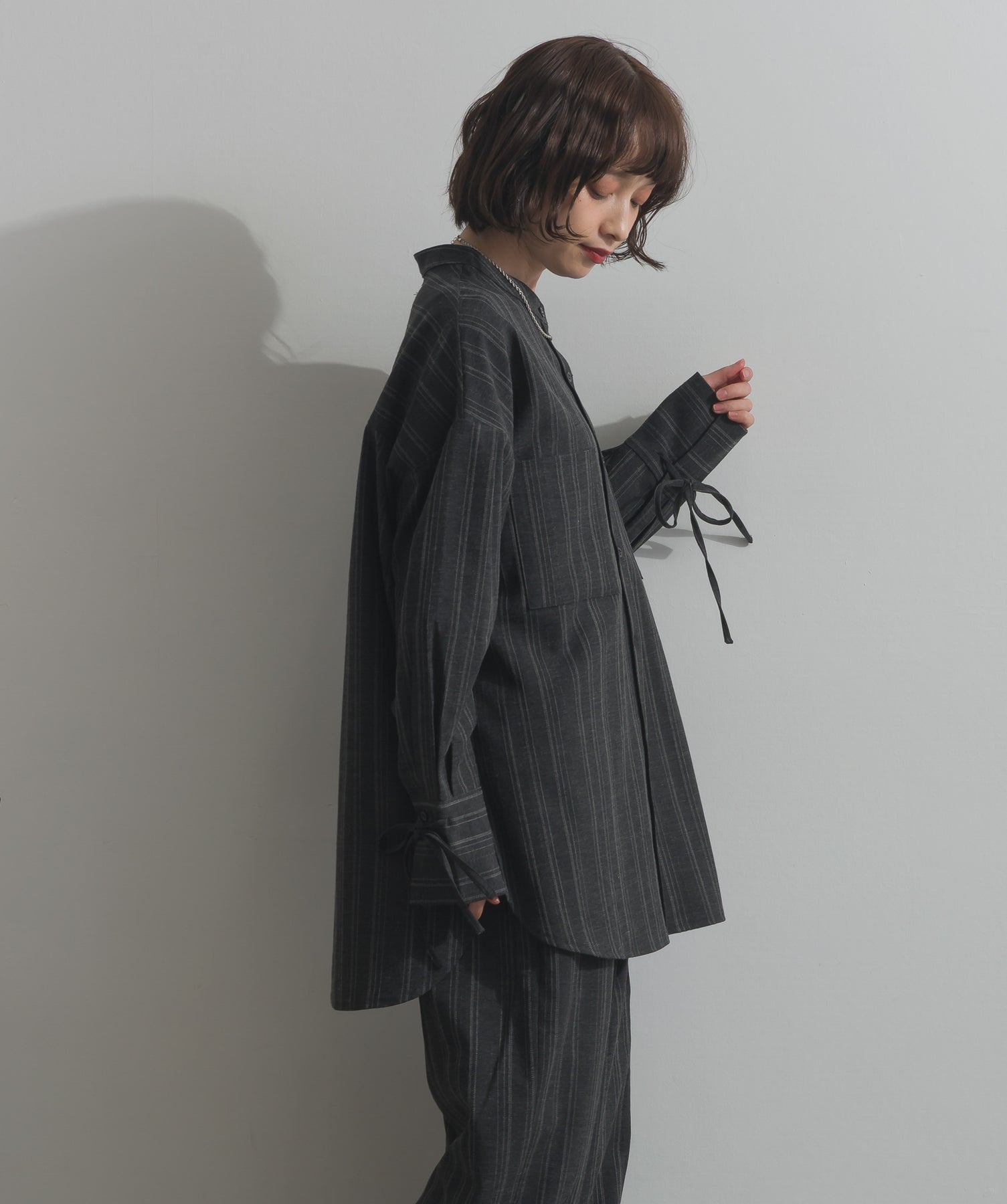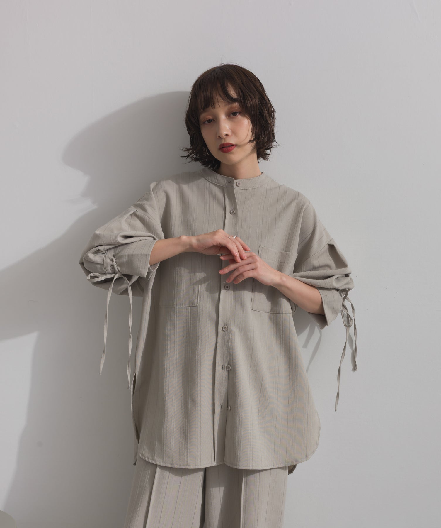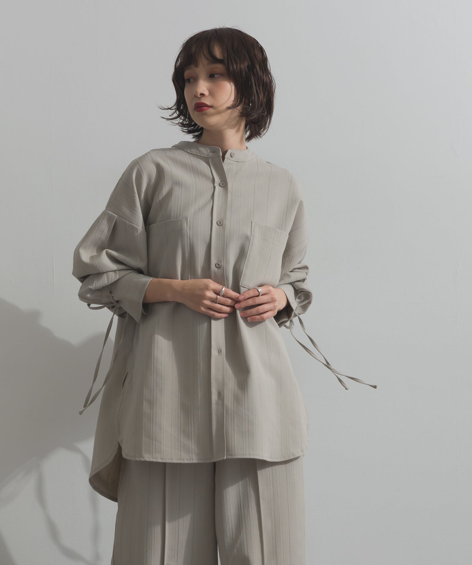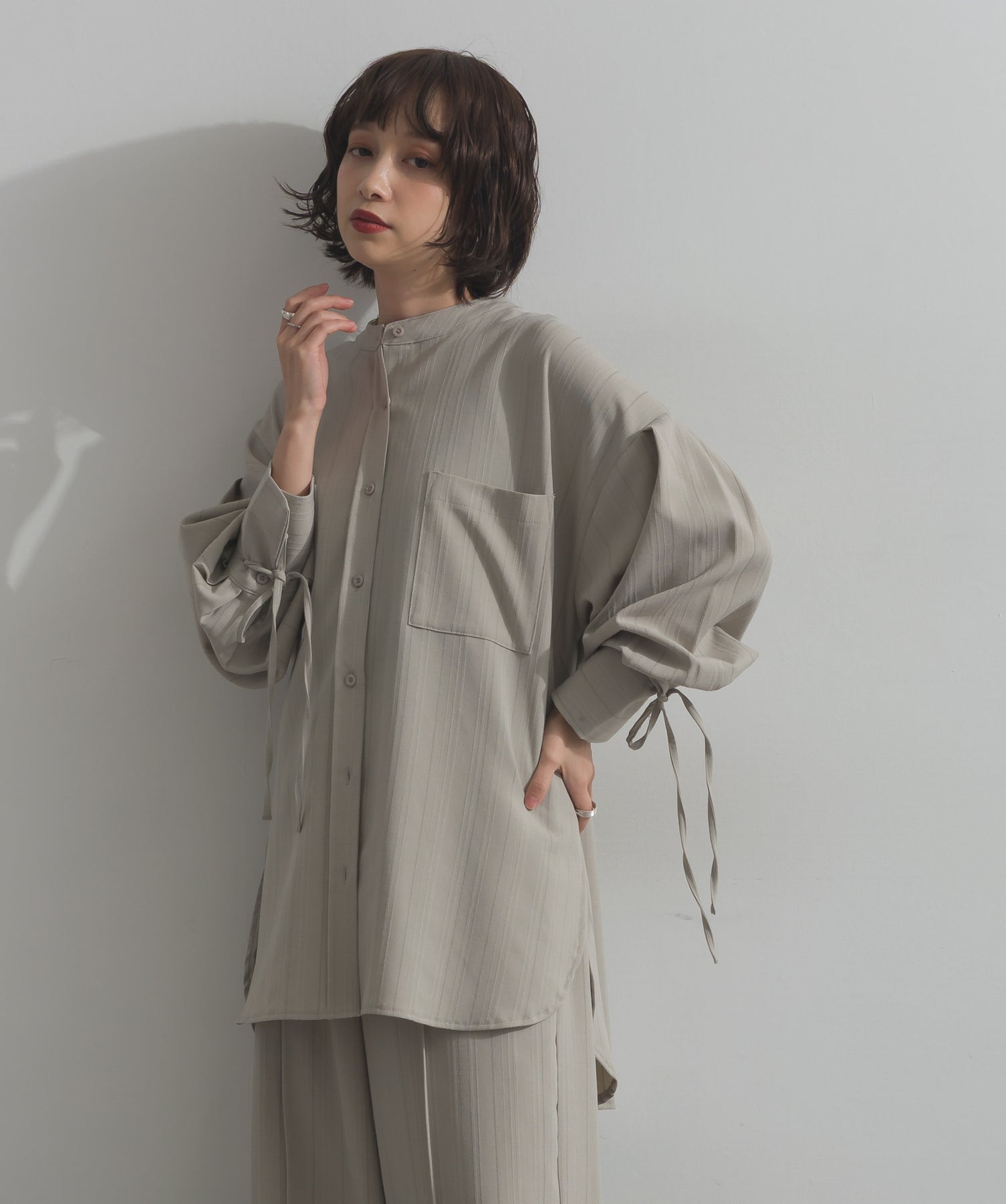 エフォートレスな存在感。洗練シルエットのバンドカラーシャツ-material-軽やかな着心地のポリエステル混素材を採用。落ち感のあるしなやかな風合いで、オンオフ問わず着回せる上質な一枚に。縦ラインを強調するさりげないストライプ柄がスタイルアップを後押し。-design-メンズライクなムードを引き立てるバンドカラーデザイン。ヒップにかかるロング丈とワイドな身幅がリラックス感を演出し、モード感ある佇まいに。袖口のドローストリング仕様がアクセントになり、袖のボリューム調整も自在。前後差をつけた裾のカーブラインが軽やかな抜け感を添え、羽織りとしても活躍します。セットアップ対応のパンツと合わせれば、統一感のある洗練スタイルが完成。