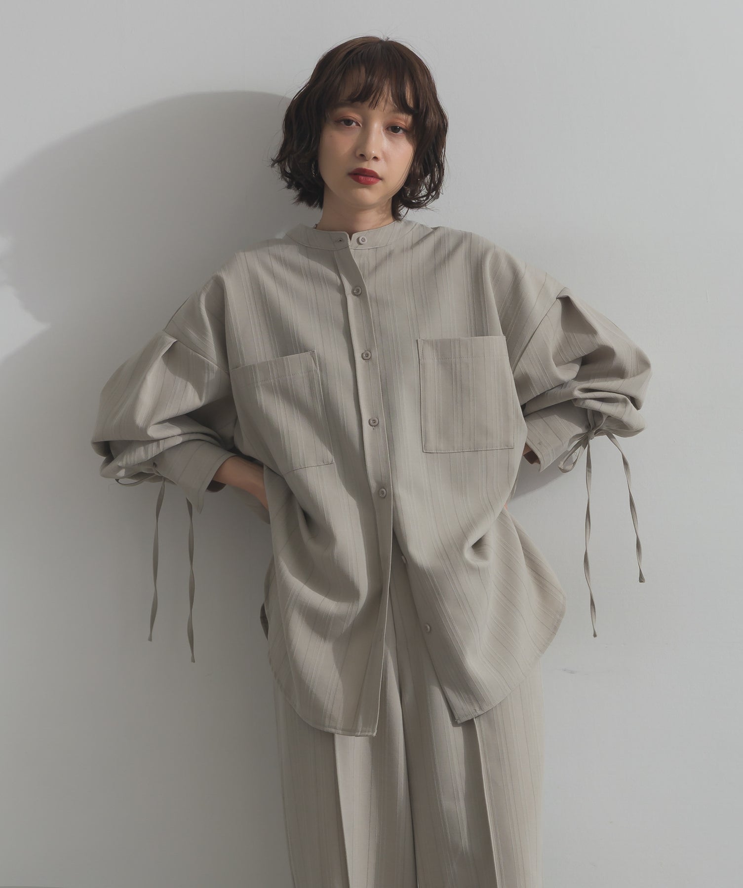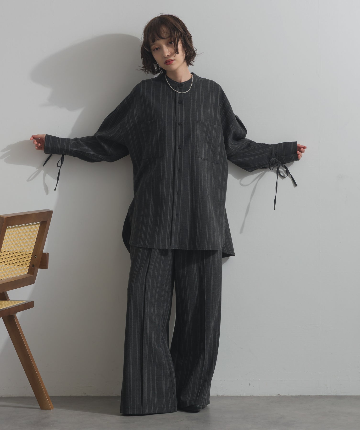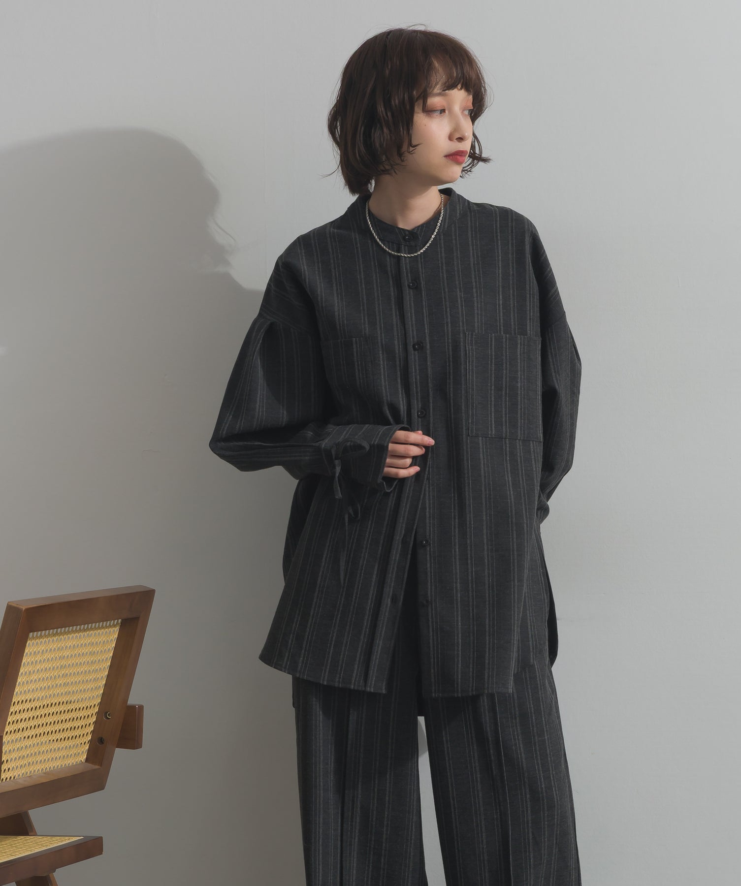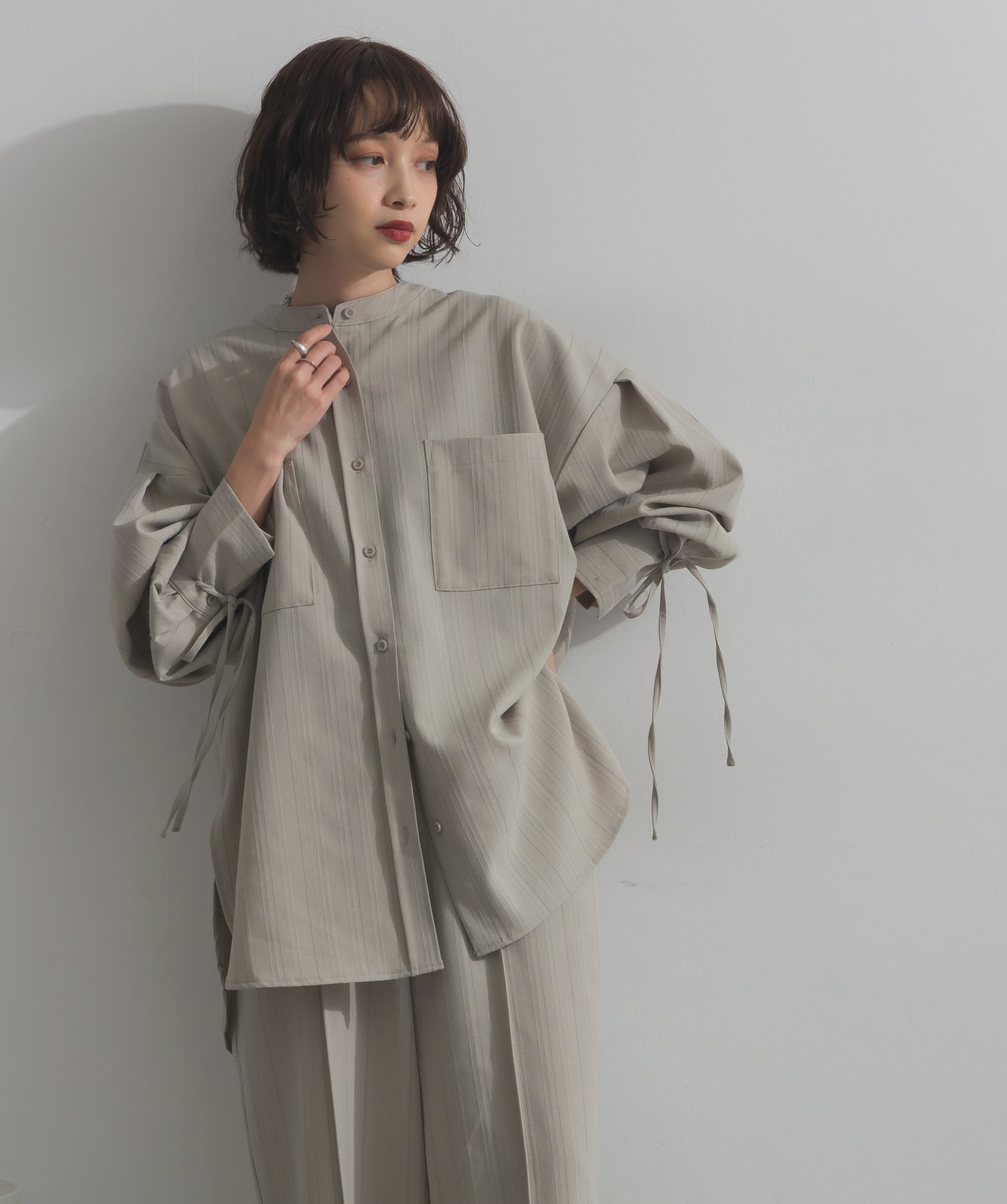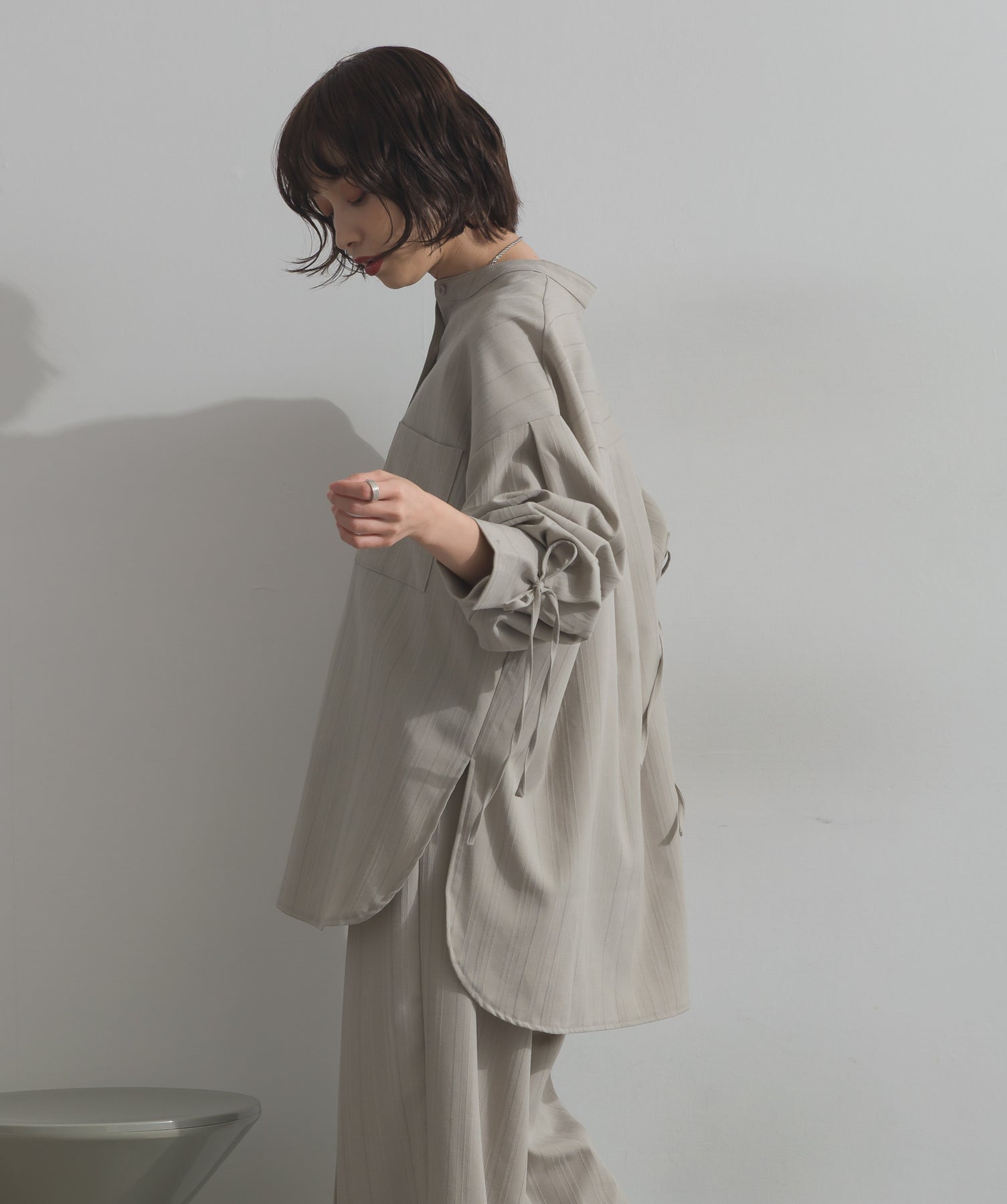エフォートレスな存在感。洗練シルエットのバンドカラーシャツ-material-軽やかな着心地のポリエステル混素材を採用。落ち感のあるしなやかな風合いで、オンオフ問わず着回せる上質な一枚に。縦ラインを強調するさりげないストライプ柄がスタイルアップを後押し。-design-メンズライクなムードを引き立てるバンドカラーデザイン。ヒップにかかるロング丈とワイドな身幅がリラックス感を演出し、モード感ある佇まいに。袖口のドローストリング仕様がアクセントになり、袖のボリューム調整も自在。前後差をつけた裾のカーブラインが軽やかな抜け感を添え、羽織りとしても活躍します。セットアップ対応のパンツと合わせれば、統一感のある洗練スタイルが完成。