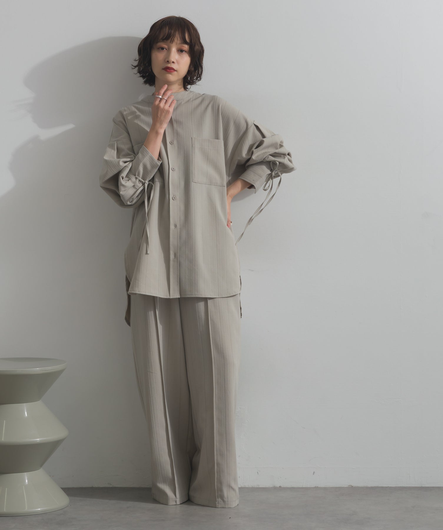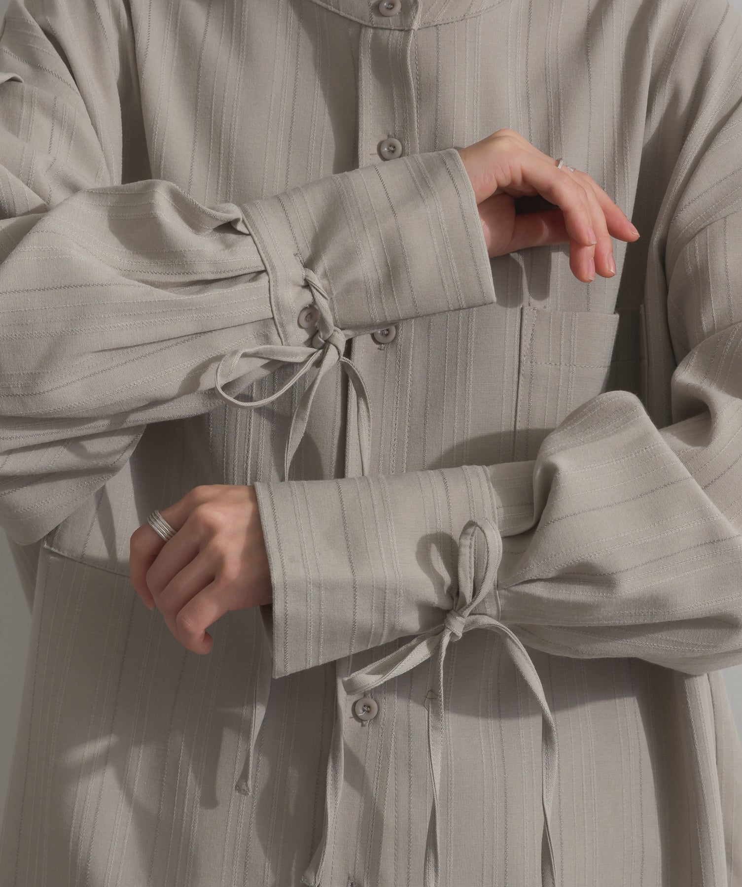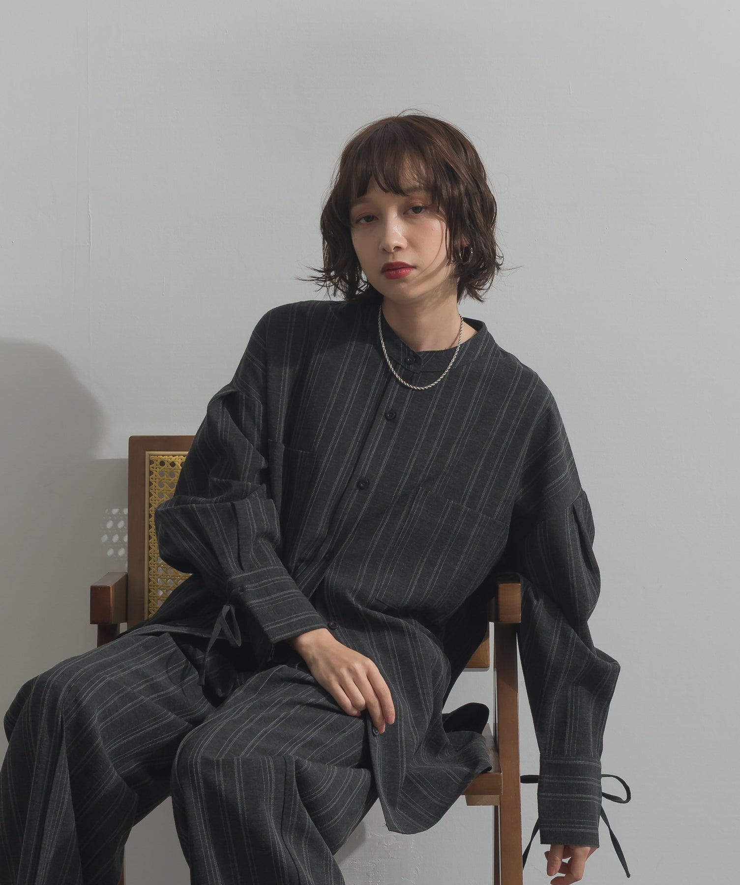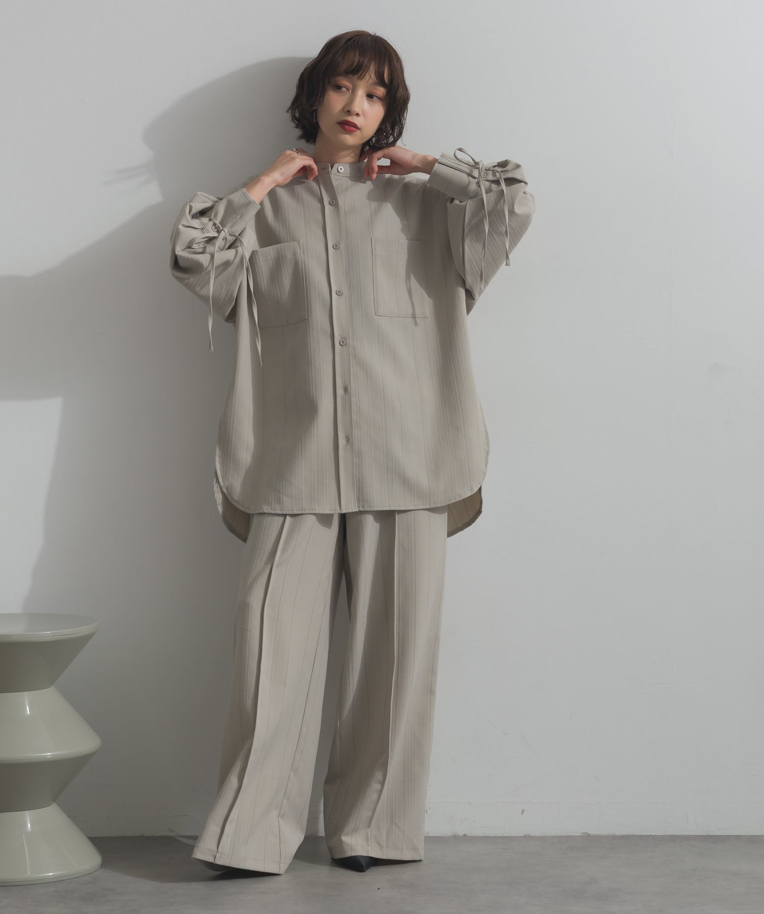 エフォートレスな存在感。洗練シルエットのバンドカラーシャツ-material-軽やかな着心地のポリエステル混素材を採用。落ち感のあるしなやかな風合いで、オンオフ問わず着回せる上質な一枚に。縦ラインを強調するさりげないストライプ柄がスタイルアップを後押し。-design-メンズライクなムードを引き立てるバンドカラーデザイン。ヒップにかかるロング丈とワイドな身幅がリラックス感を演出し、モード感ある佇まいに。袖口のドローストリング仕様がアクセントになり、袖のボリューム調整も自在。前後差をつけた裾のカーブラインが軽やかな抜け感を添え、羽織りとしても活躍します。セットアップ対応のパンツと合わせれば、統一感のある洗練スタイルが完成。