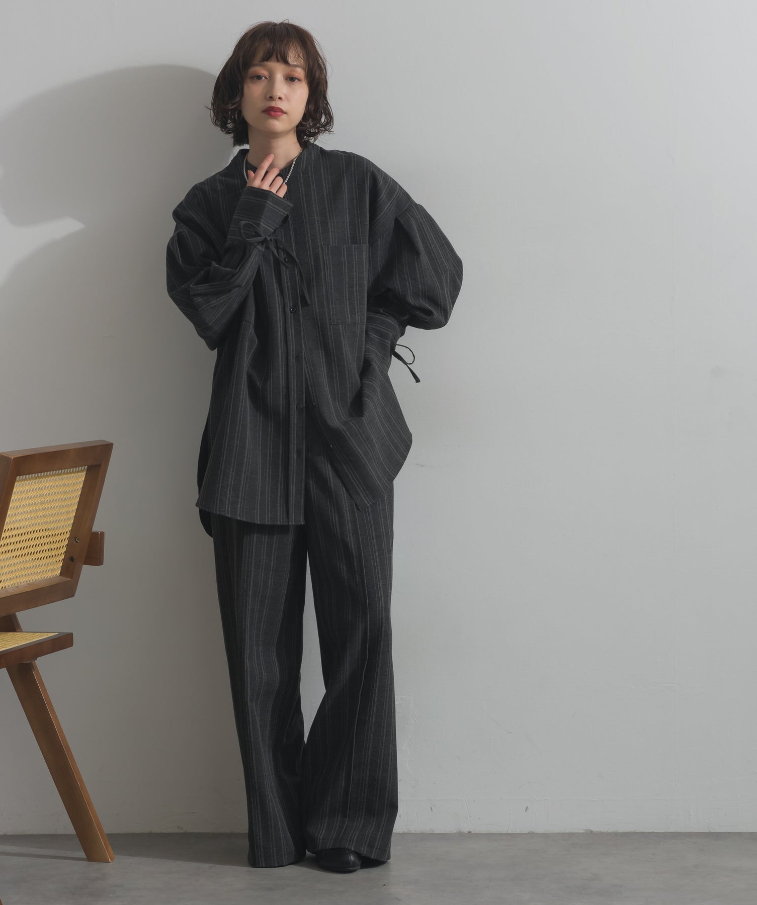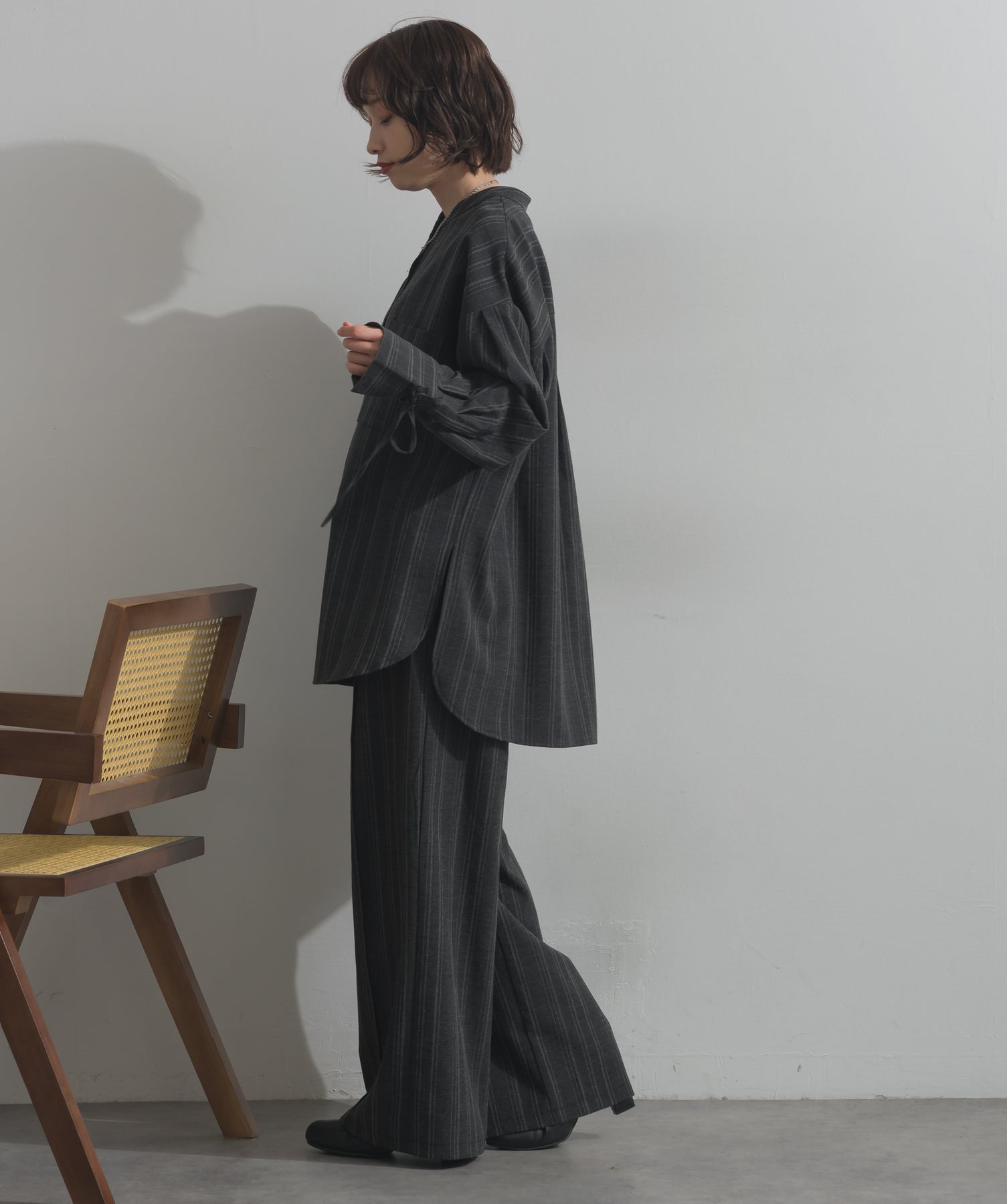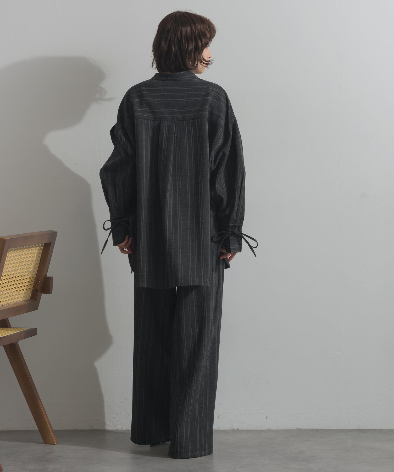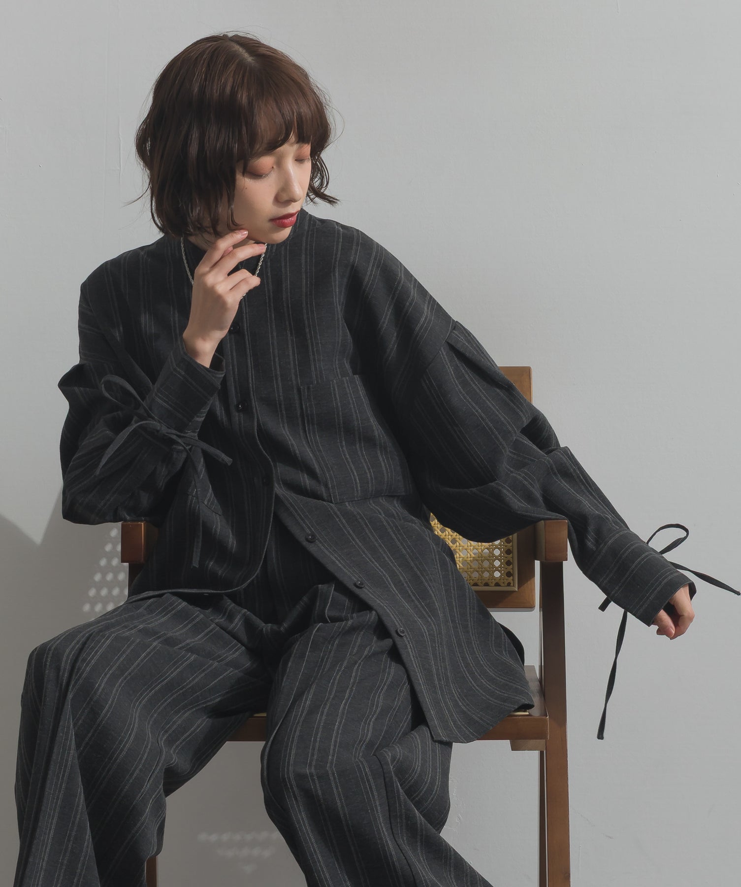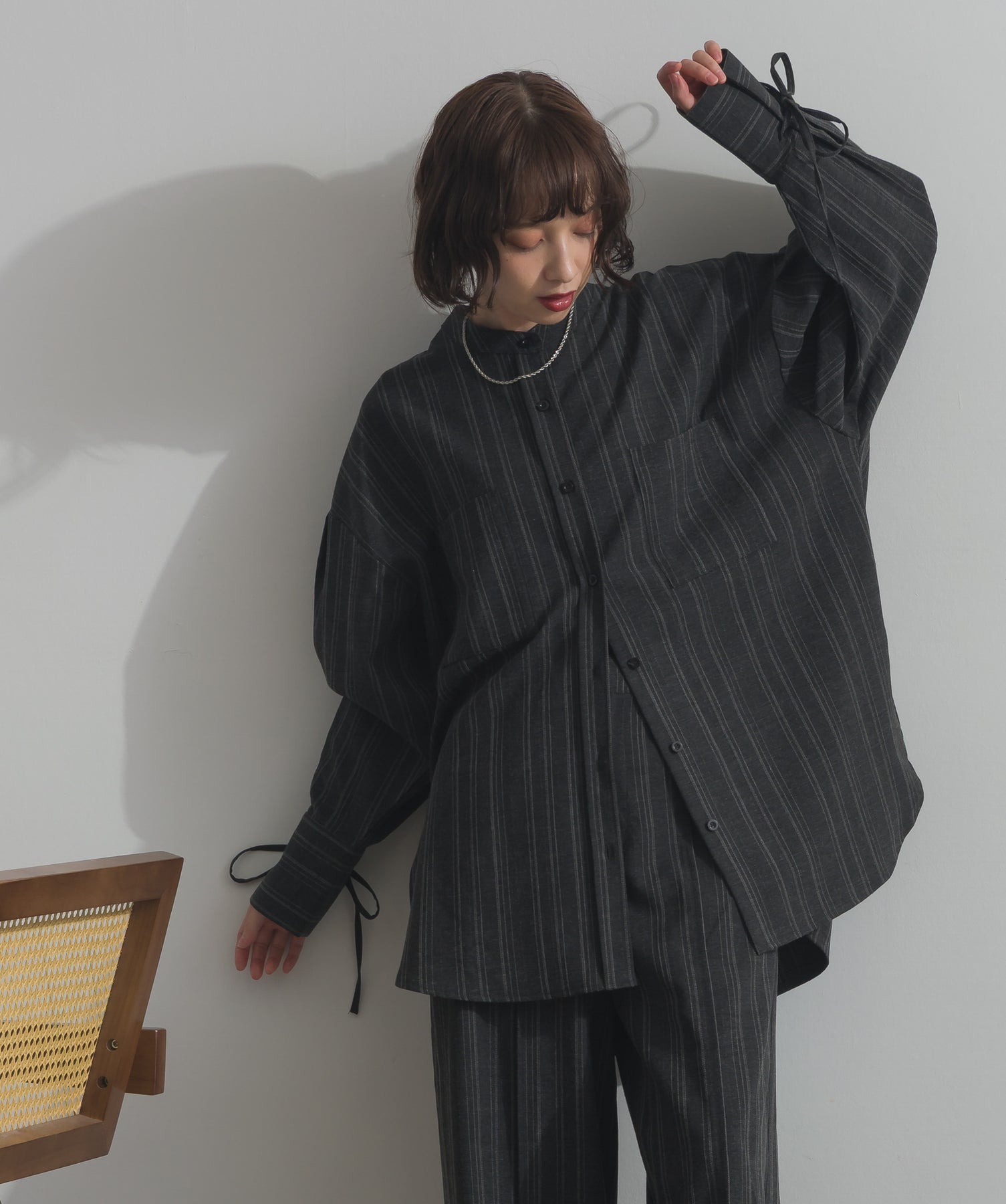エフォートレスな存在感。洗練シルエットのバンドカラーシャツ-material-軽やかな着心地のポリエステル混素材を採用。落ち感のあるしなやかな風合いで、オンオフ問わず着回せる上質な一枚に。縦ラインを強調するさりげないストライプ柄がスタイルアップを後押し。-design-メンズライクなムードを引き立てるバンドカラーデザイン。ヒップにかかるロング丈とワイドな身幅がリラックス感を演出し、モード感ある佇まいに。袖口のドローストリング仕様がアクセントになり、袖のボリューム調整も自在。前後差をつけた裾のカーブラインが軽やかな抜け感を添え、羽織りとしても活躍します。セットアップ対応のパンツと合わせれば、統一感のある洗練スタイルが完成。