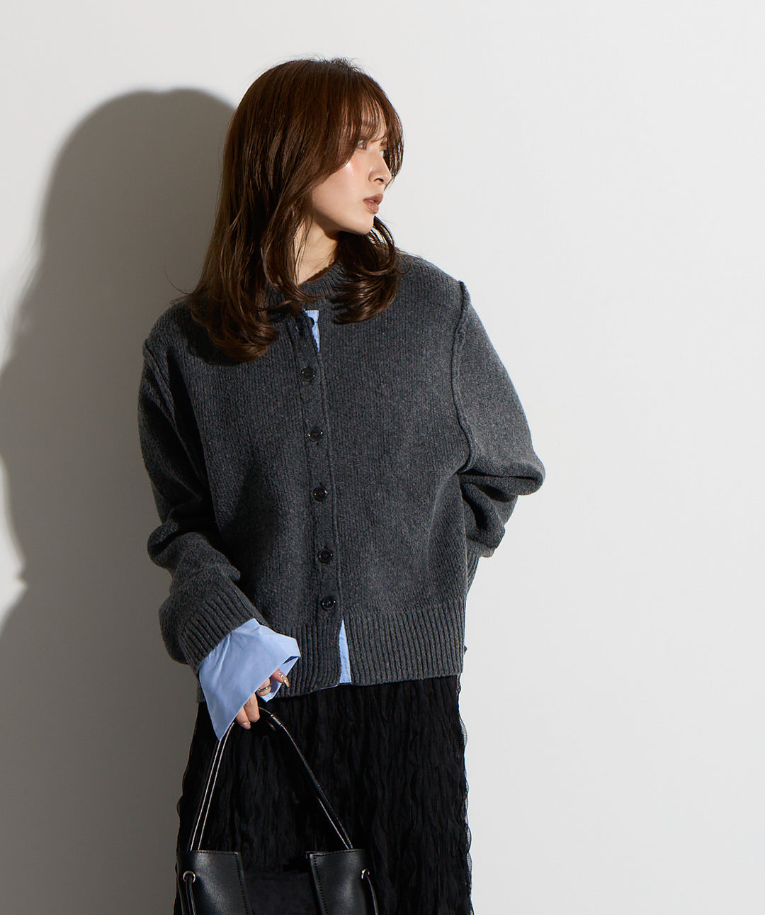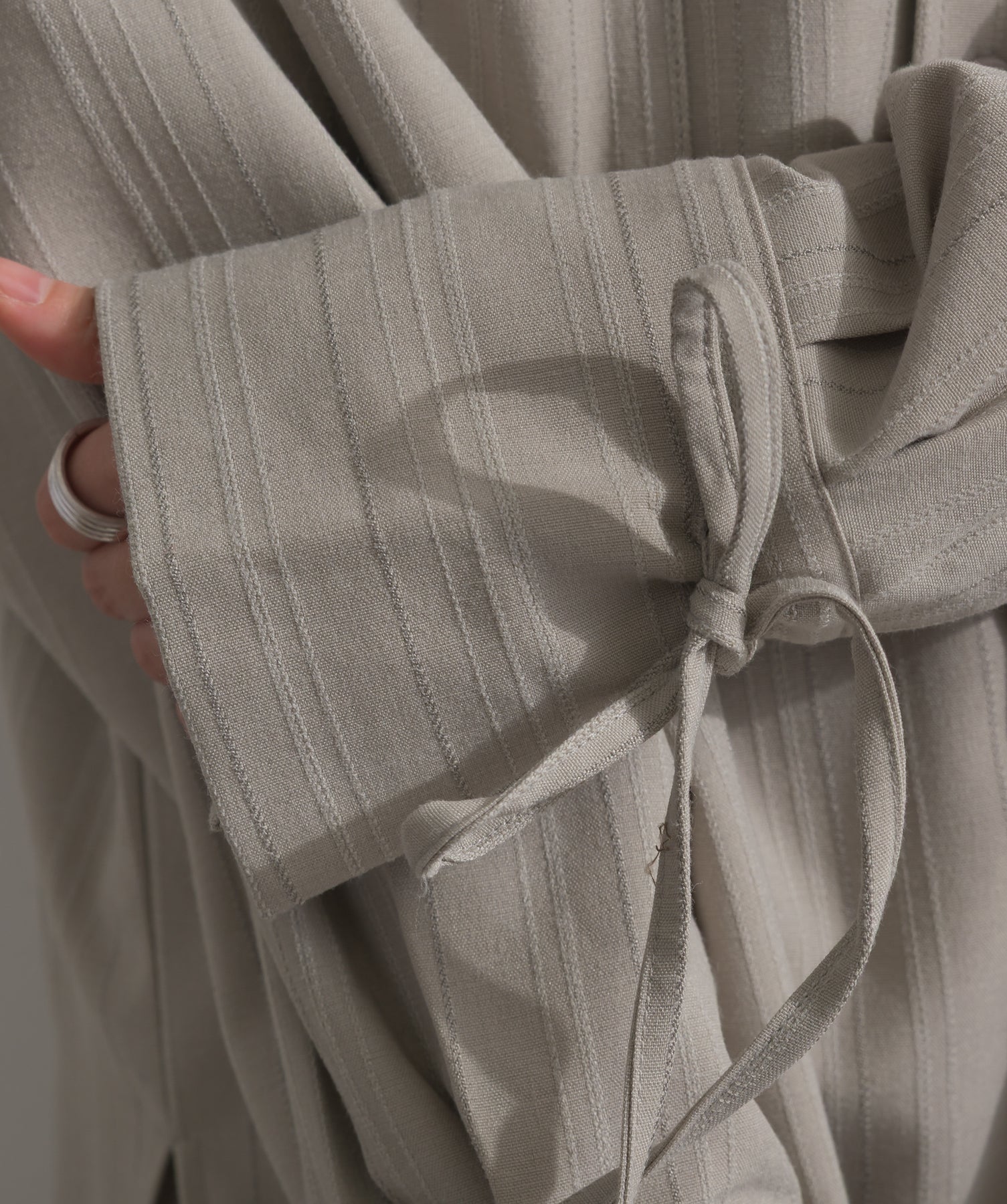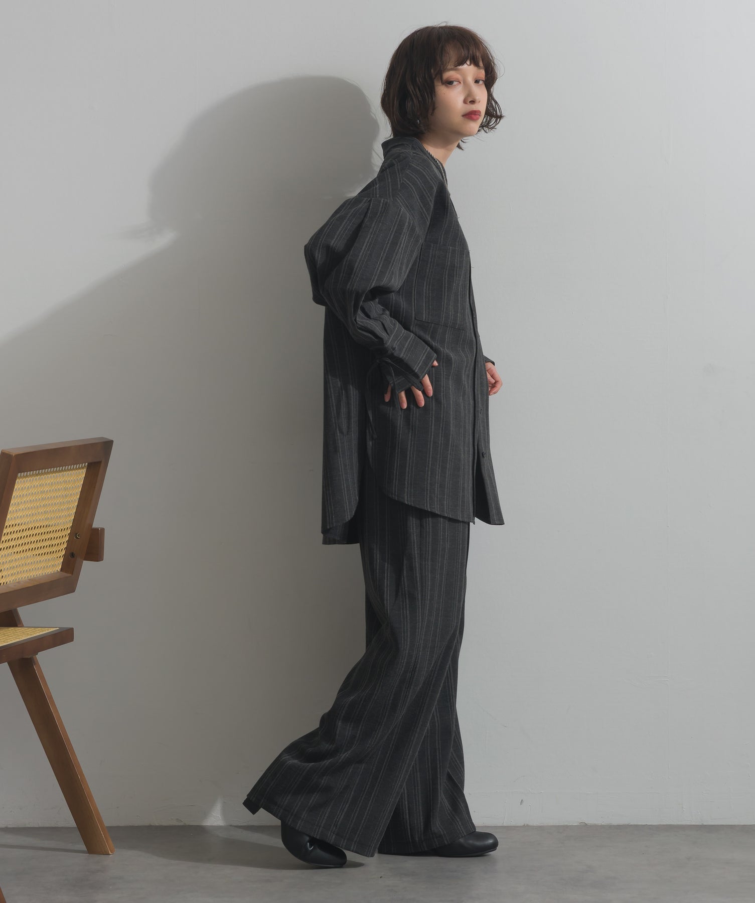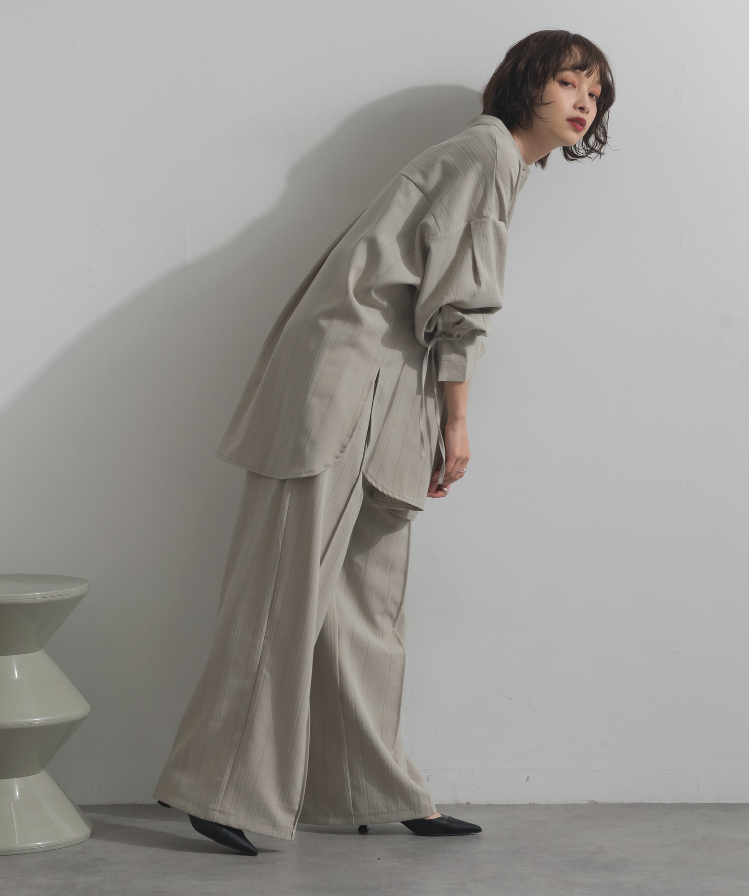 エフォートレスな存在感。洗練シルエットのバンドカラーシャツ-material-軽やかな着心地のポリエステル混素材を採用。落ち感のあるしなやかな風合いで、オンオフ問わず着回せる上質な一枚に。縦ラインを強調するさりげないストライプ柄がスタイルアップを後押し。-design-メンズライクなムードを引き立てるバンドカラーデザイン。ヒップにかかるロング丈とワイドな身幅がリラックス感を演出し、モード感ある佇まいに。袖口のドローストリング仕様がアクセントになり、袖のボリューム調整も自在。前後差をつけた裾のカーブラインが軽やかな抜け感を添え、羽織りとしても活躍します。セットアップ対応のパンツと合わせれば、統一感のある洗練スタイルが完成。