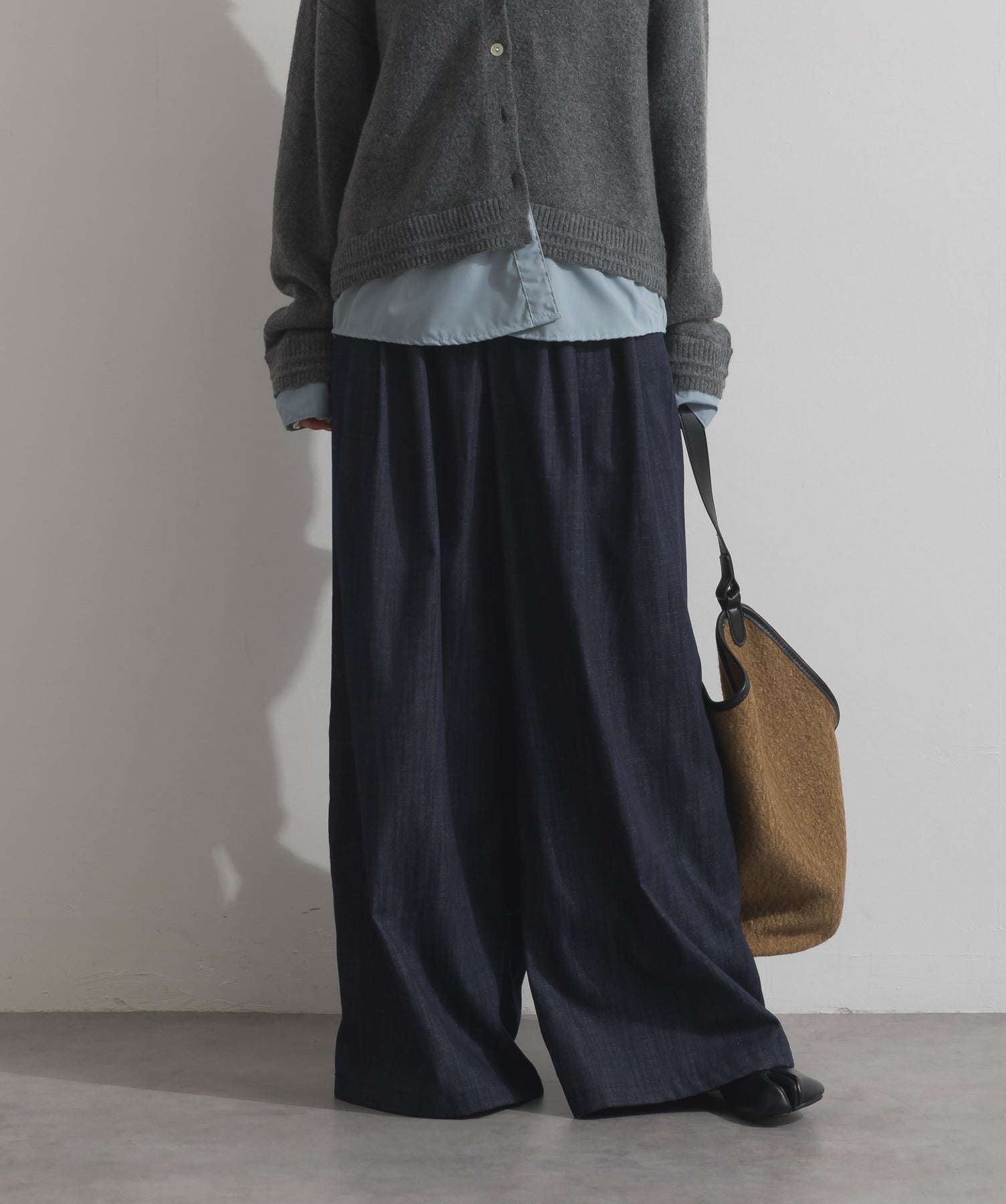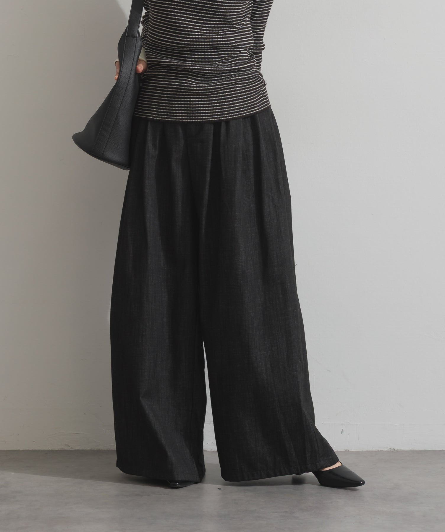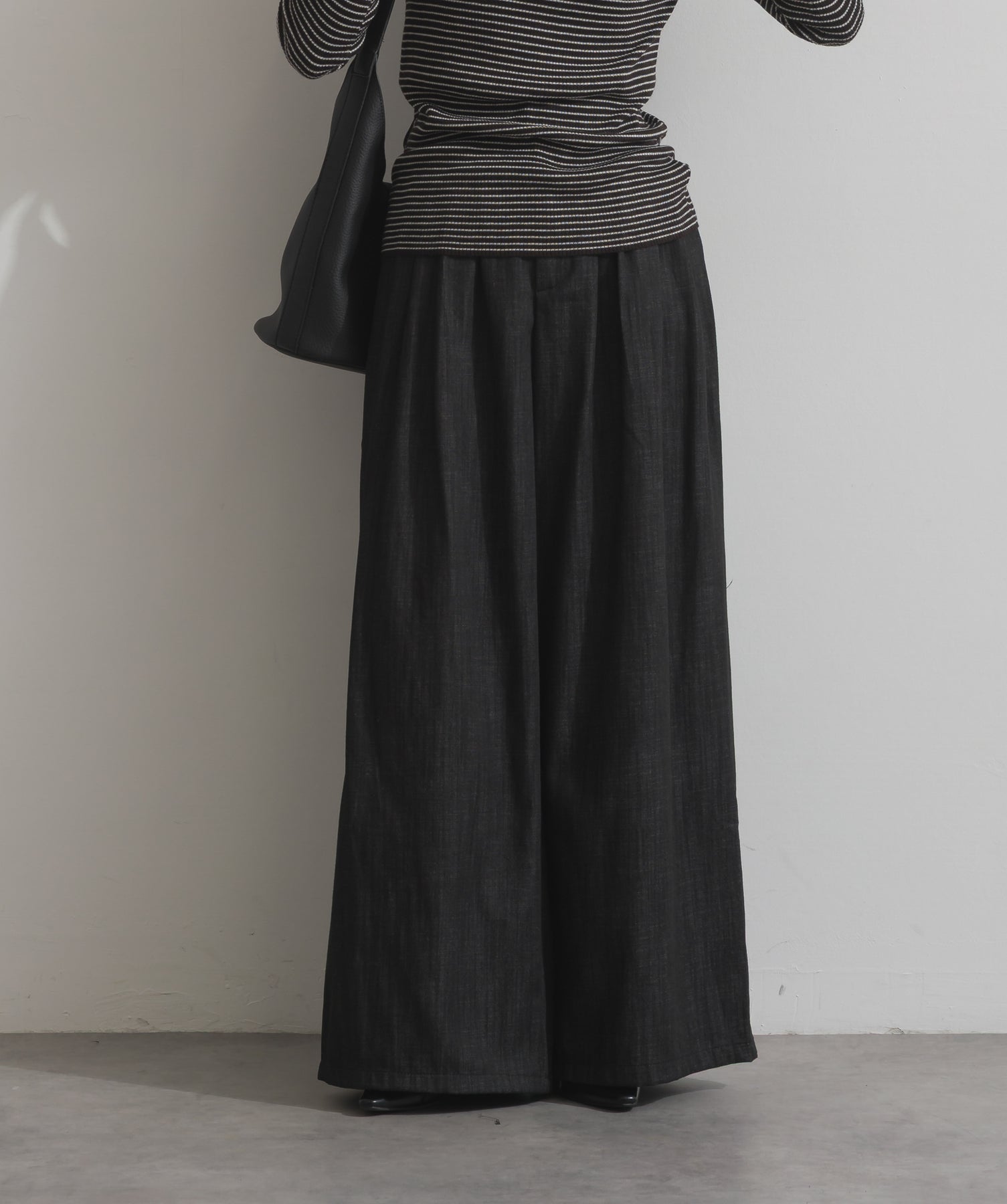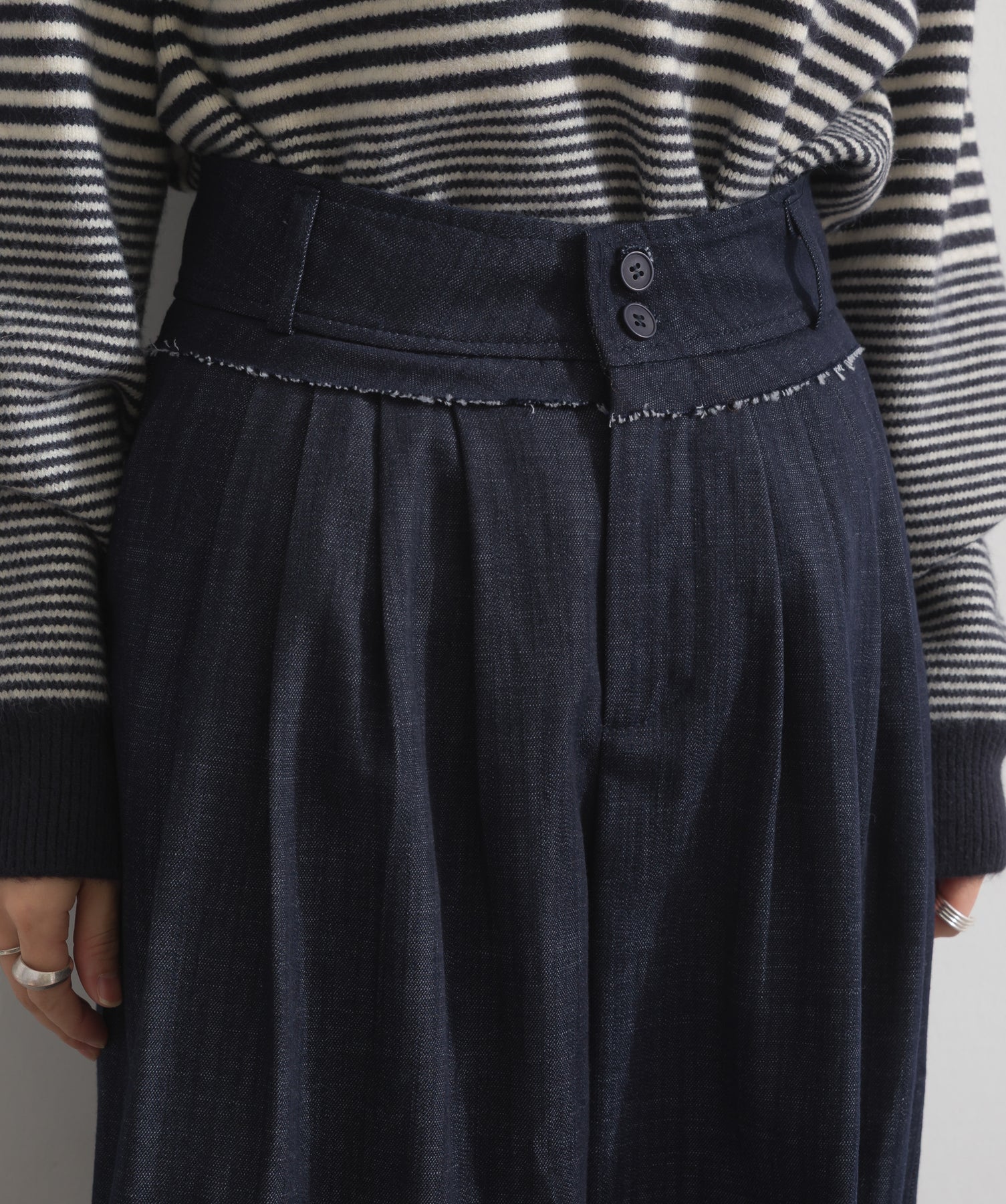 モードに差がつく、計算されたウエストシルエット-material-落ち感のあるしなやかなツイル素材を使用。ほどよいハリ感と柔らかな肌触りで、デイリーに快適な着用感を叶えます。厚すぎず軽すぎない生地感が、シーズンを問わず活躍する万能アイテム。-design-フロントにタックとアシンメトリーなウエストデザインを施し、トップスインもサマになるスタイリッシュな一本。ハイウエスト設定で脚長効果を演出しながら、ヒップ〜太ももにかけてゆとりのあるワイドシルエットで美バランスに。裾にかけてのストレートラインが縦のラインを強調し、抜け感のある大人のモードスタイルを完成させます。