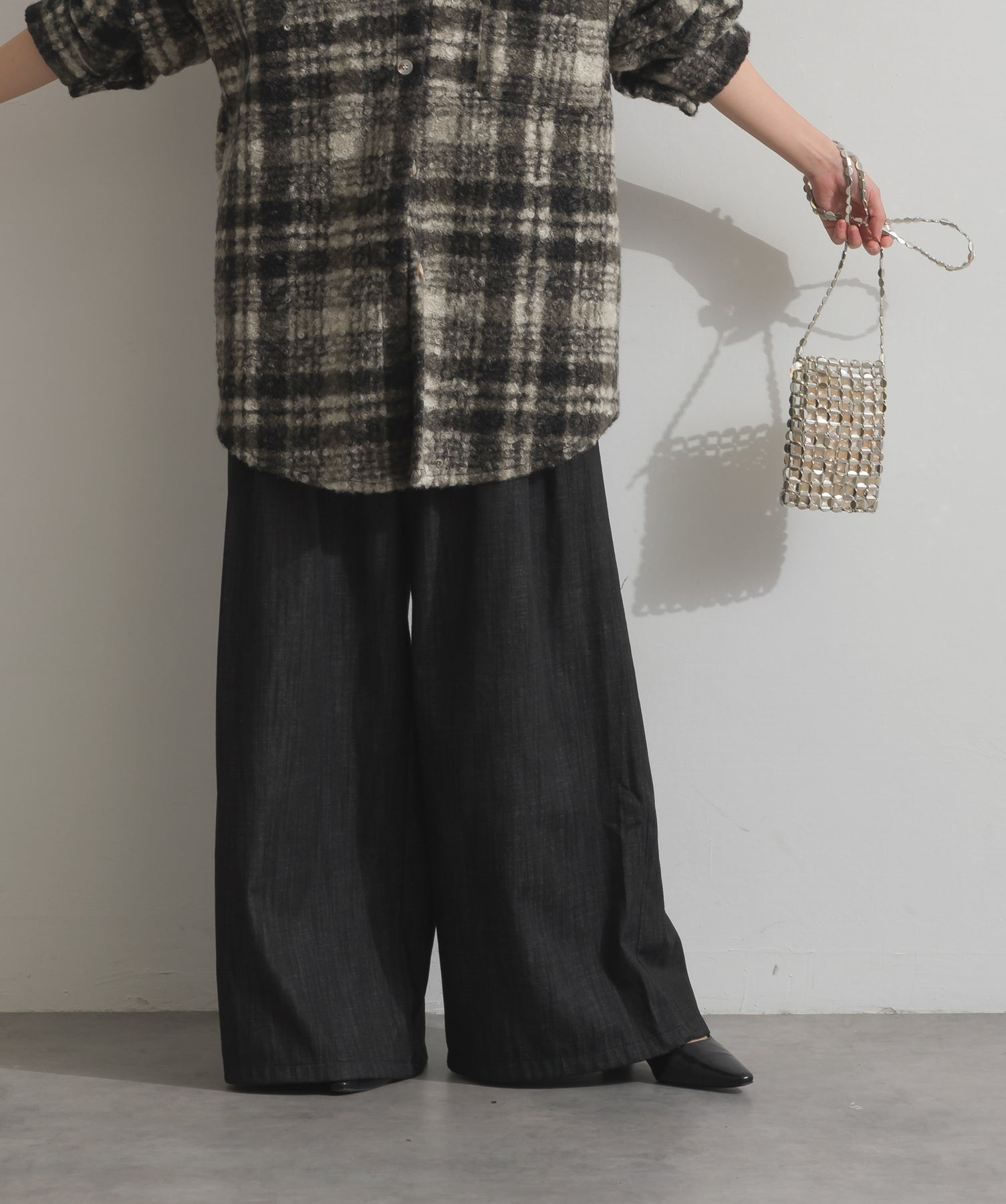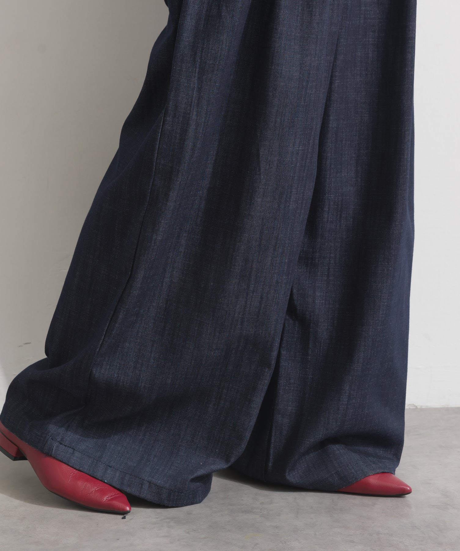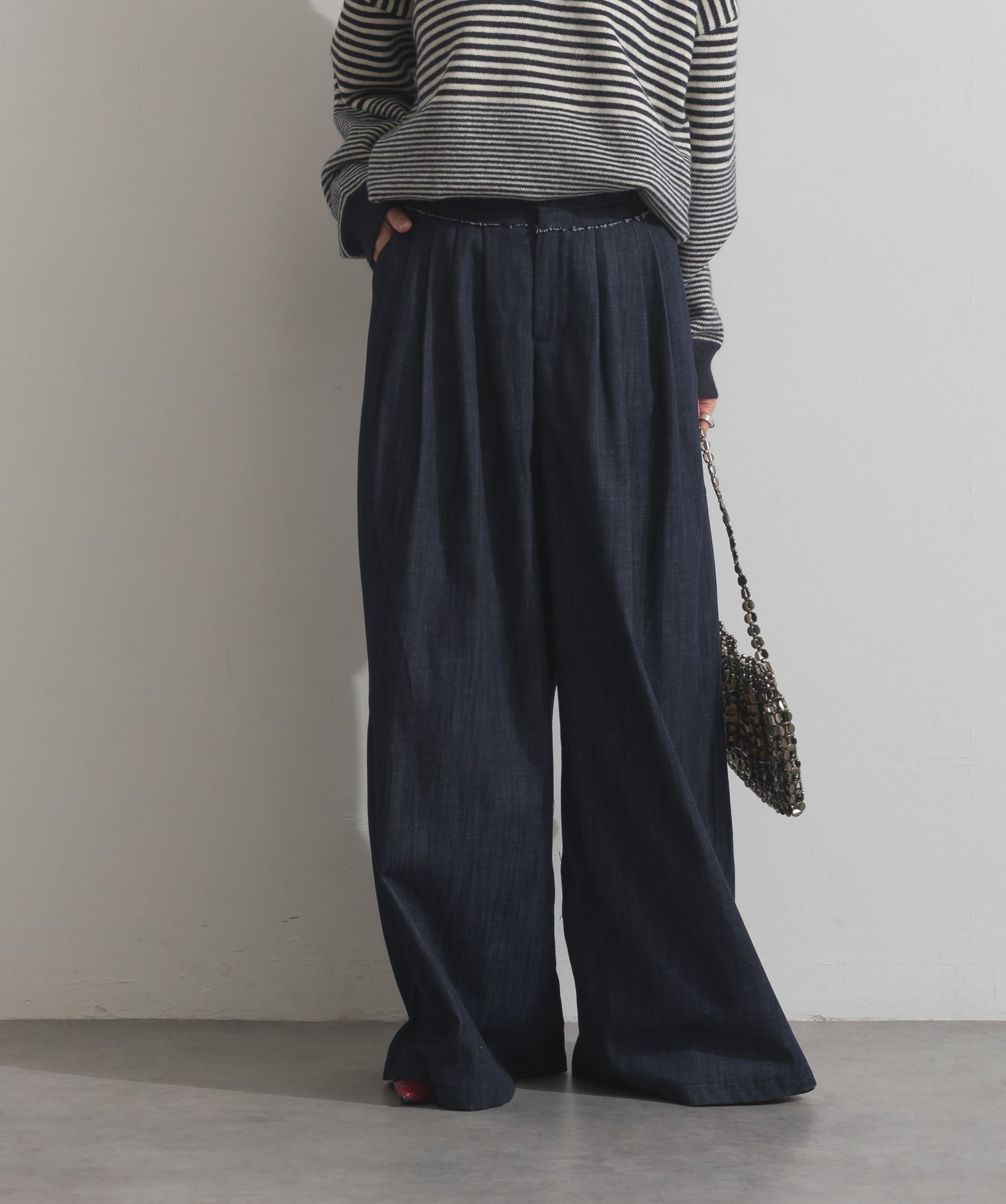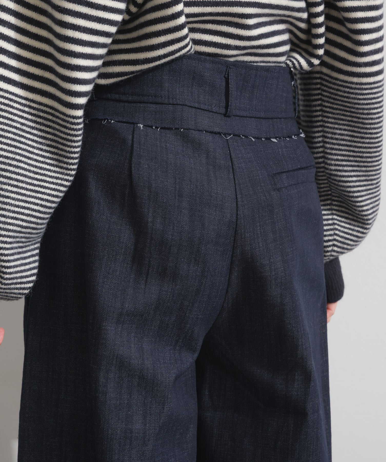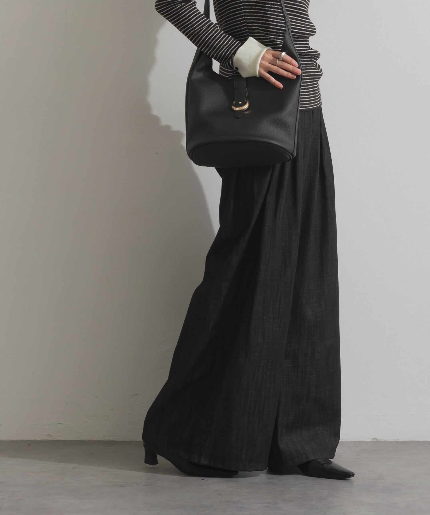 モードに差がつく、計算されたウエストシルエット-material-落ち感のあるしなやかなツイル素材を使用。ほどよいハリ感と柔らかな肌触りで、デイリーに快適な着用感を叶えます。厚すぎず軽すぎない生地感が、シーズンを問わず活躍する万能アイテム。-design-フロントにタックとアシンメトリーなウエストデザインを施し、トップスインもサマになるスタイリッシュな一本。ハイウエスト設定で脚長効果を演出しながら、ヒップ〜太ももにかけてゆとりのあるワイドシルエットで美バランスに。裾にかけてのストレートラインが縦のラインを強調し、抜け感のある大人のモードスタイルを完成させます。
