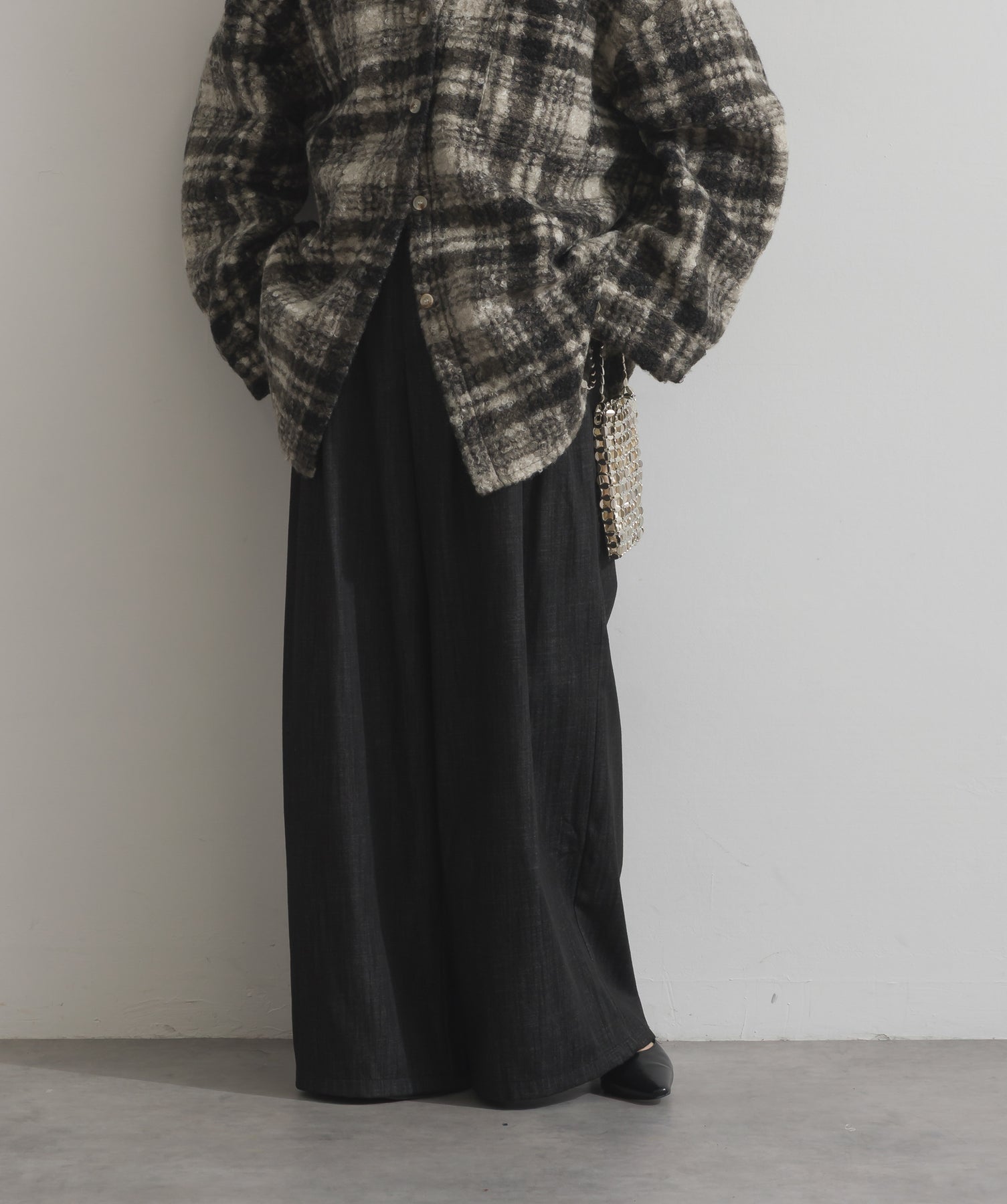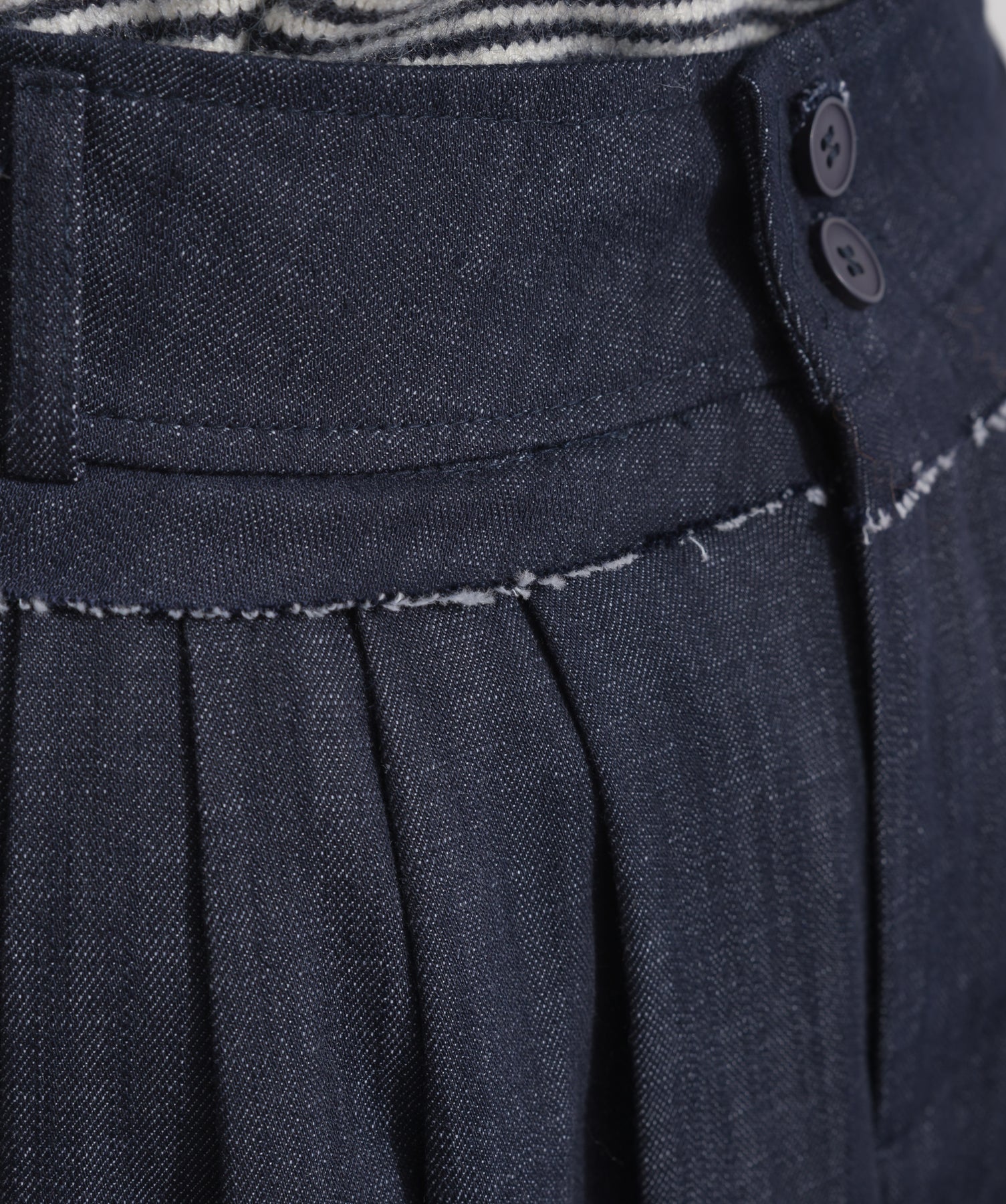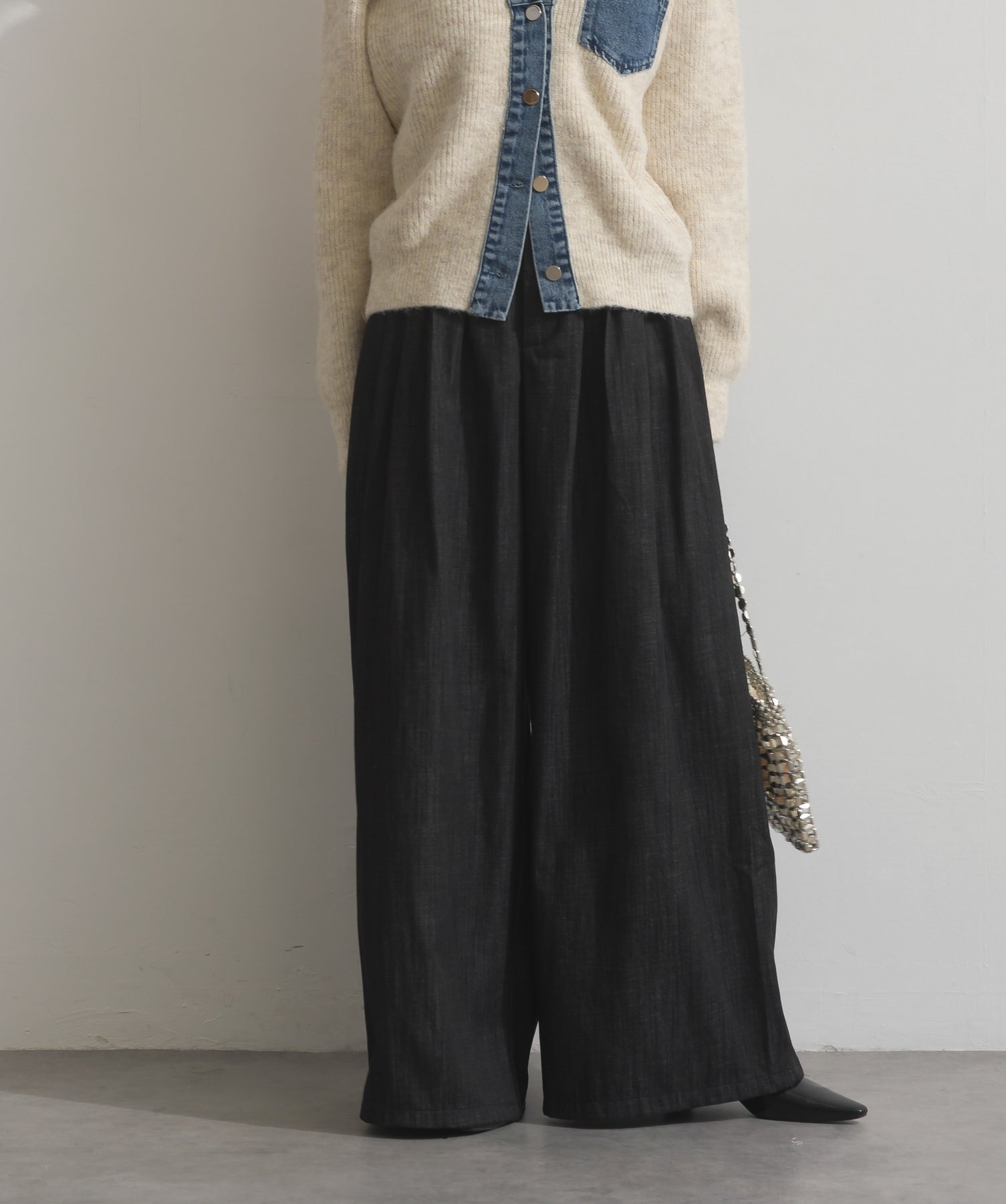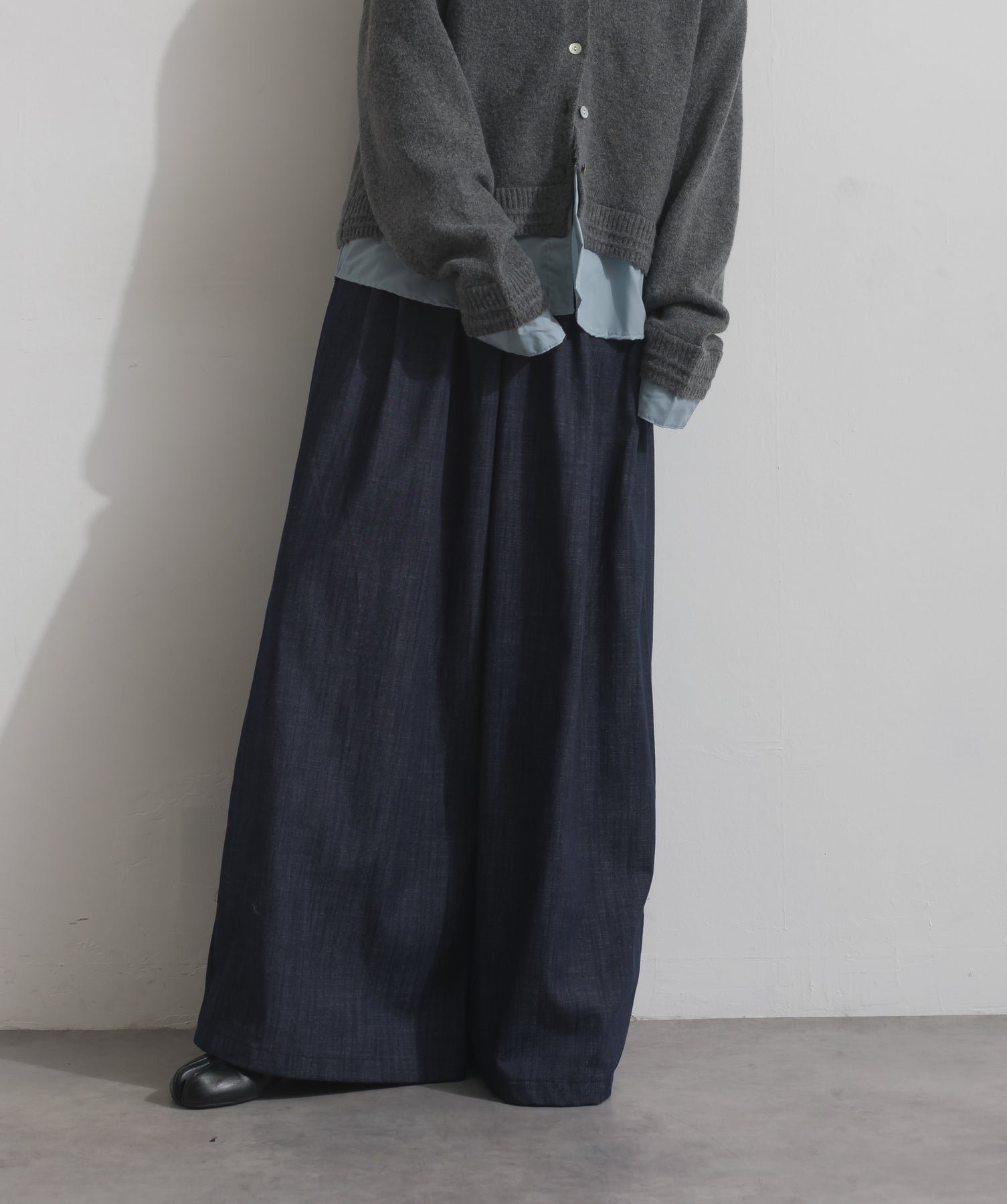 モードに差がつく、計算されたウエストシルエット-material-落ち感のあるしなやかなツイル素材を使用。ほどよいハリ感と柔らかな肌触りで、デイリーに快適な着用感を叶えます。厚すぎず軽すぎない生地感が、シーズンを問わず活躍する万能アイテム。-design-フロントにタックとアシンメトリーなウエストデザインを施し、トップスインもサマになるスタイリッシュな一本。ハイウエスト設定で脚長効果を演出しながら、ヒップ〜太ももにかけてゆとりのあるワイドシルエットで美バランスに。裾にかけてのストレートラインが縦のラインを強調し、抜け感のある大人のモードスタイルを完成させます。