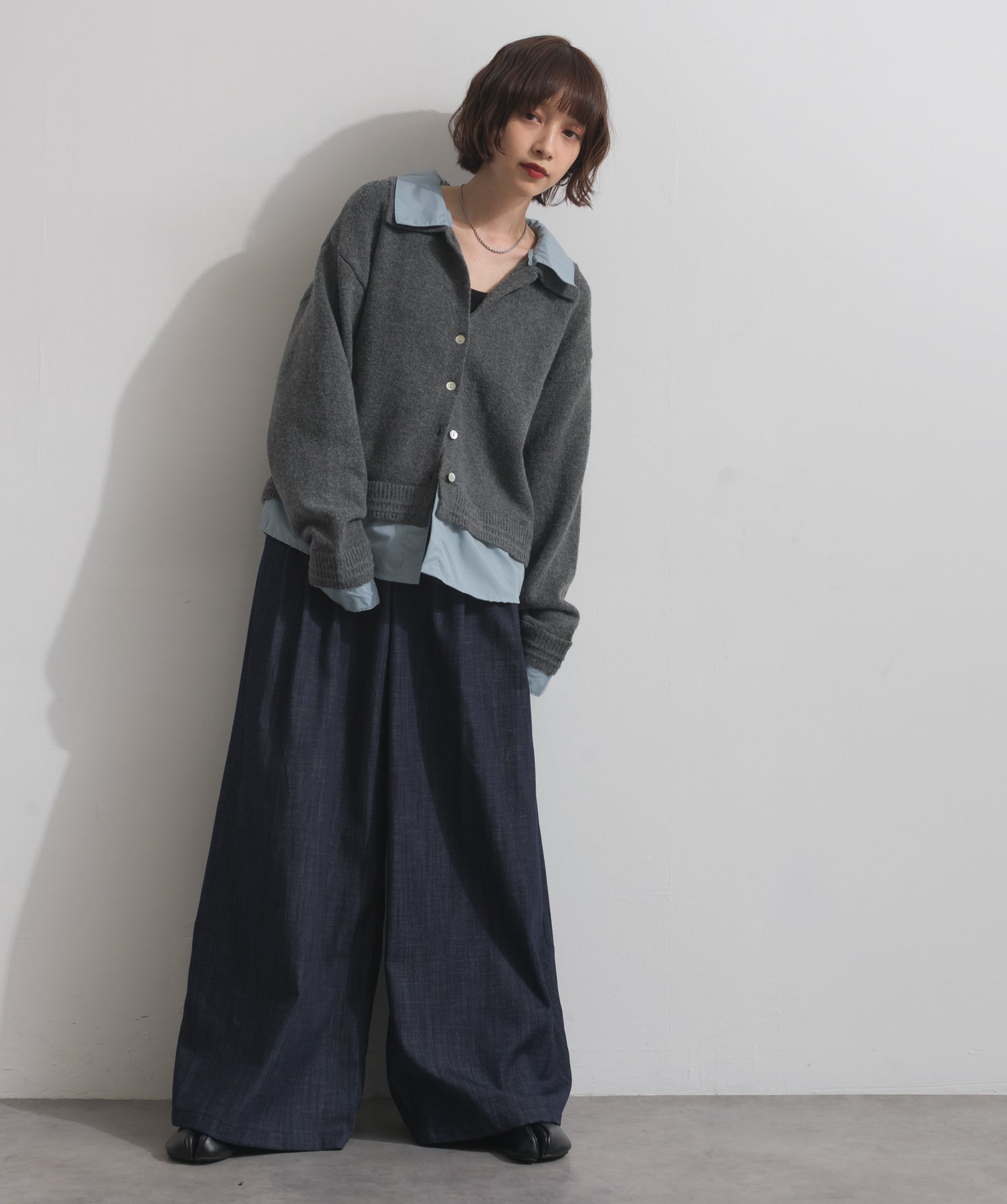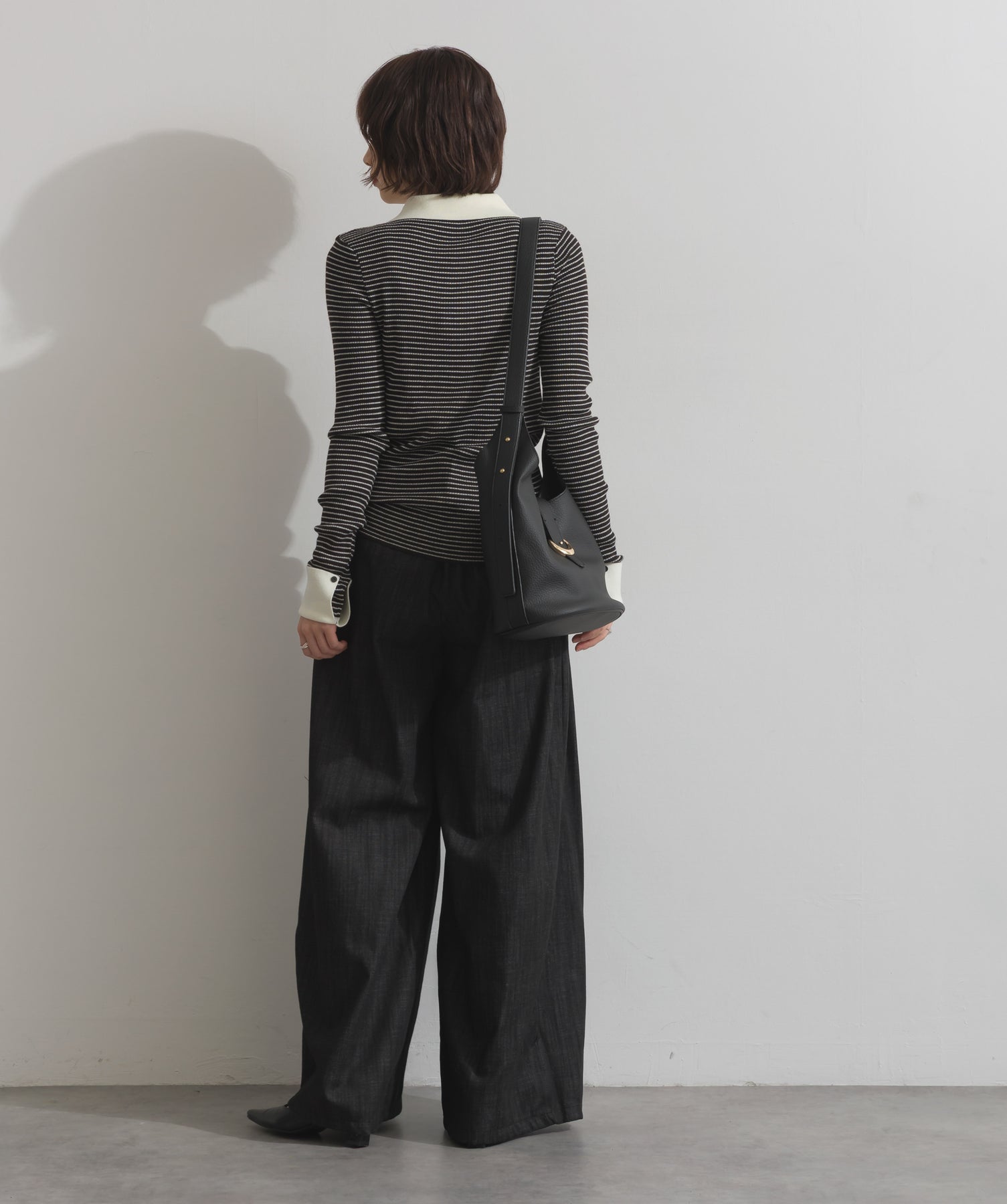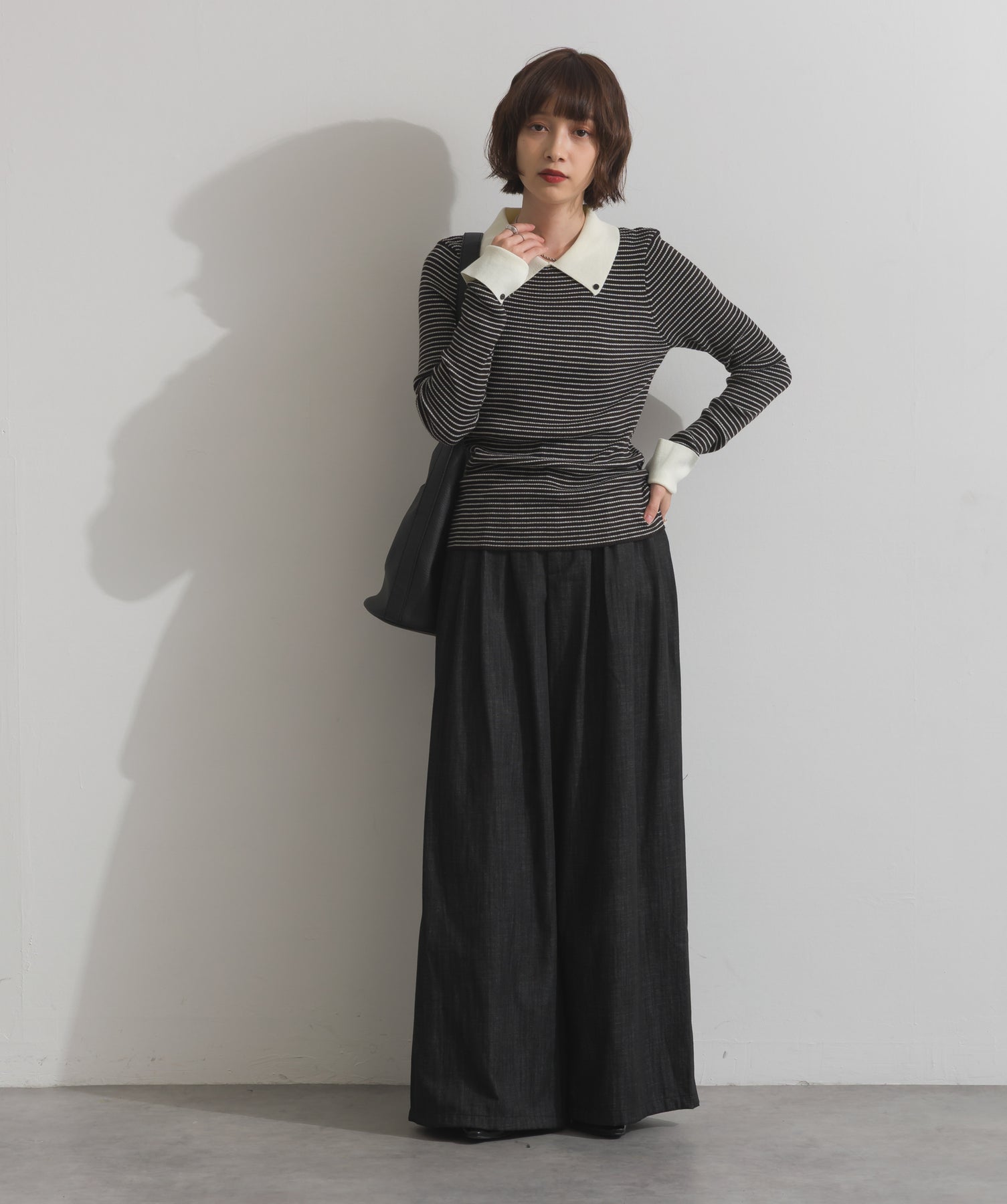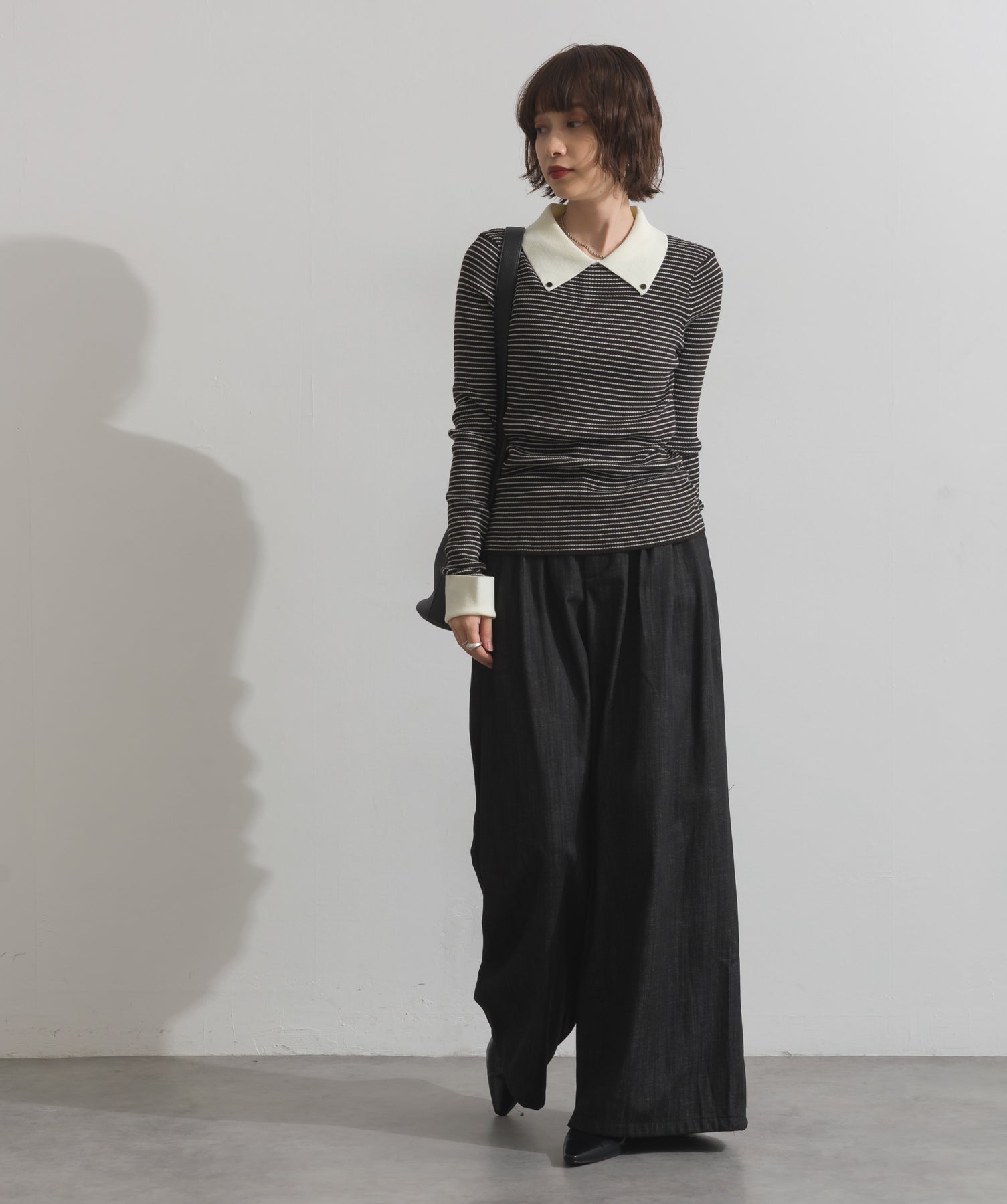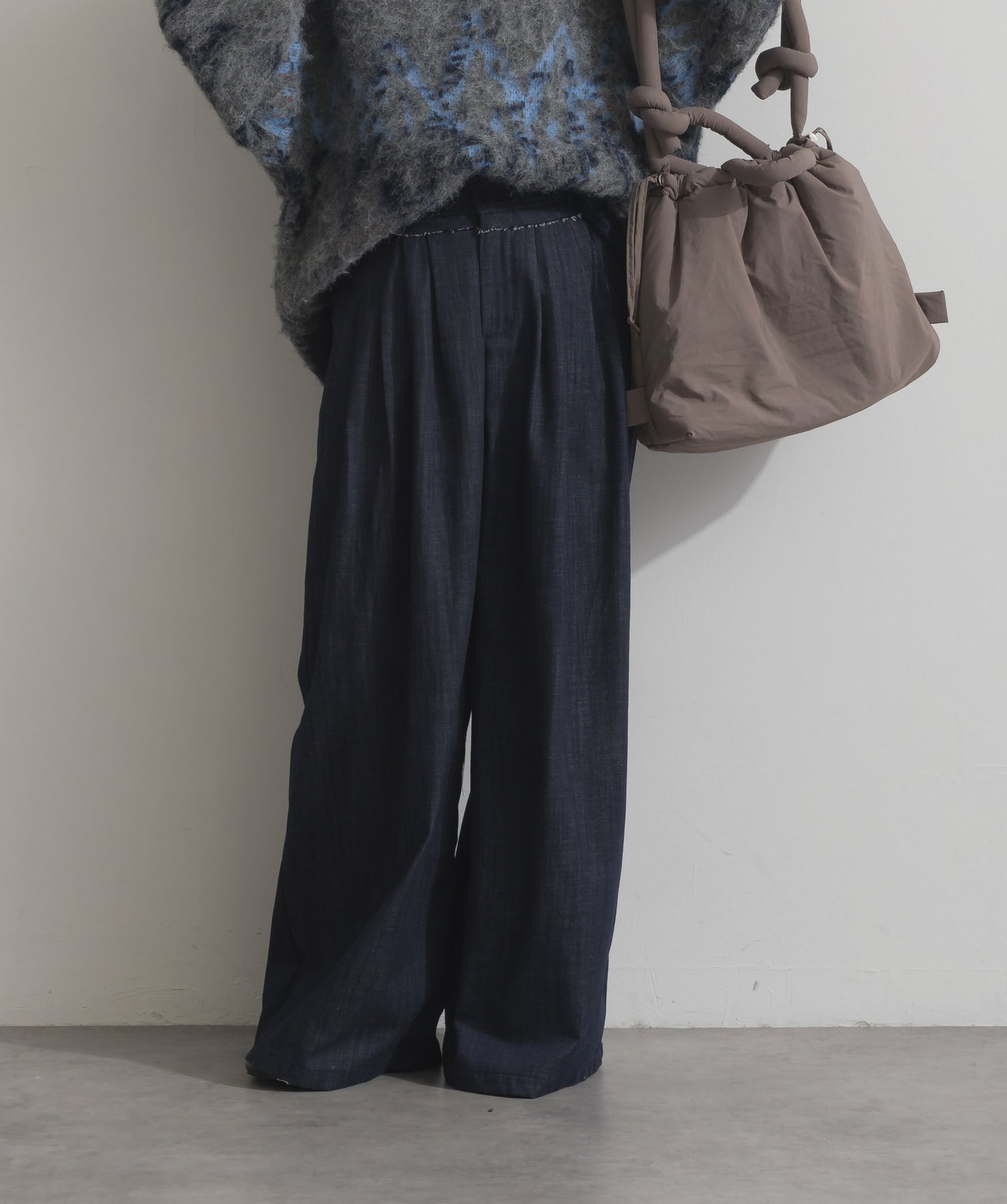 モードに差がつく、計算されたウエストシルエット-material-落ち感のあるしなやかなツイル素材を使用。ほどよいハリ感と柔らかな肌触りで、デイリーに快適な着用感を叶えます。厚すぎず軽すぎない生地感が、シーズンを問わず活躍する万能アイテム。-design-フロントにタックとアシンメトリーなウエストデザインを施し、トップスインもサマになるスタイリッシュな一本。ハイウエスト設定で脚長効果を演出しながら、ヒップ〜太ももにかけてゆとりのあるワイドシルエットで美バランスに。裾にかけてのストレートラインが縦のラインを強調し、抜け感のある大人のモードスタイルを完成させます。
